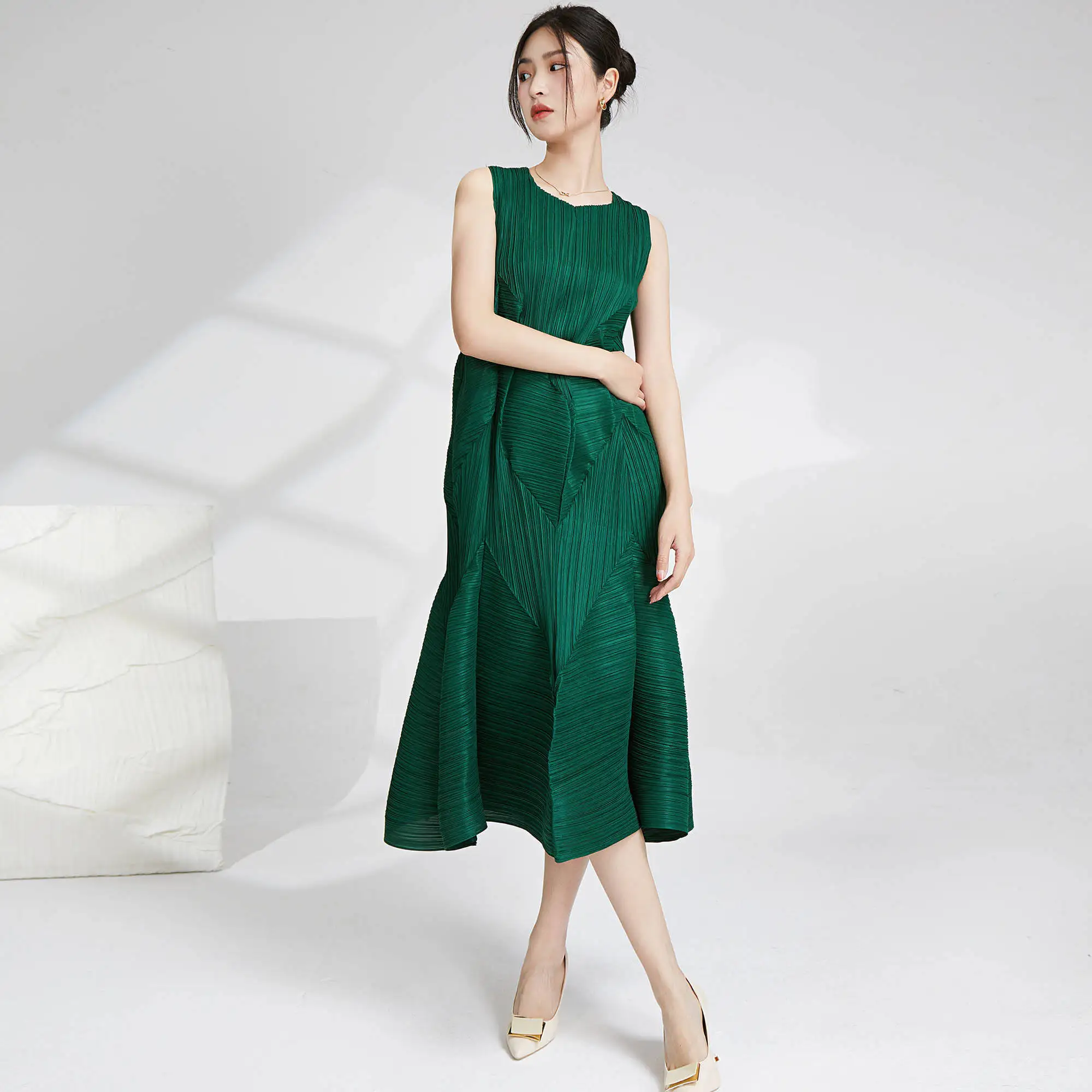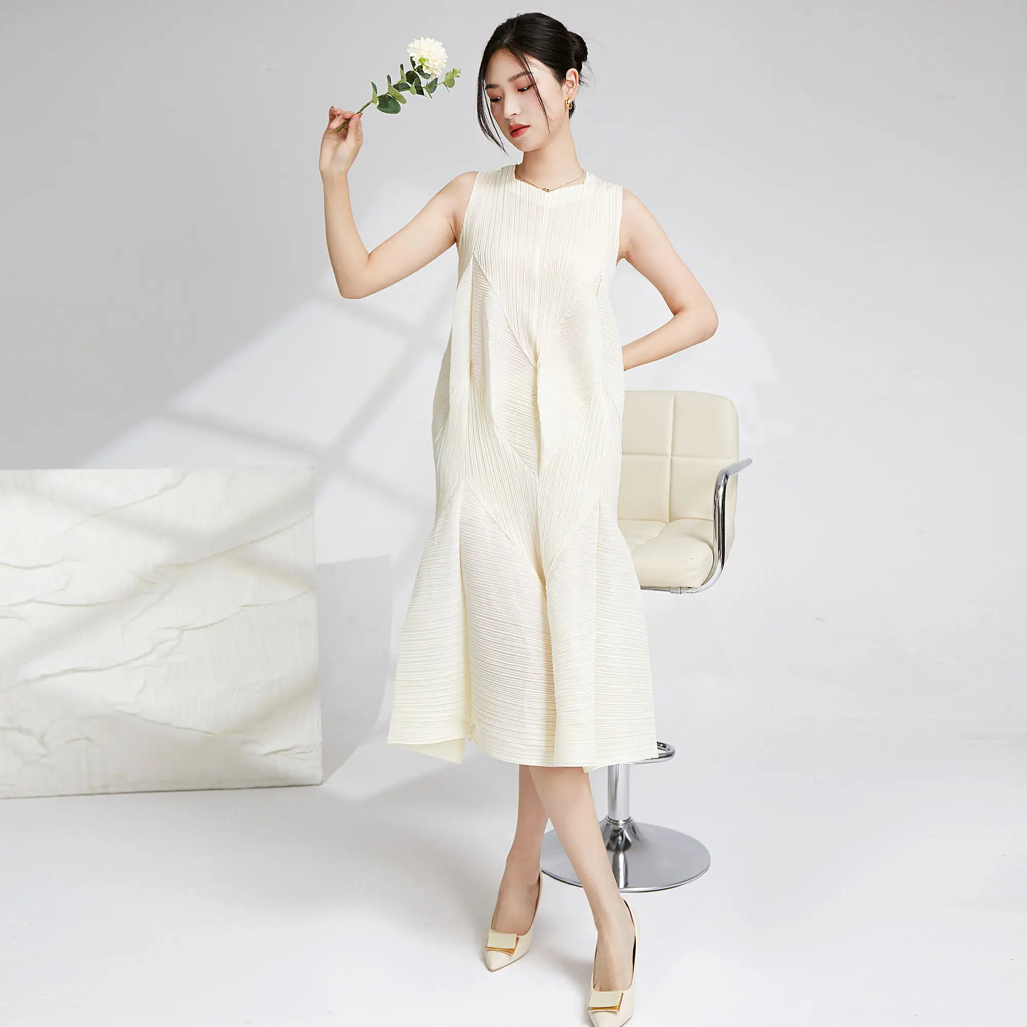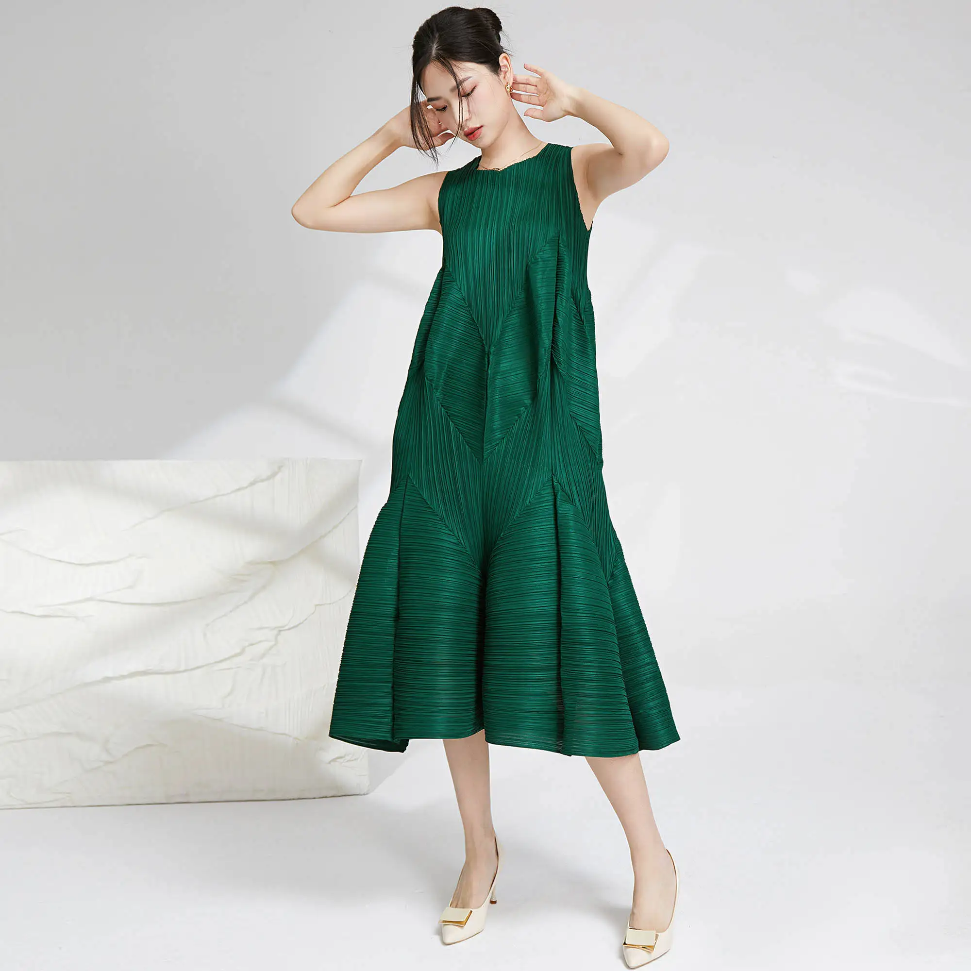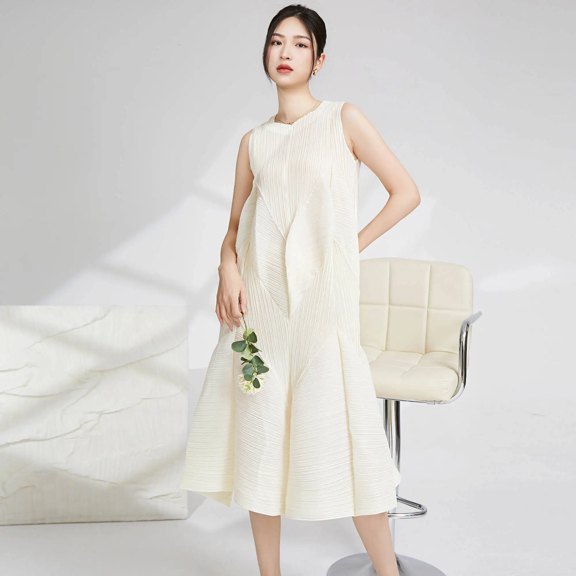 Miyake Best Selling Casual Style A-Line Dress Pleated Design Loose Irregular Women's Pleated Sleeveless Dress Fabric Weaving