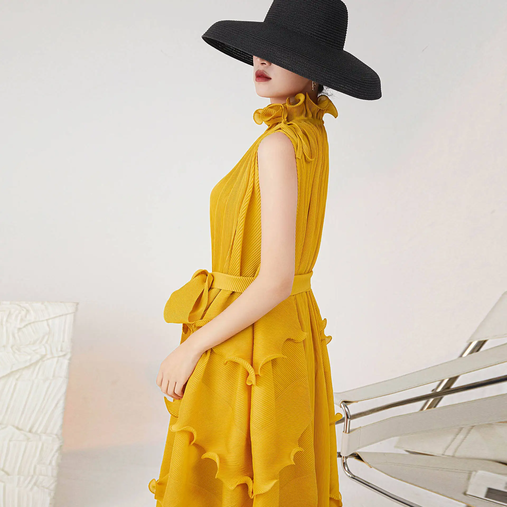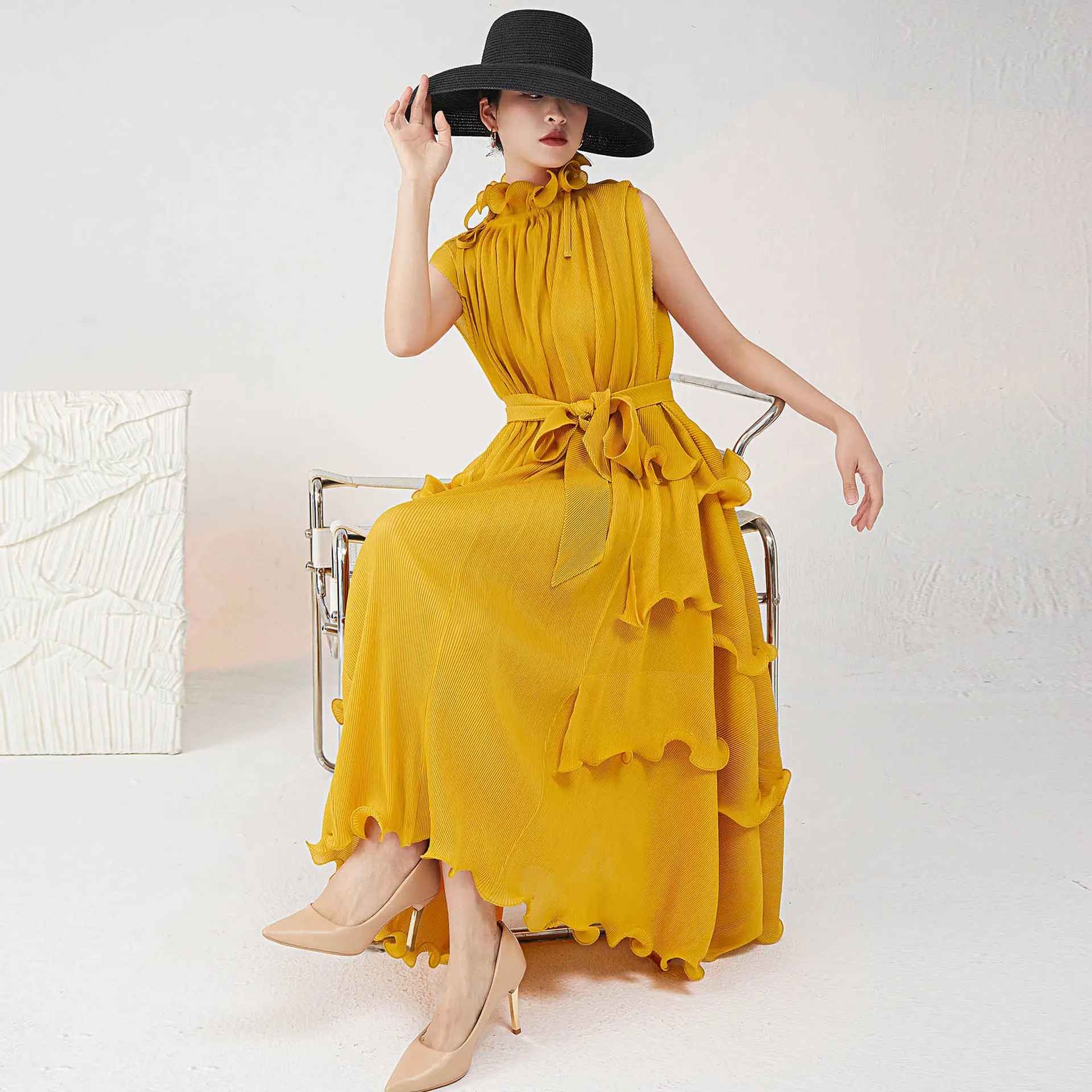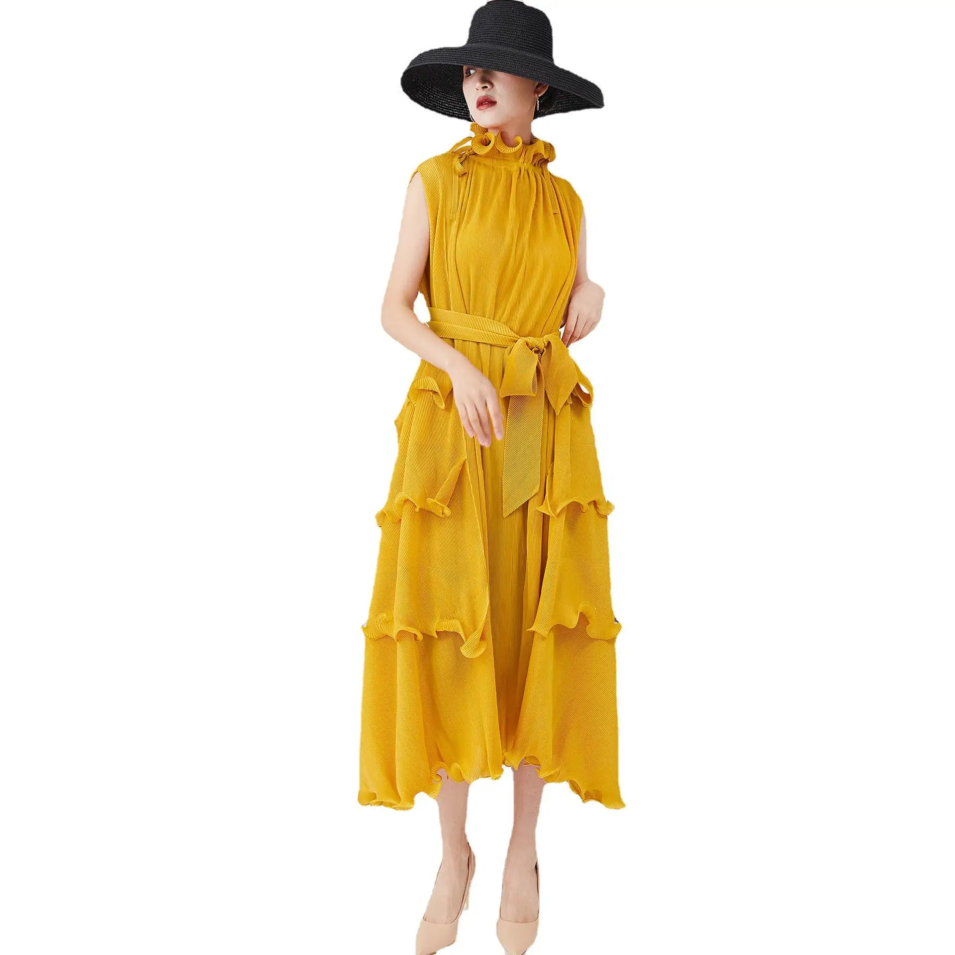 2025 High Collar Western Style Sleeveless Dress Irregular Flower Bud Tie Waist Pleated Design Plus Size One Size