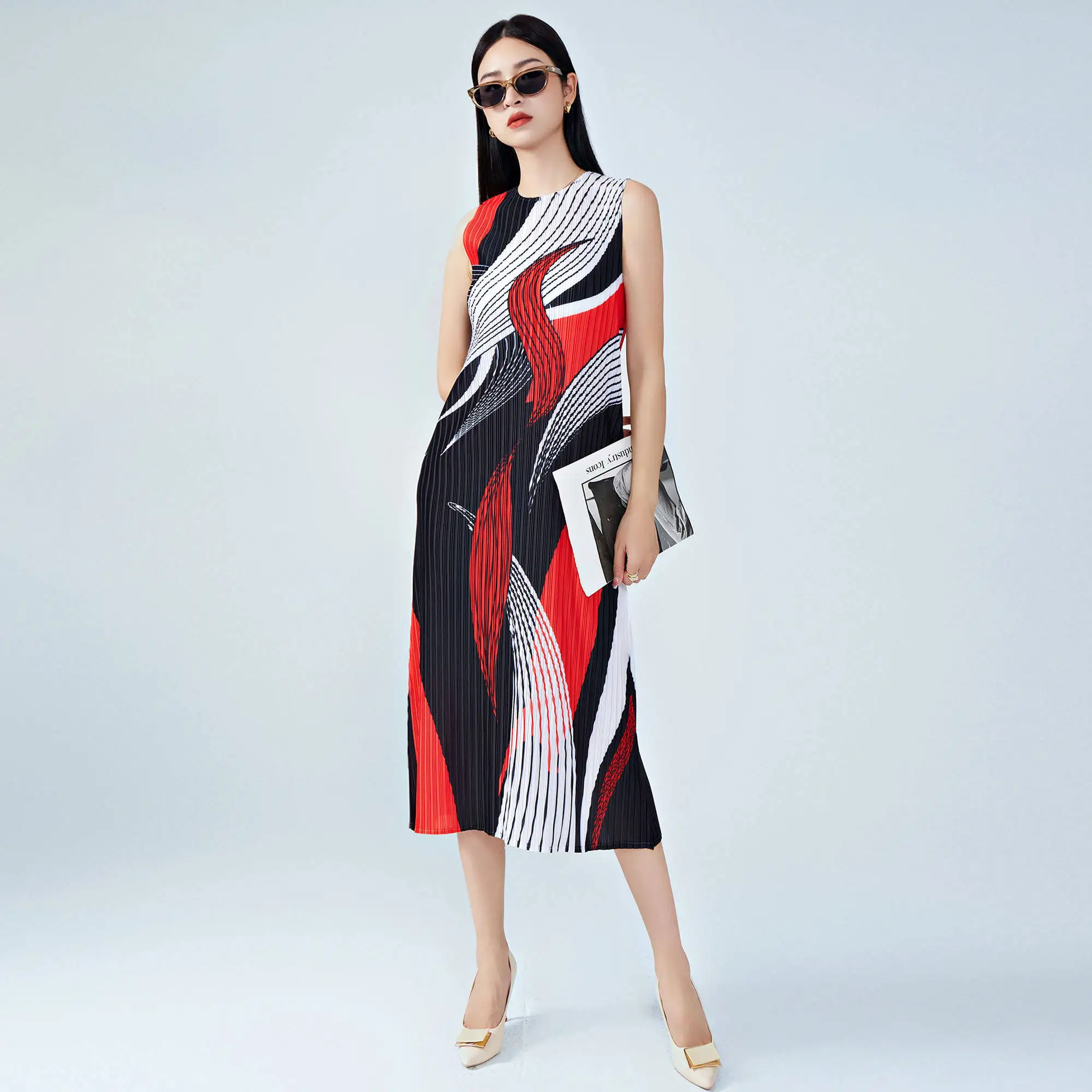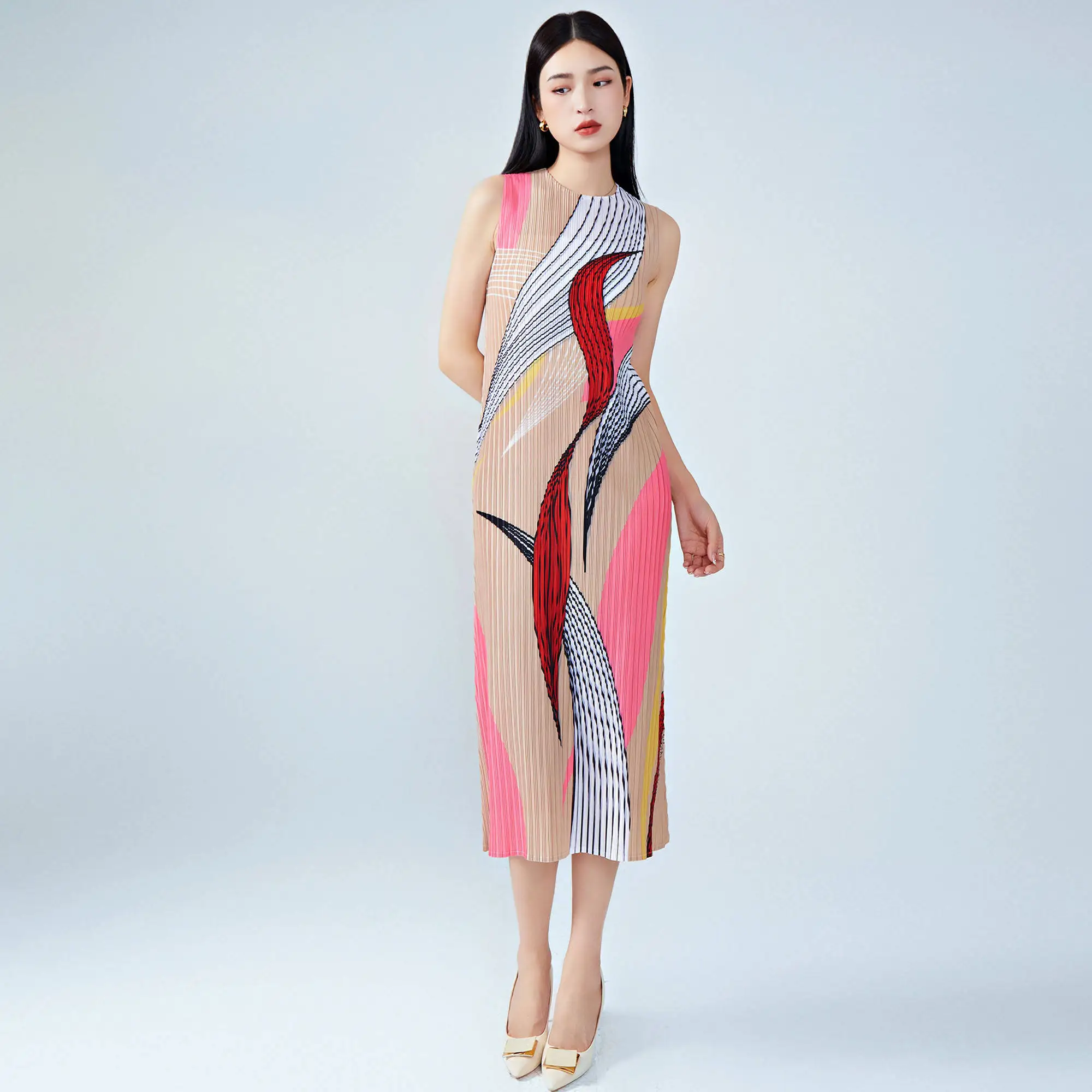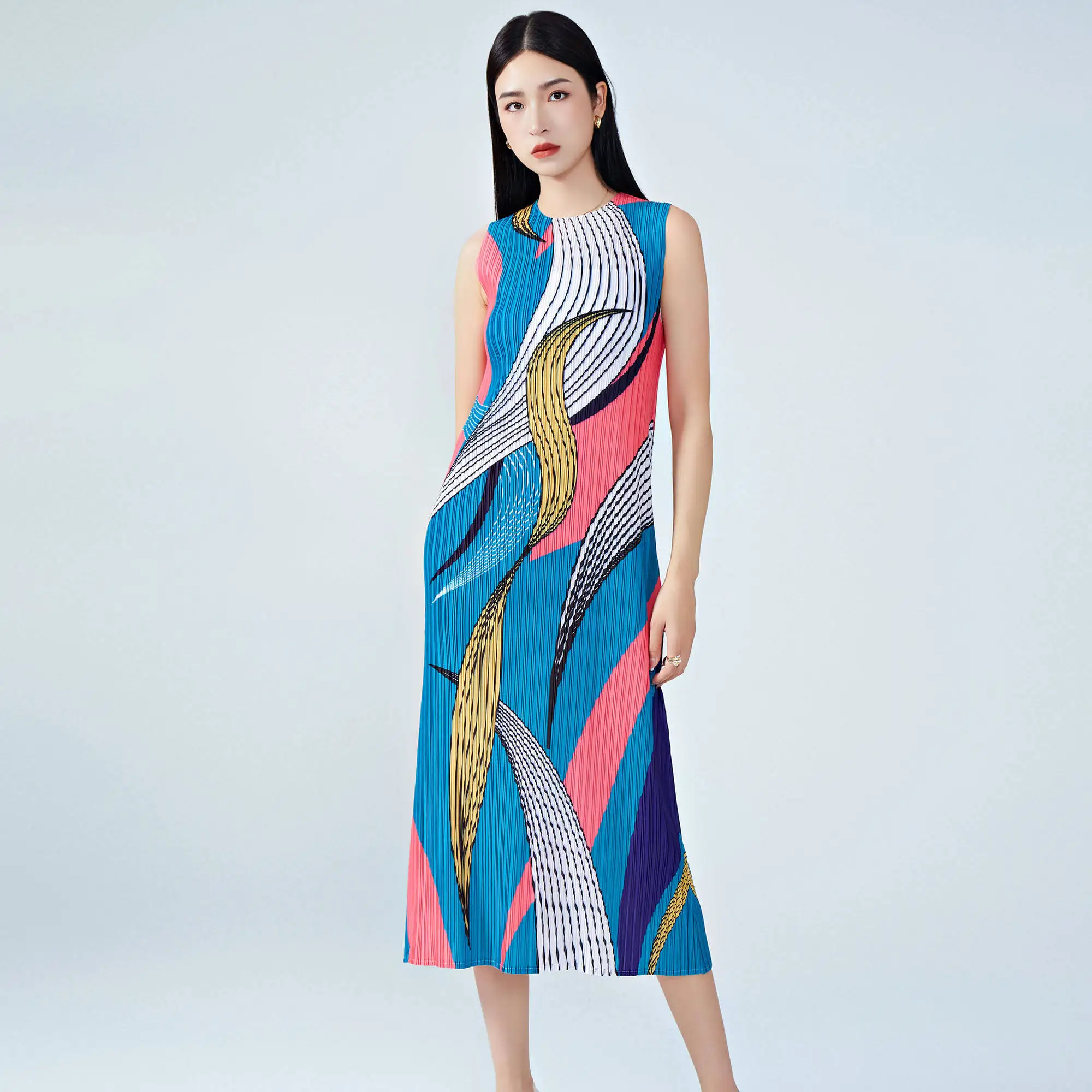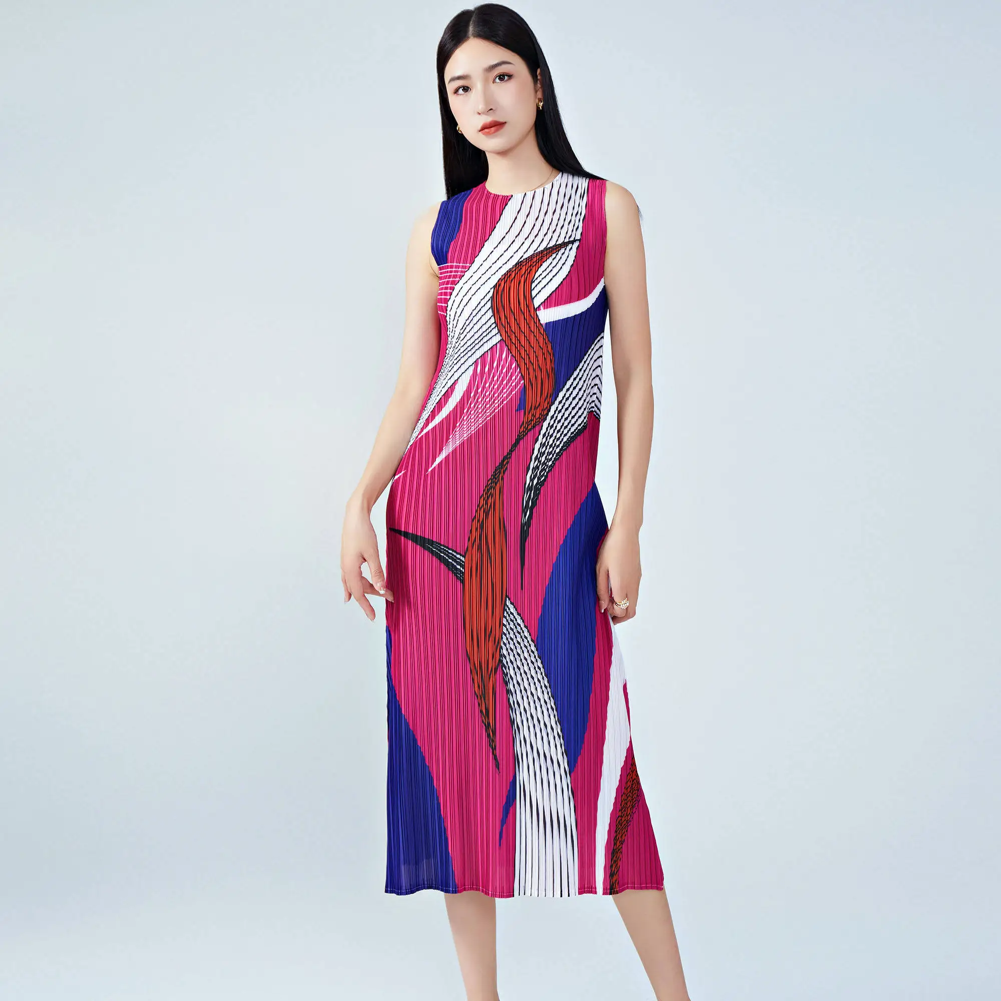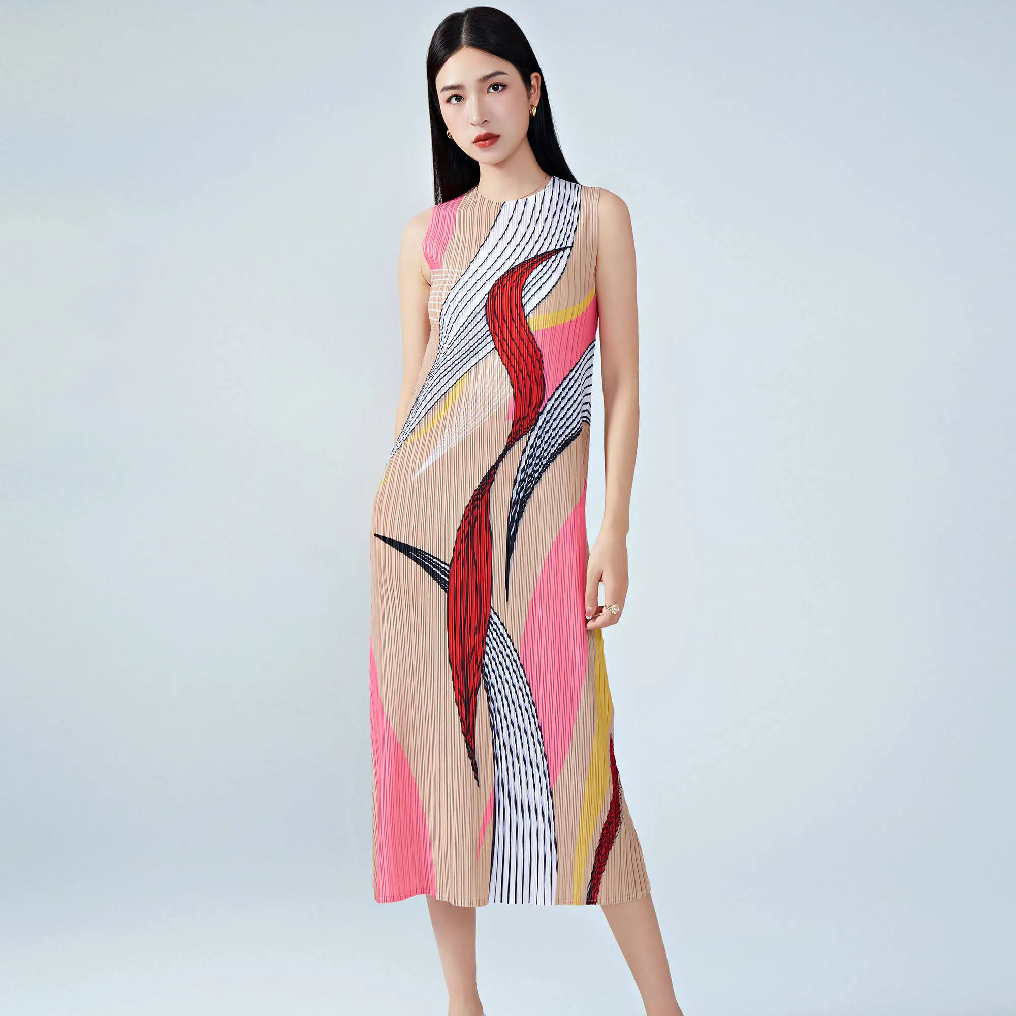 Women's Summer Sleeveless Midi Dress Casual Straight Elegant Style With High Quality Miyake Pleated Dress Crew Neck Dress