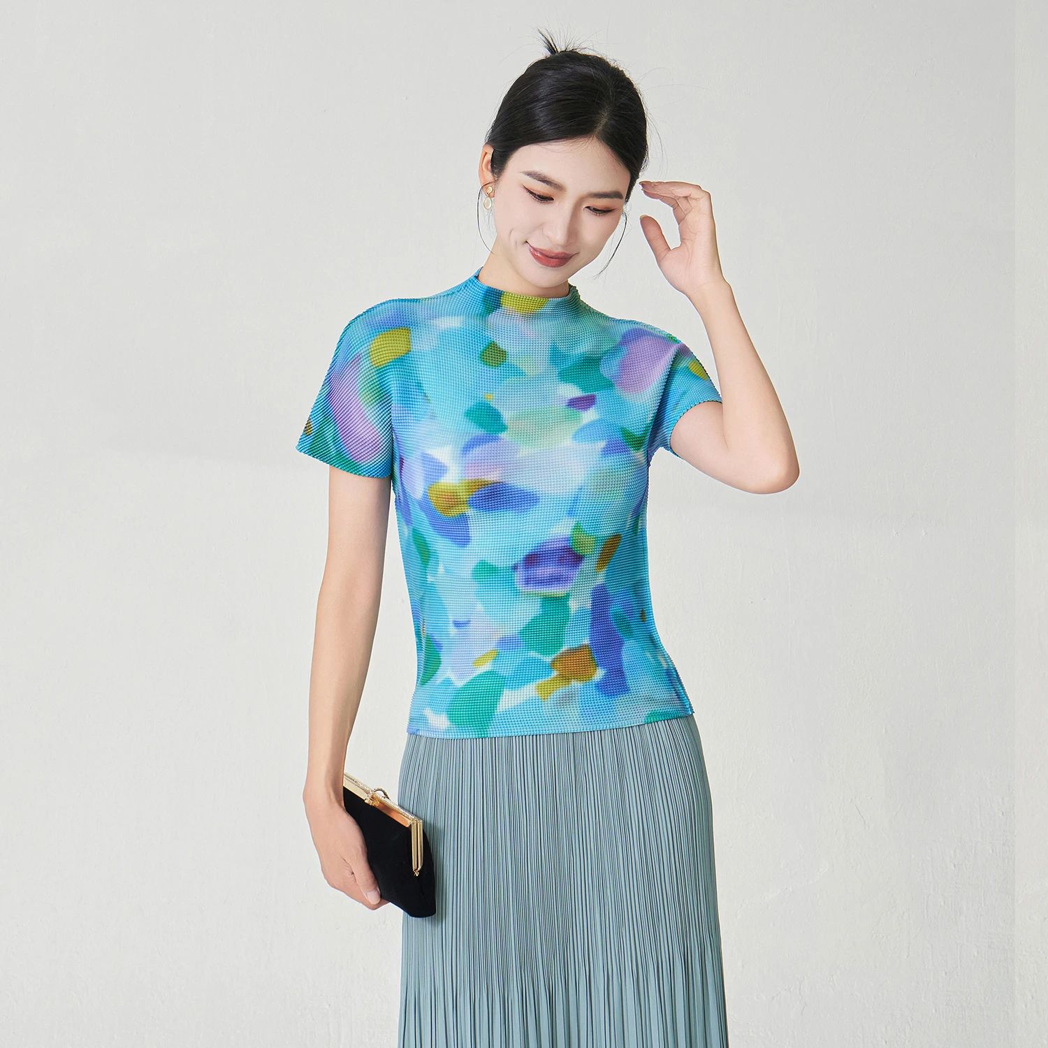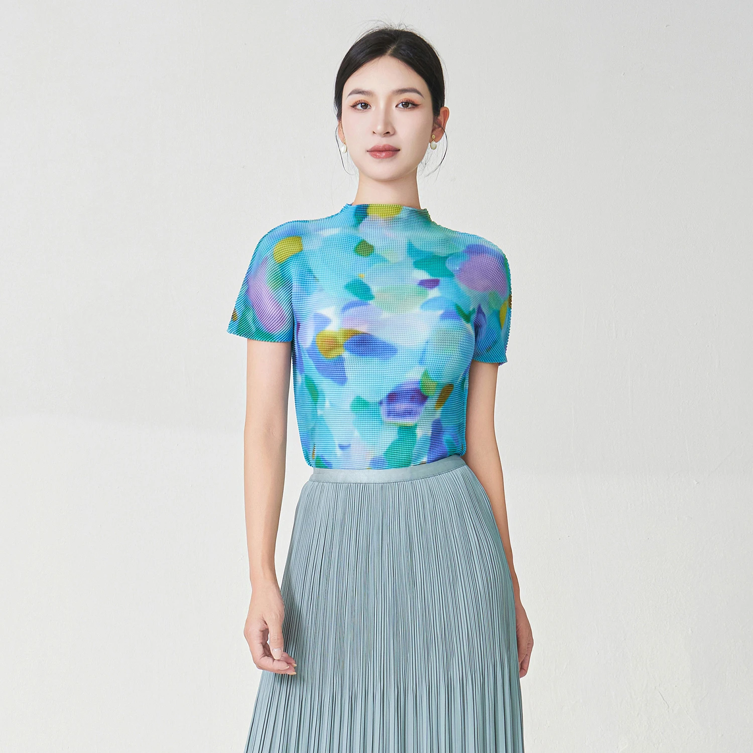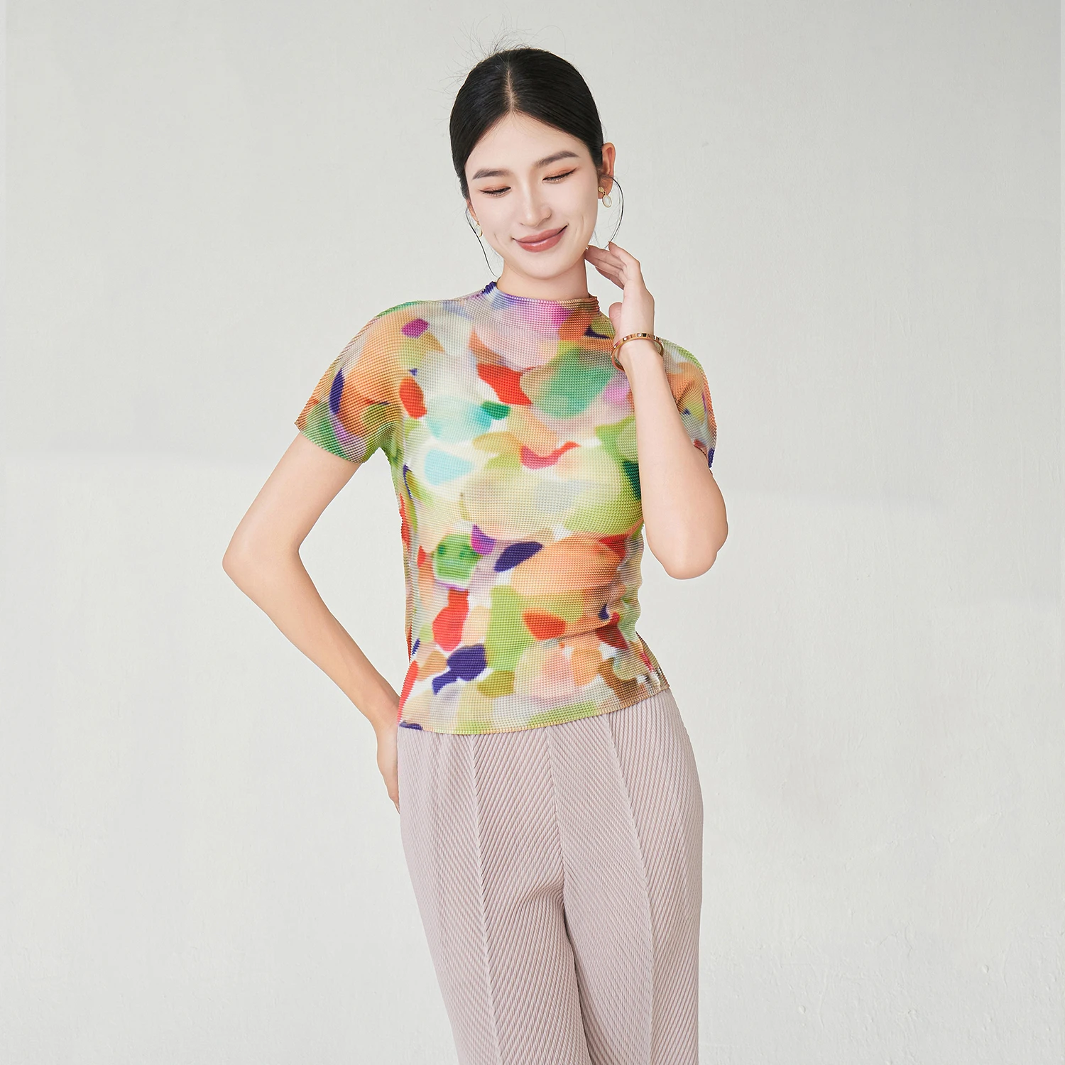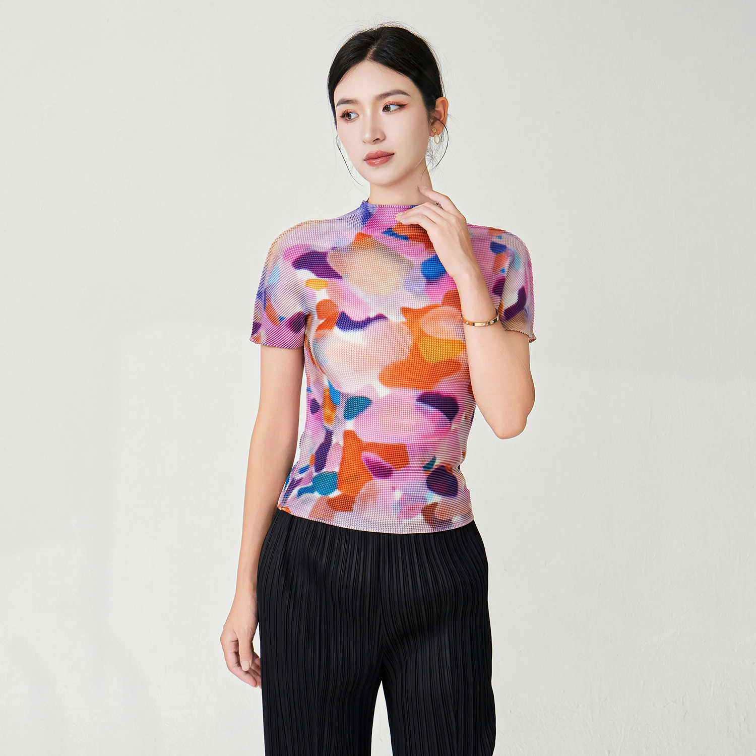 Factory Direct Sale Women's Elegant Tops High Quality Stretch Printed Tops Polyester Fabric Casual T-shirt Miyake Pleated Tops
