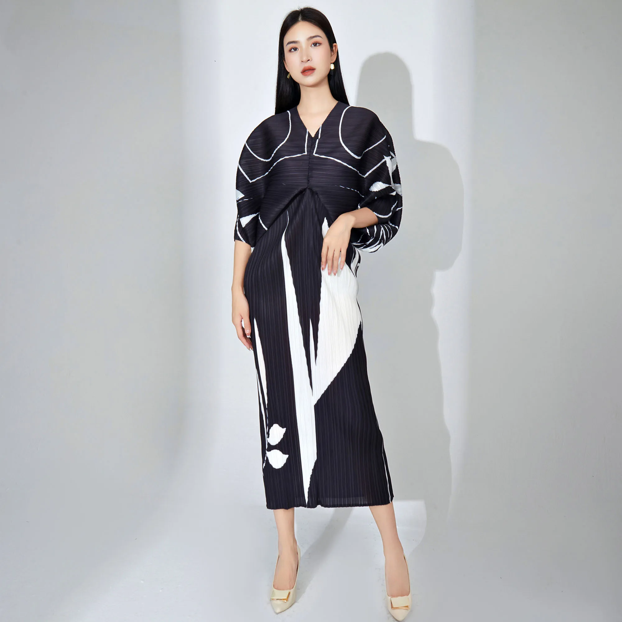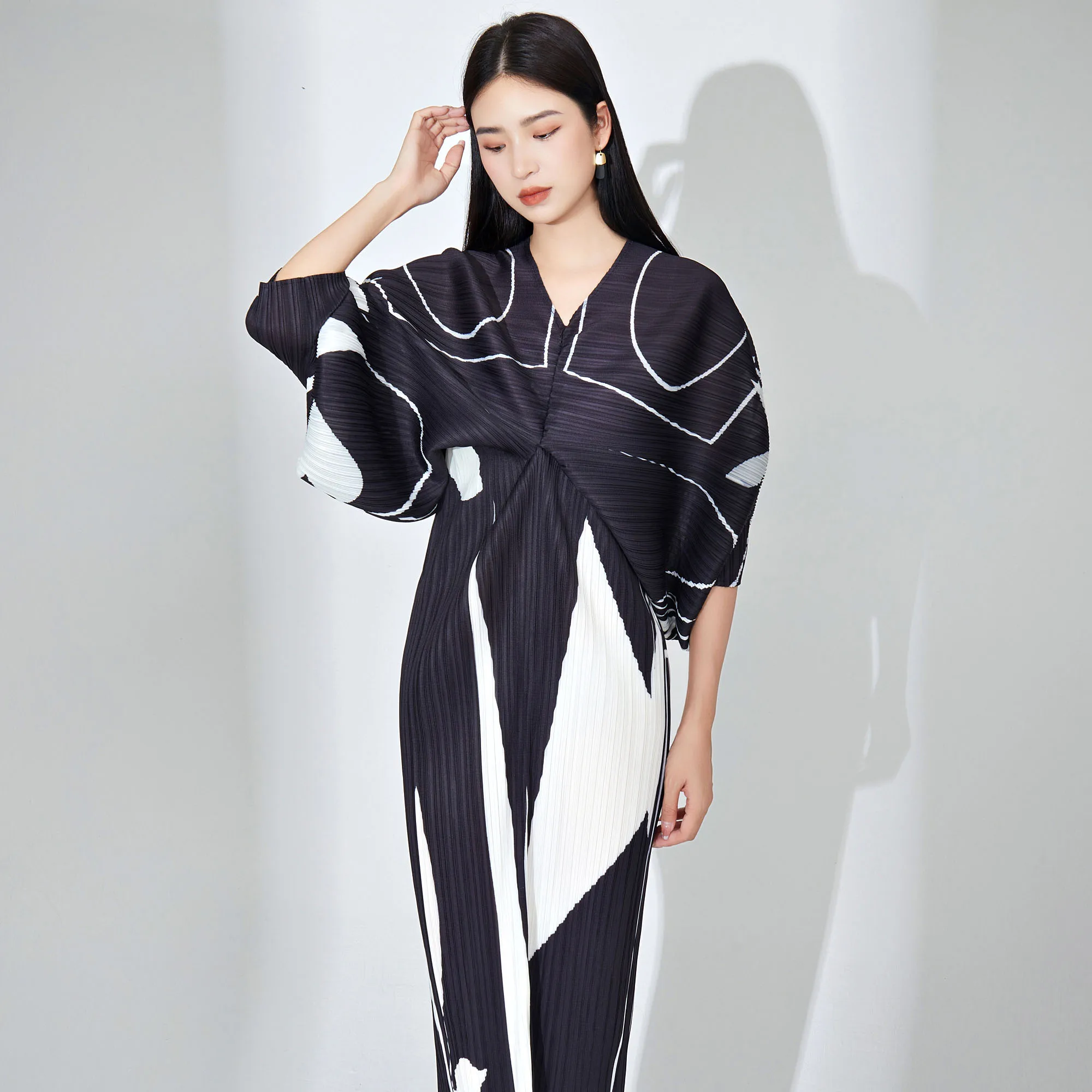 2025 Summer Plus Size Miyake Pleated Bat Sleeve Print Dress Women Fashion V Neck Color Block Elegant Dress