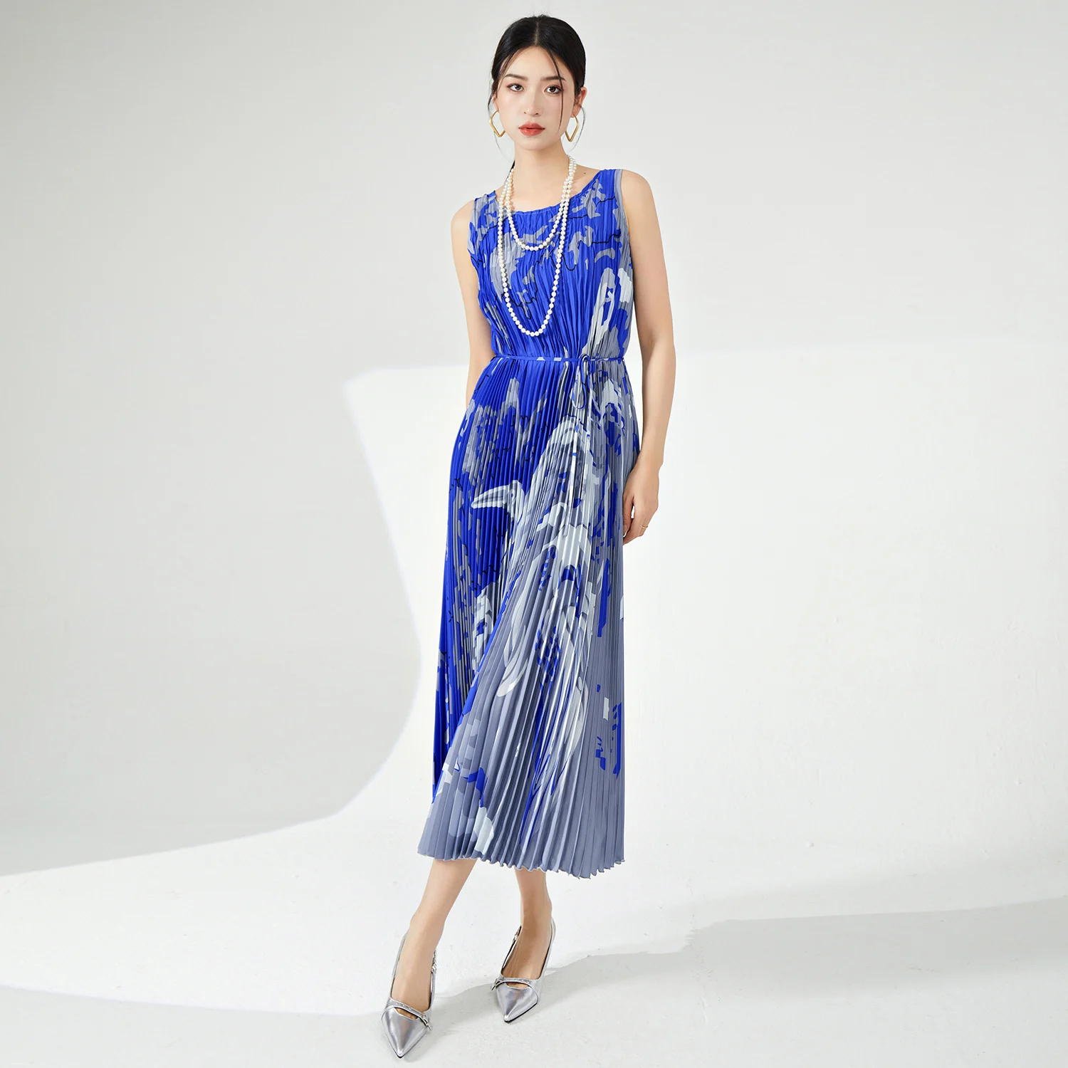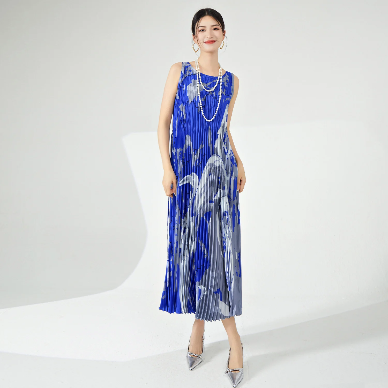 Latest Summer Women's Midii Dress Sleeveless Stretch Fabric Pleated Printed Dress With Natural Waistline for Outdoor Events