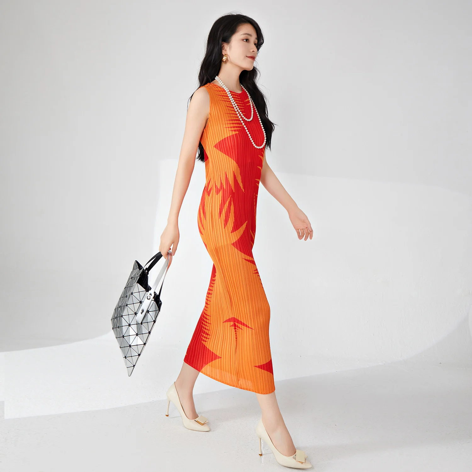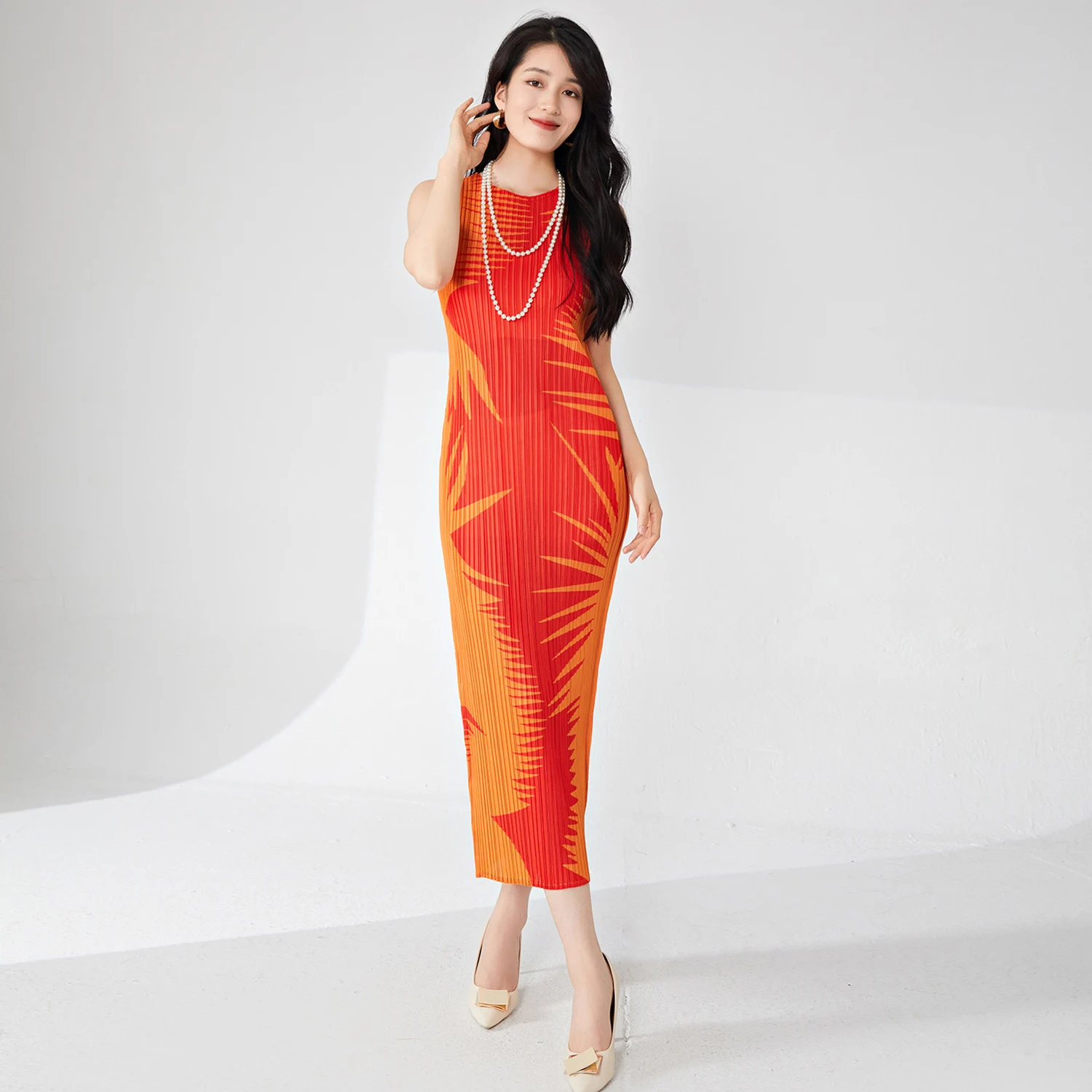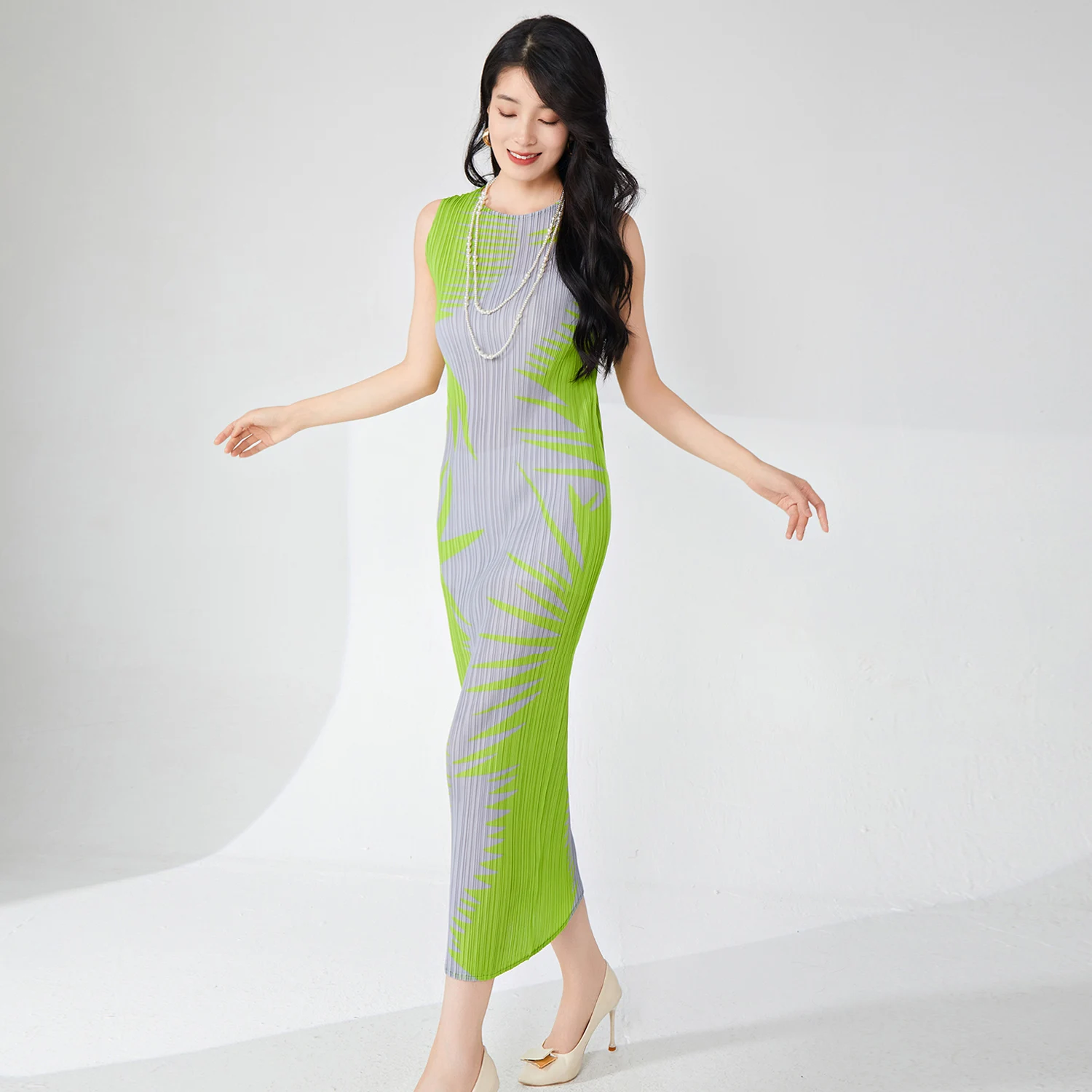 Women's Elegant Summer Casual Dress Pleated Sleeveless Midi Length Stretch Printed Fabric Crew Neck Natural Waistline