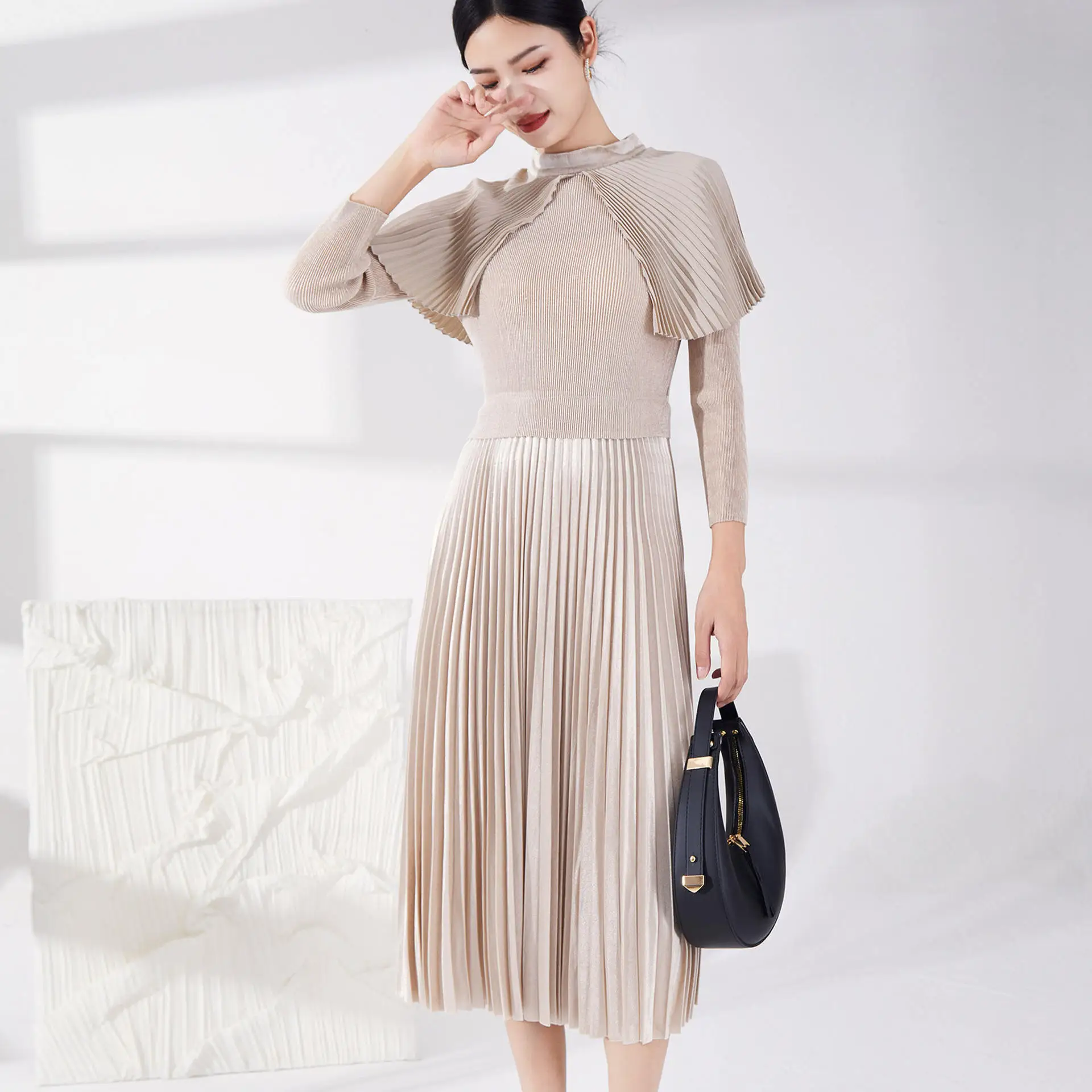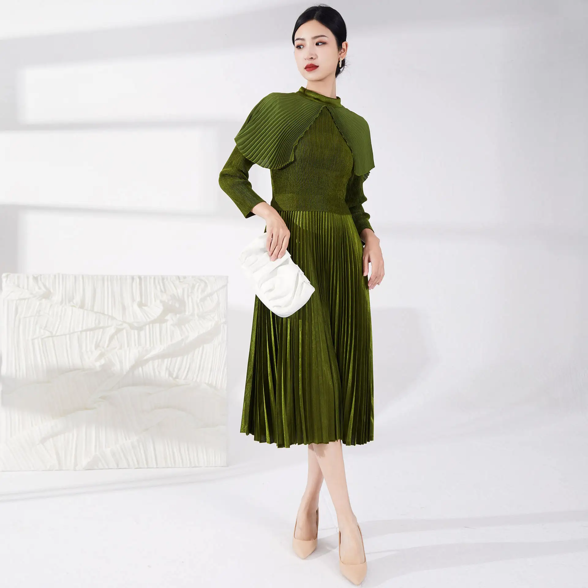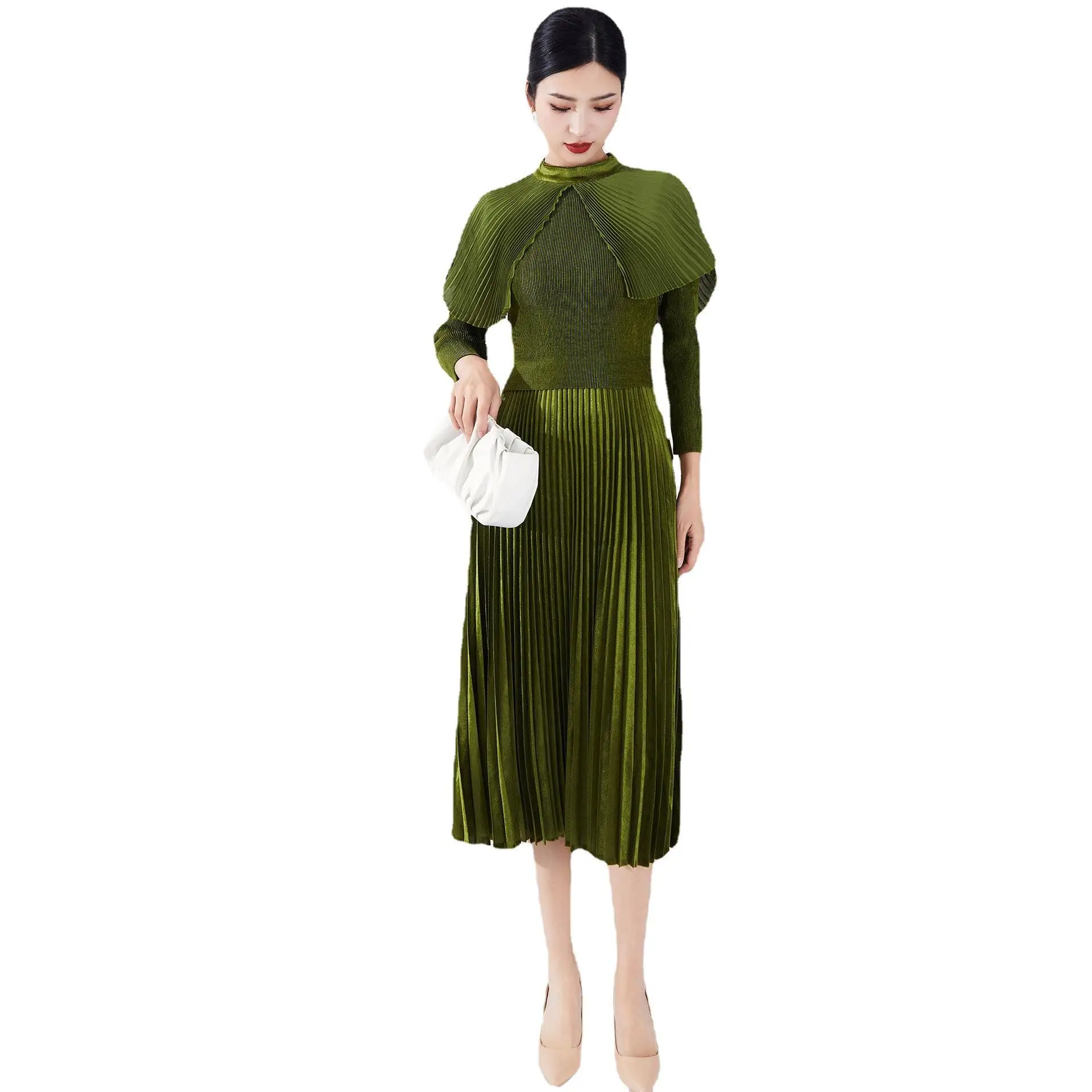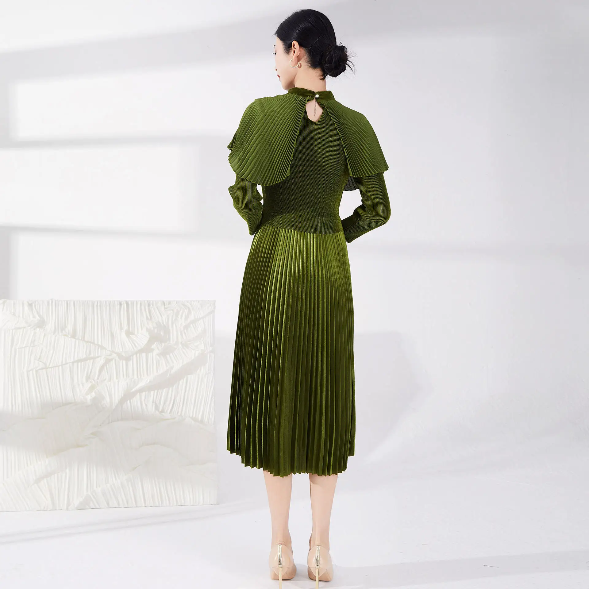 High Quality Long Sleeve Pleated Dress Shiny Velvet Fabric European and American Women's Fashion Casual Style Evening Dress