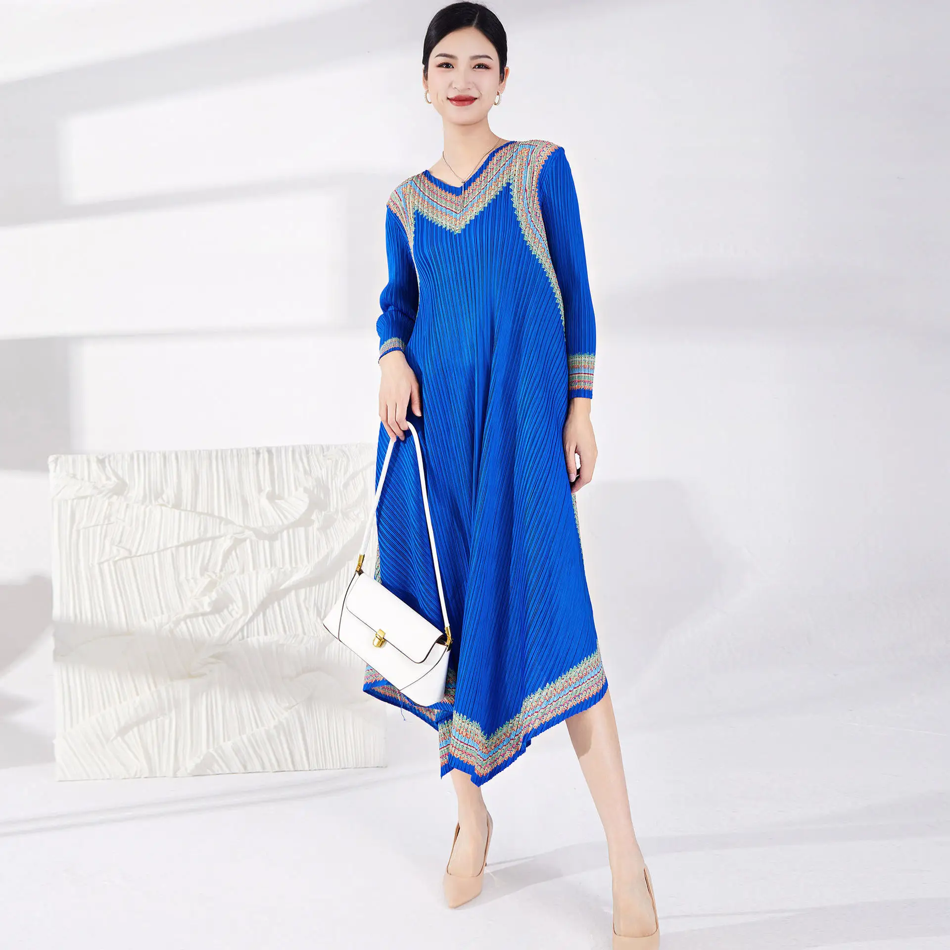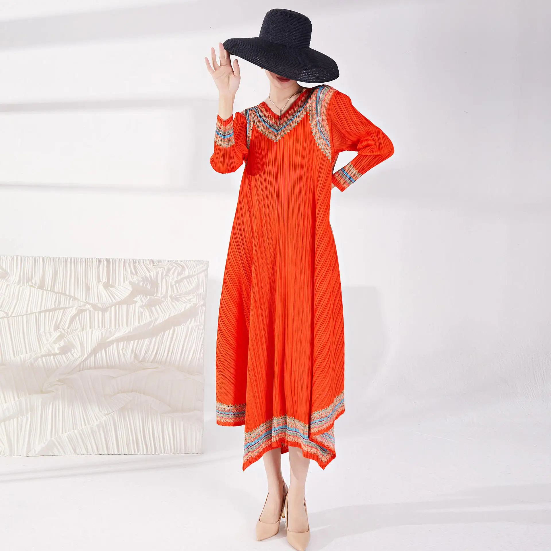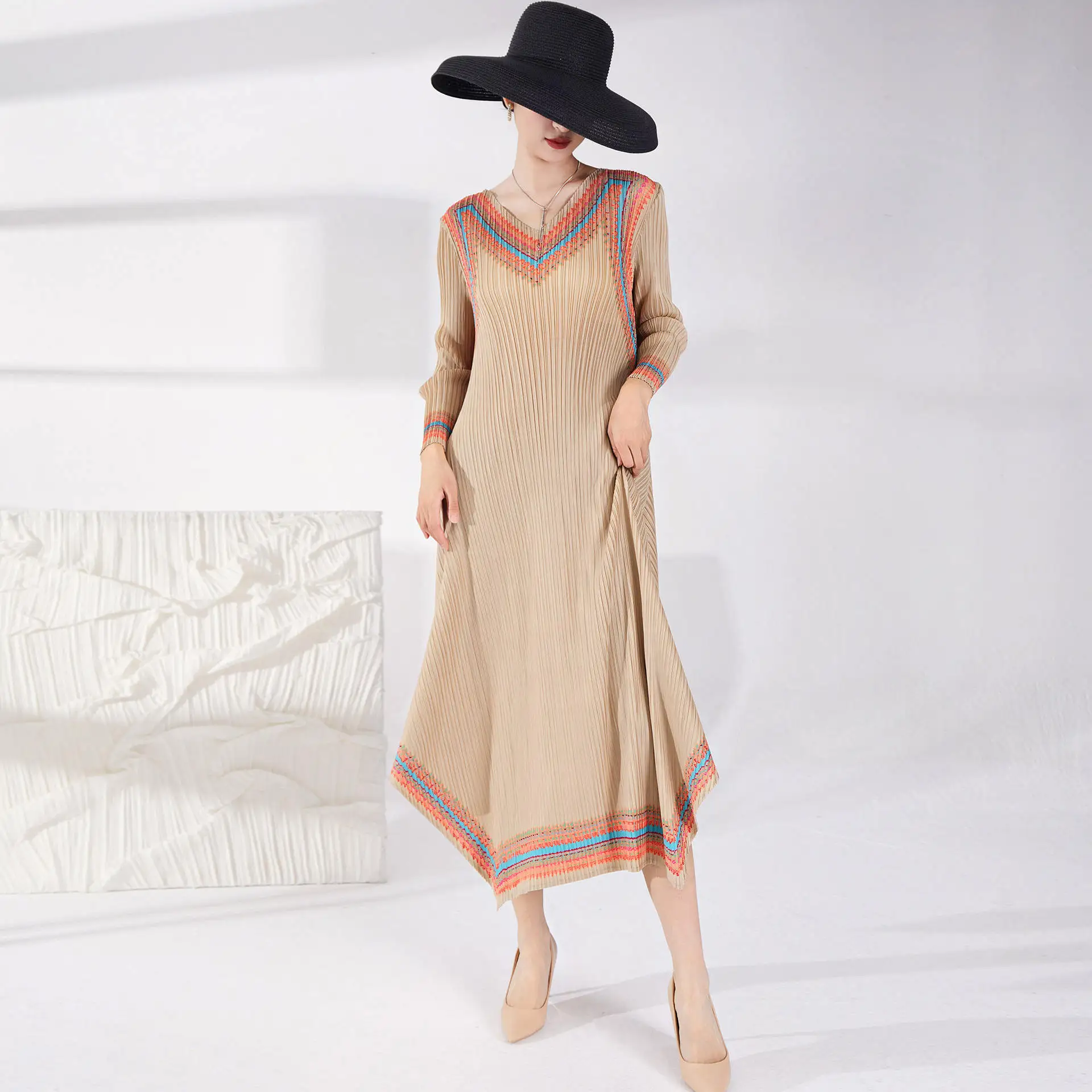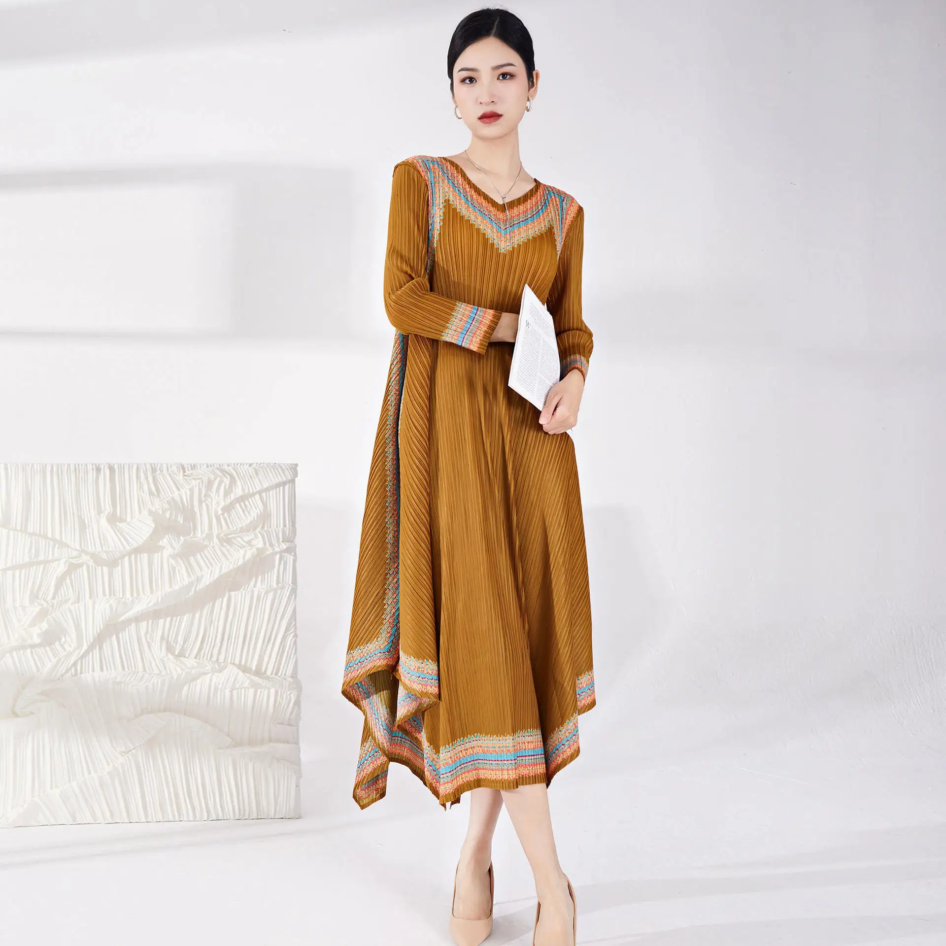 Miyake 2025 New Summer Casual Style Long Sleeve Women's African Dress With Loose Belt Printed Pleated Dress Women's Clothing