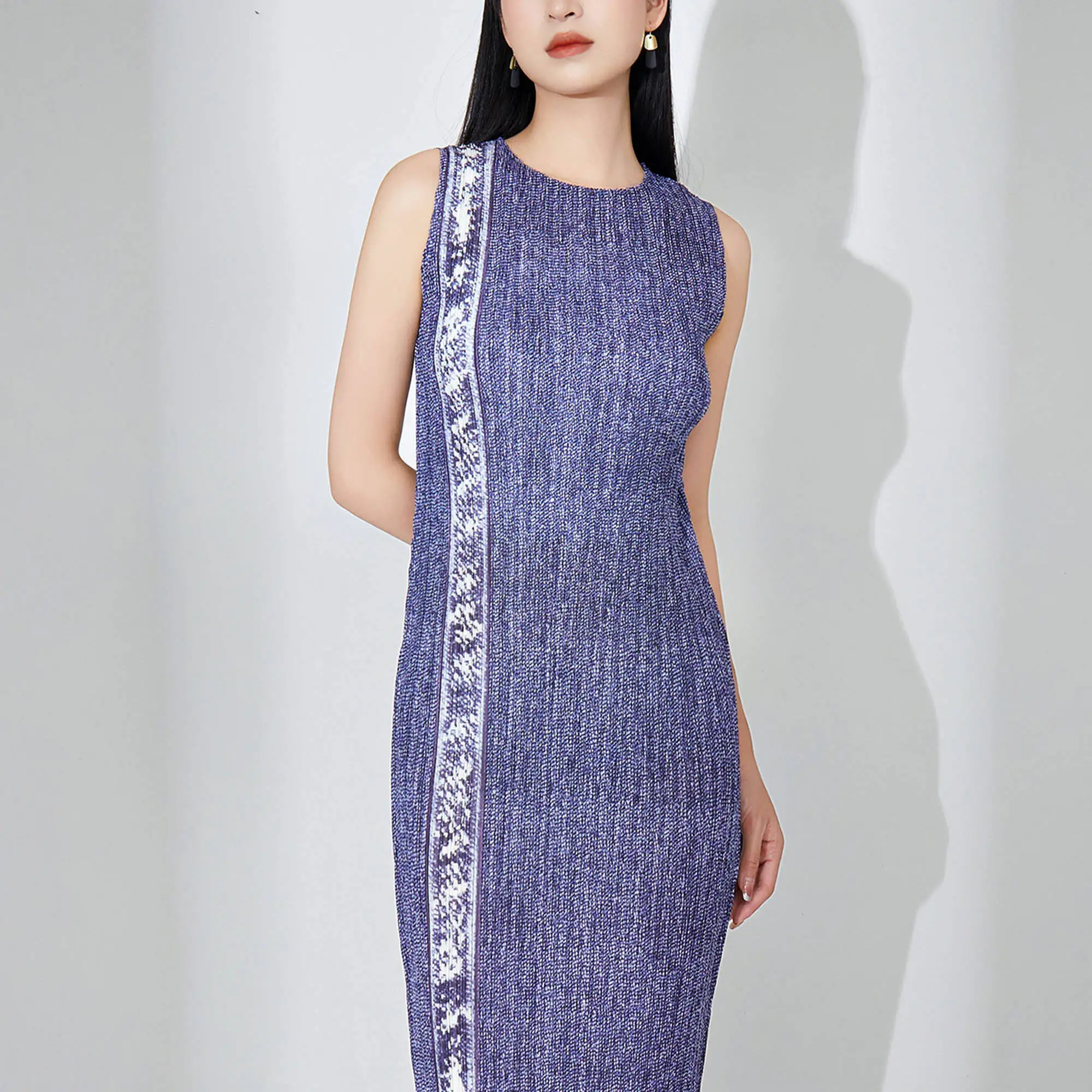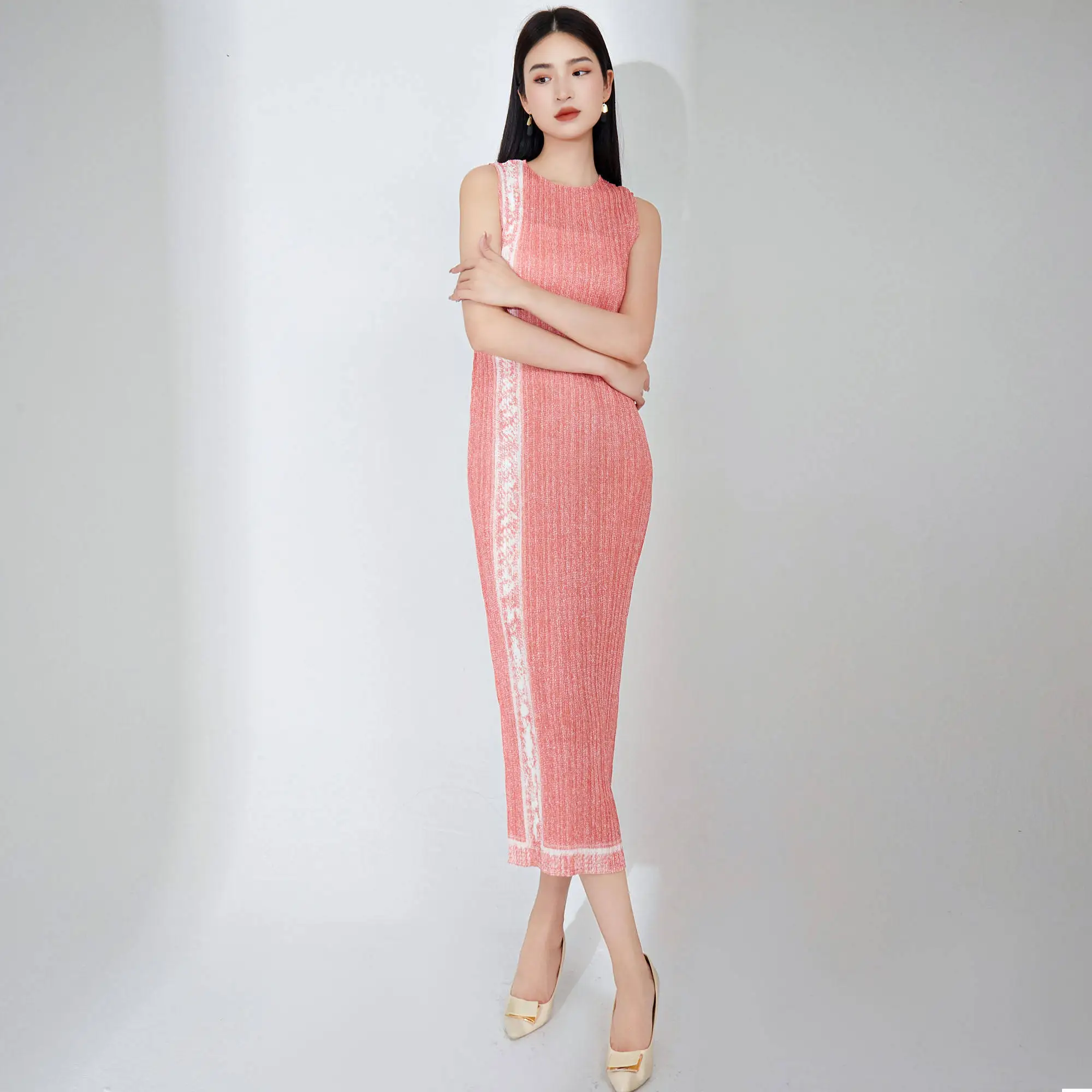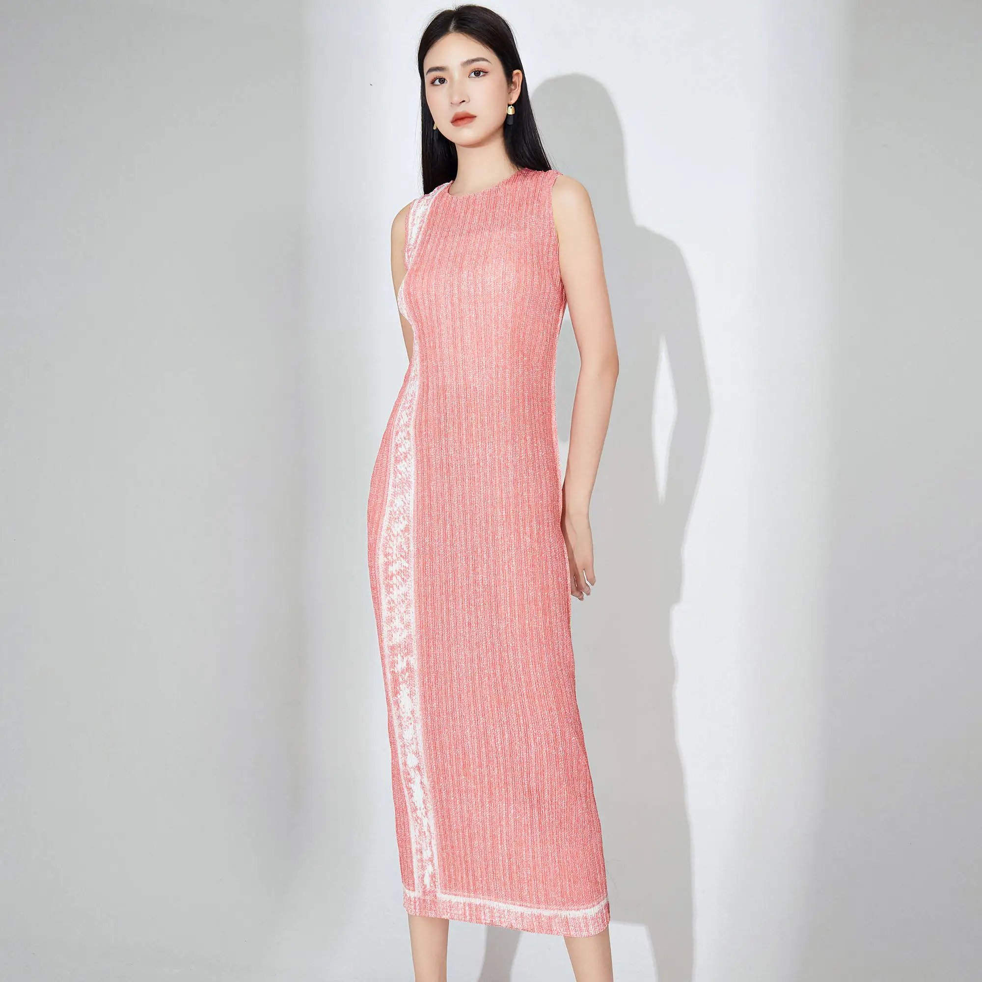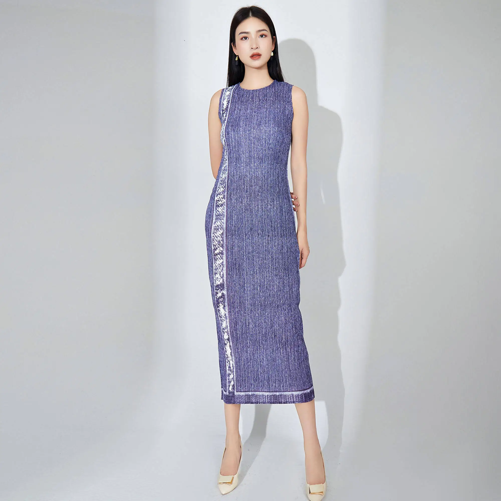 Miyake Women's Summer Sleeveless Midi Dress Casual Straight Elegant Style With High Quality Woven Fabric Natural Waistline