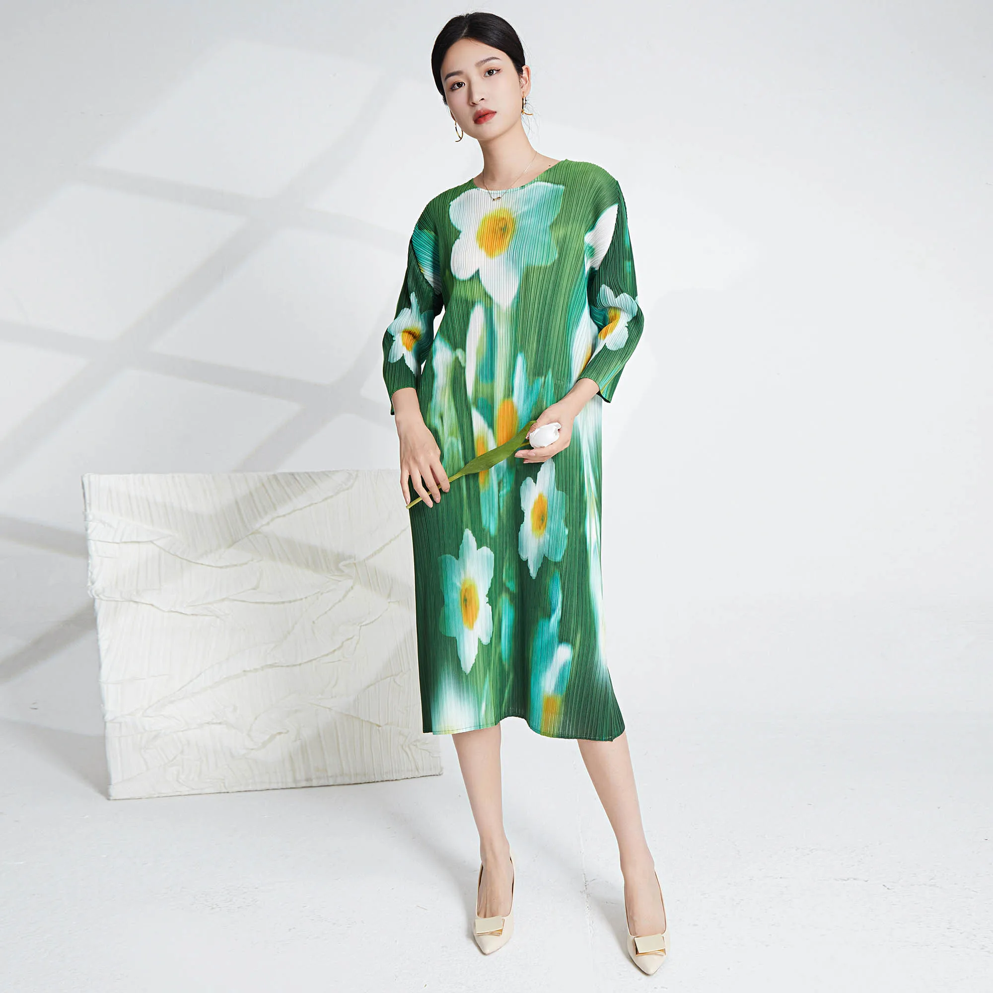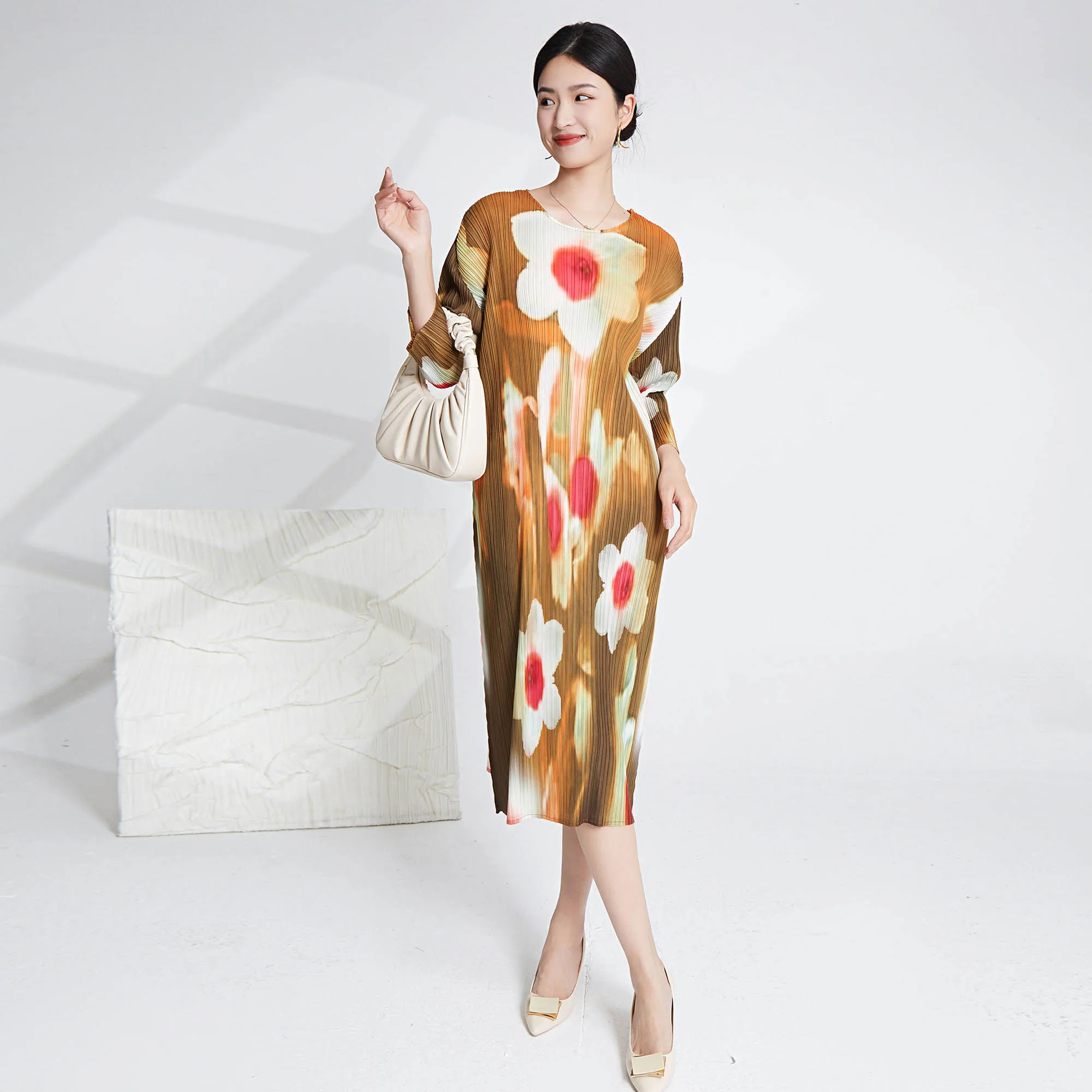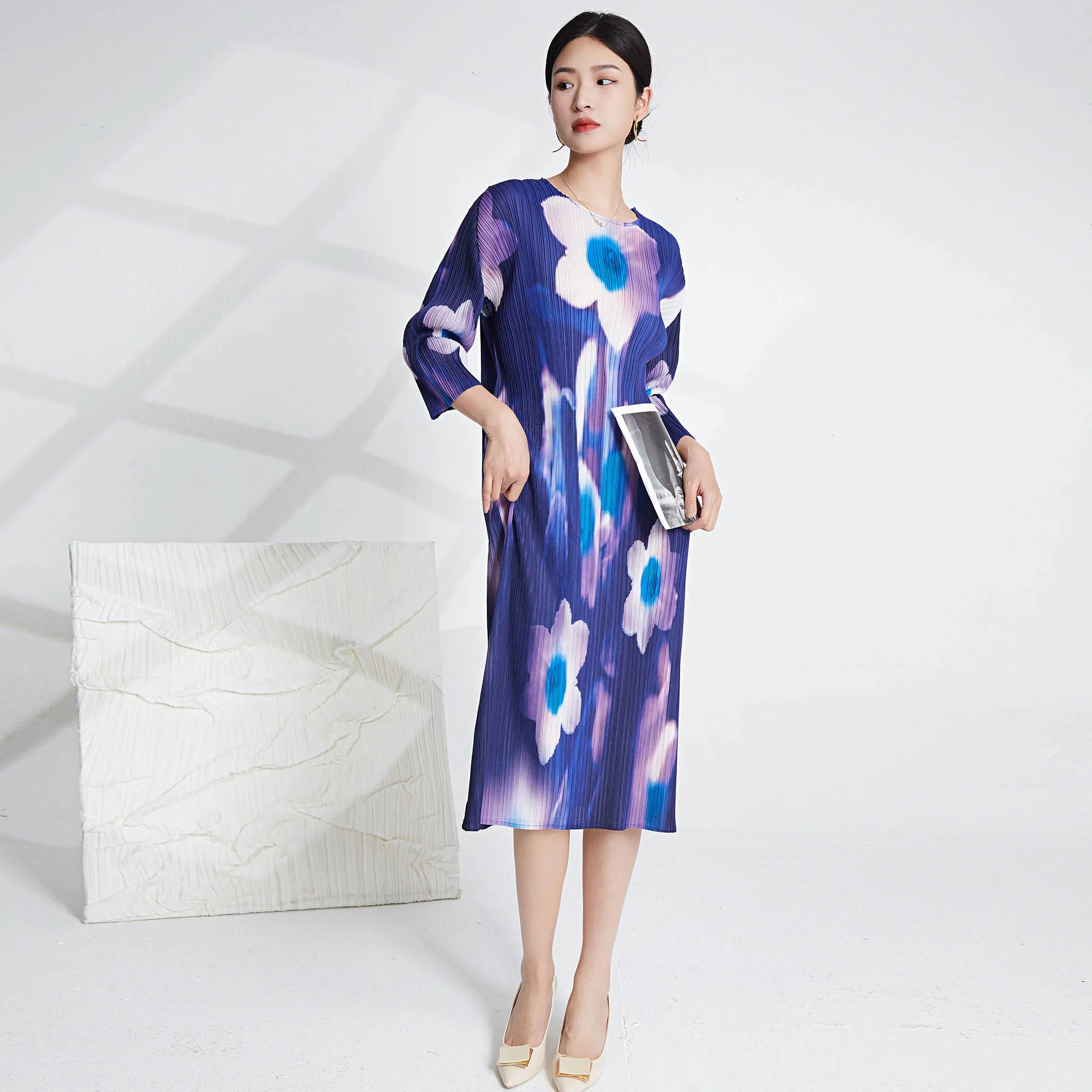 2025 Newest Miyake Pleated Dress Printed Pleated Elastic Loose Women's Dress Casual Style Dress