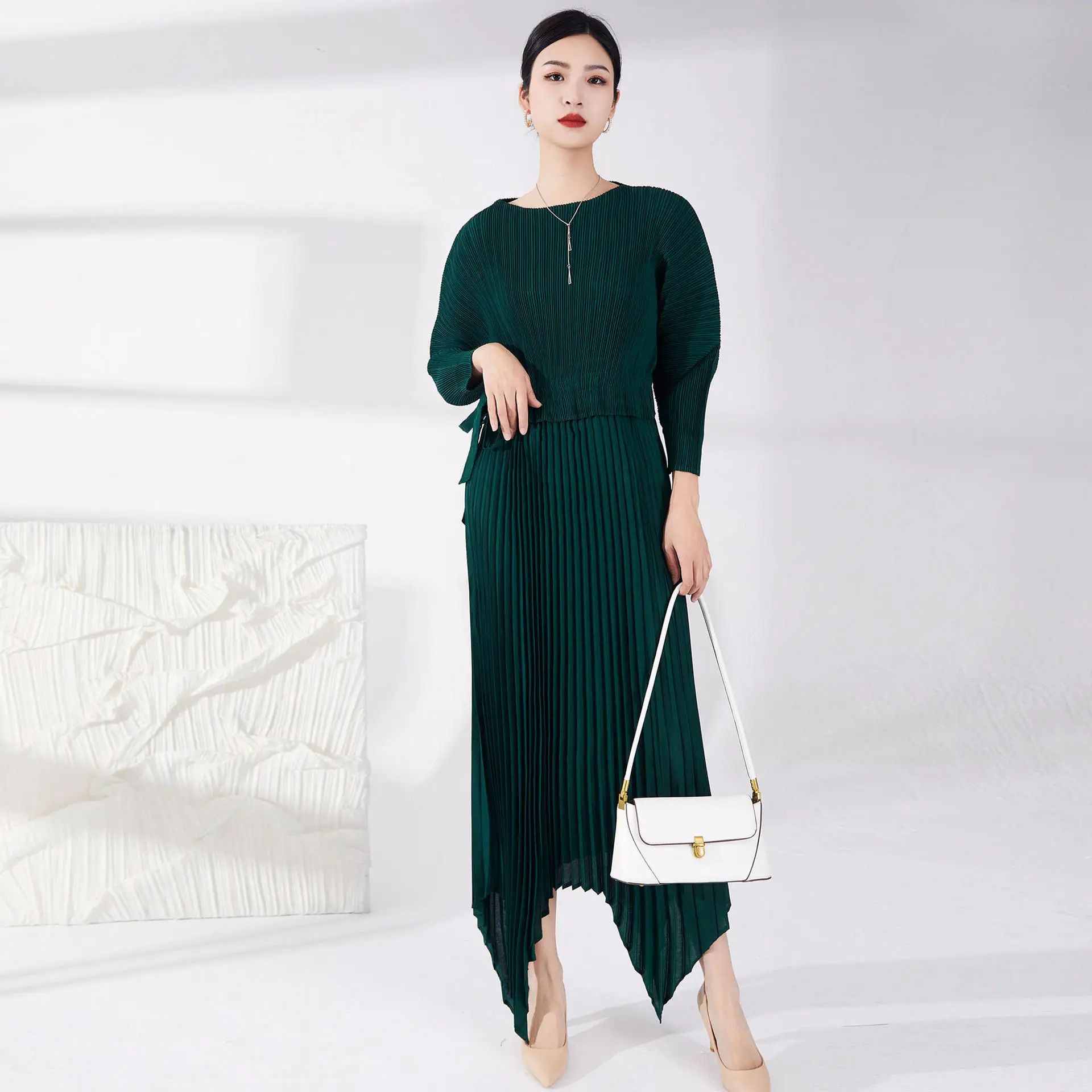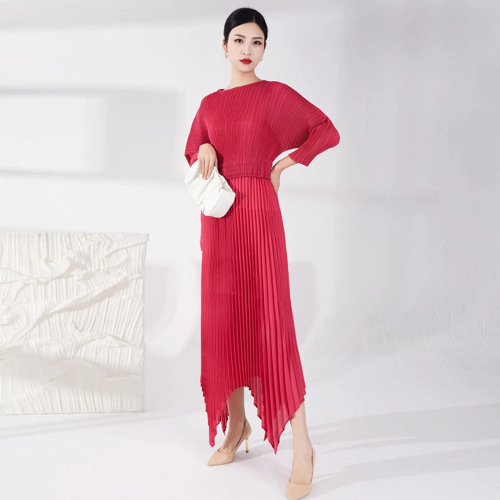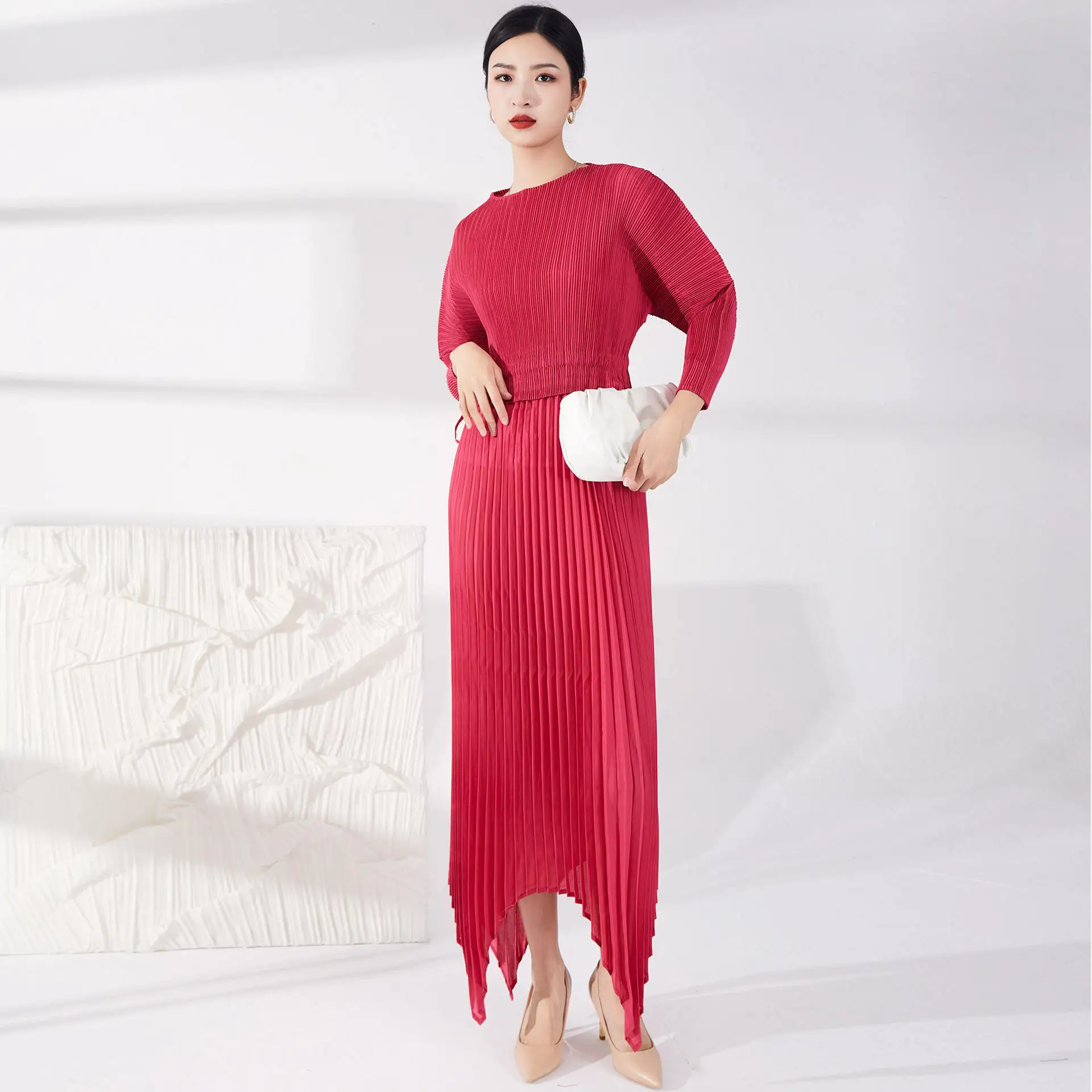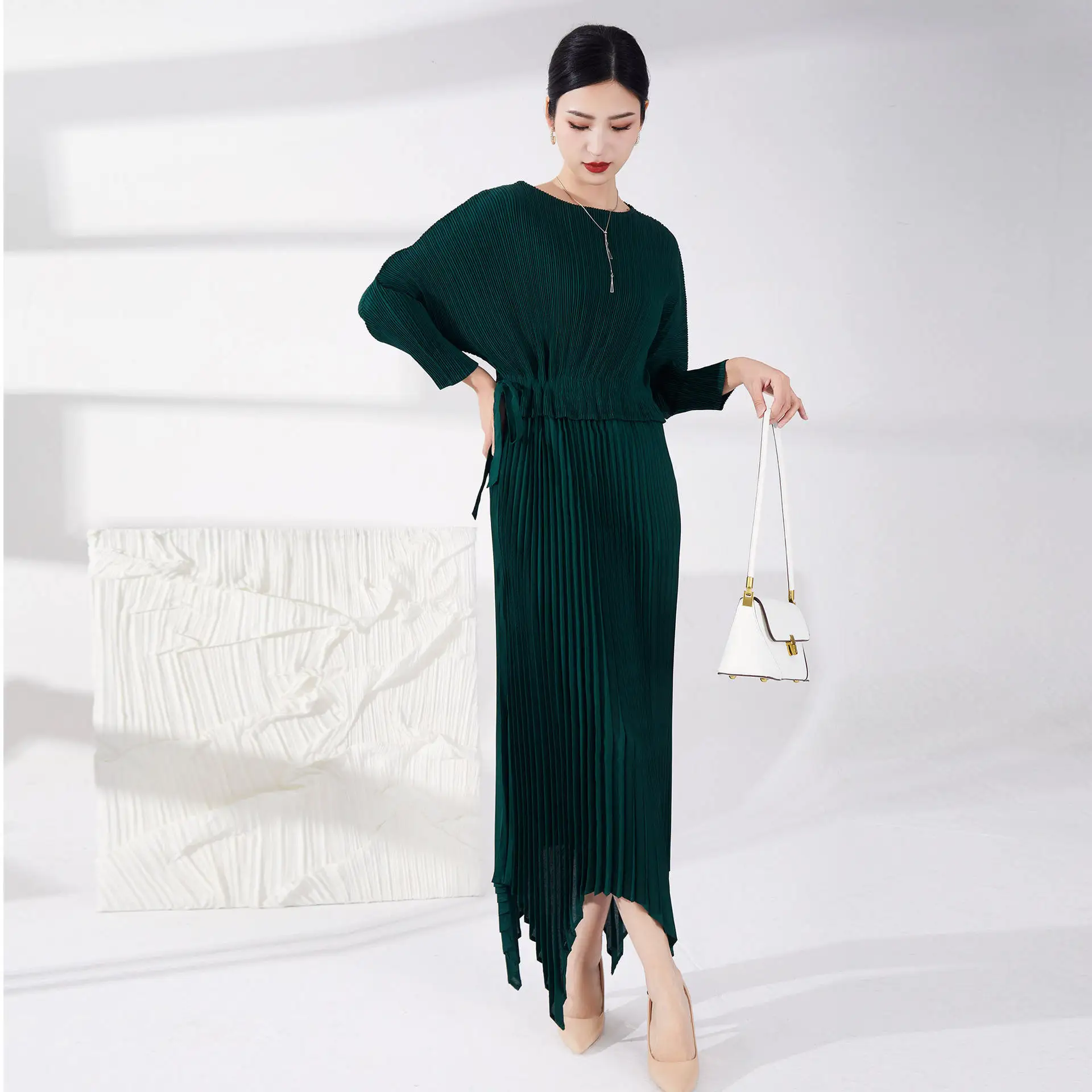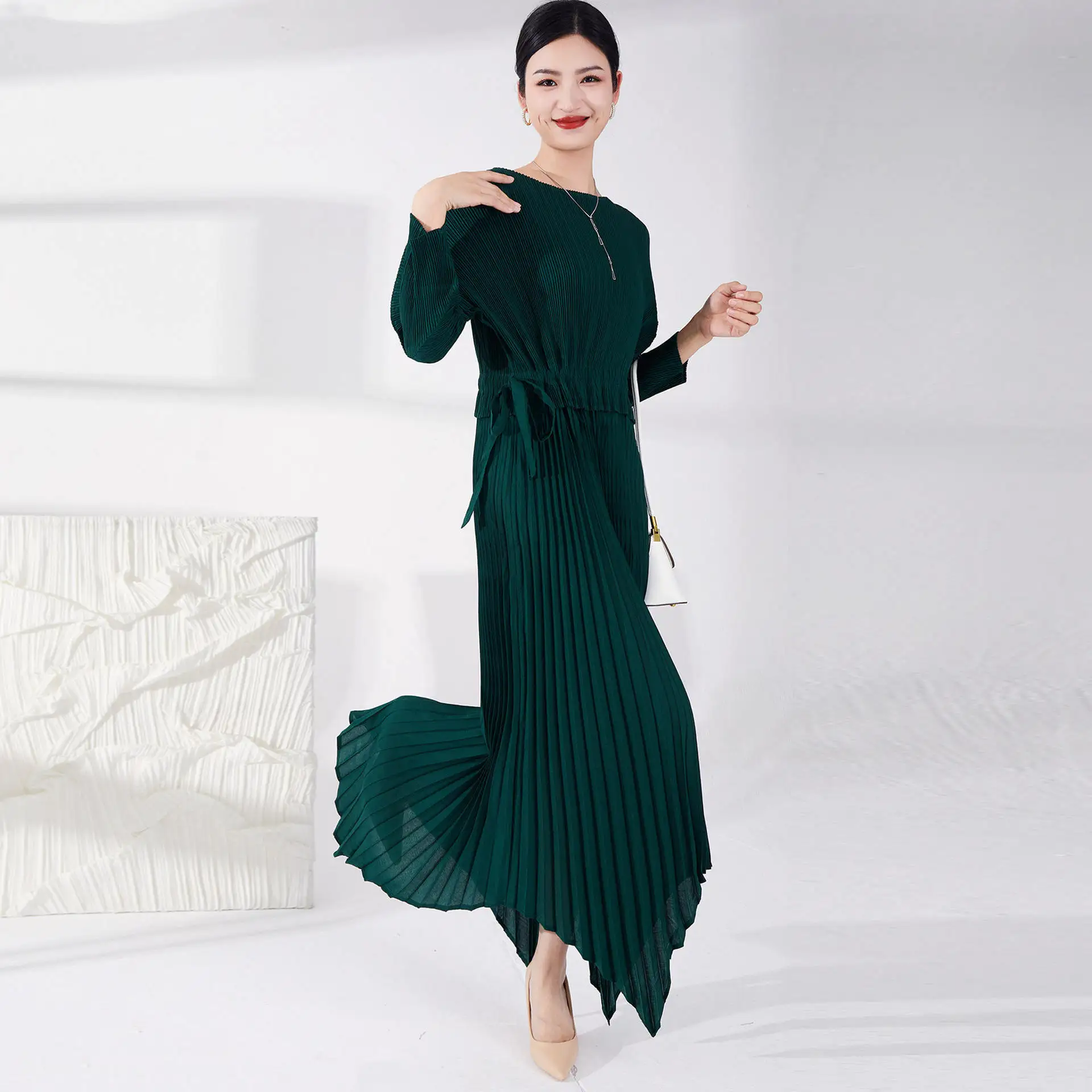 High Quality Women's Casual Style Pleated Dress Tie Irregular Pleated Design With Long Sleeves Printed Decoration