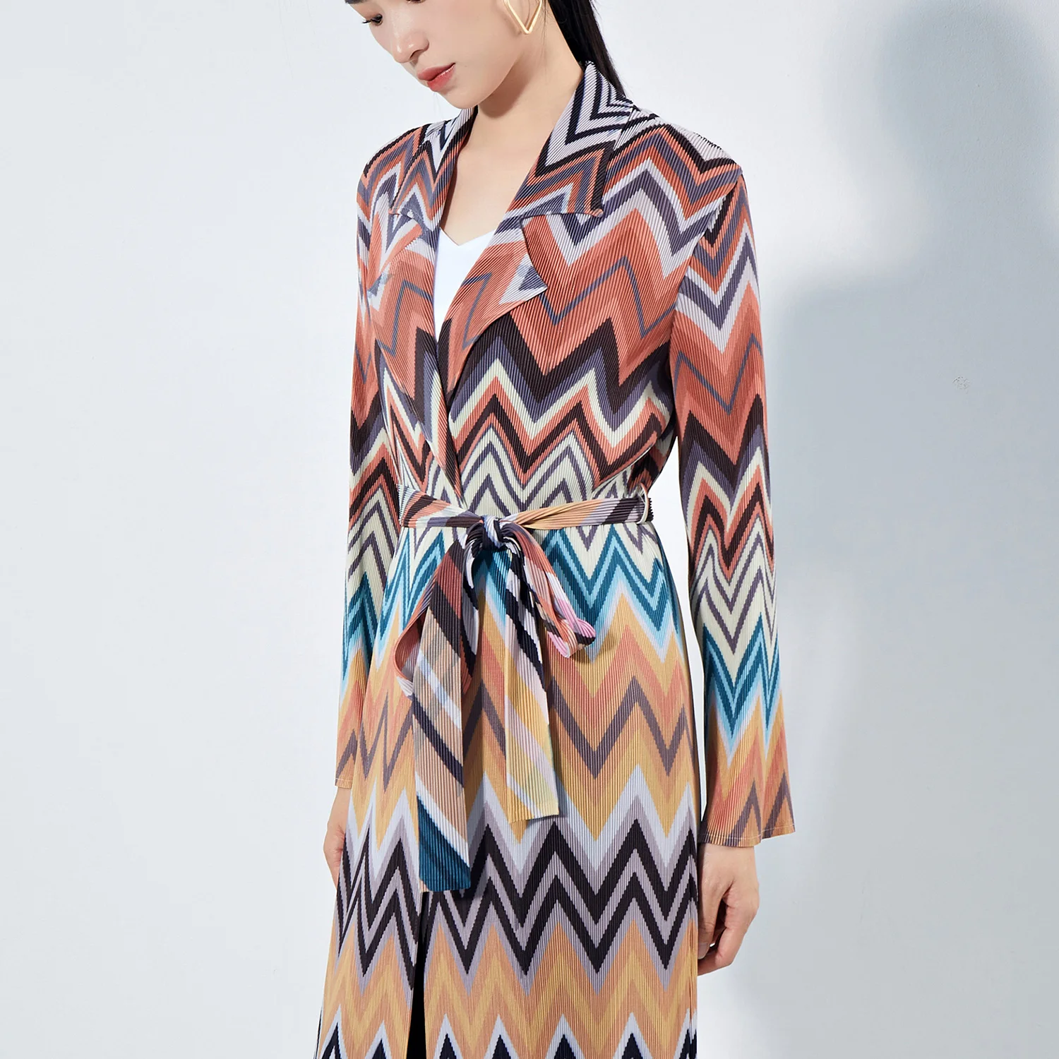 High Quality Polyester Long Trench Coat for Muslim Women Conservative Dress Belt Miyake Pleated Print Kaftan Robes