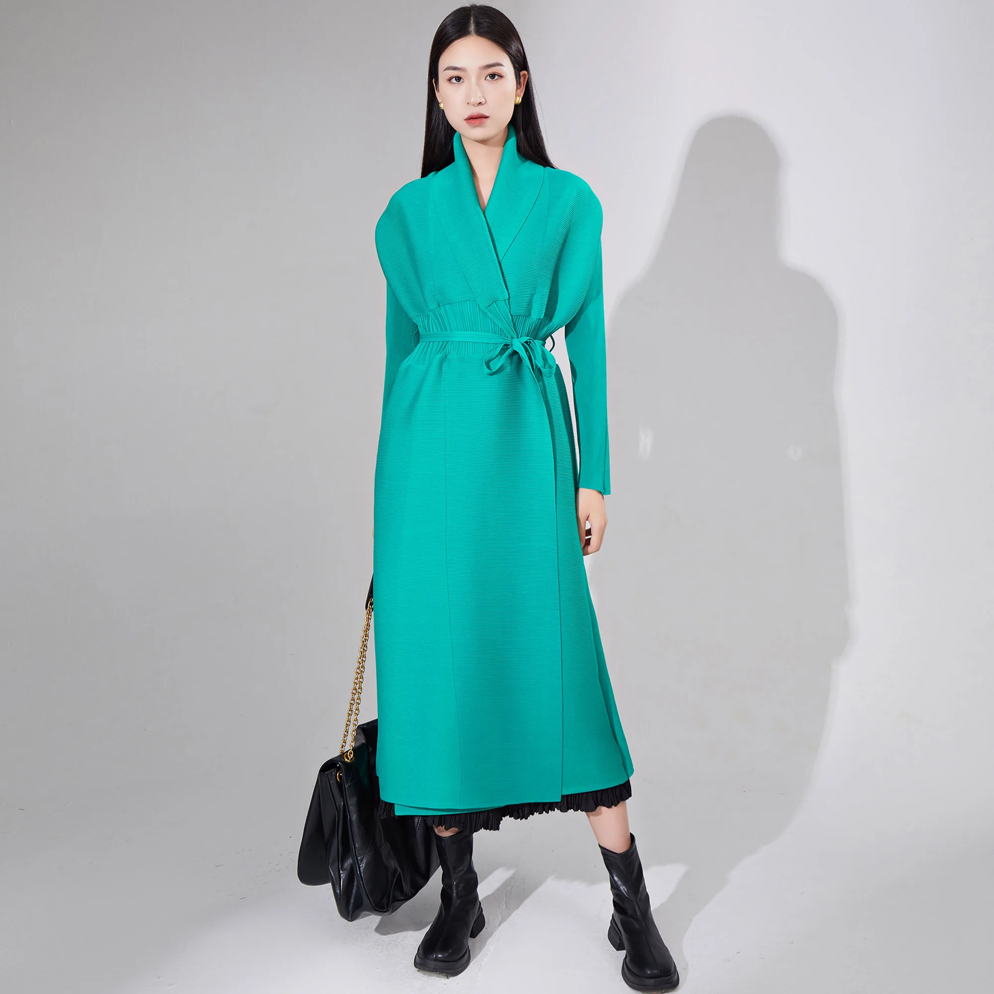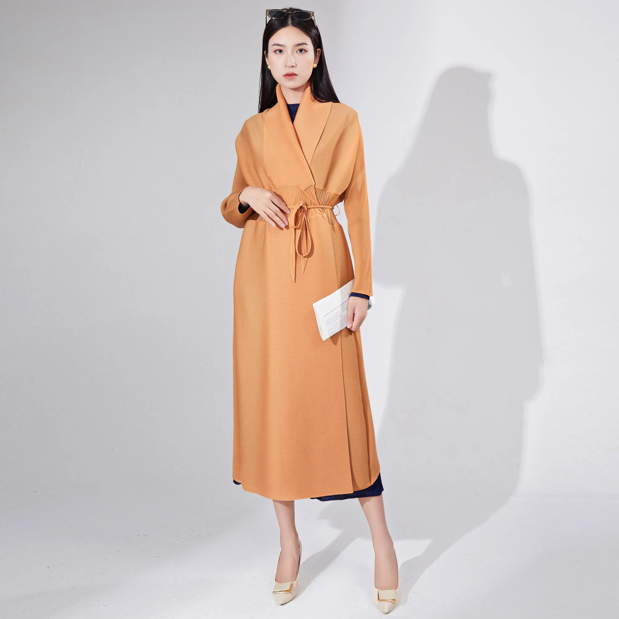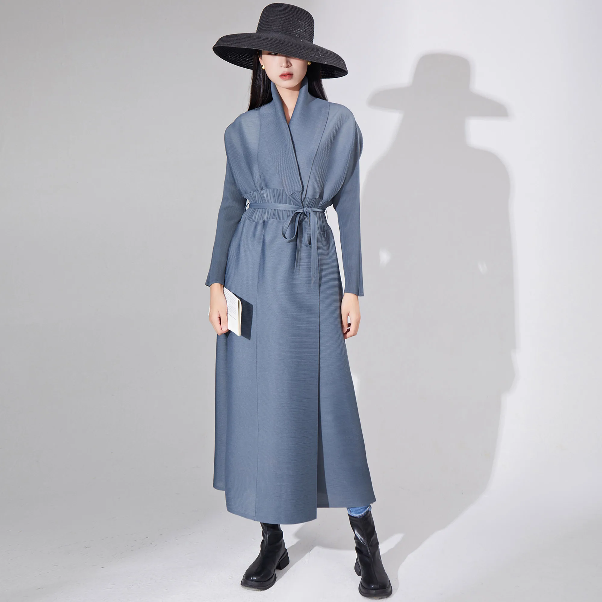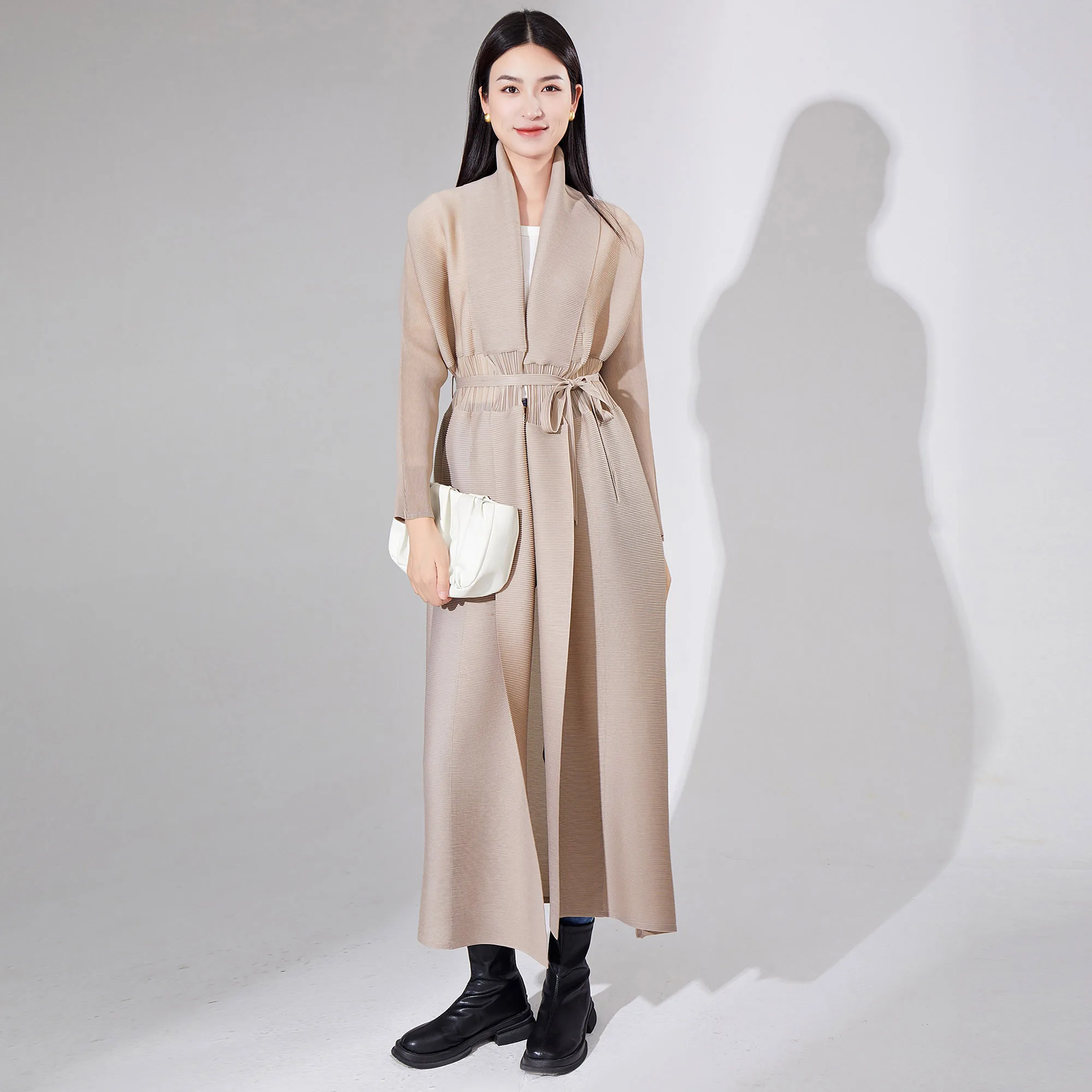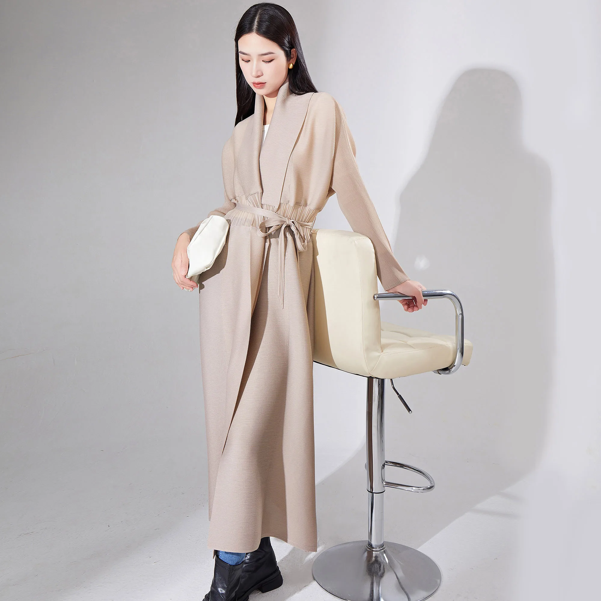 2025 New Fashion Miyake Women's Pleated Design Long Windbreaker Jacket Waist Tie Lapel Women's Coats Abaya and Jackets Robe