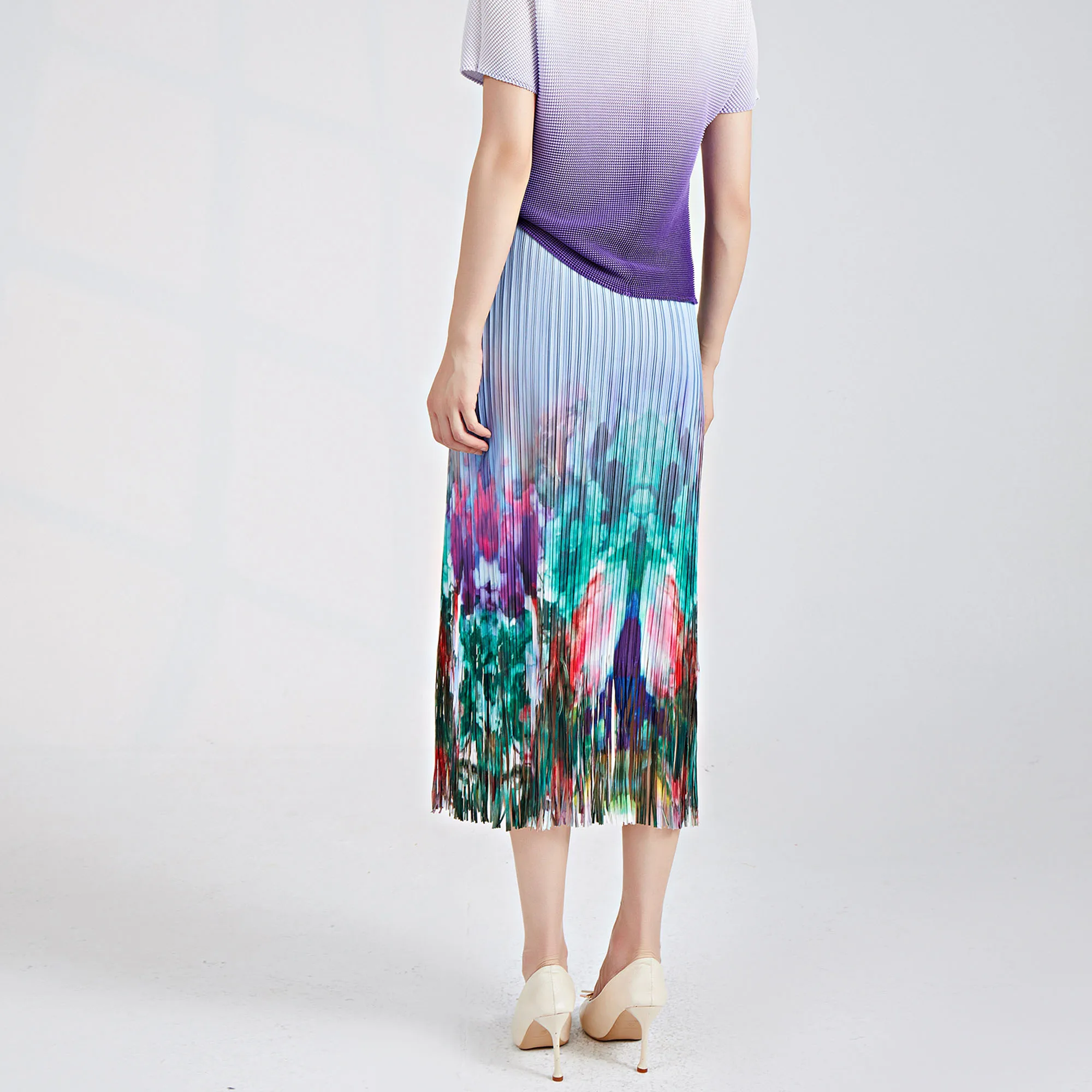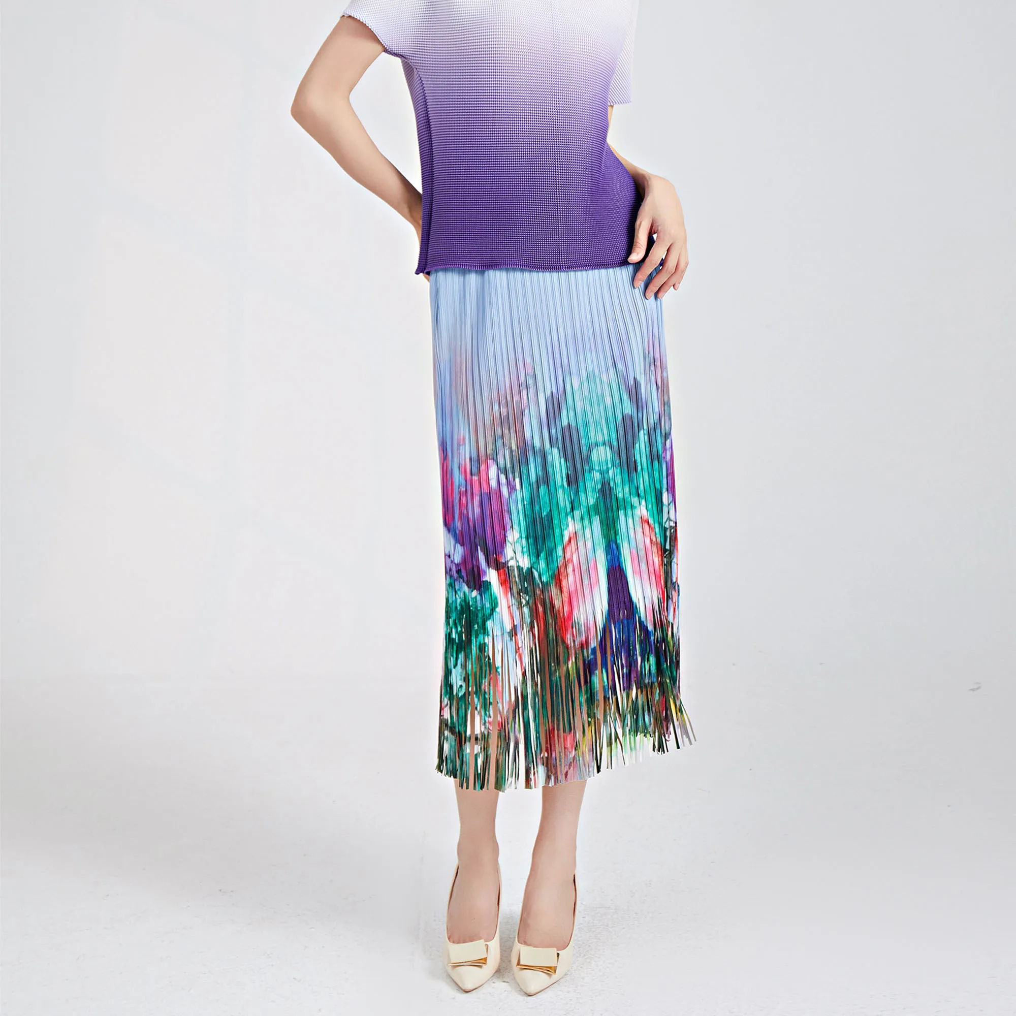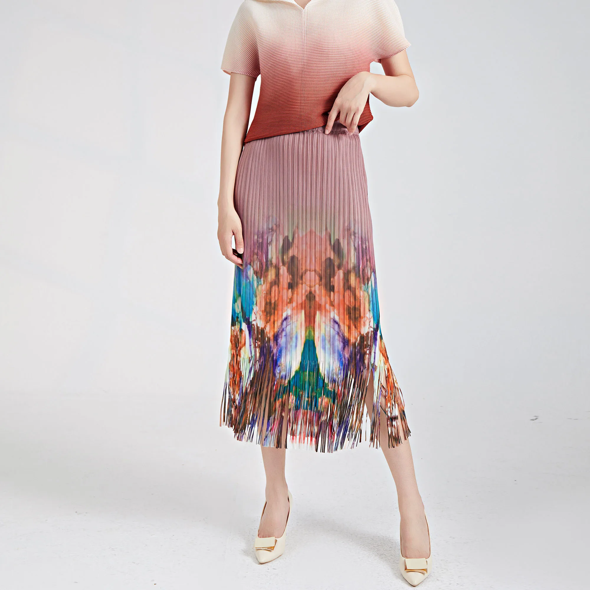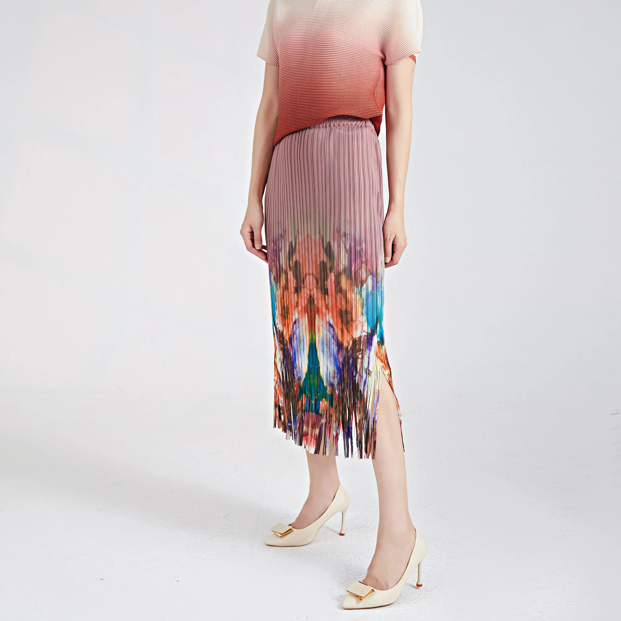 Pleated Fringed Midi Skirt Vintage Tie-Dye Fashionable and Versatile Elastic Waist Hip-Hugging Miyake Straight Pencil Skirt