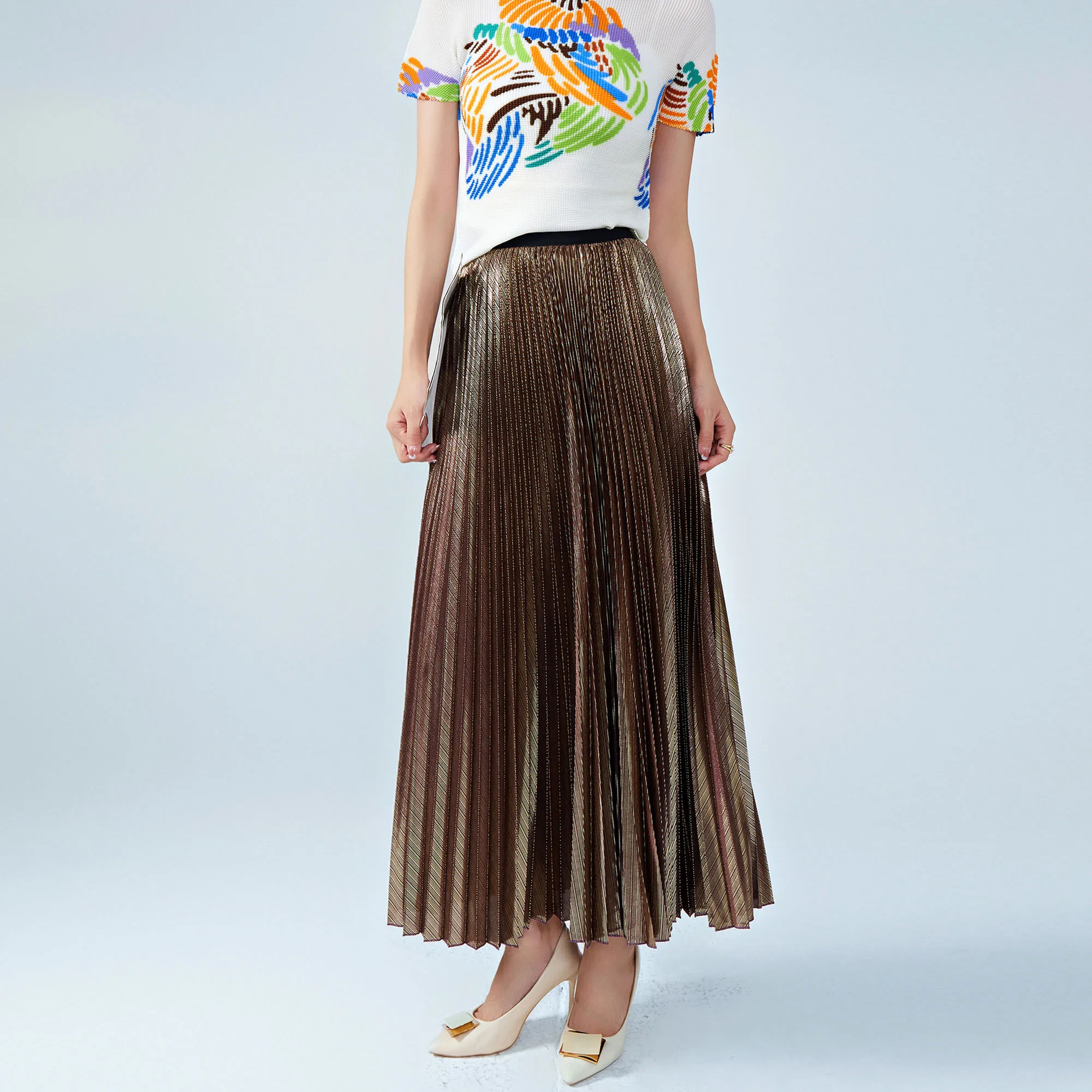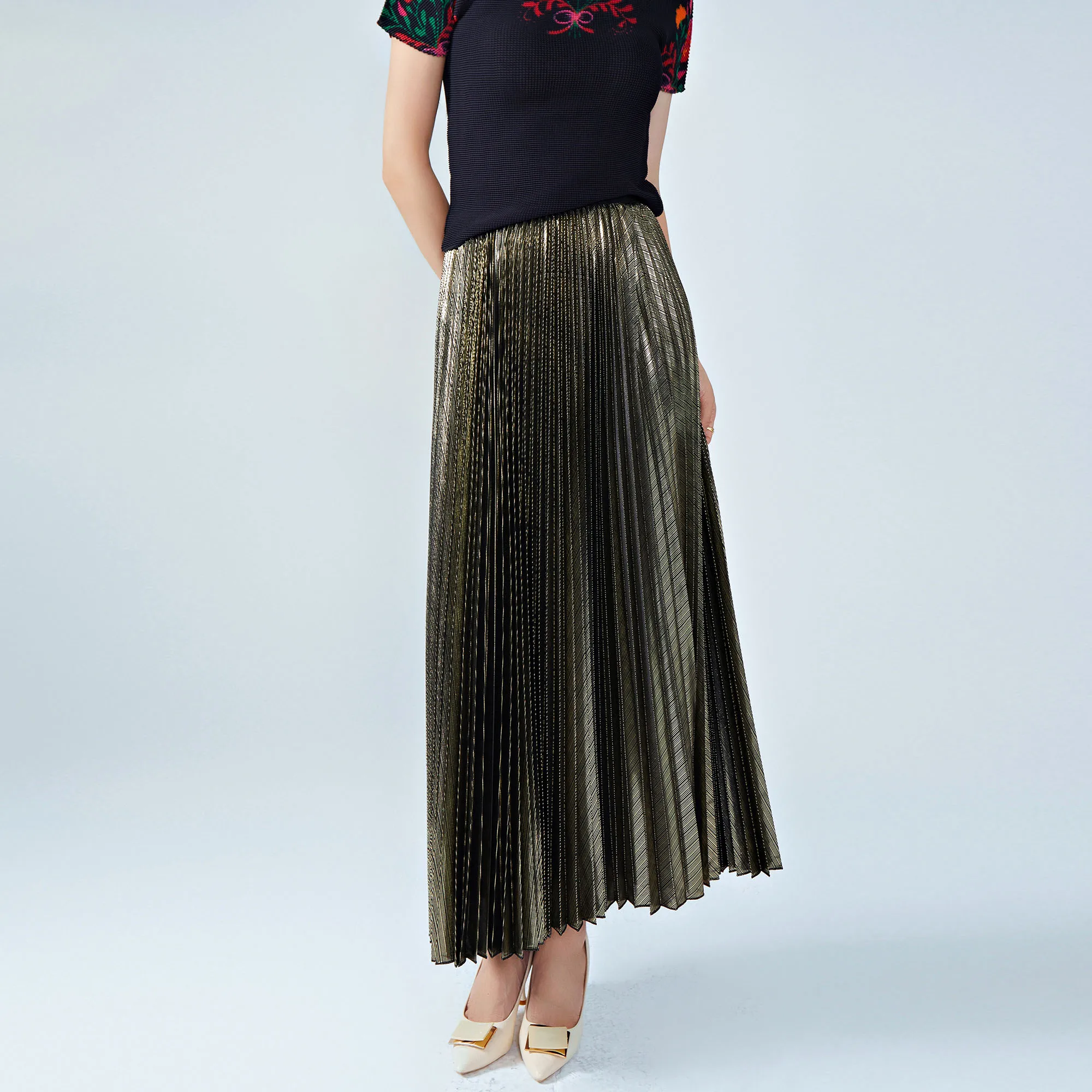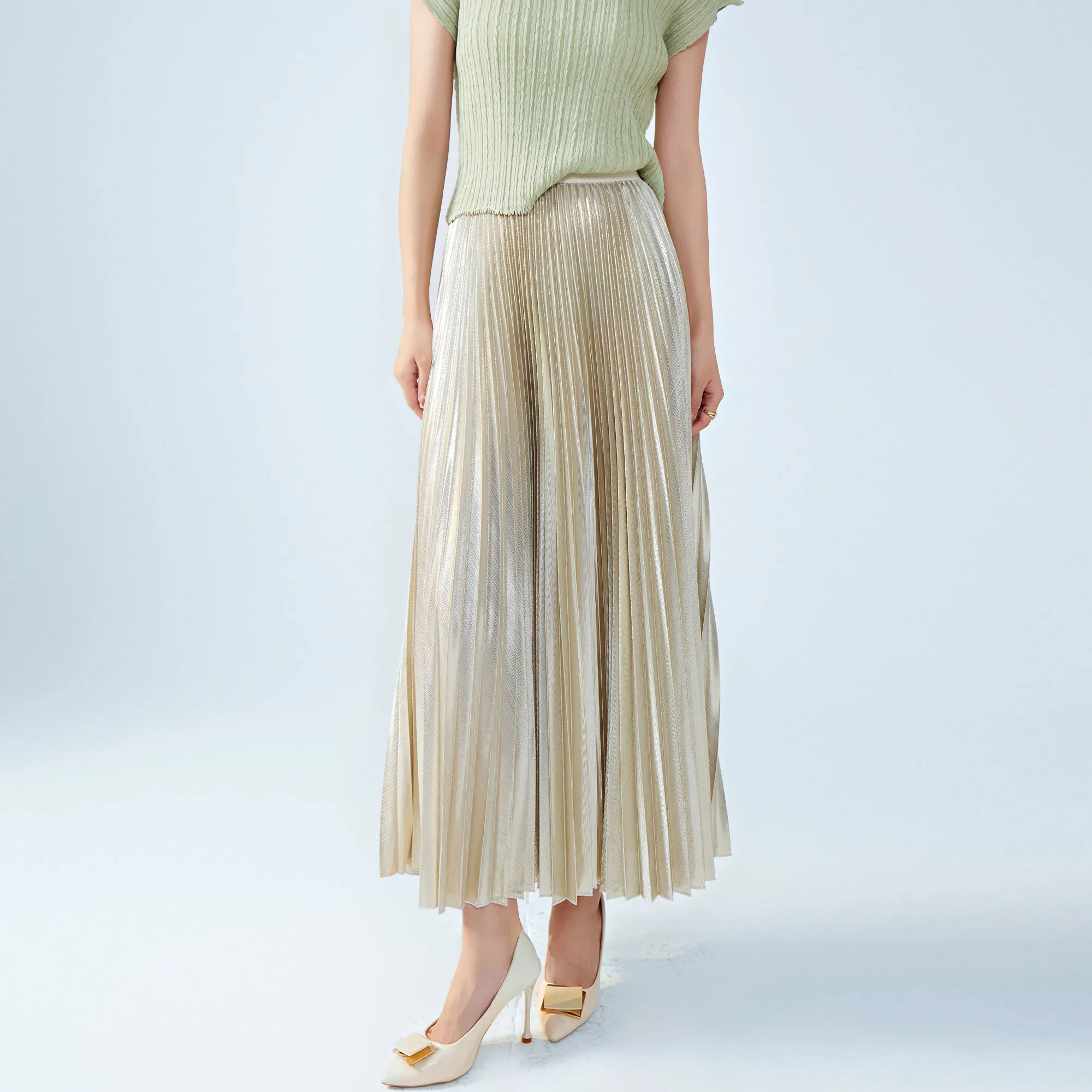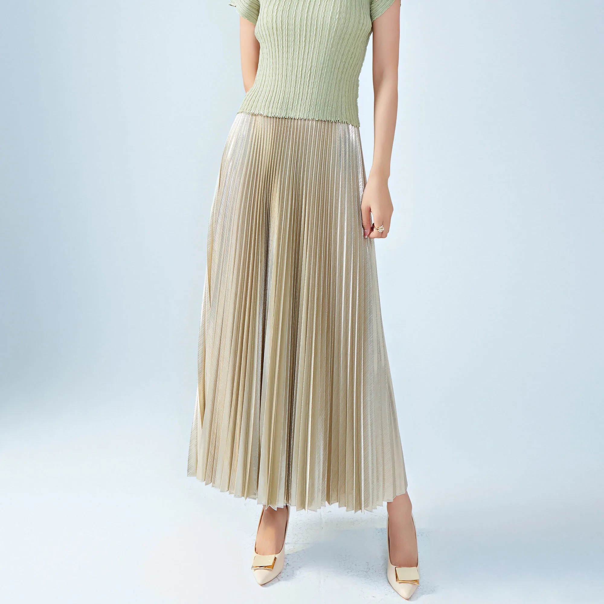2025 New Women's Metallic Pleated Skirt Shiny Polyester Draped Silhouette Loose Fit Flared Midi Skirt