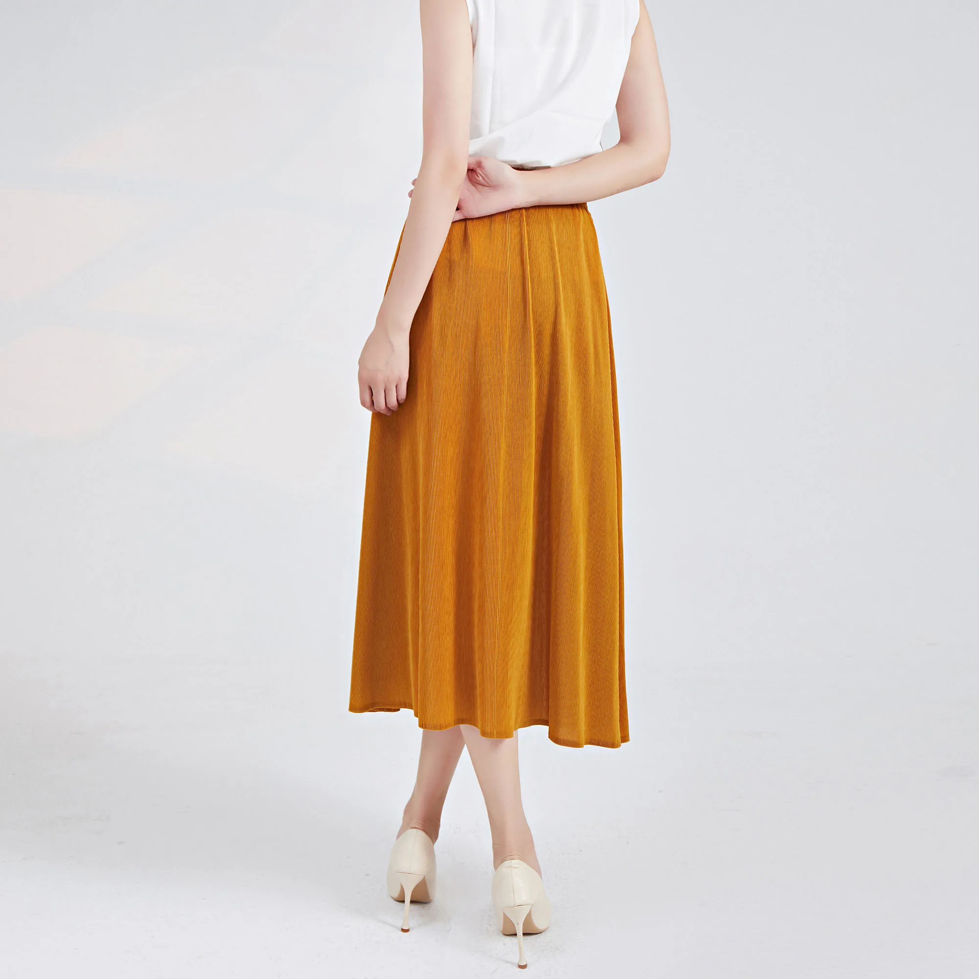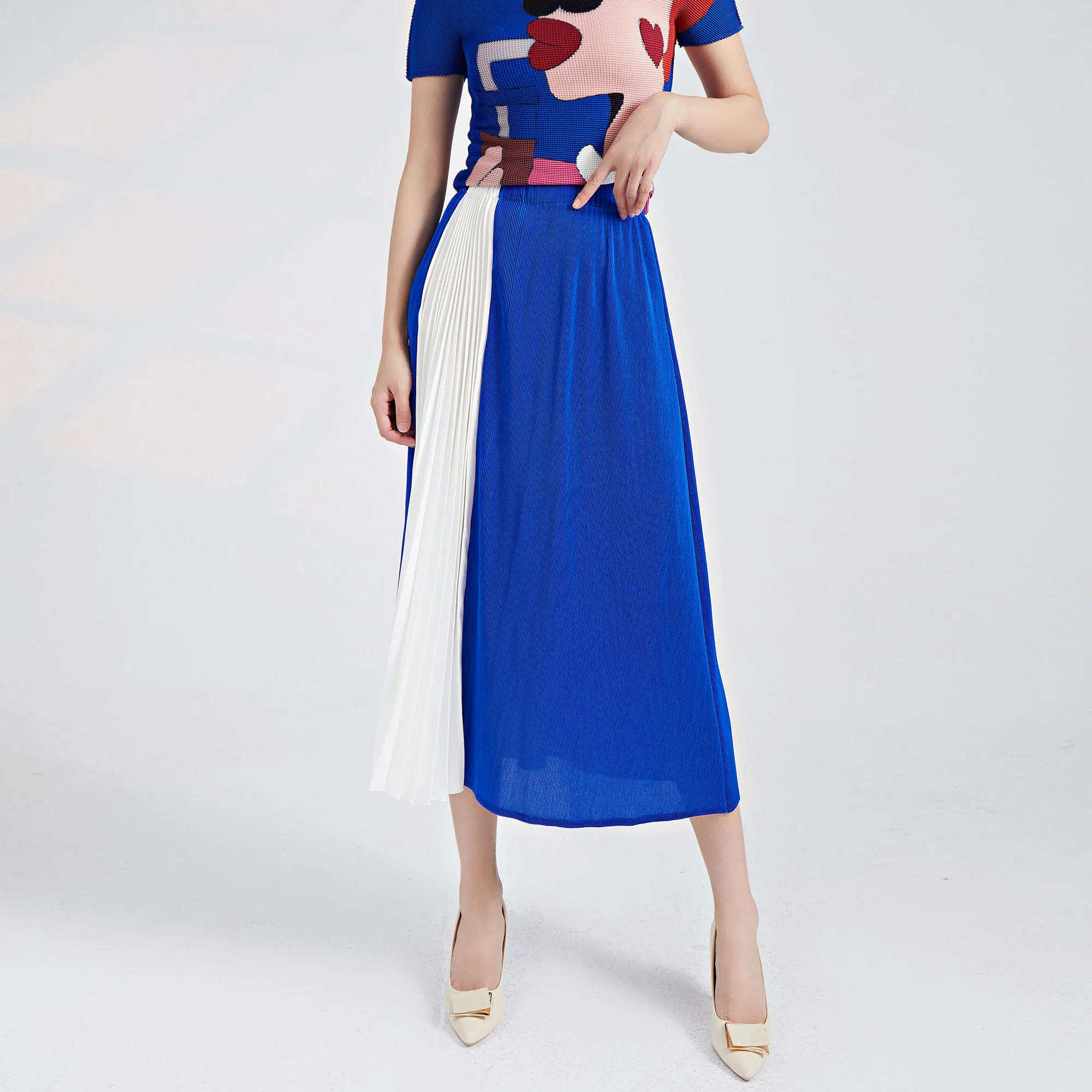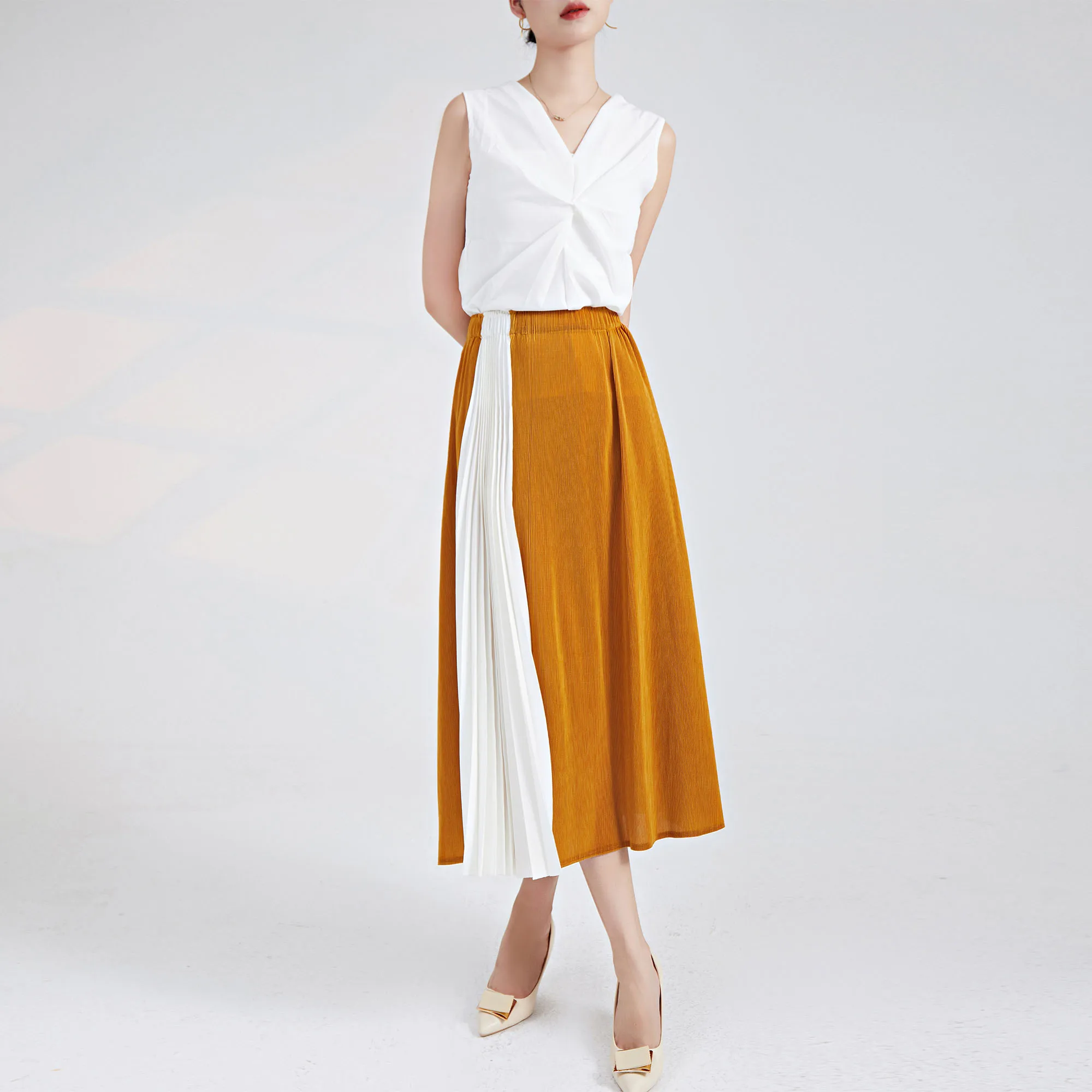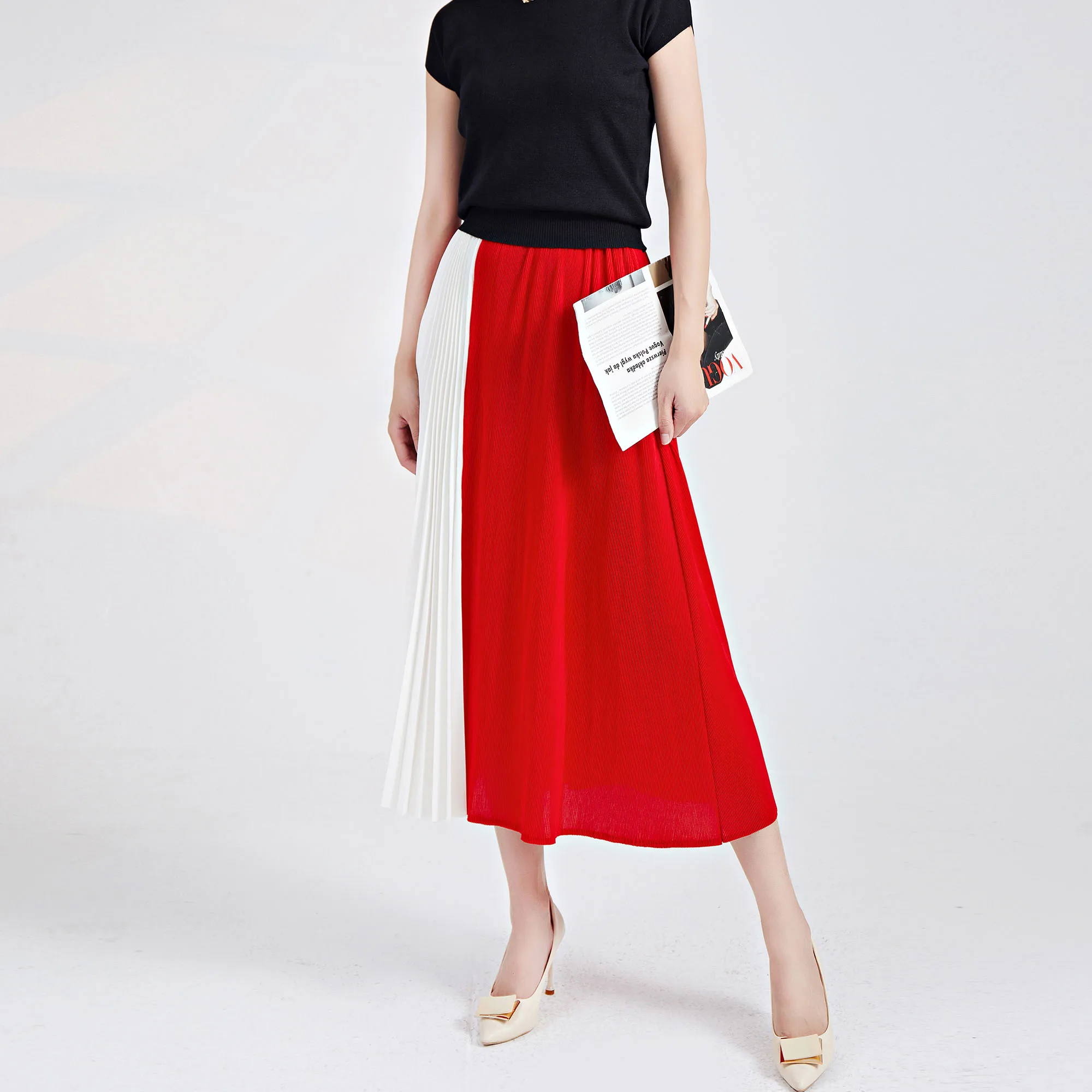 2025 Latest Design Pleated Midi Skirt Elastic Waist Color Block A-line Versatile and Slimming Summer Women's Skirt