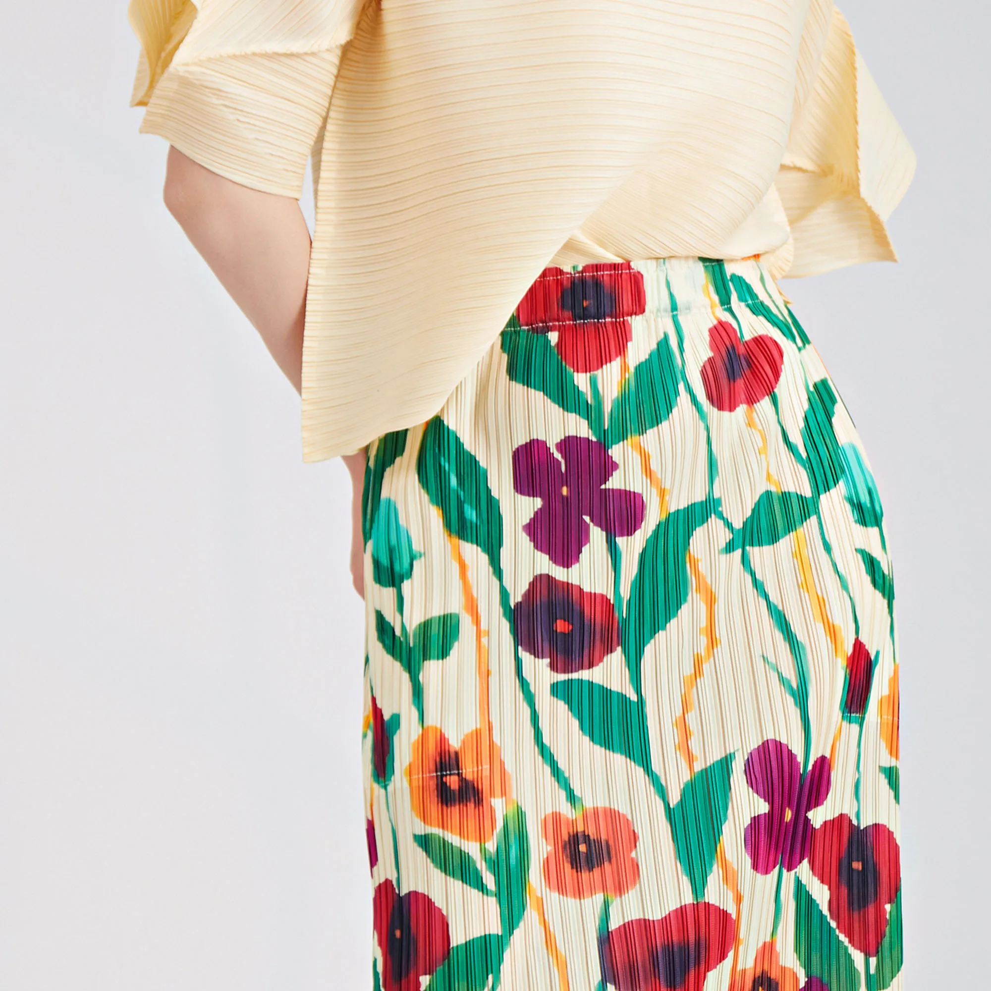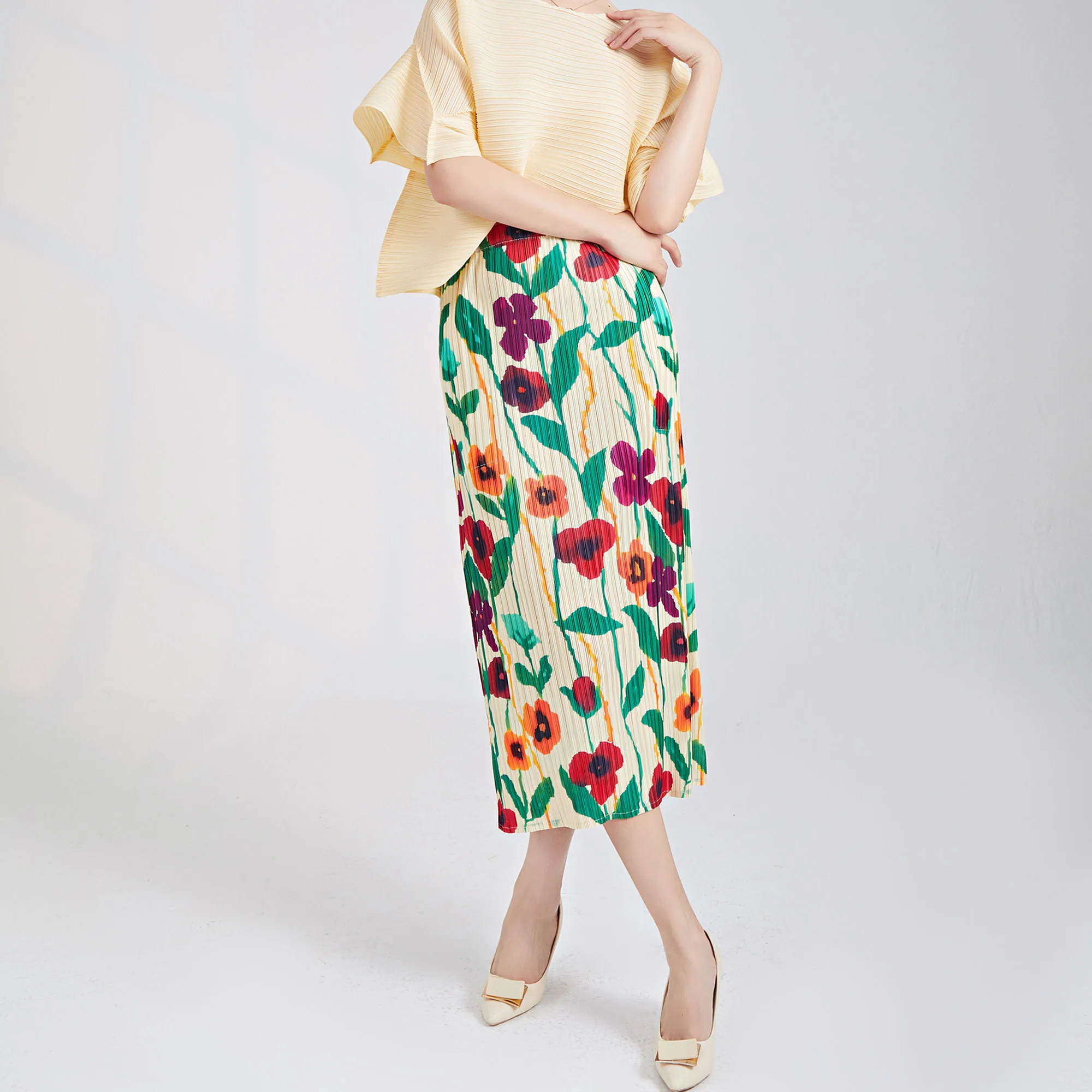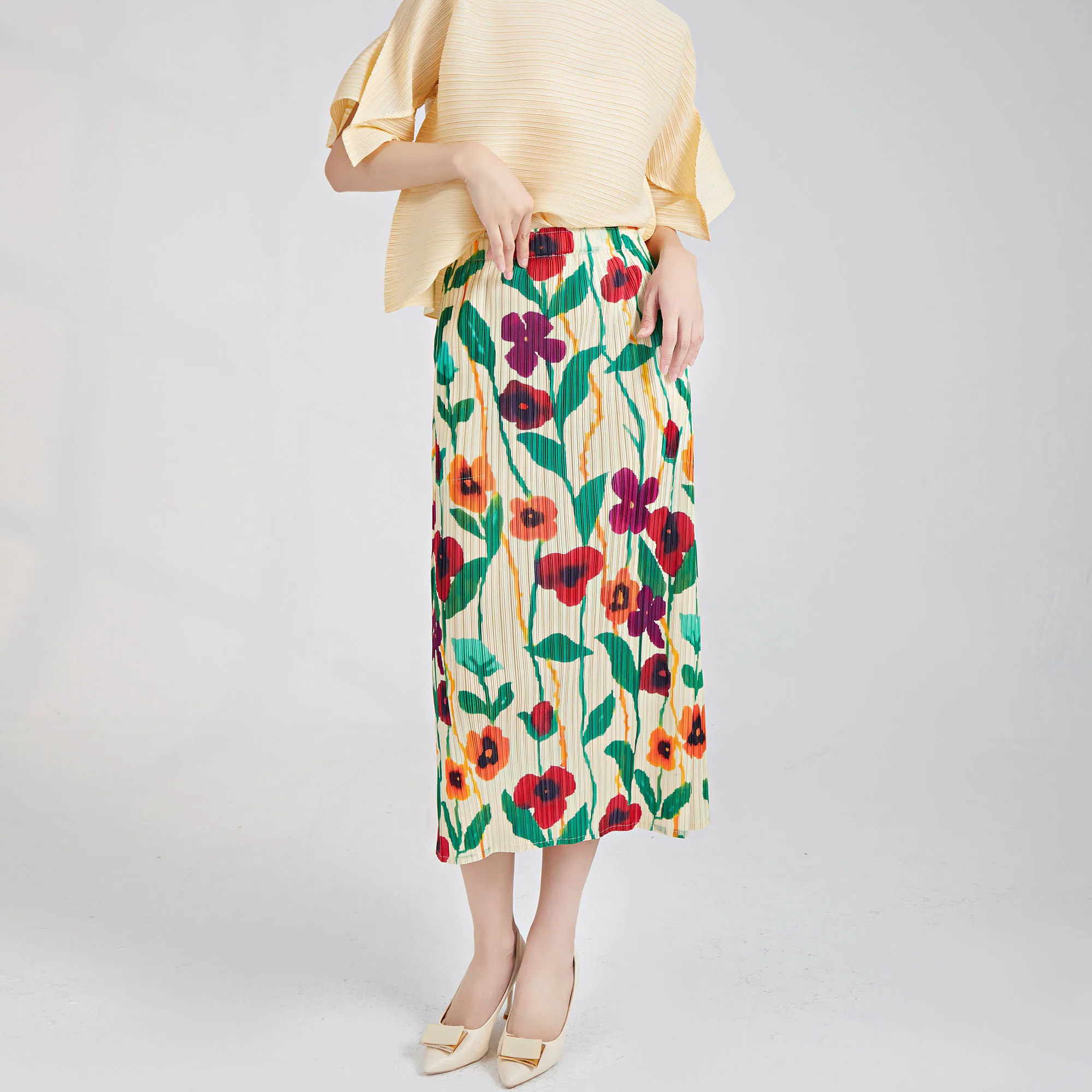 Hot Selling Miyake Pleated Midi Skirt 2023 Summer New Vintage Print Straight Pencil Skirt