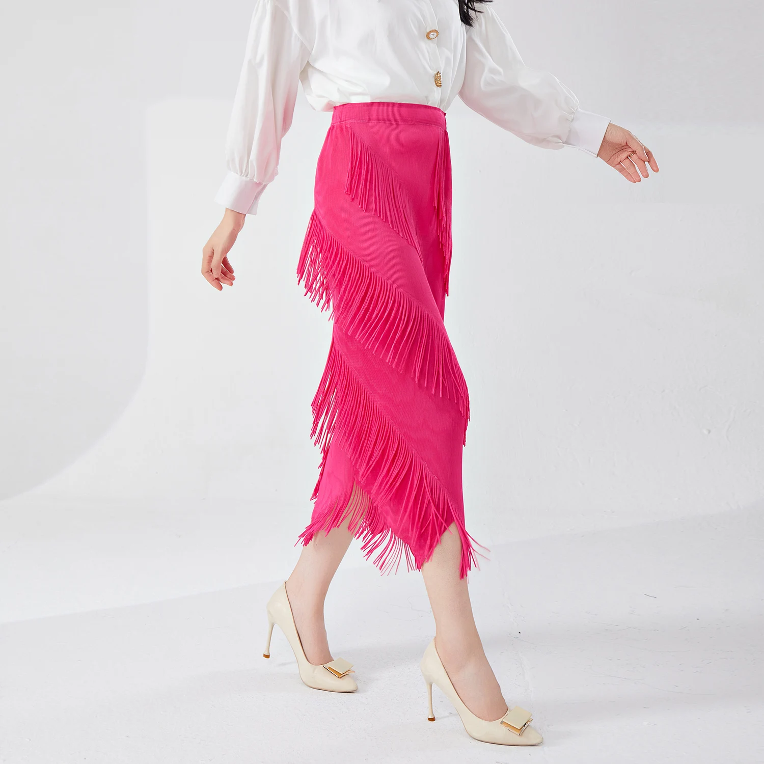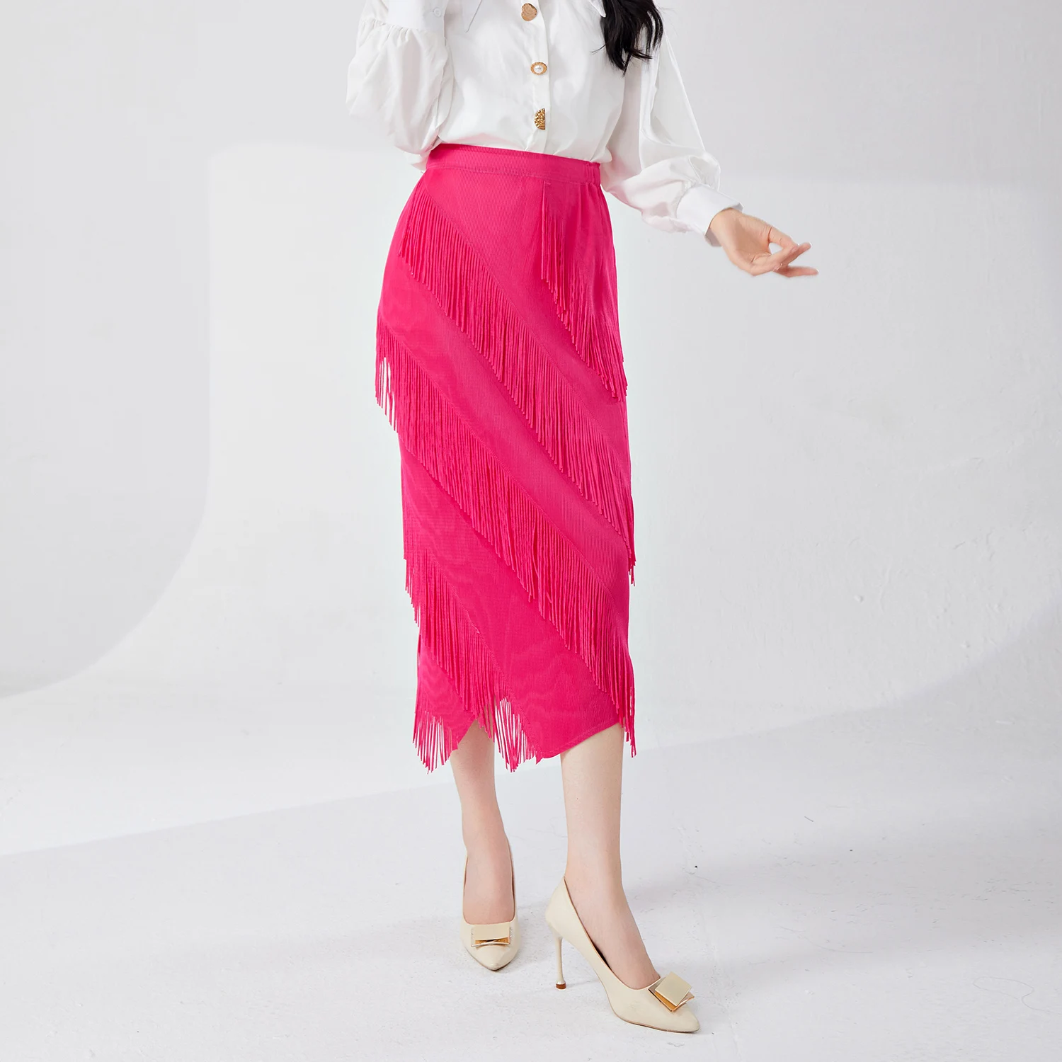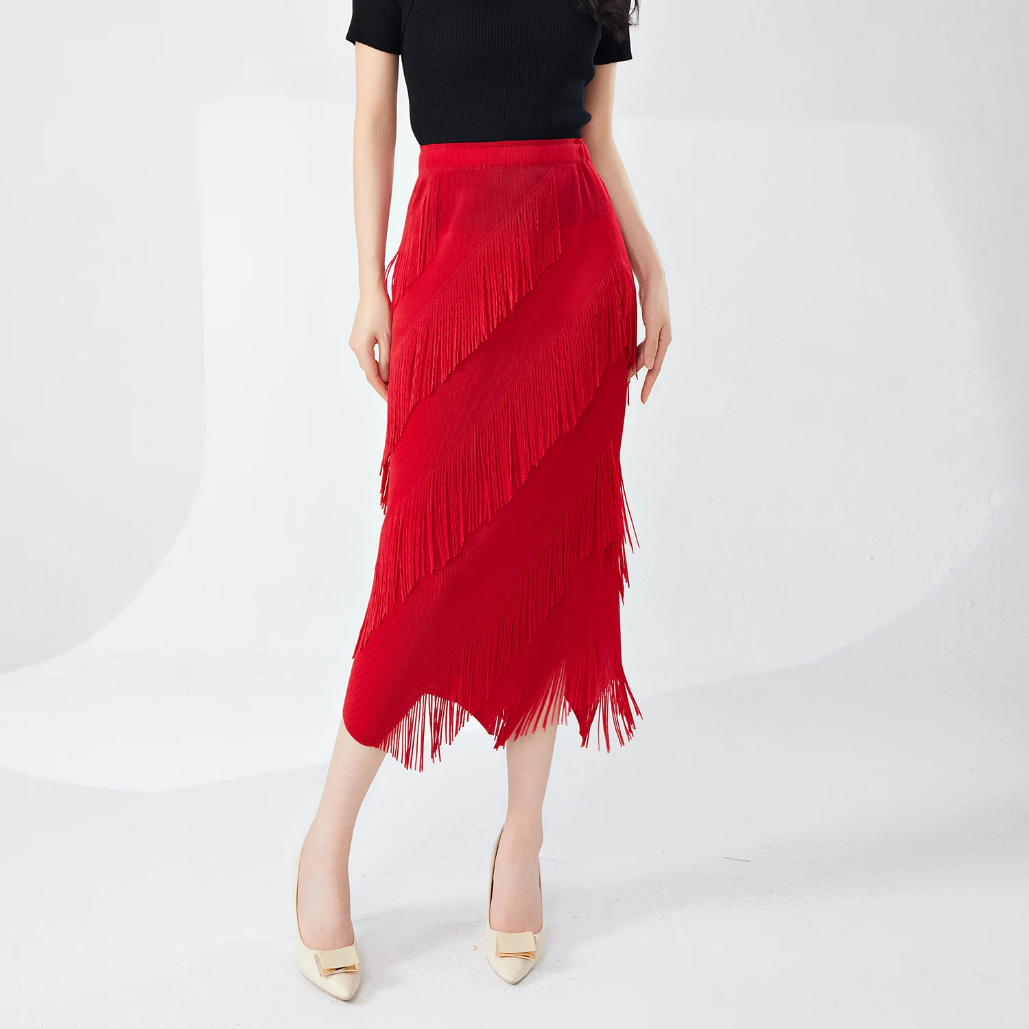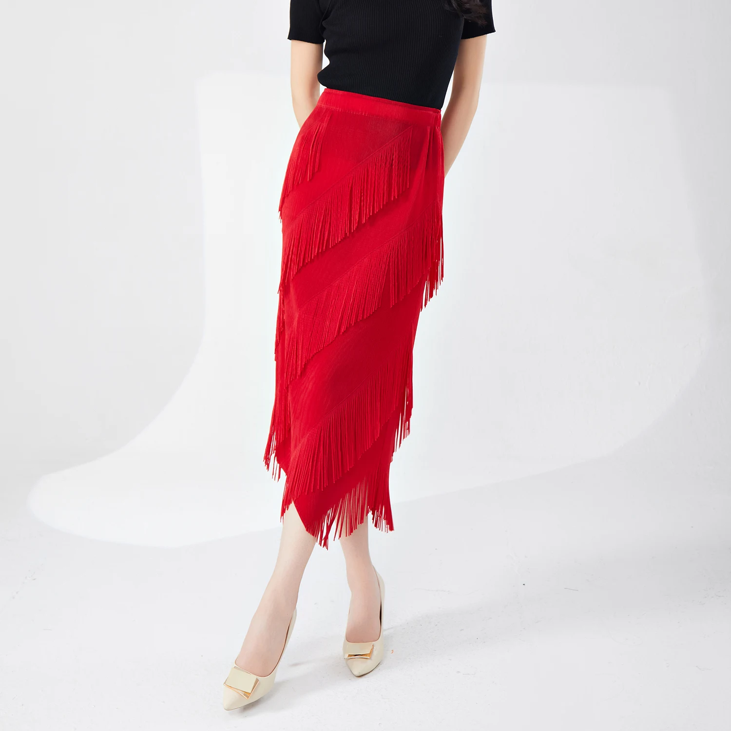 Women's Pleated Fashion Stretch Long Skirt Casual Pleated Tassel Design Irregular Printed Summer Women's Skirt