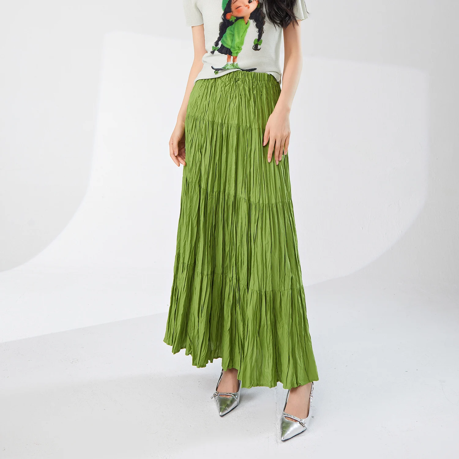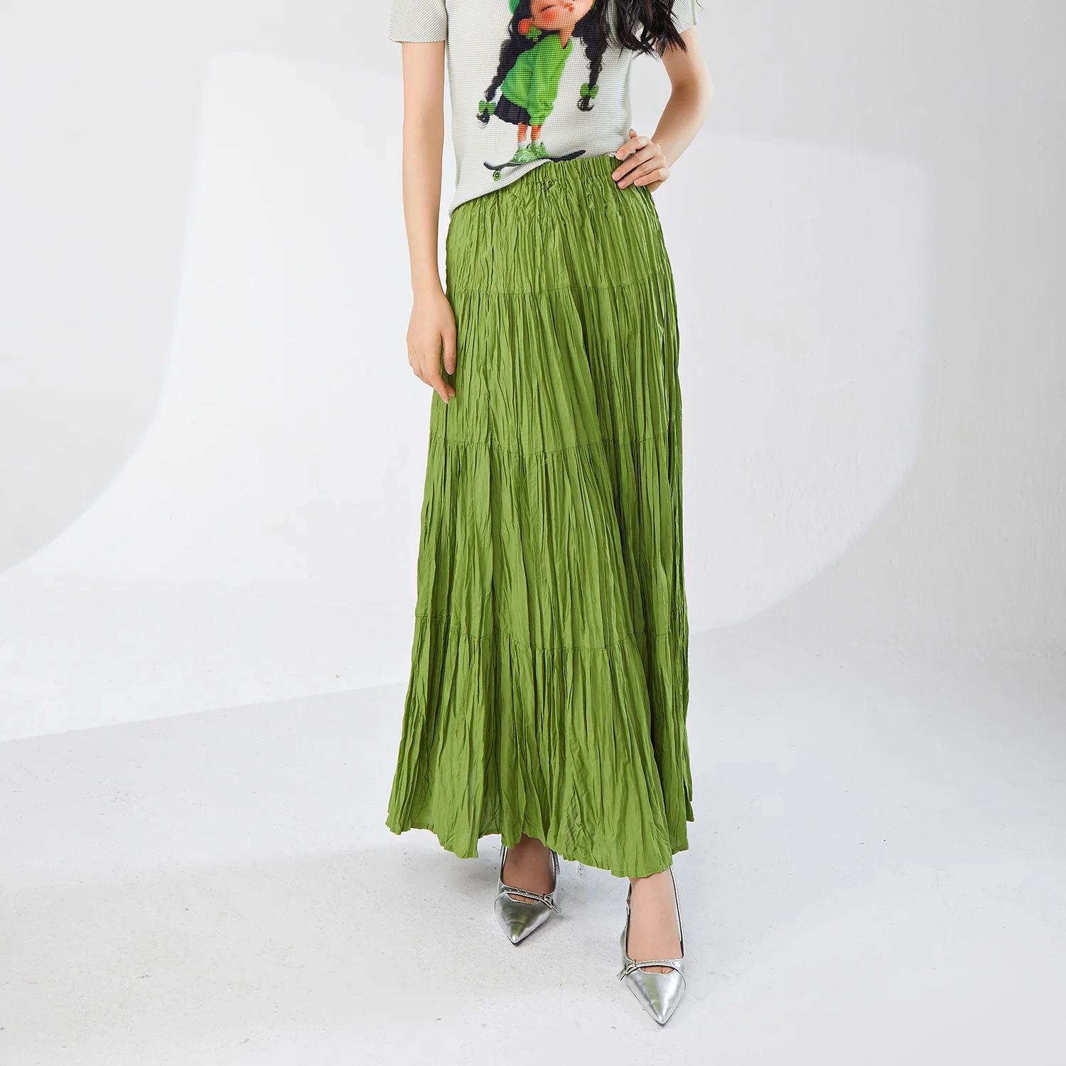 Women's High Quality A-Line Pleated Skirt Large Size Summer Fashion Print Decoration Elastic Waist Loose Long Design