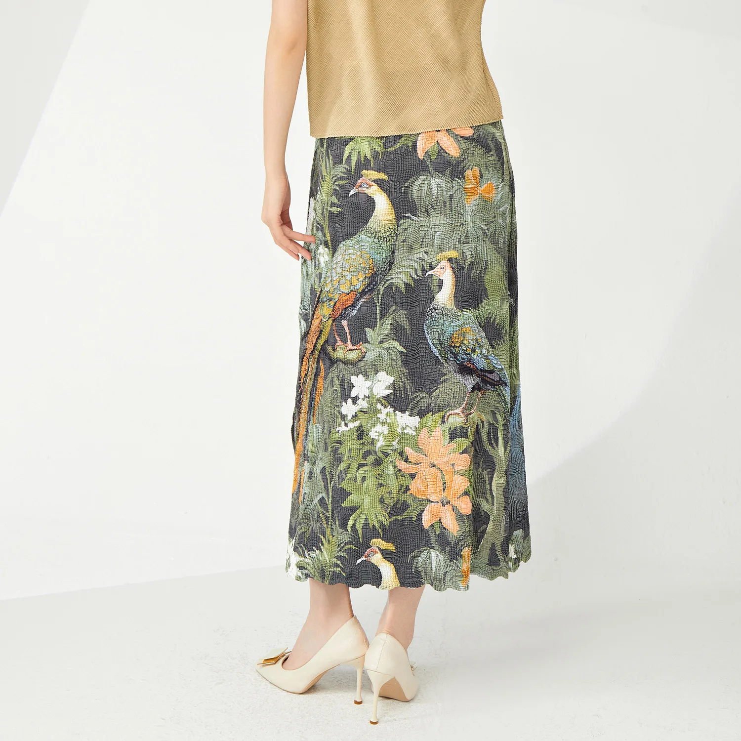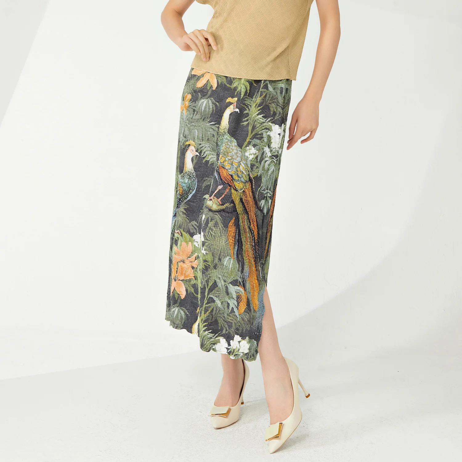 High Quality Elegant Vintage Pleated A-Line Skirt for Women Plus Size Personalized Elastic Slit Printed Long Skirt