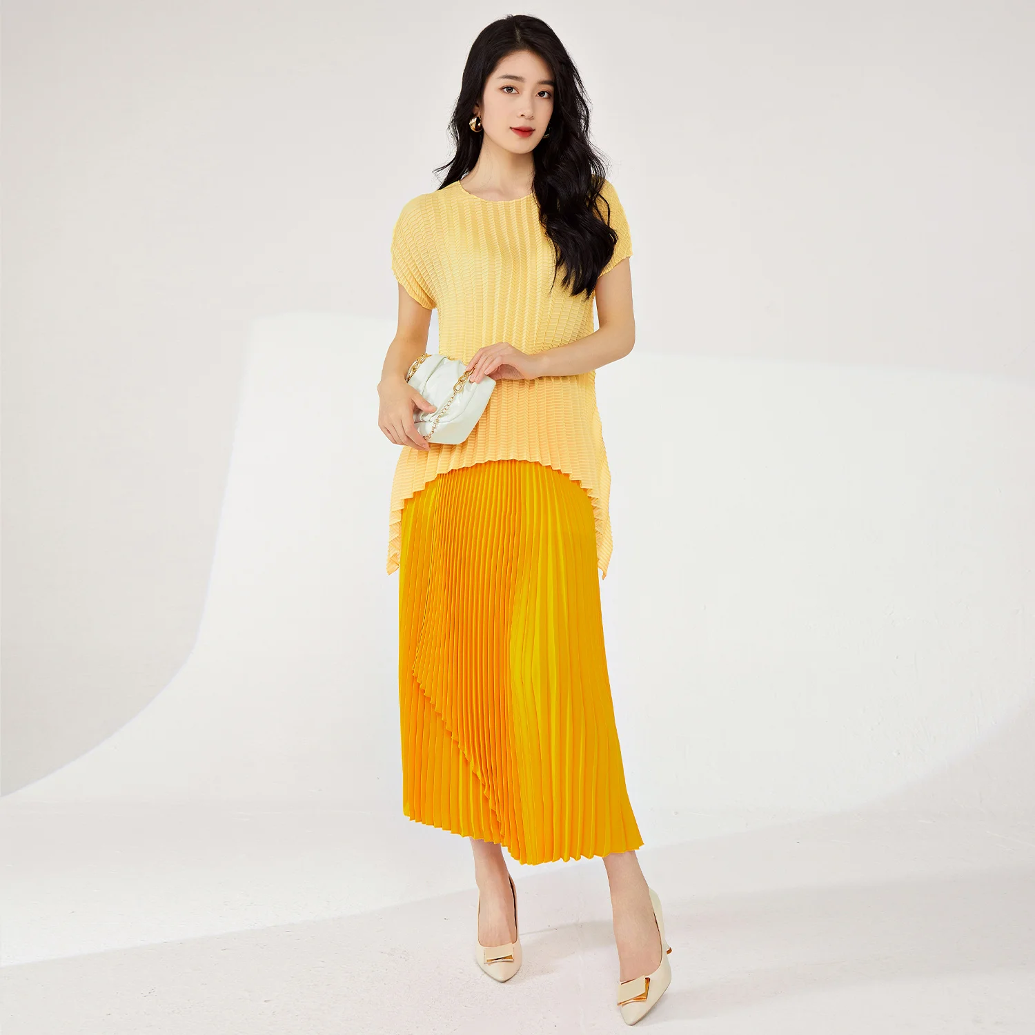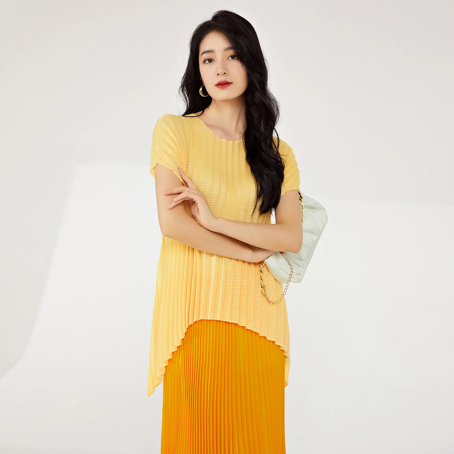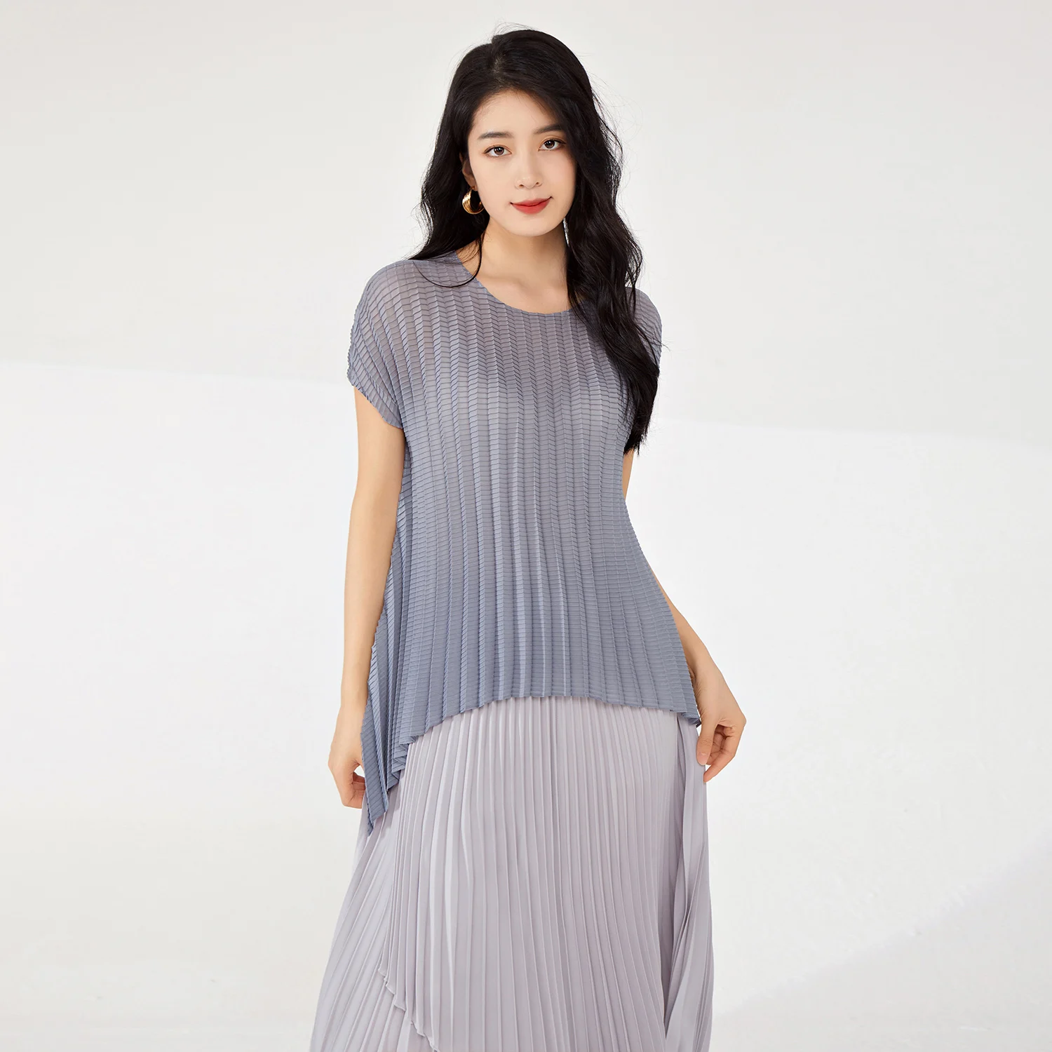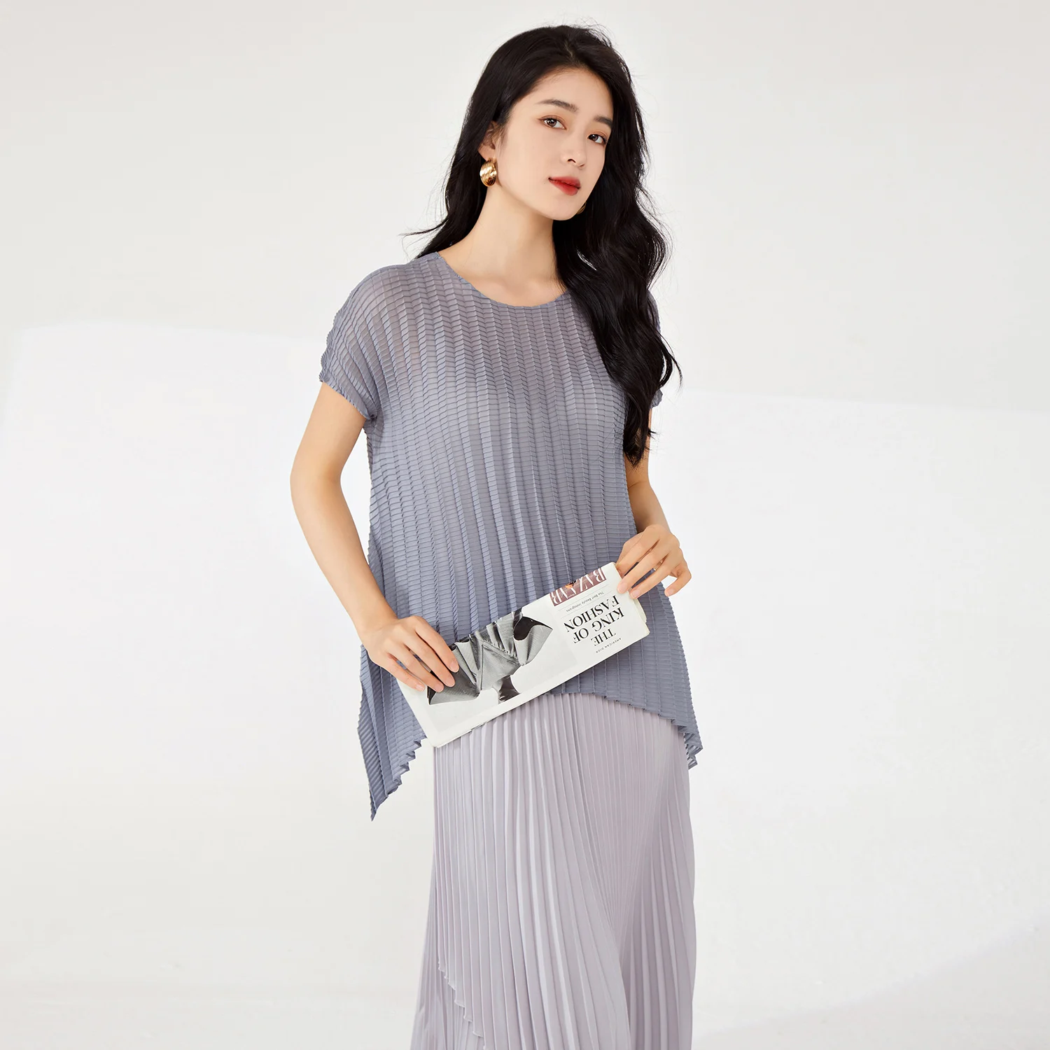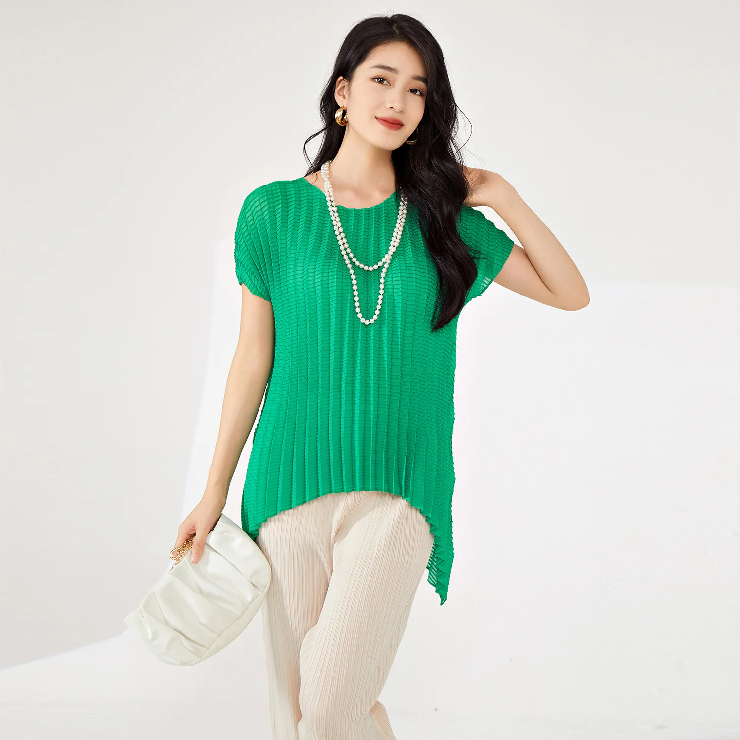 Women's High Quality Pleated T-Shirt Vintage Western Style Large Size Stretch Irregular Short-Sleeved Top Printed Decoration