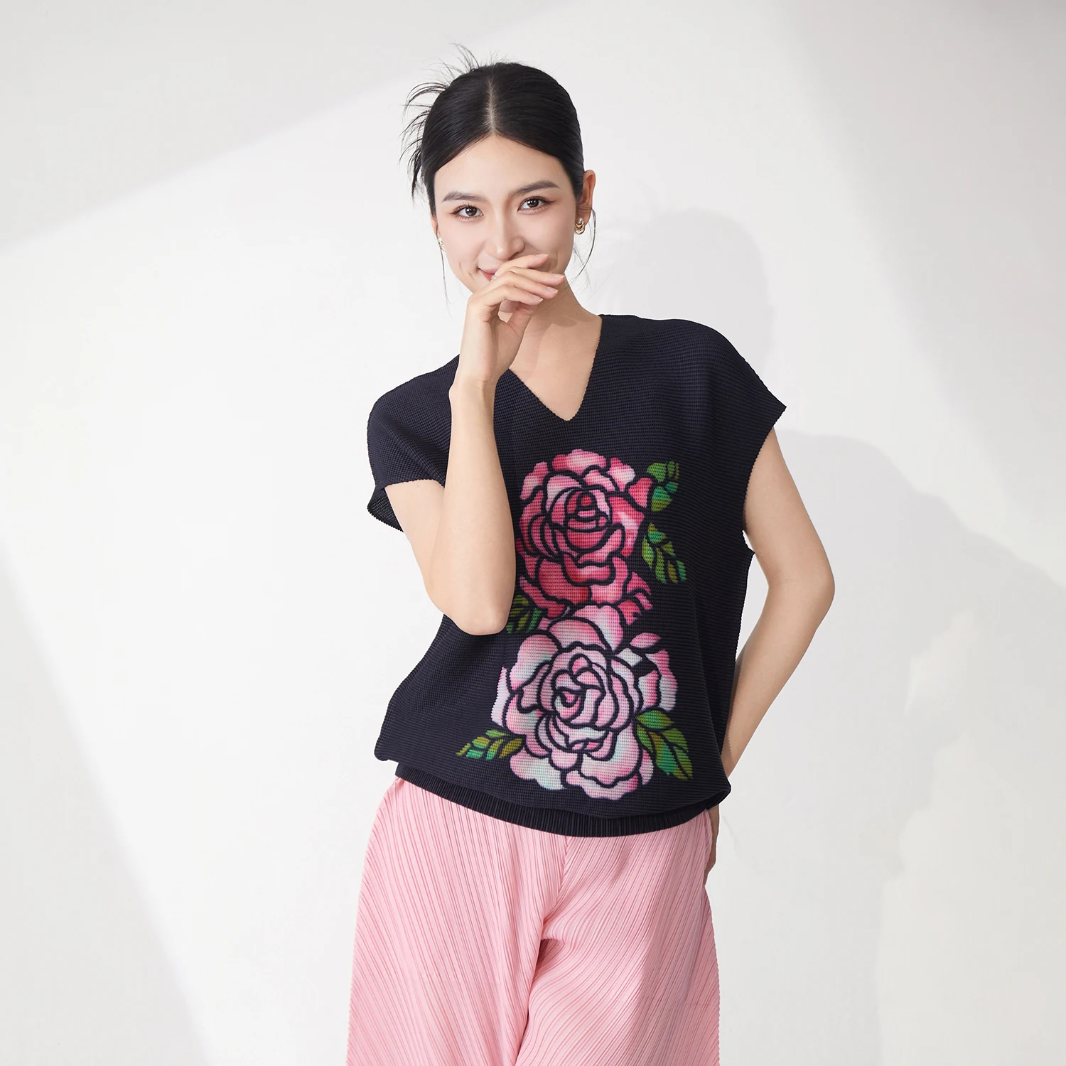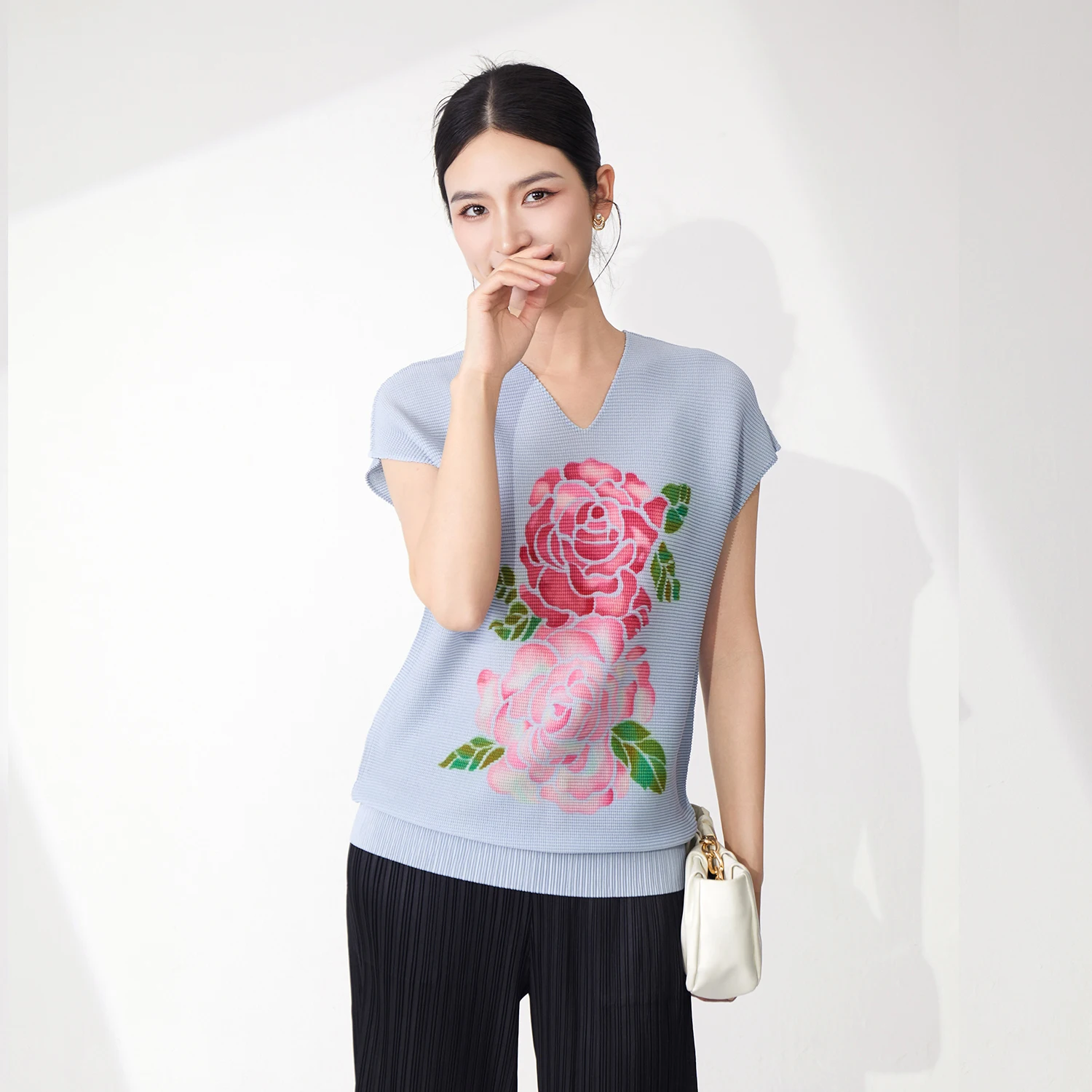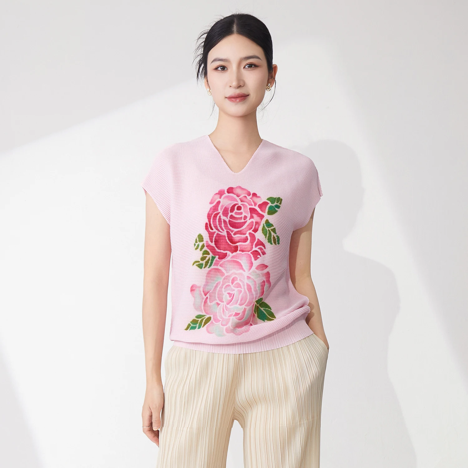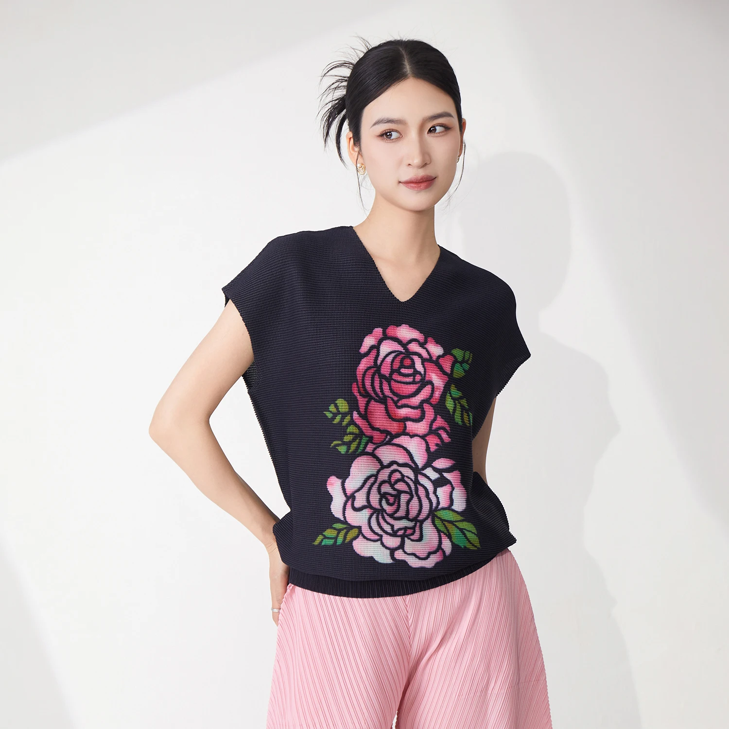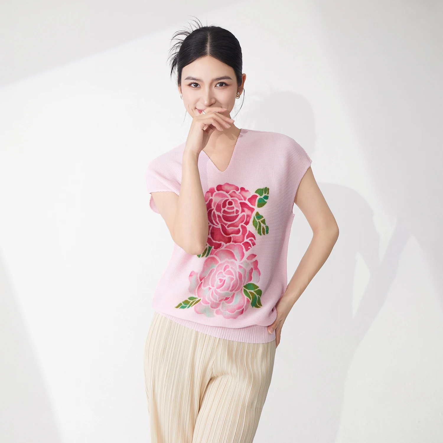 2025 Summer Women's Sleeveless Tops High Quality Printed Floral V-Neck T-Shirt Stretch Casual Vest Miyake Shirt