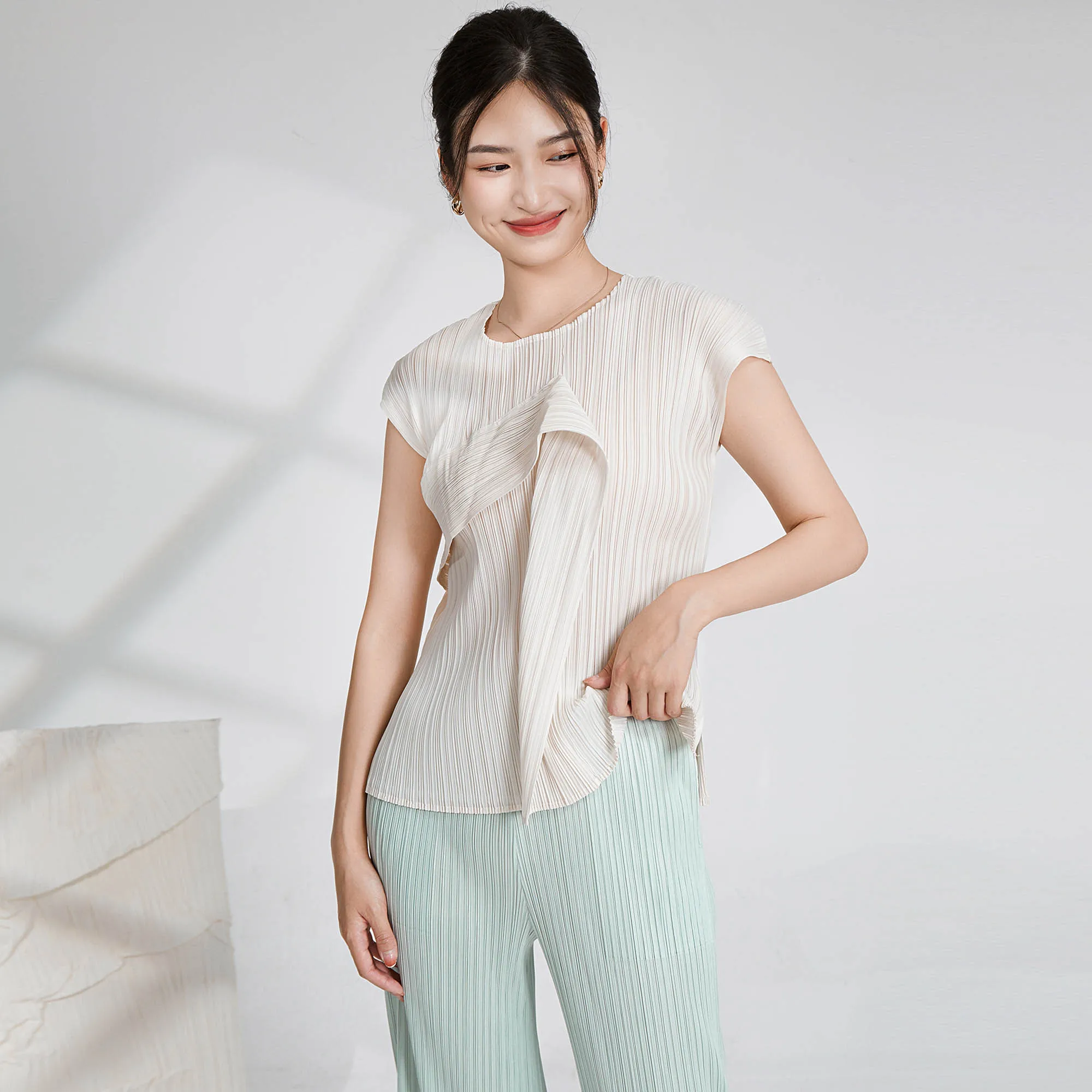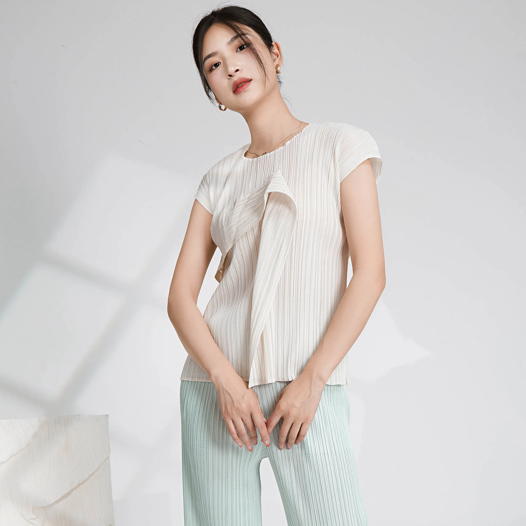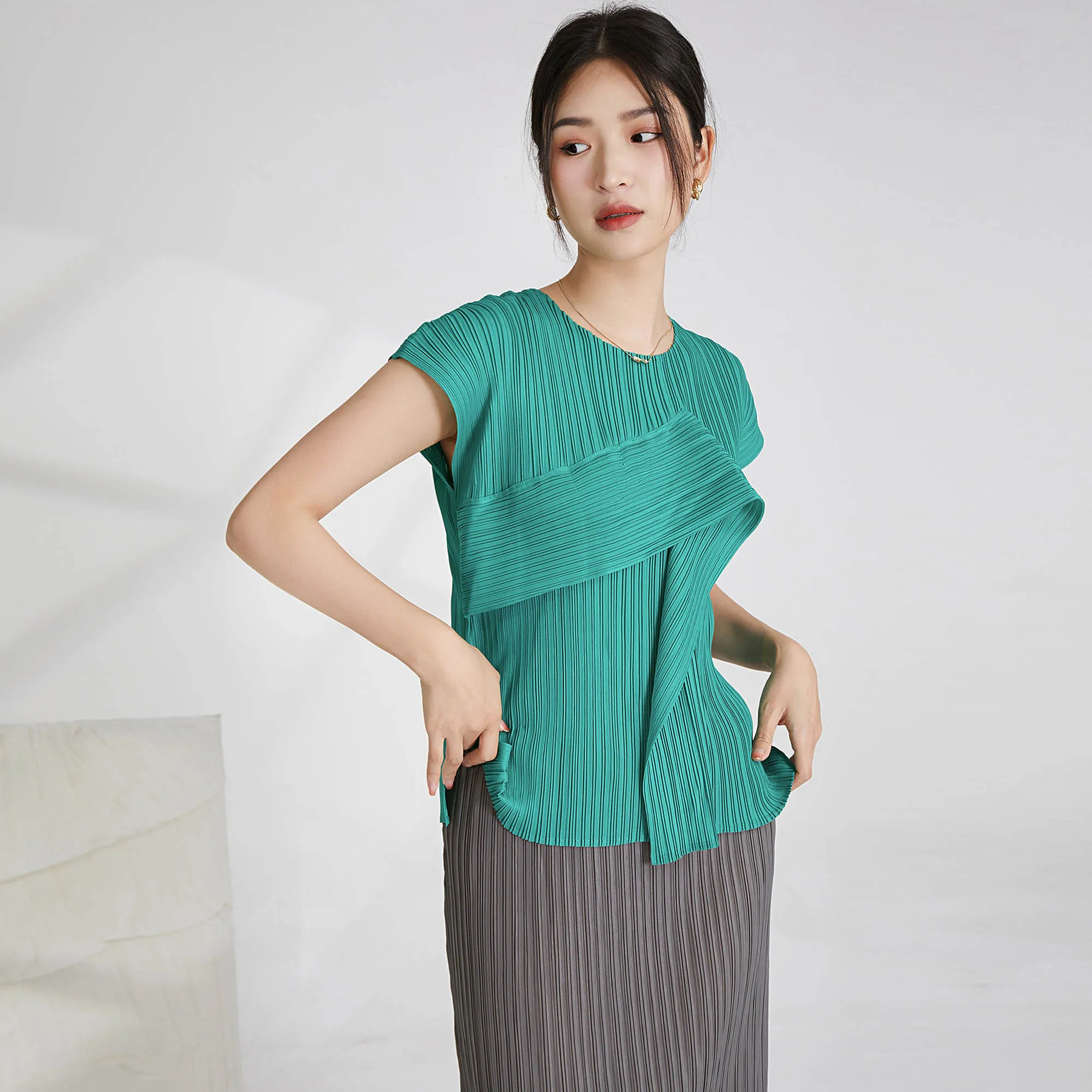 Miyake Latest Summer Fashion Design Short-sleeved Top Women Casual Shirt Pleated Design T-shirt