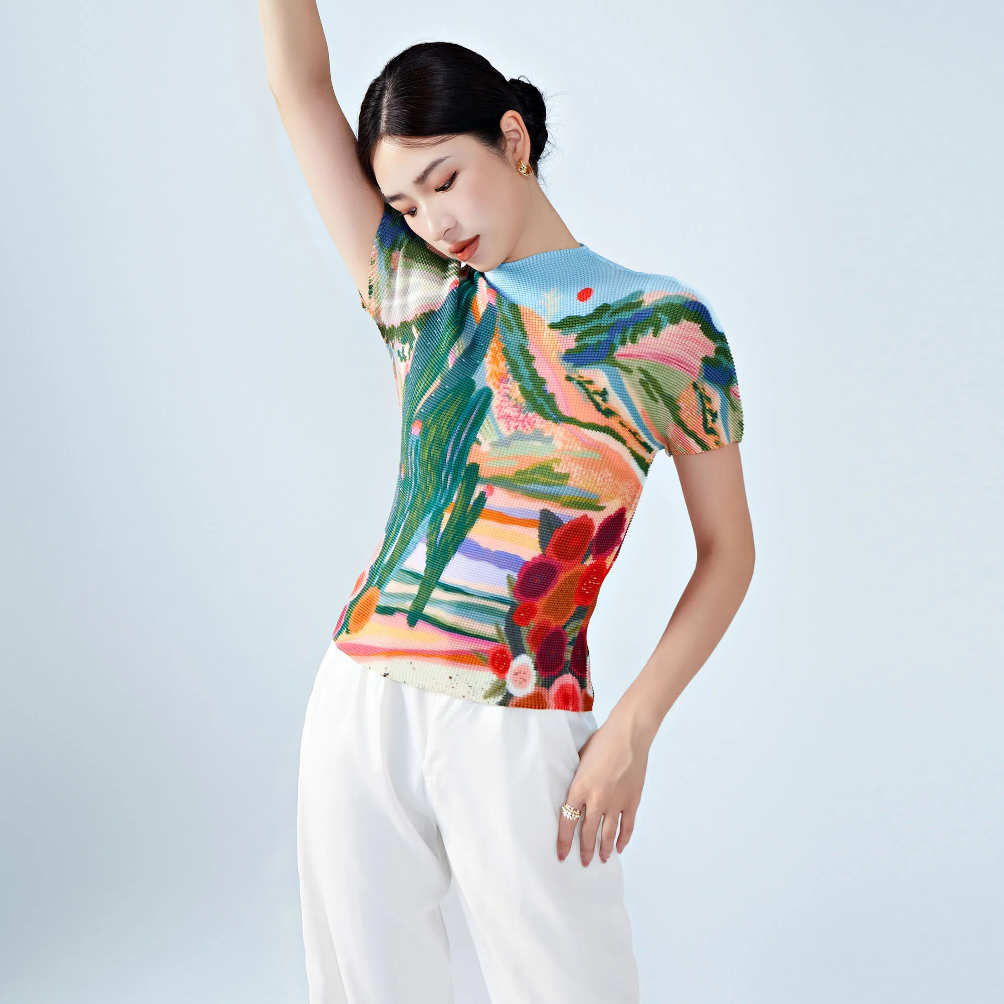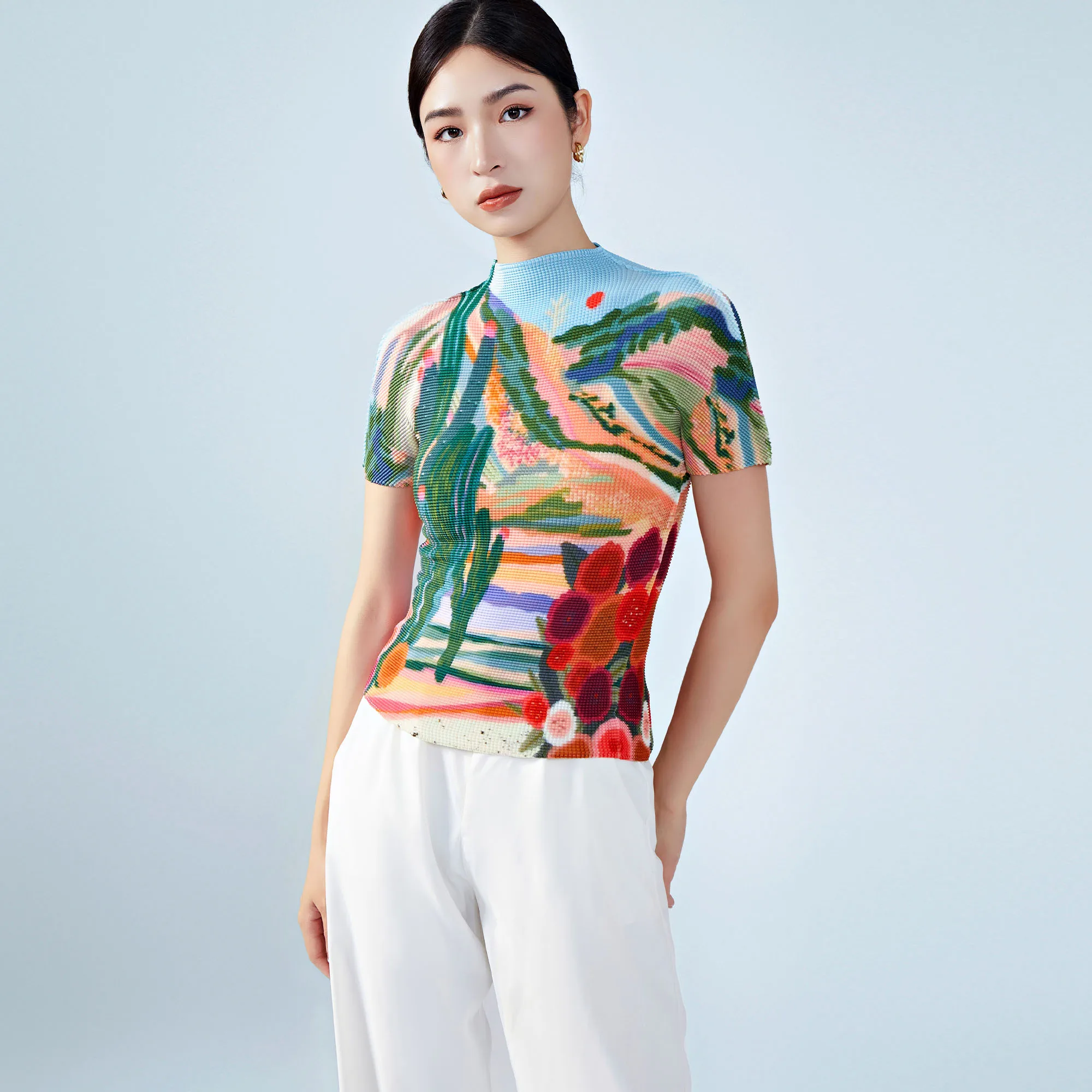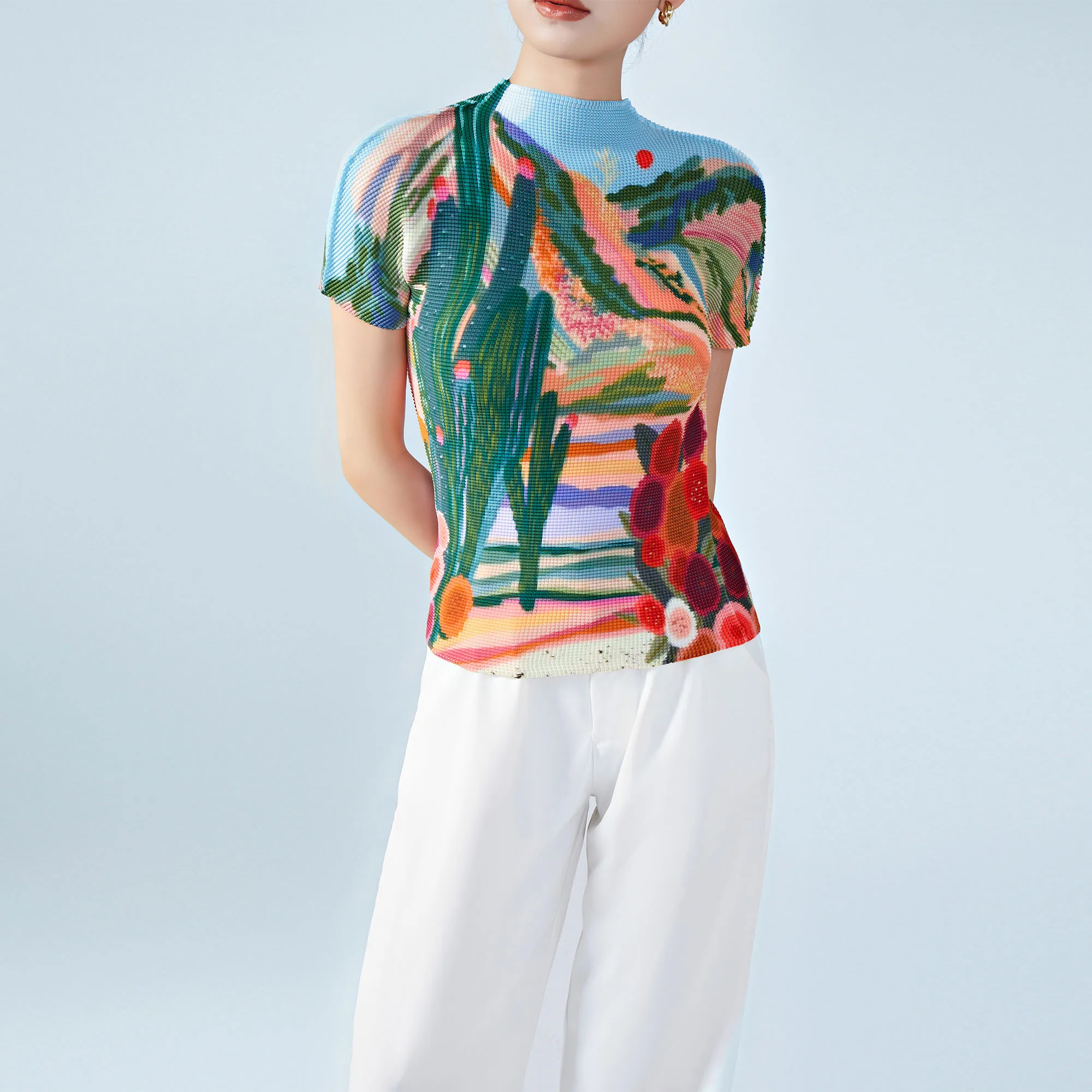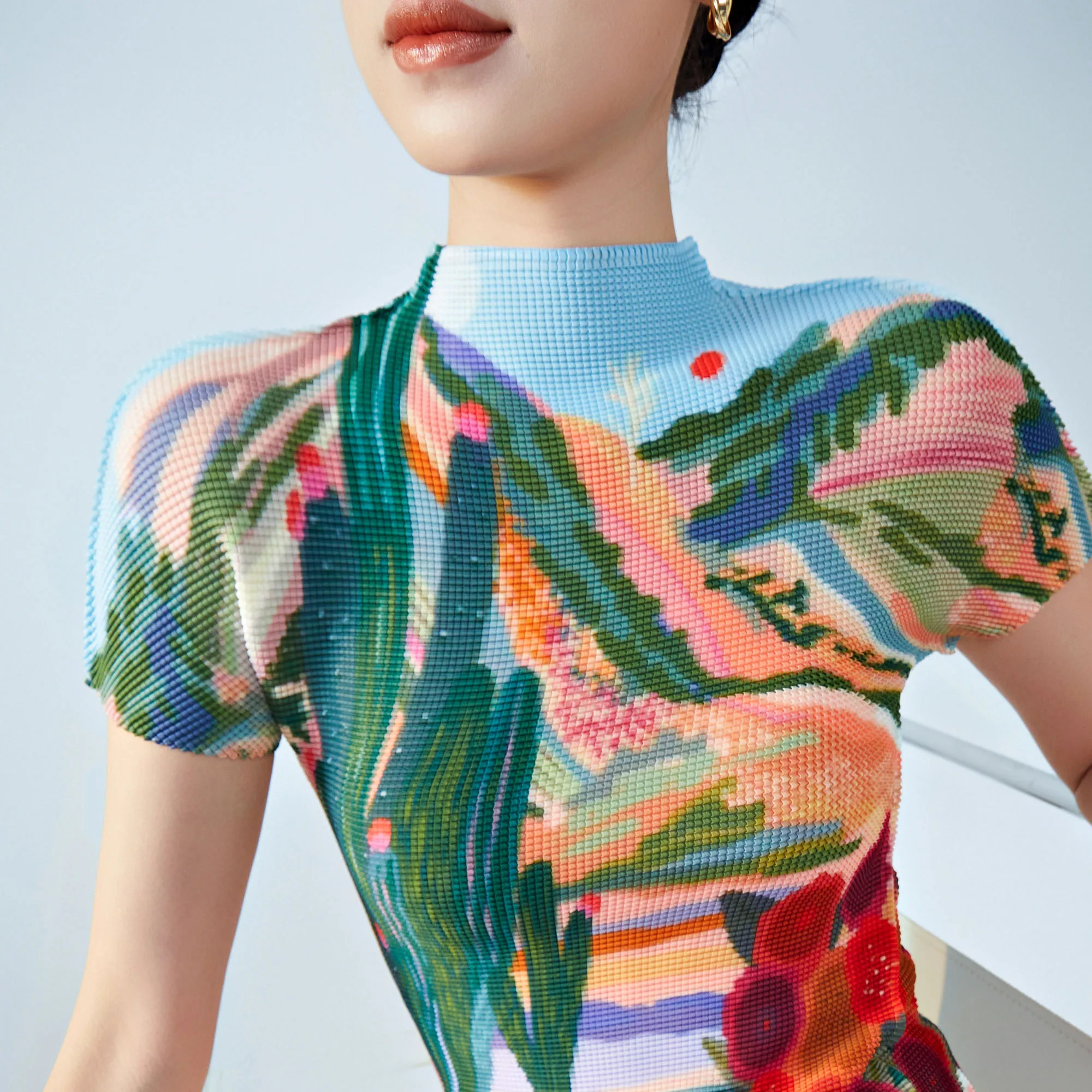 Miyake Short Sleeve Summer Women's T-shirt Print High Neck Slim Fit Elastic Base Top With Stylish and Versatile Pleated Design