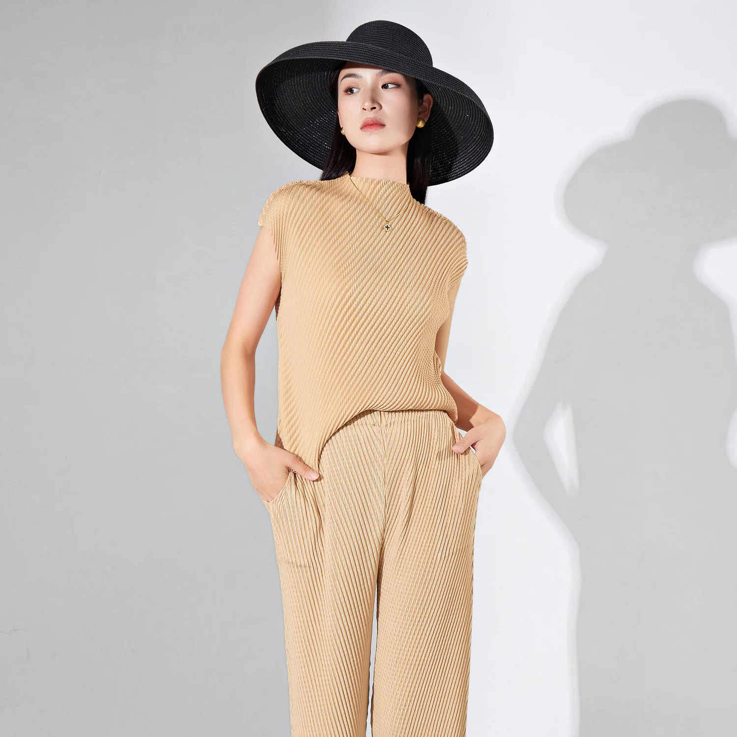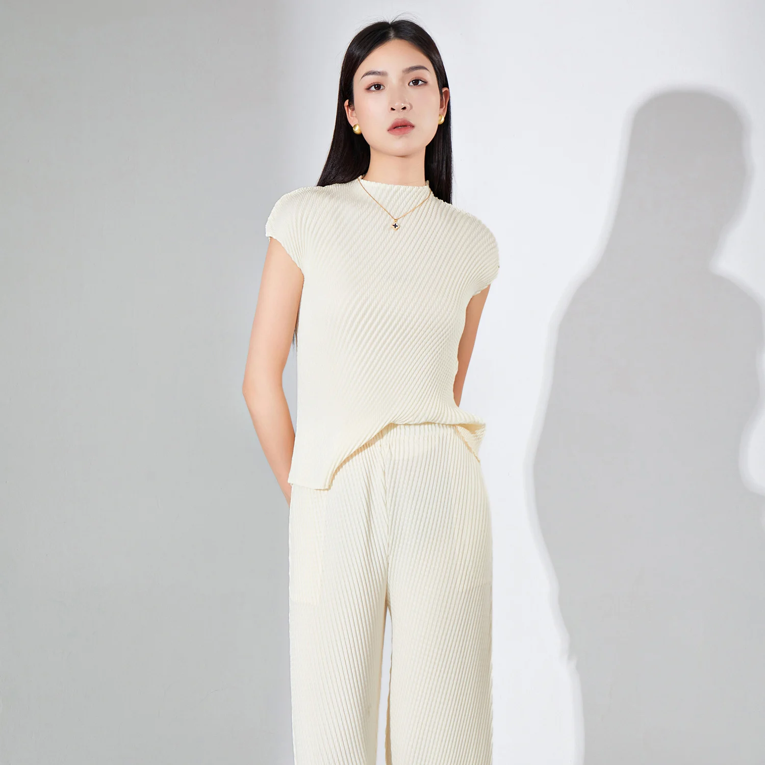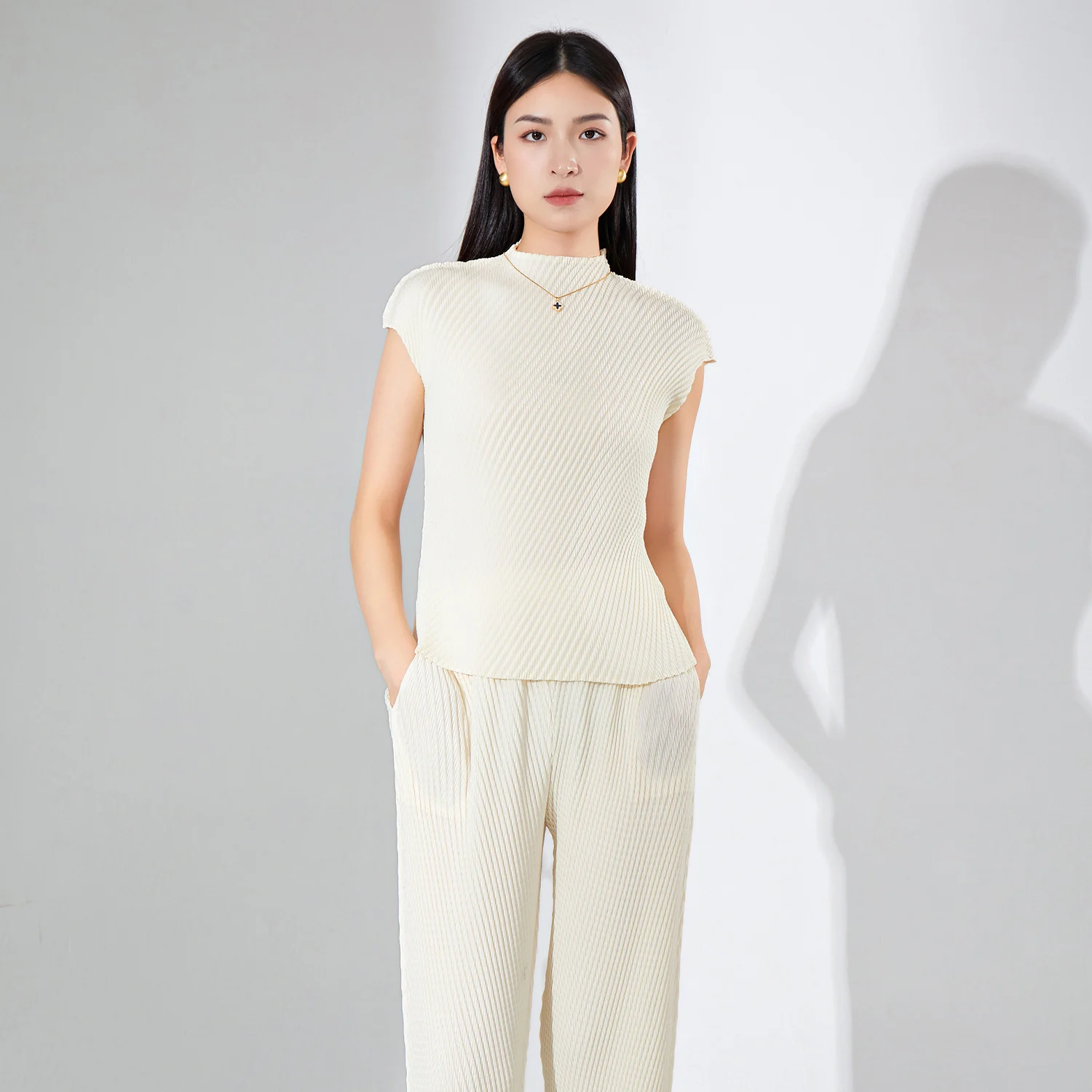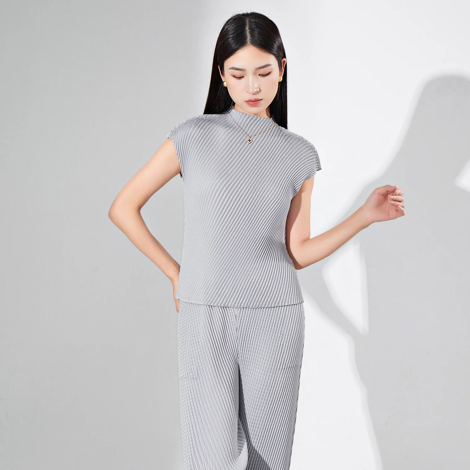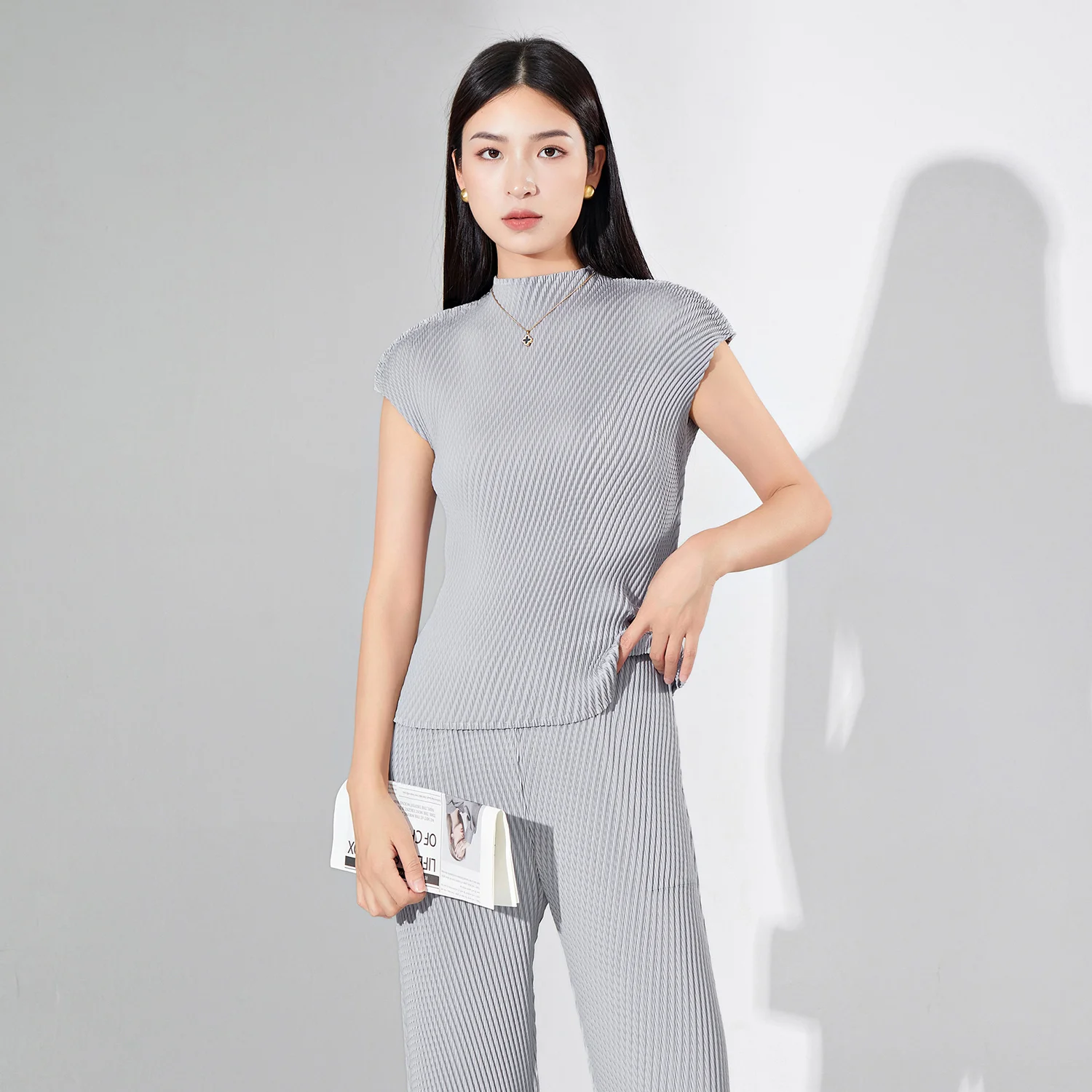 Women's Fashionable Personalized Casual Short-Sleeved Stretch T-Shirt Western Style Pleated Top Breathable Polyester Print