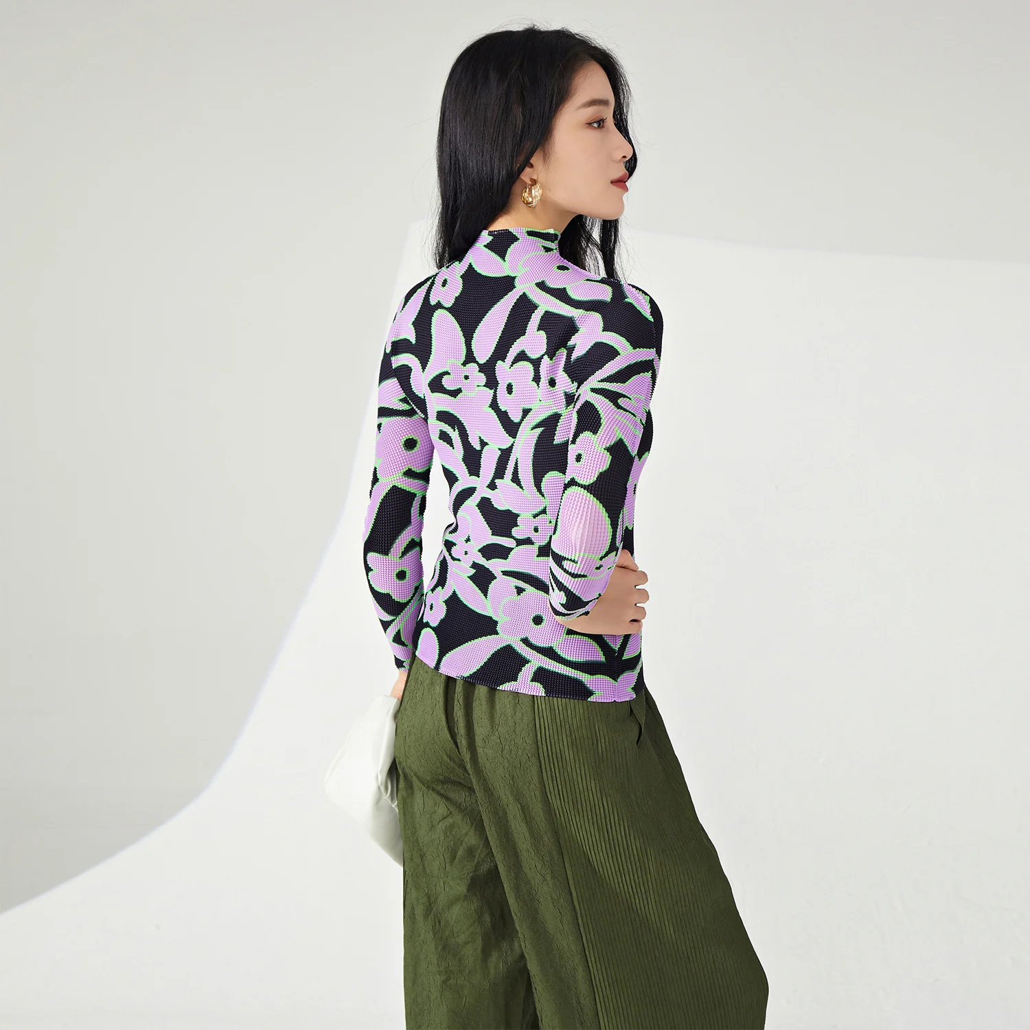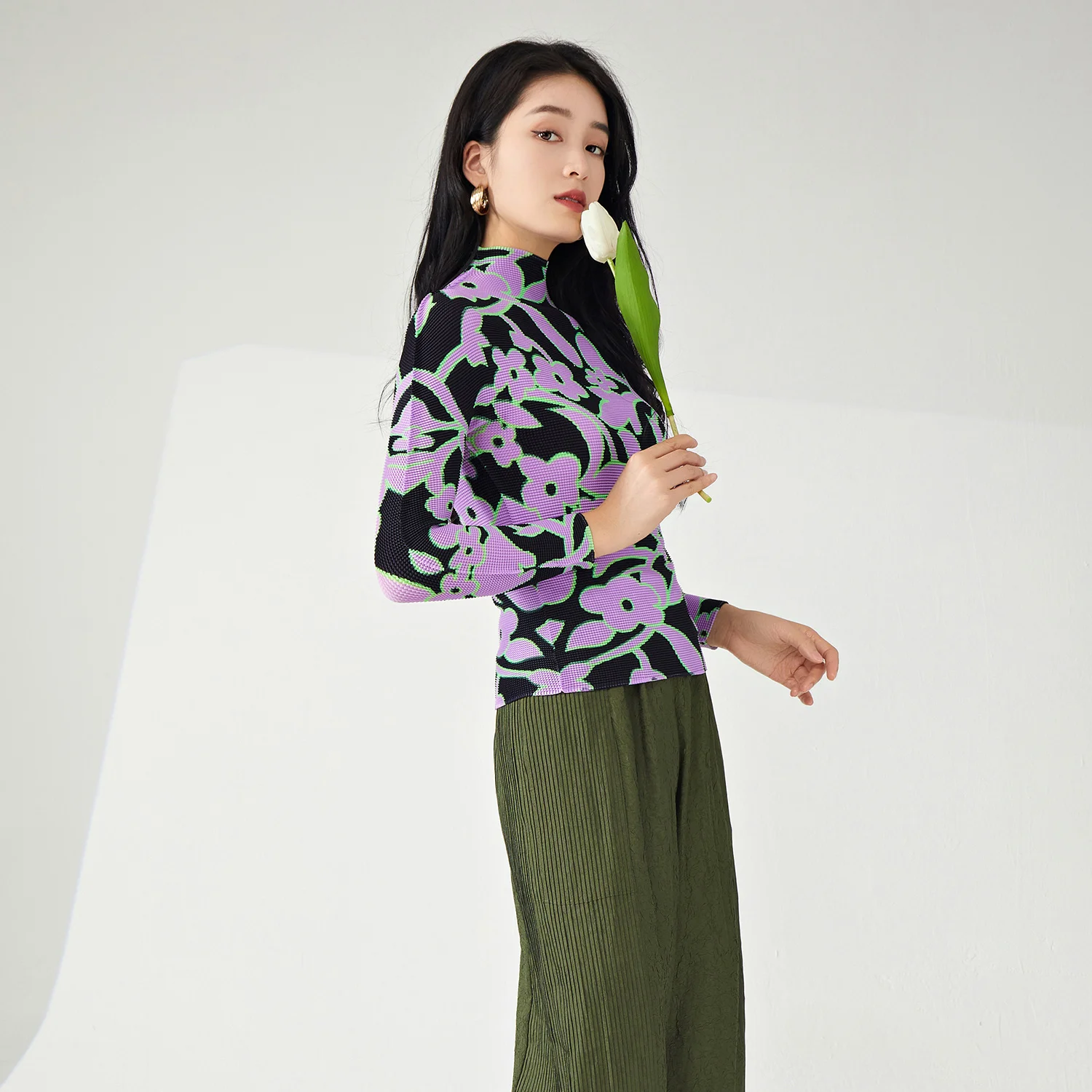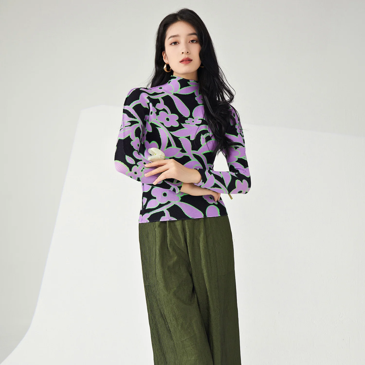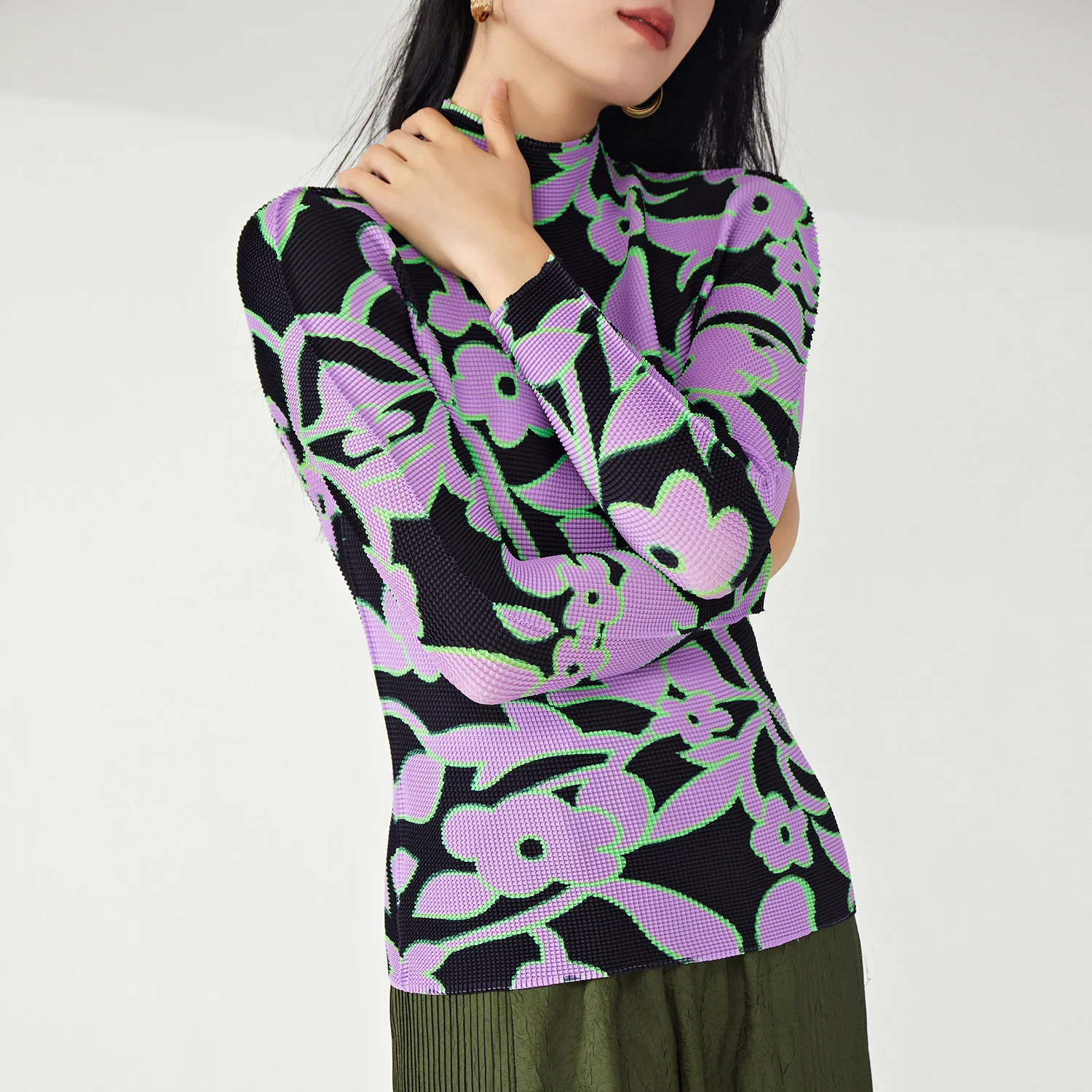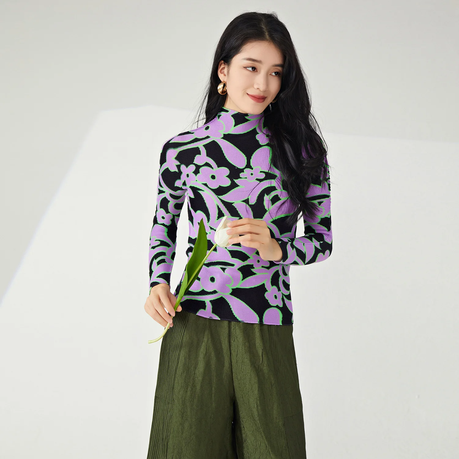 Miyake Women's High Quality T-Shirt Casual Style With Turtleneck Neckline Sustainable Compressed Pleated Design
