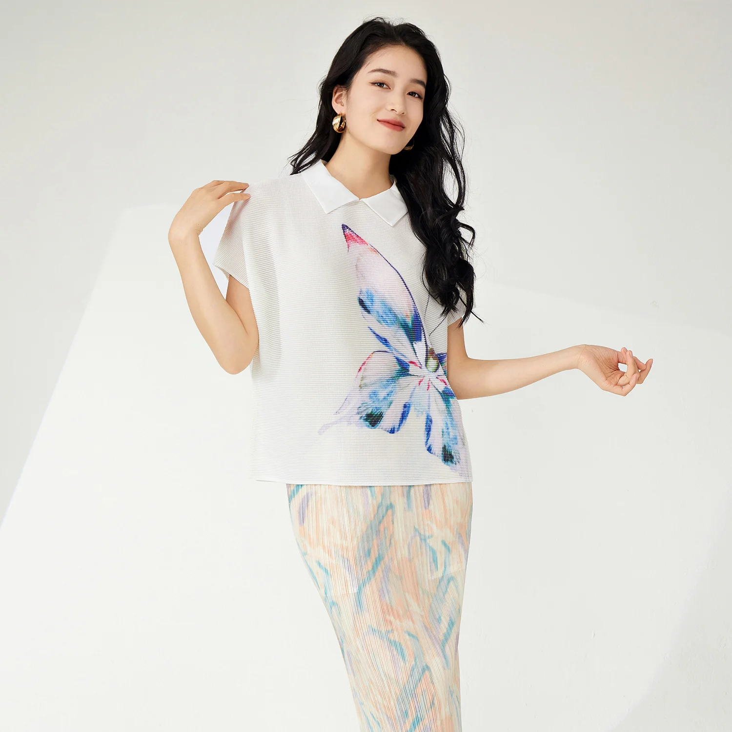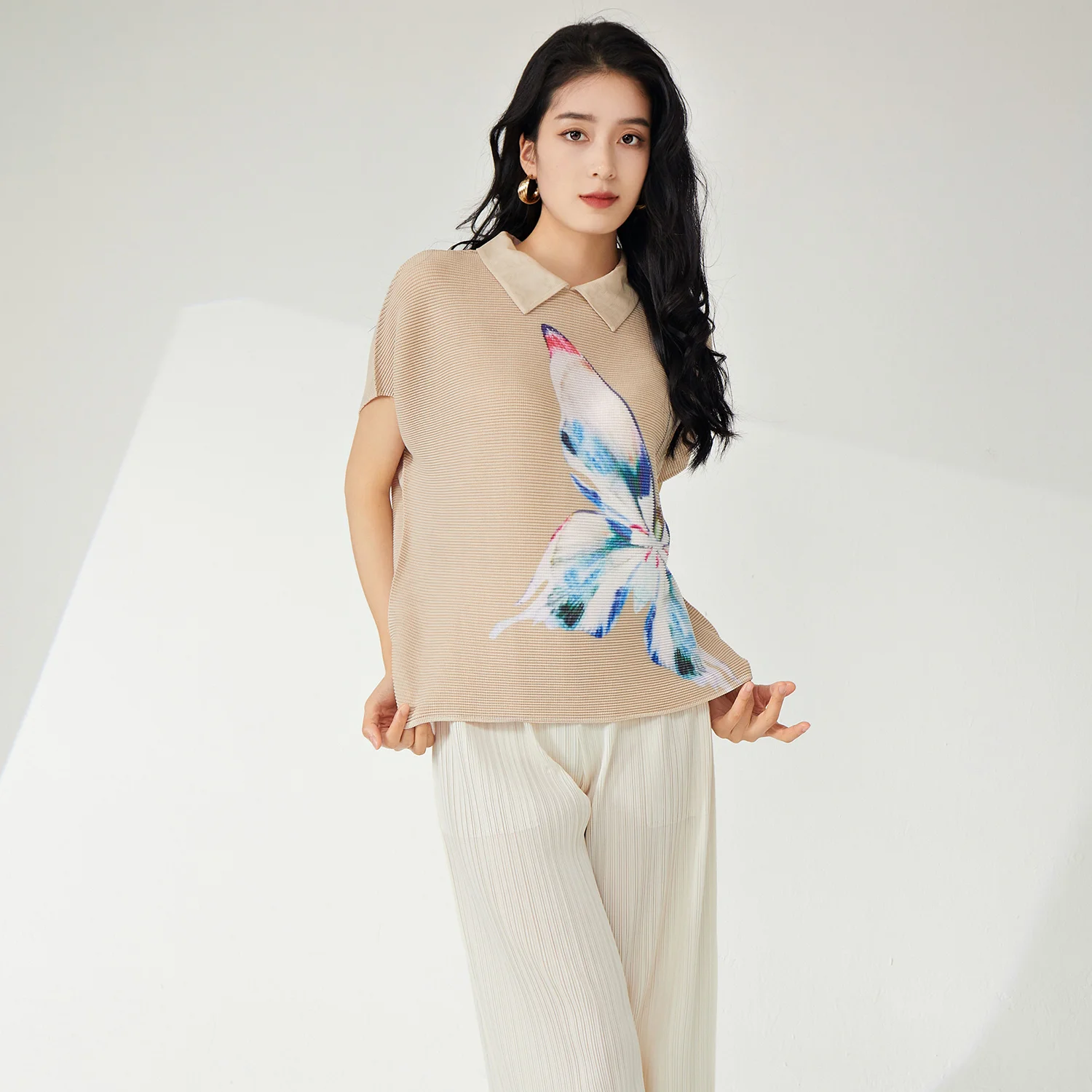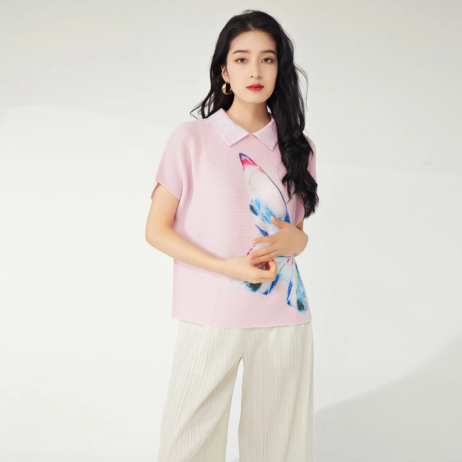 High Quality Summer Women's Vintage T-Shirt Pleated Lapel Stretch Printed Animal Pattern Short Sleeve Turn-Down Collar Top