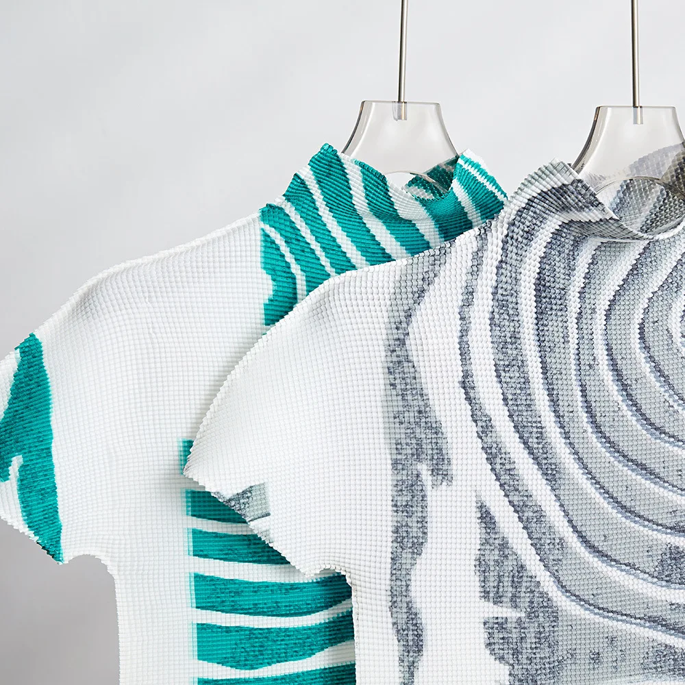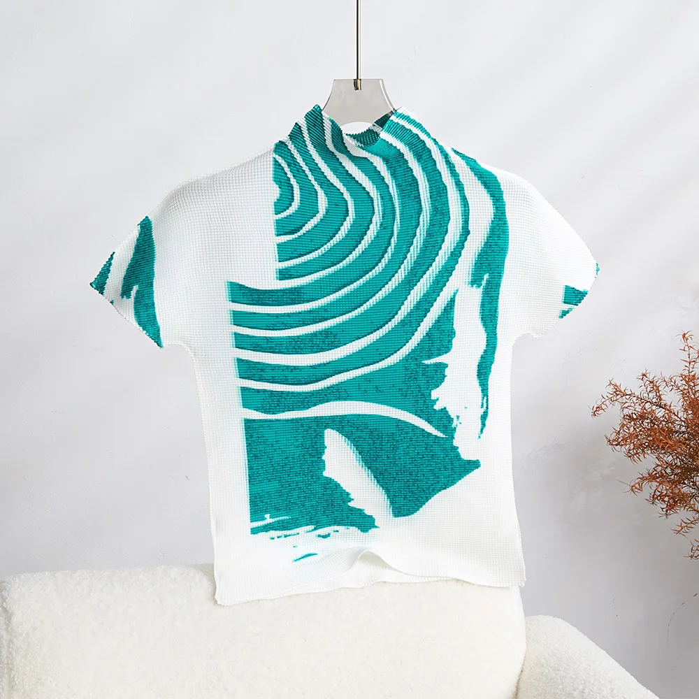 Miyake Latest Fashion Blouse Design Printed Plaid Pattern Short-sleeved Top Women's Casual Pleated Elastic T-shirt