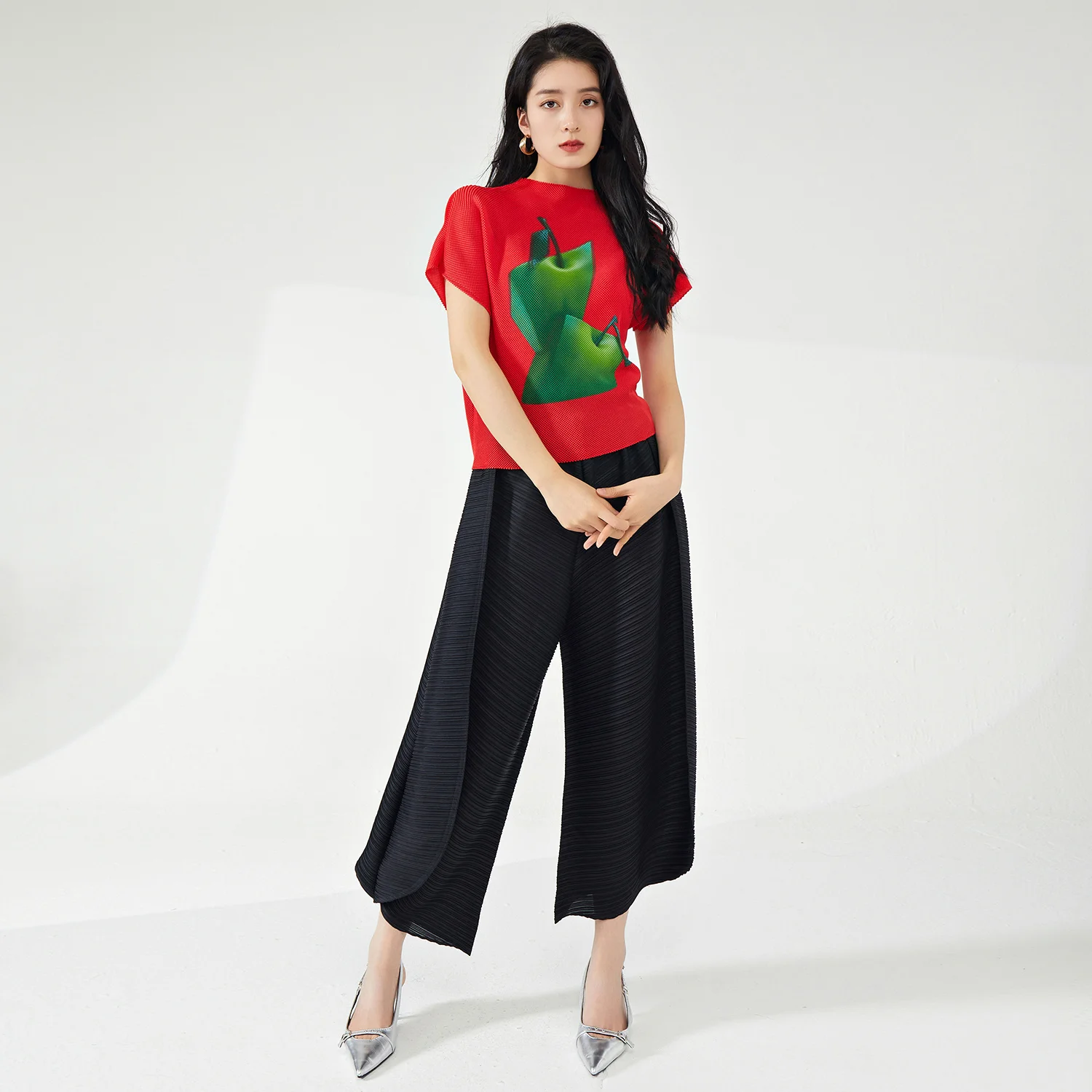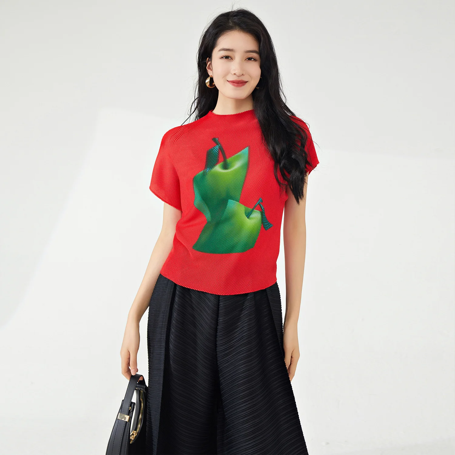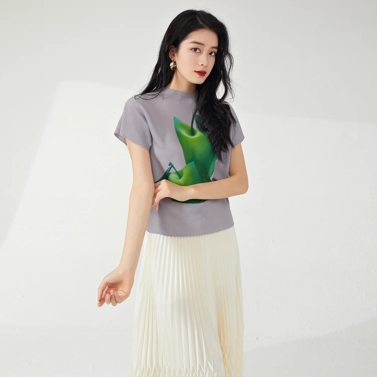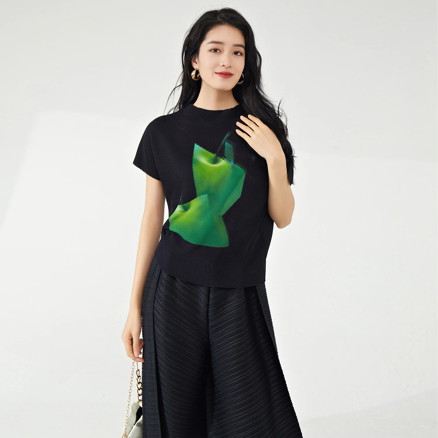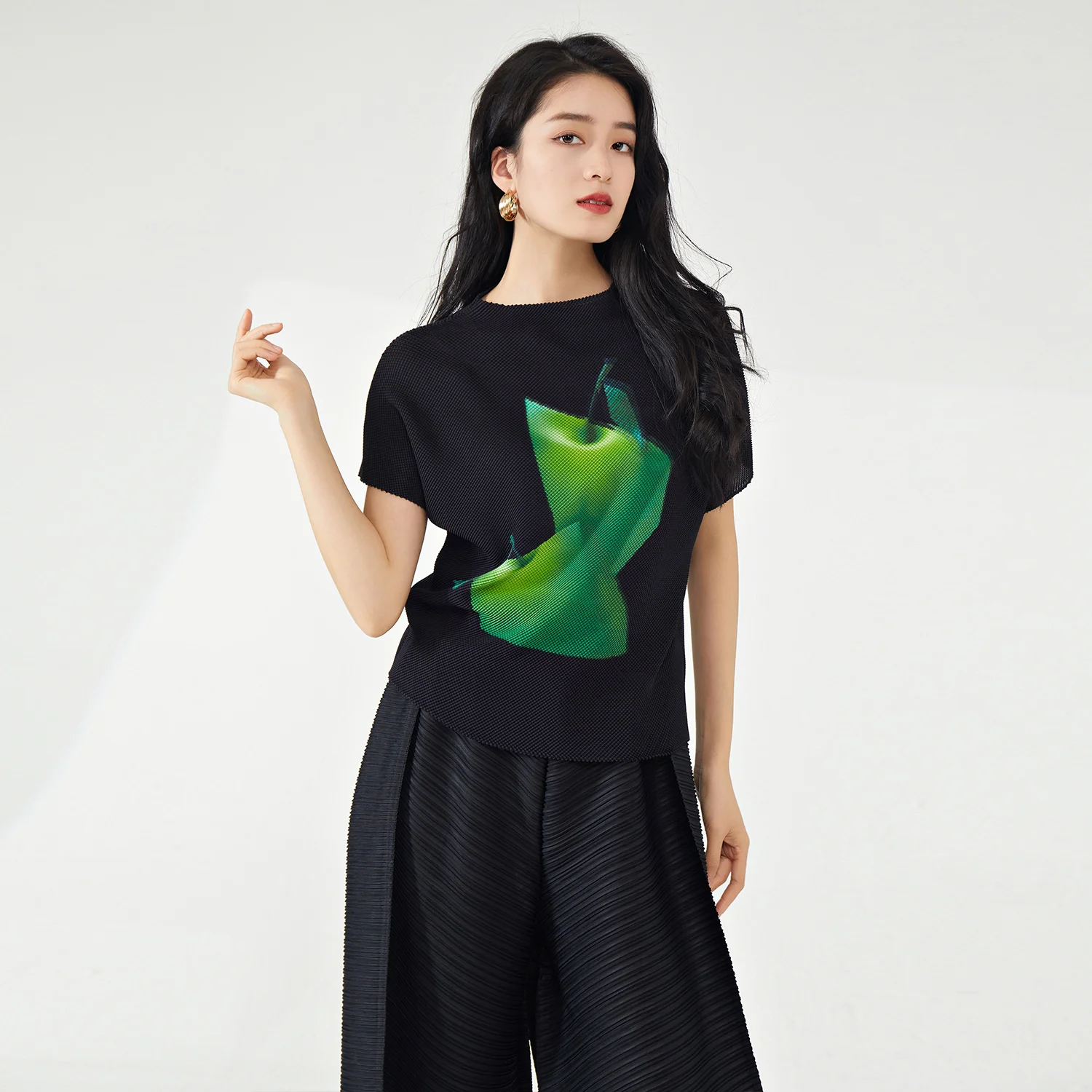 Latest Design Women's Pleated T-Shirt Fashionable Casual Loose Stretch Printed Blouse High Quality Blouses & Shirts