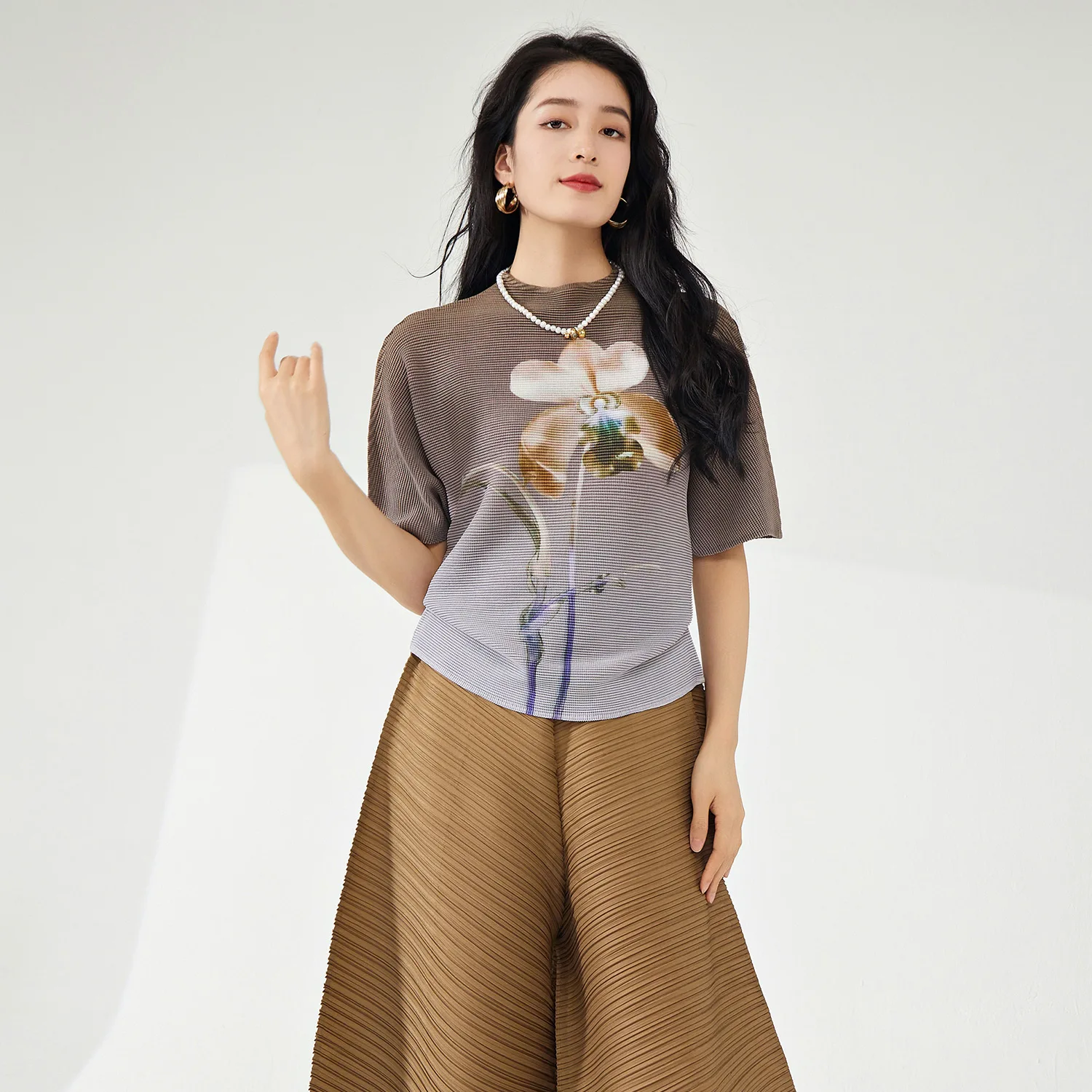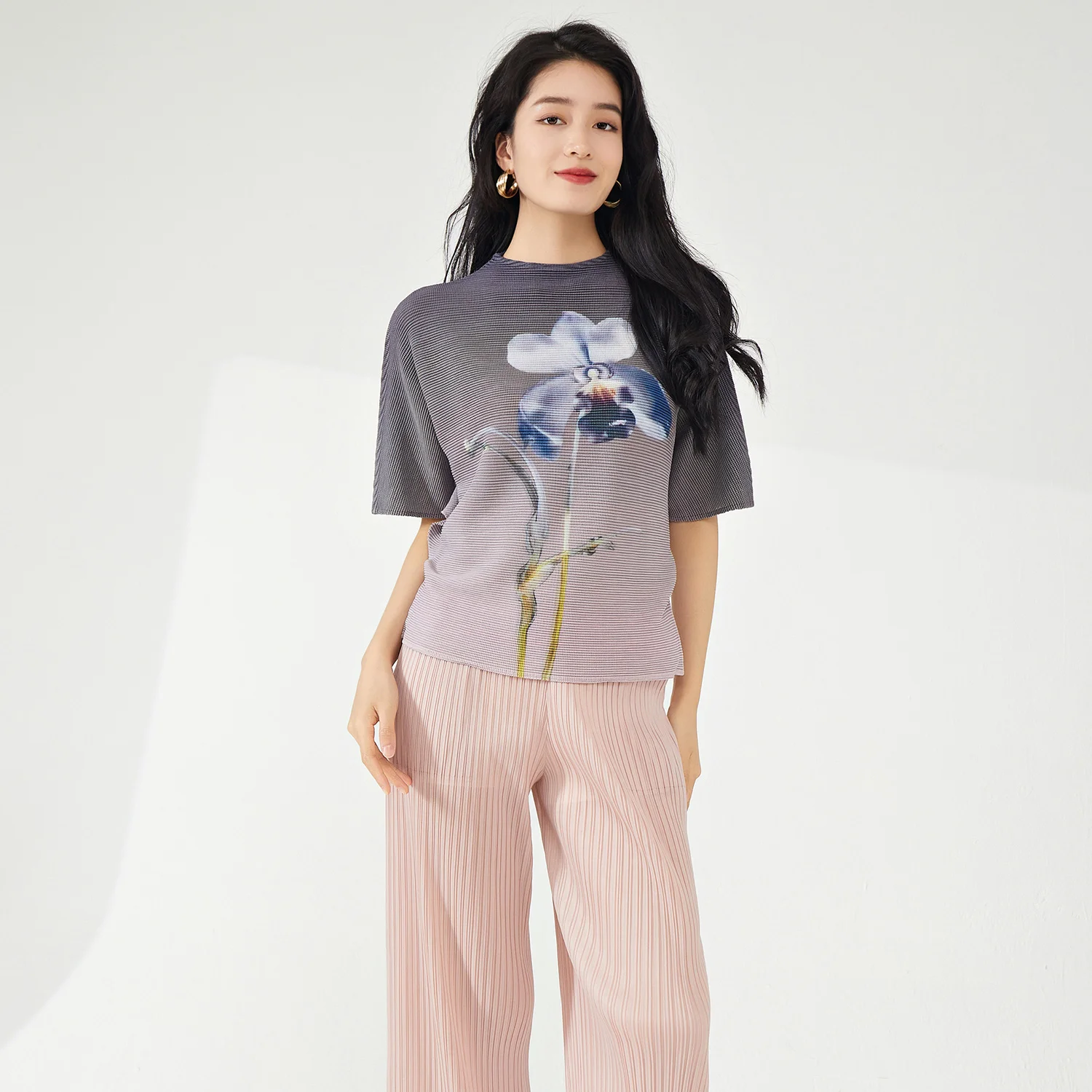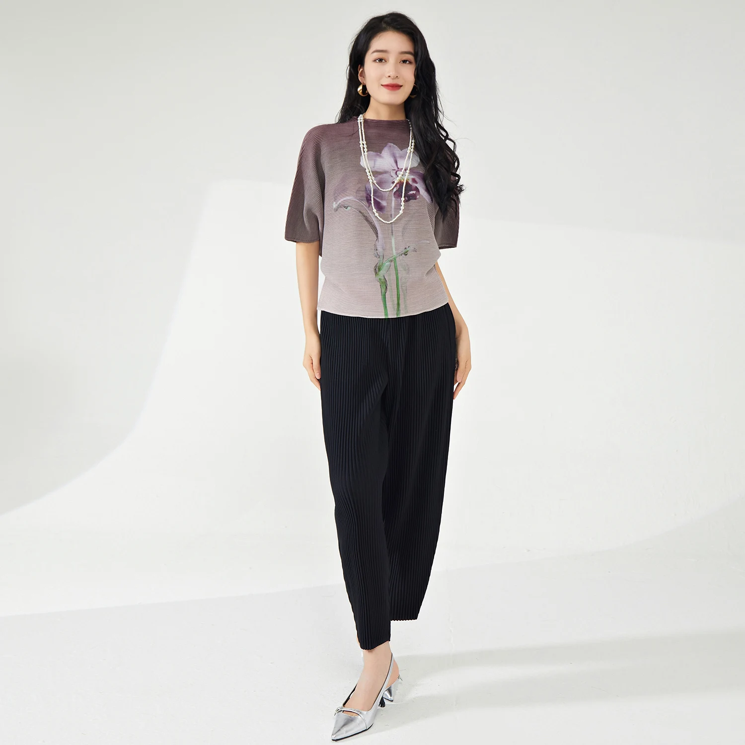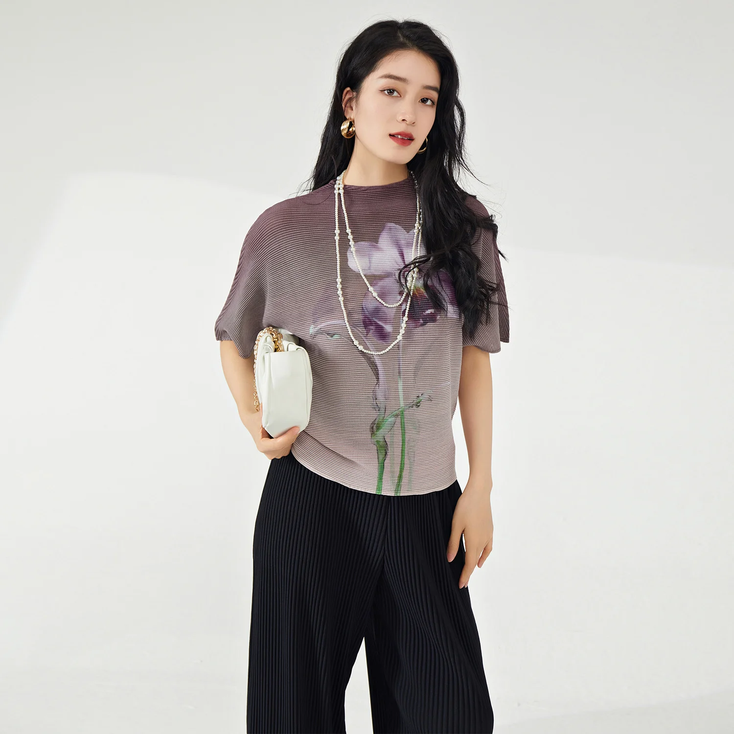 Miyake Women's Summer Casual Style Polyester Blouse Retro Fashion Pleated Stretch Short Sleeve Bat Sleeve T-Shirt