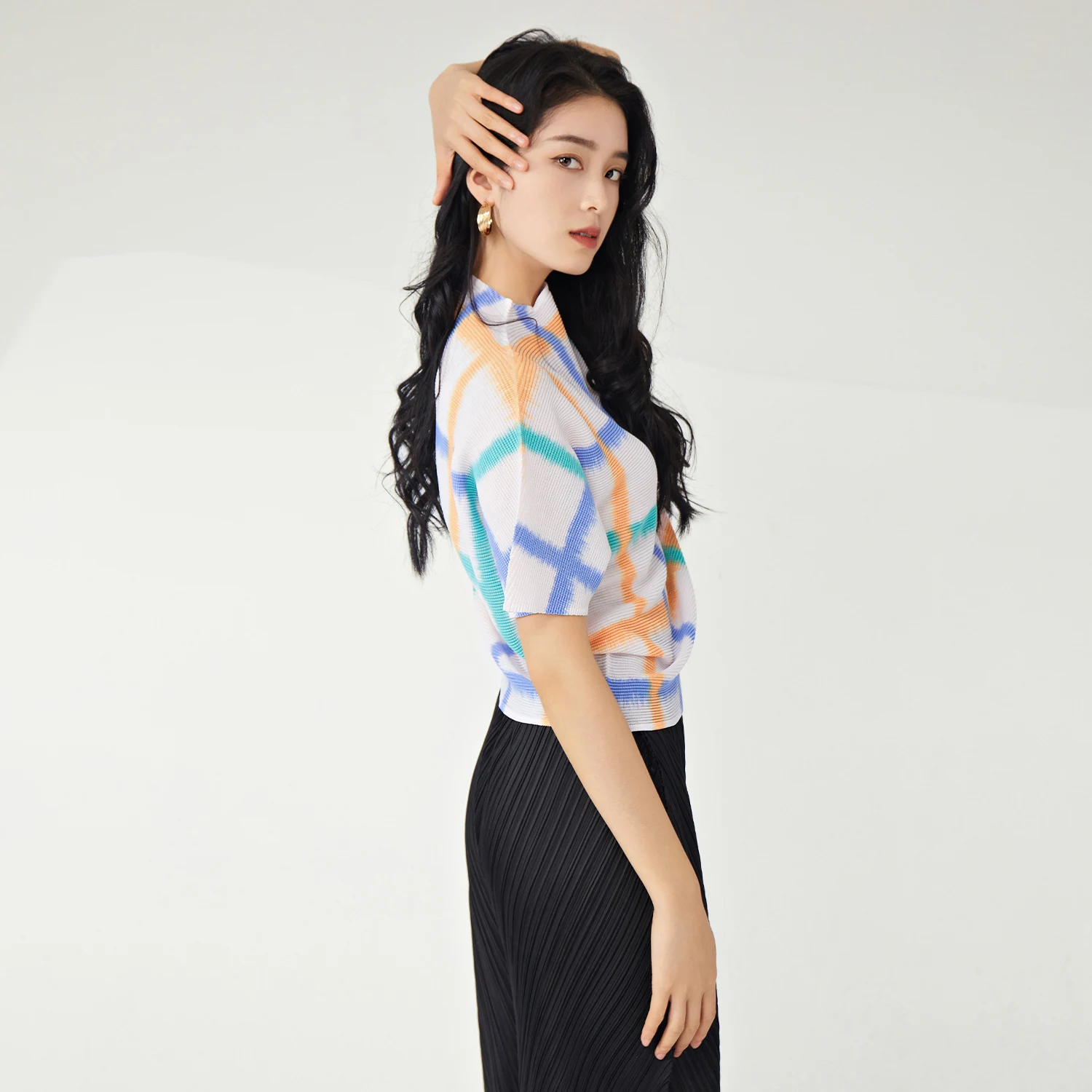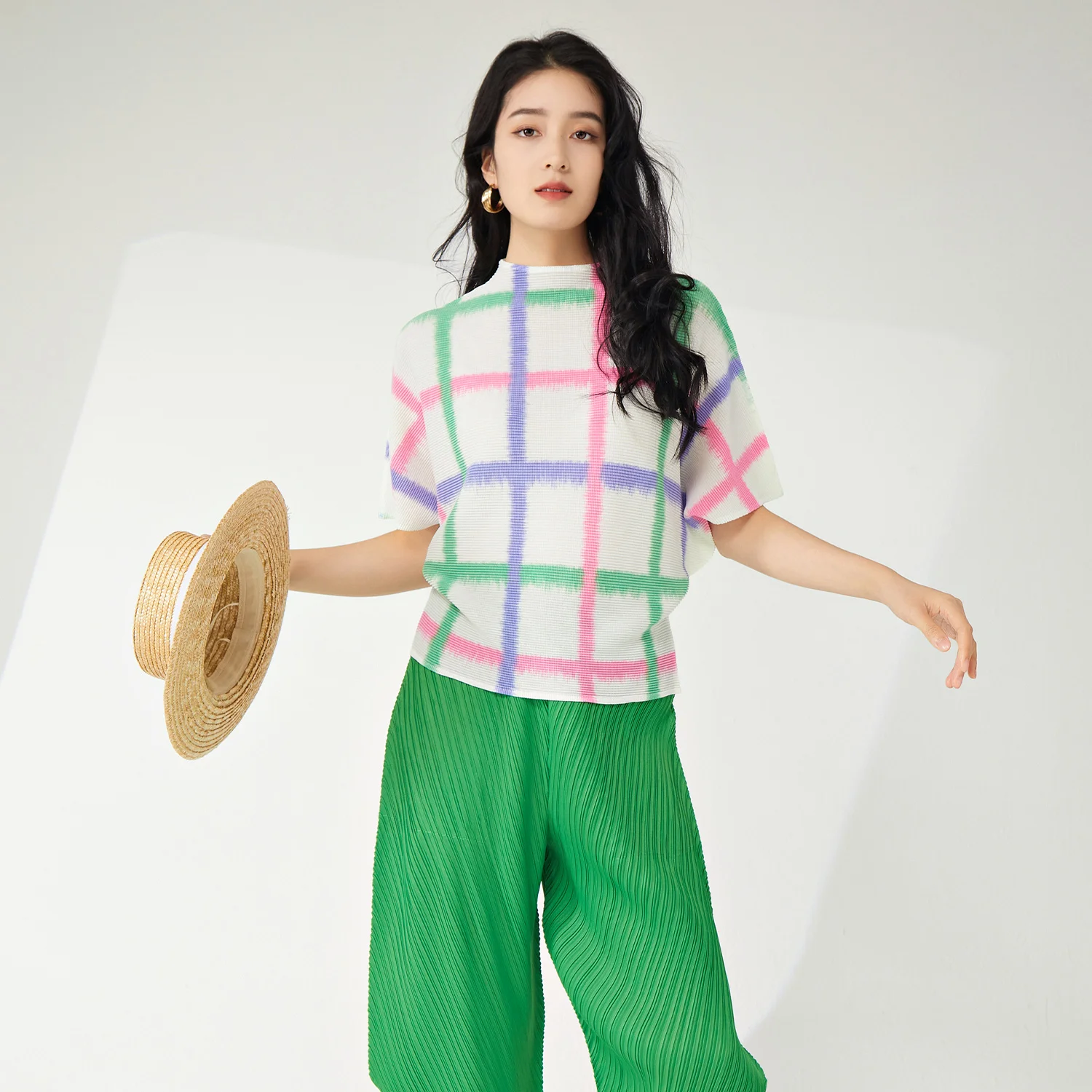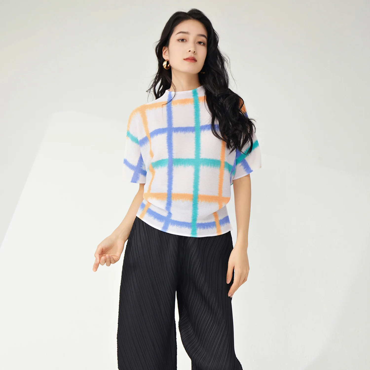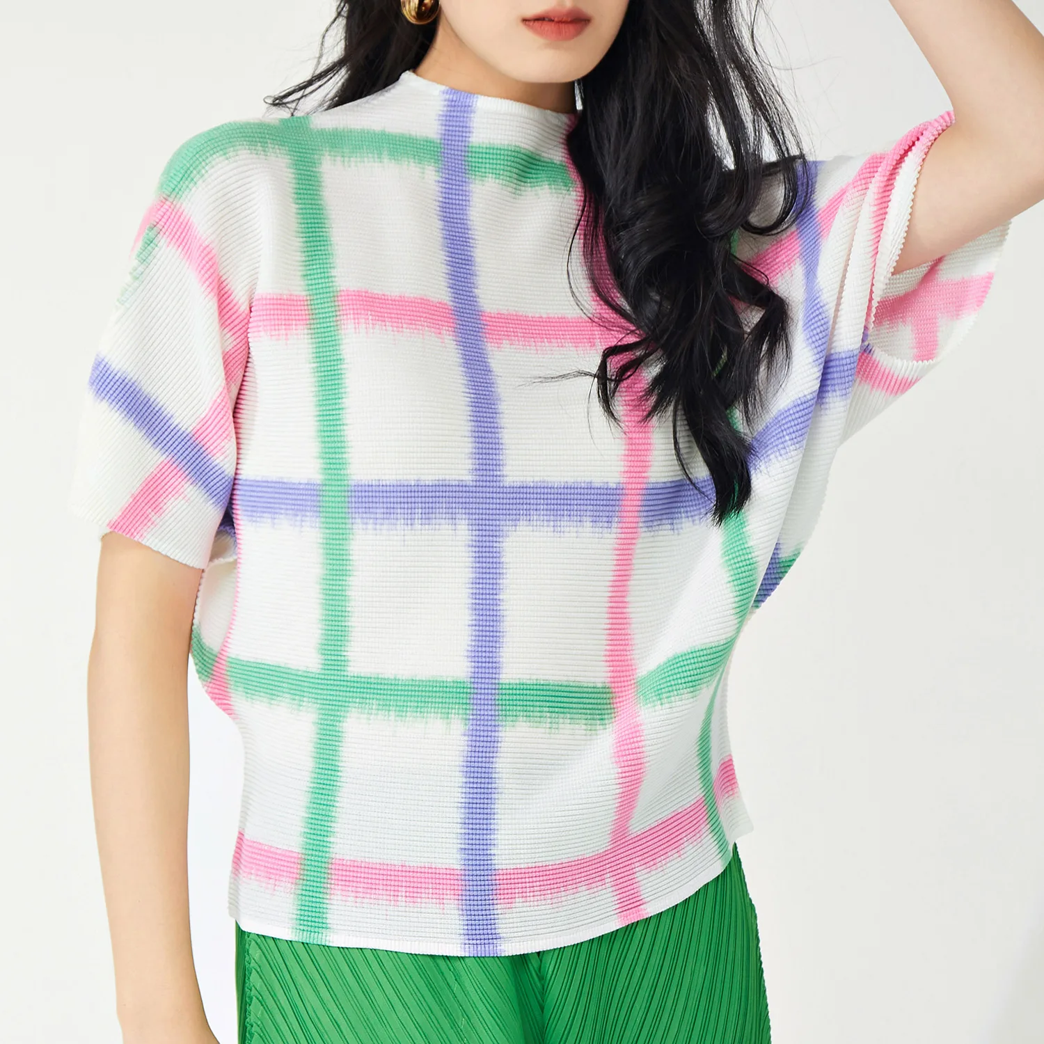 Women's Casual T-Shirt Pleated Fashion Design With Elastic Printed Bat-Sleeve Plaid Short-Sleeved Top Wholesale