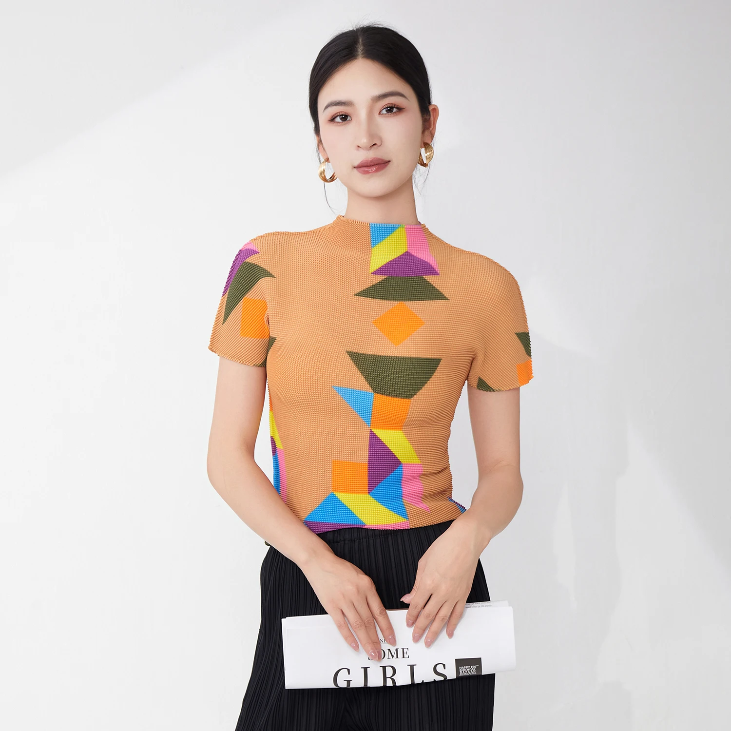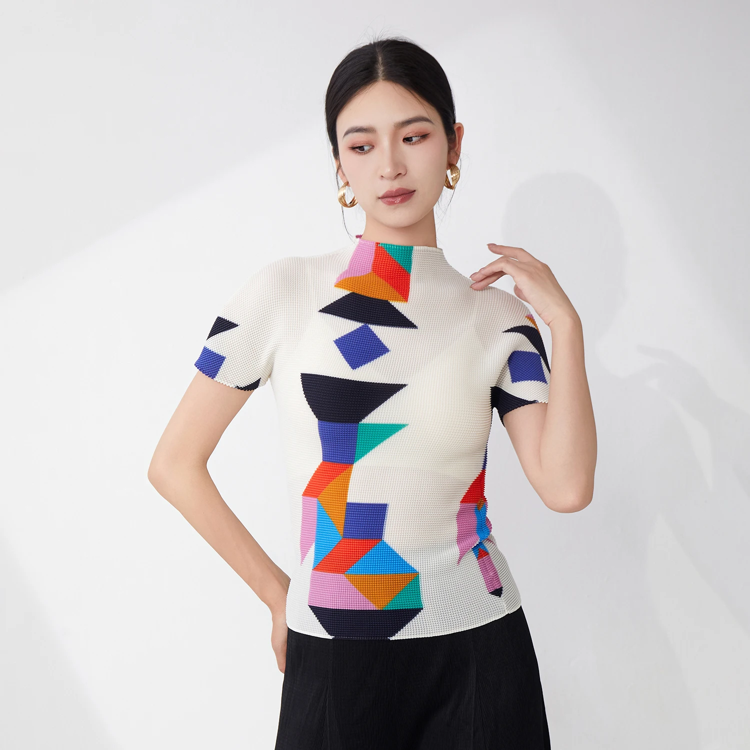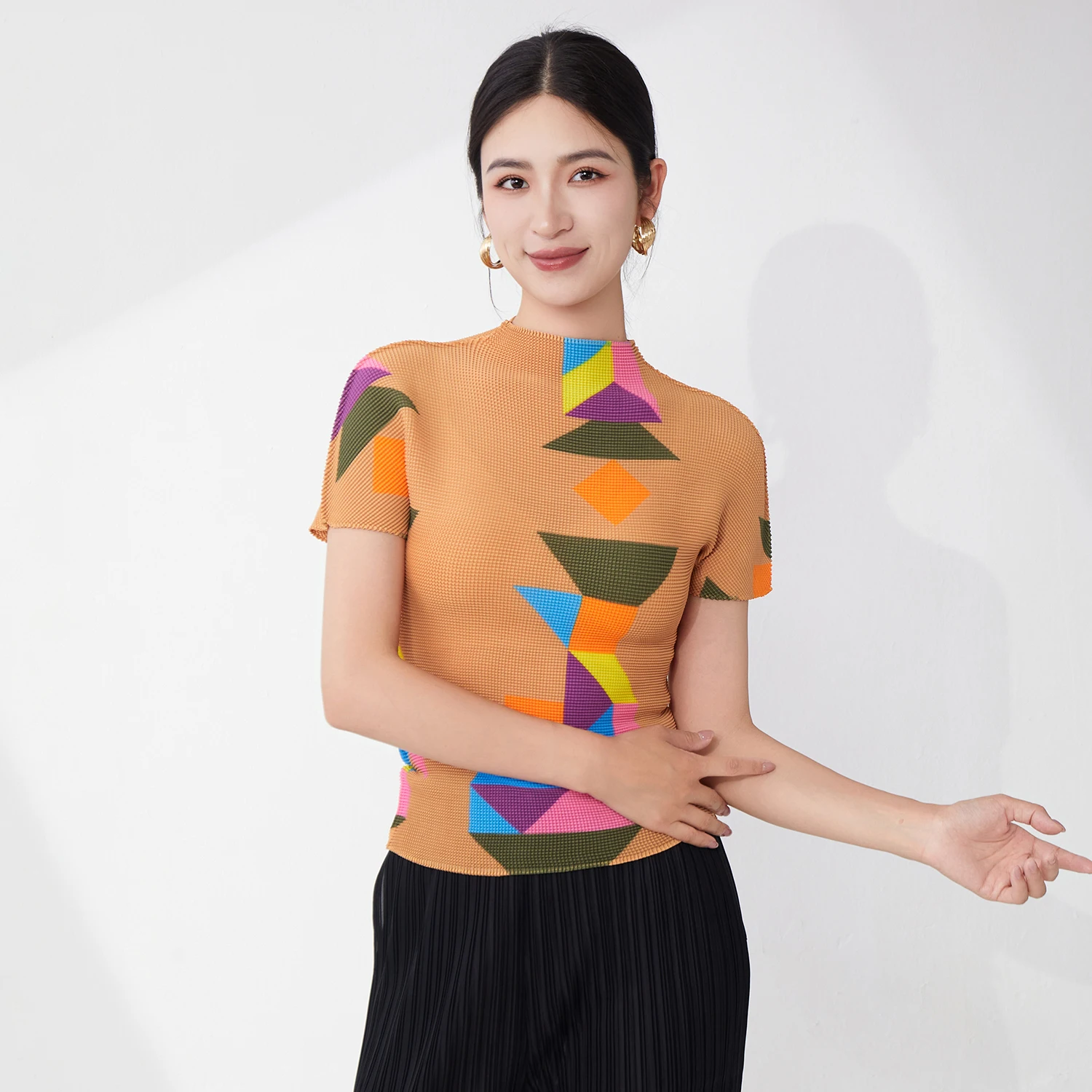 Miyake Short-sleeved T-shirt Women's Fashion Tops Summer New Style Shirt Temperament Tops Elastic Print Casual Shirt