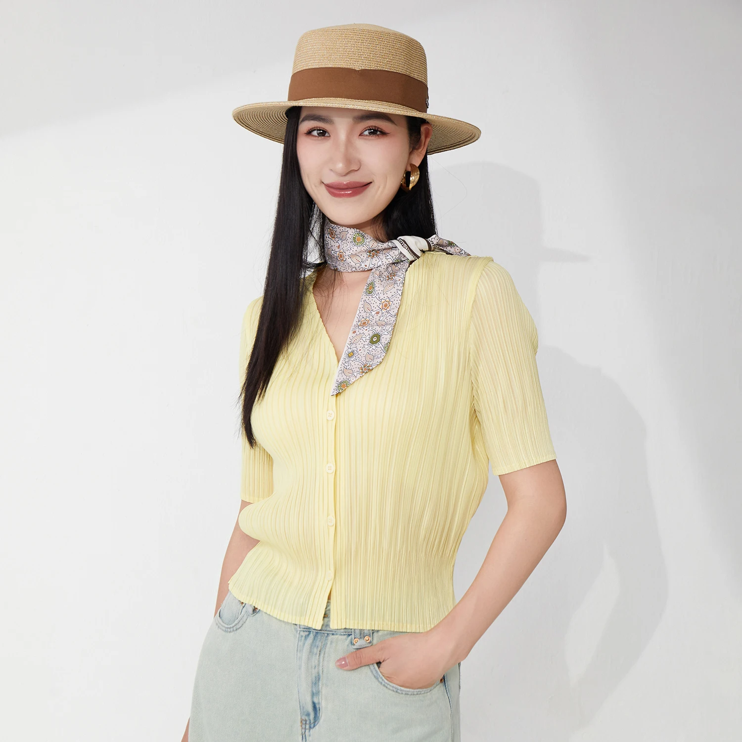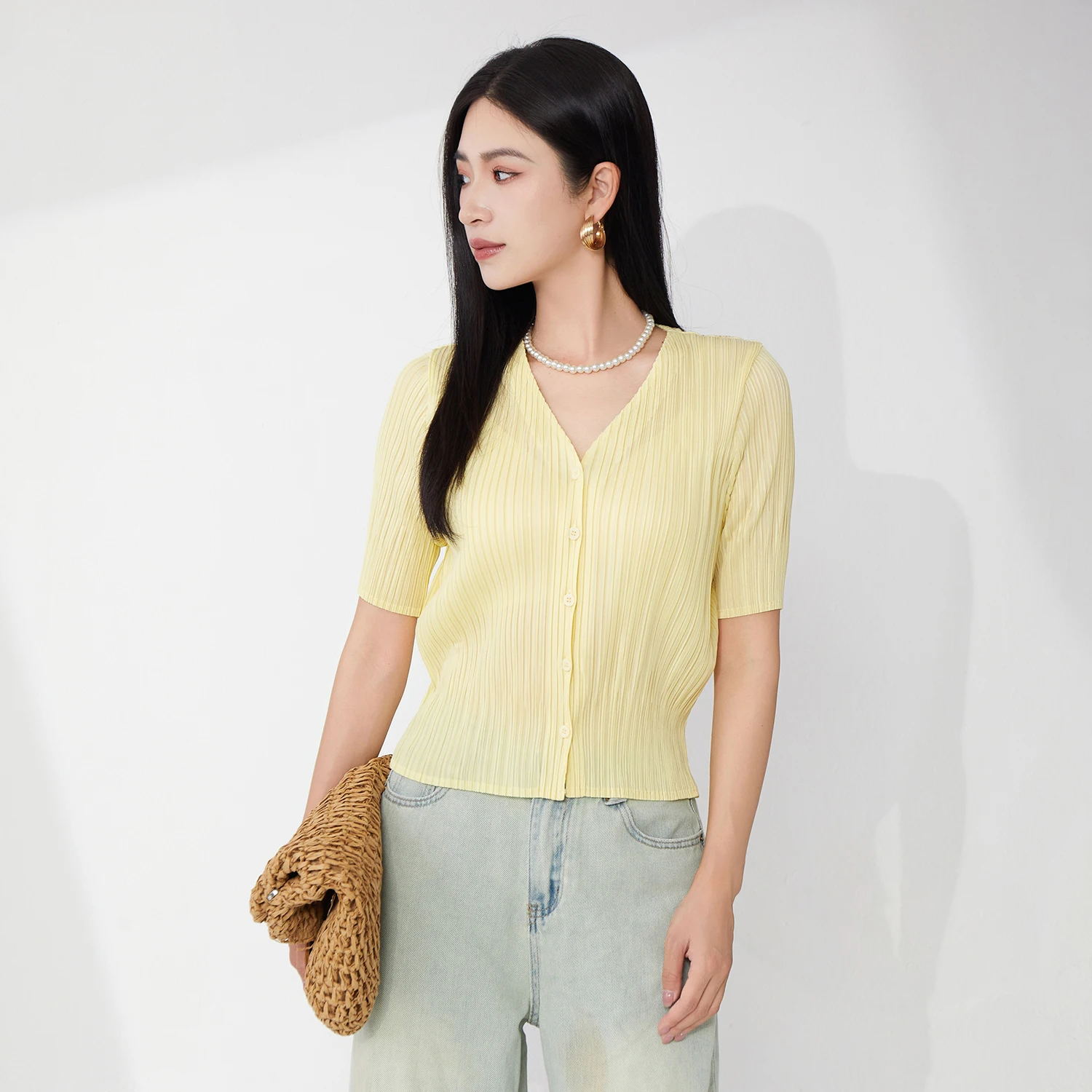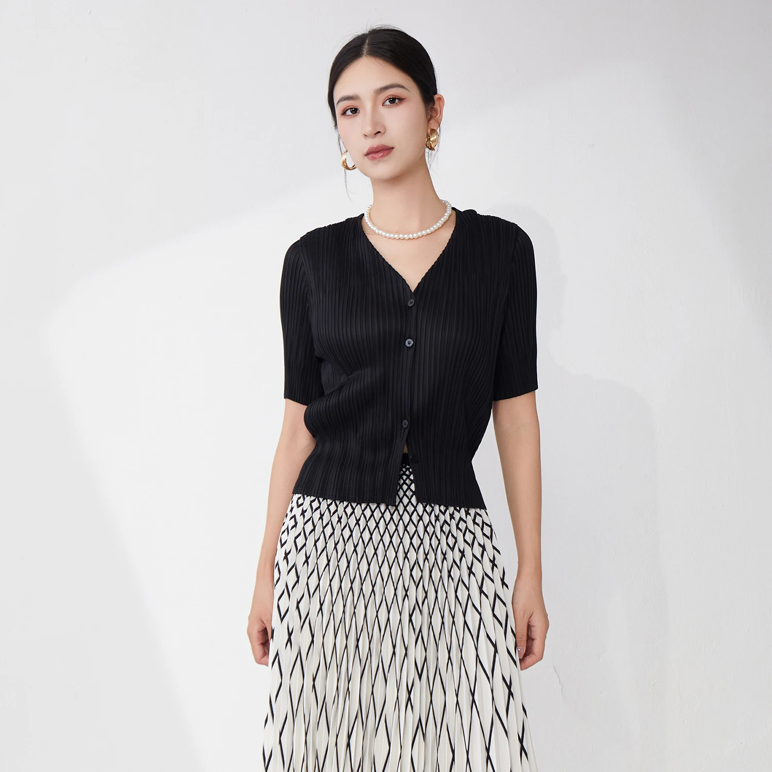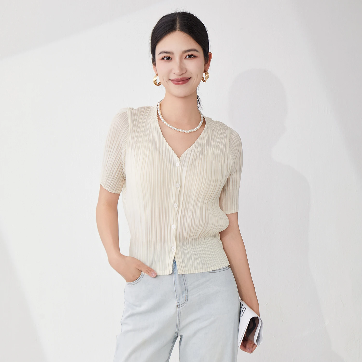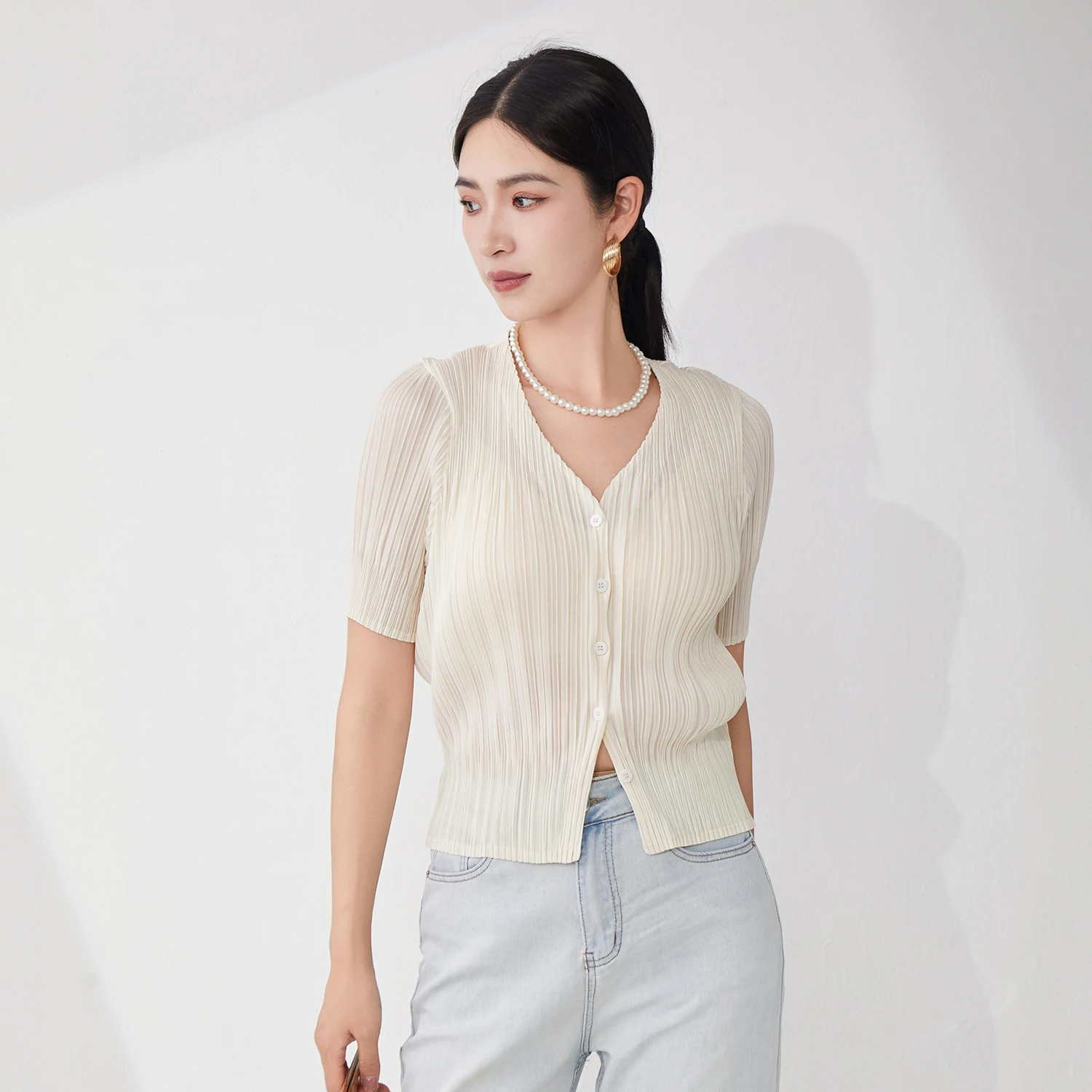 2025 New Women's Pleated Tops Loose Solid Color Cardigan Short-sleeved Casual T-shirt Miyake Top