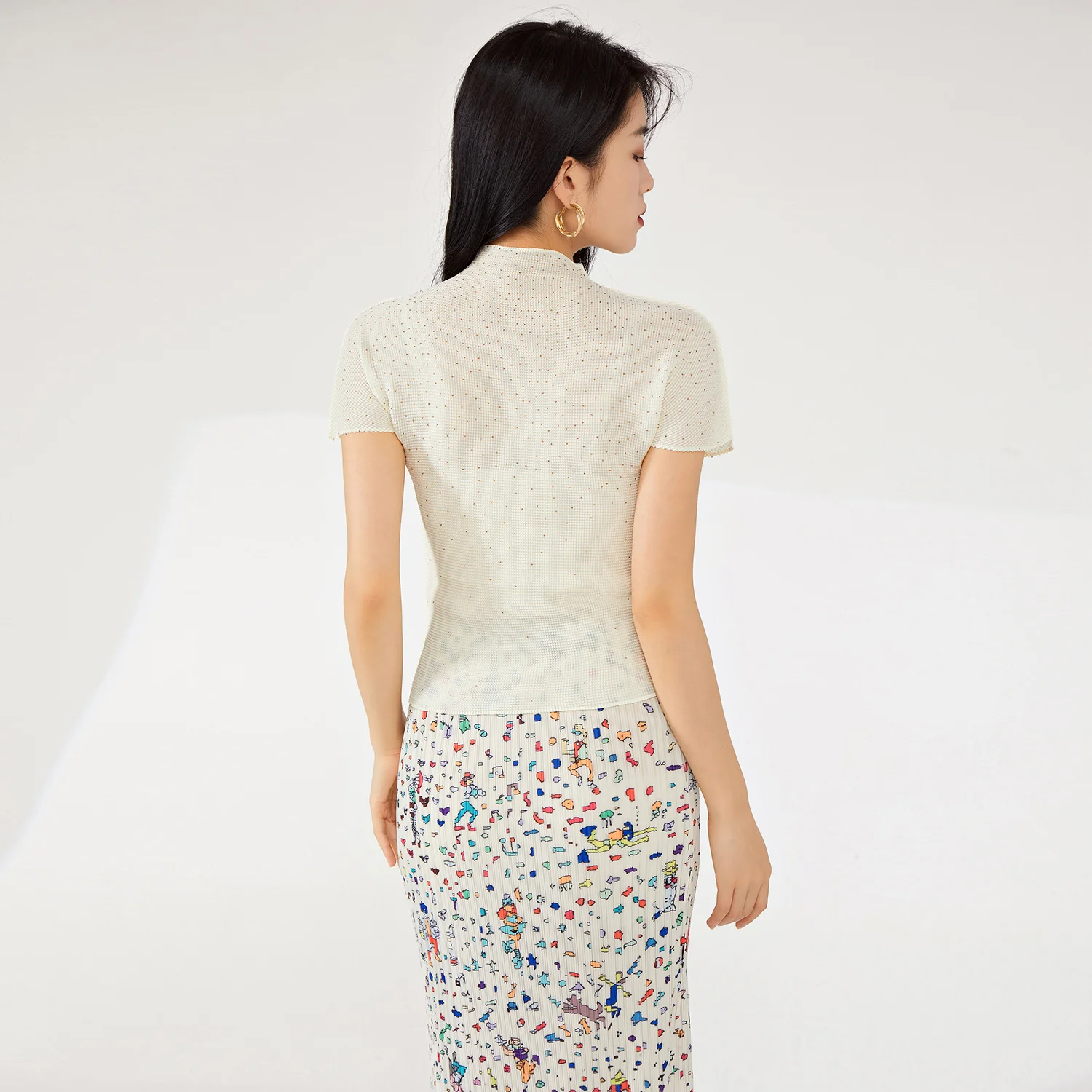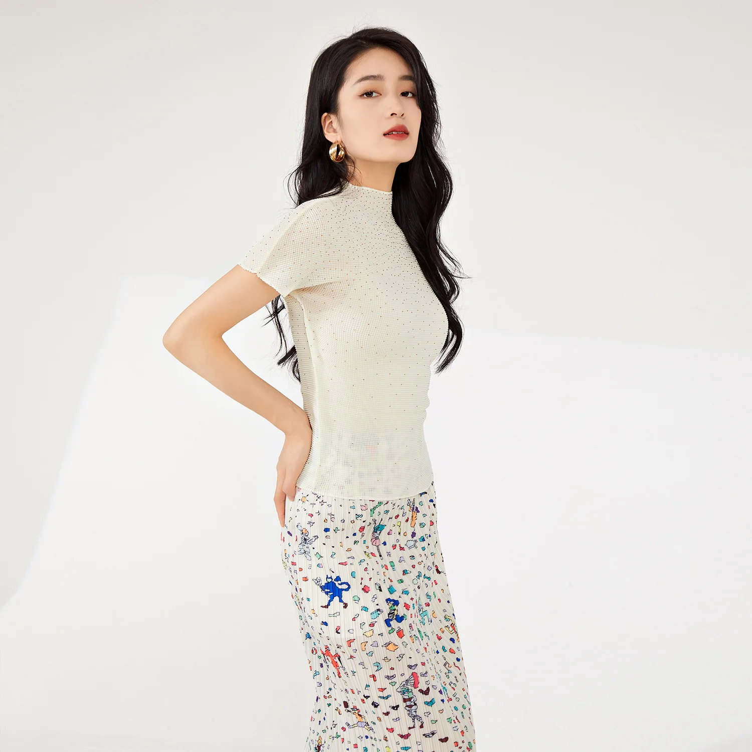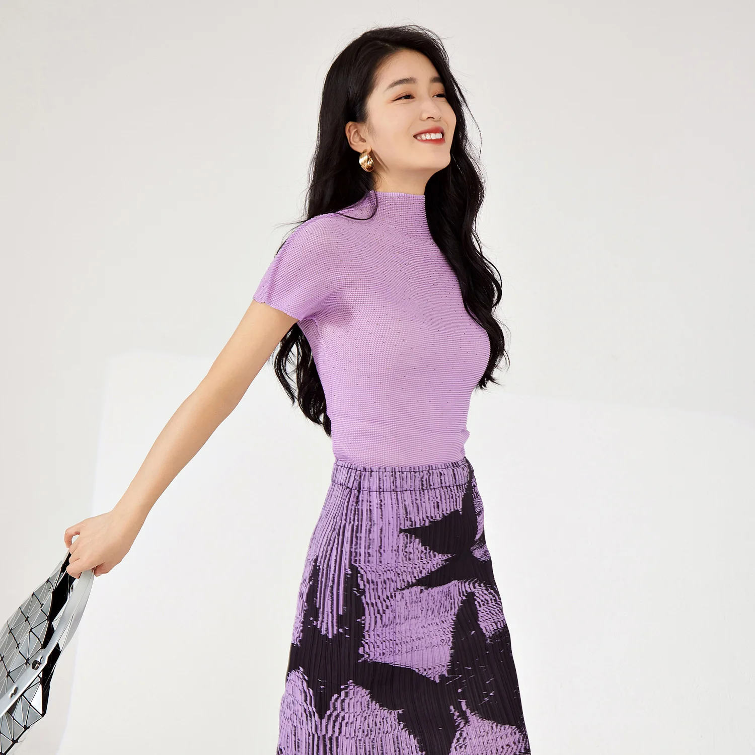Miyake Women's High Quality Casual Style T-Shirt Pleated Stretch Solid Color Short-Sleeved Breathable Woven Fabric Daily Use