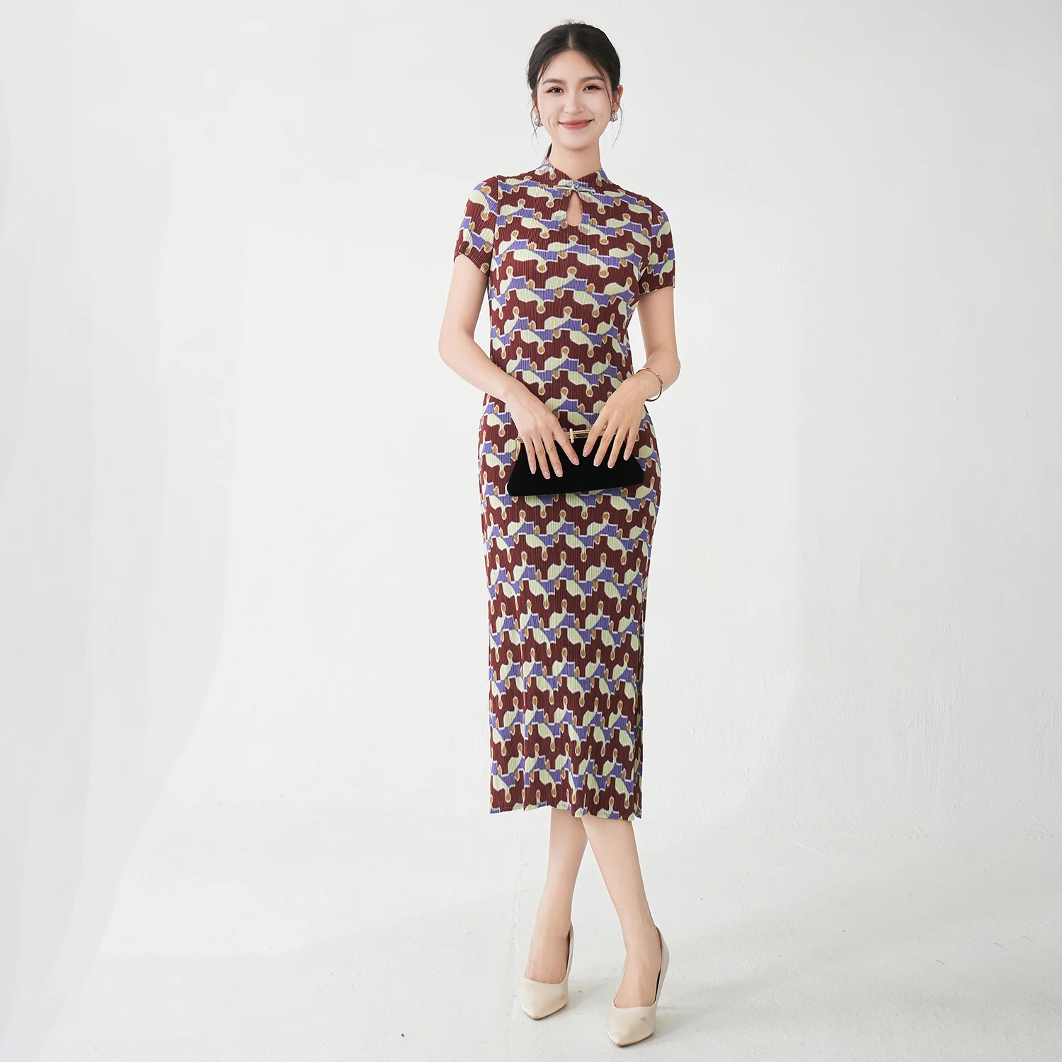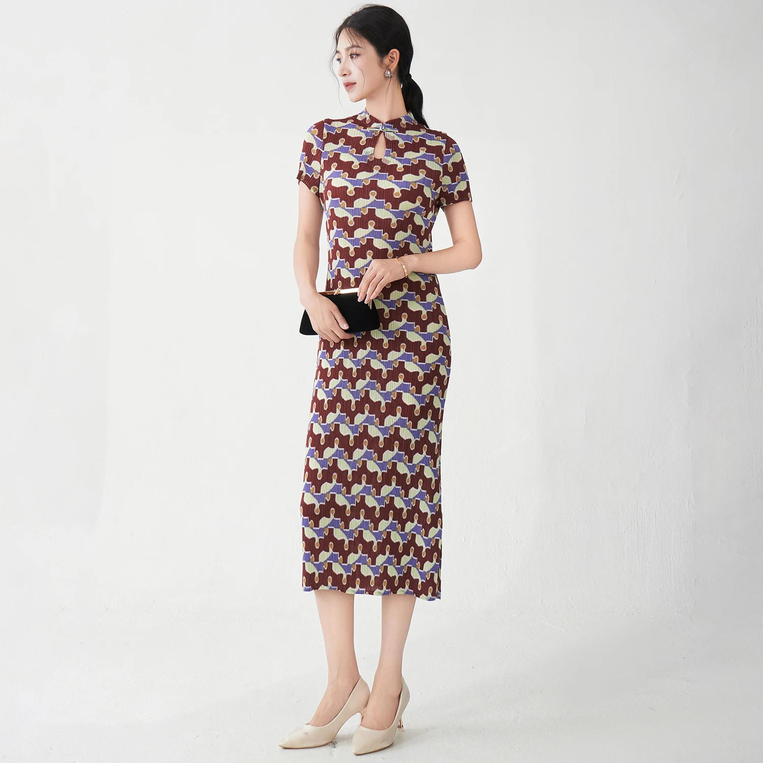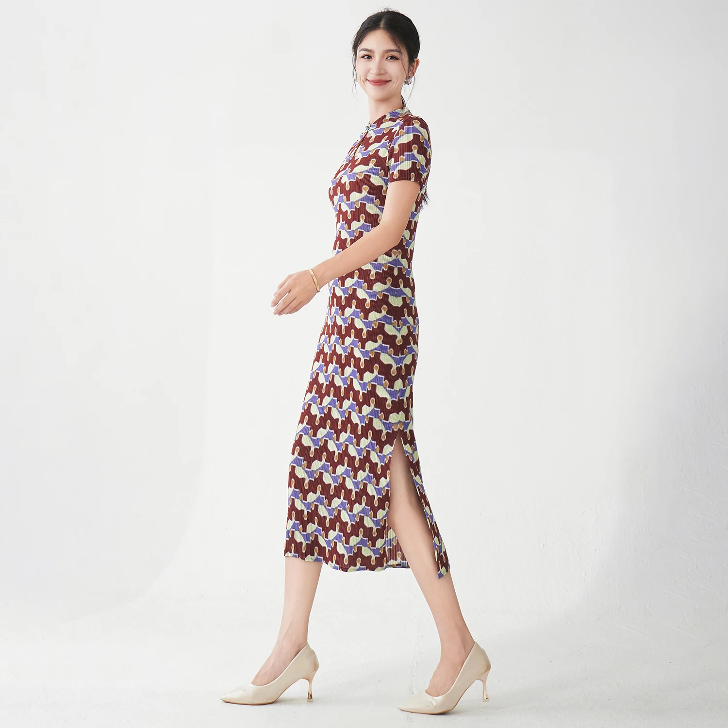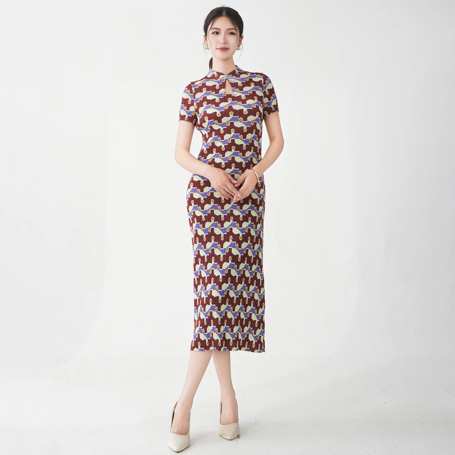 Wholesale Fashion Premium Quality Women's Elegant Dress Summer Short Sleeve Printed Dress Miyake Pleated Dress