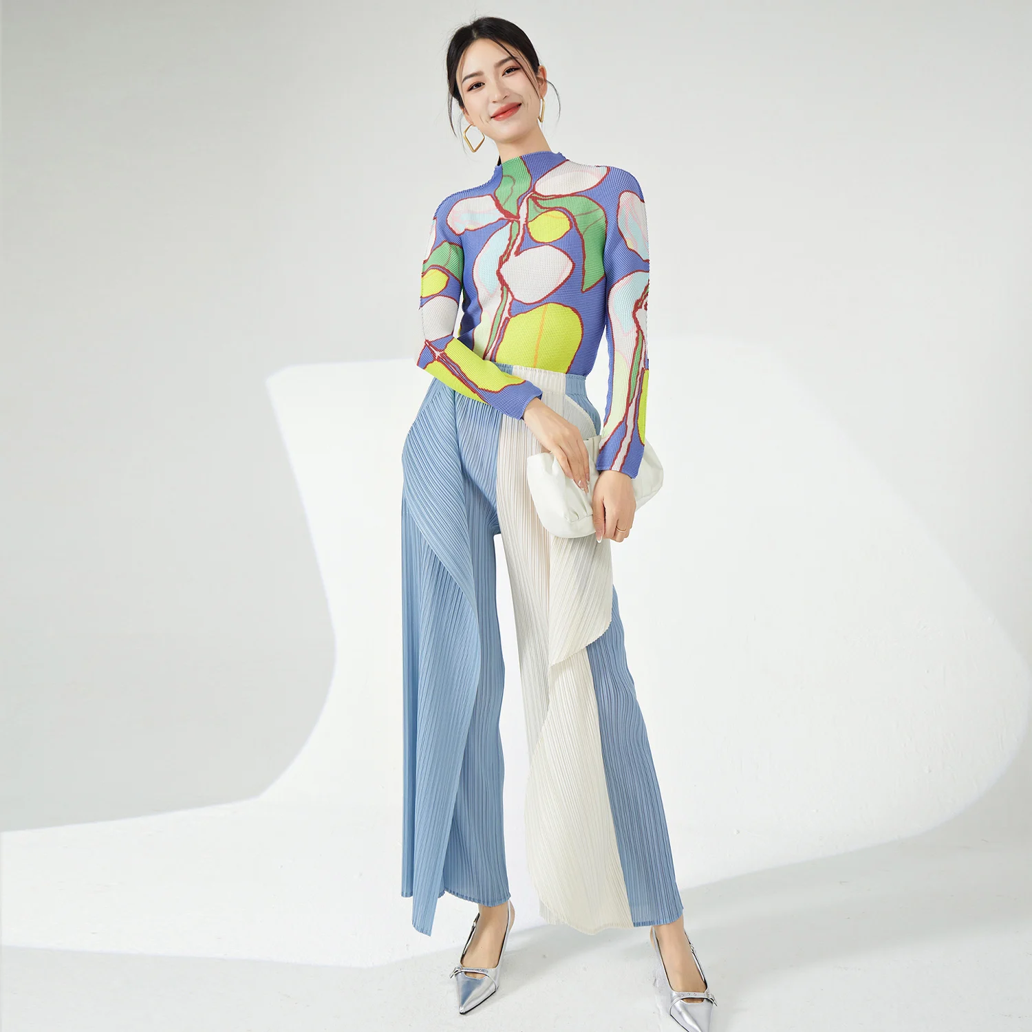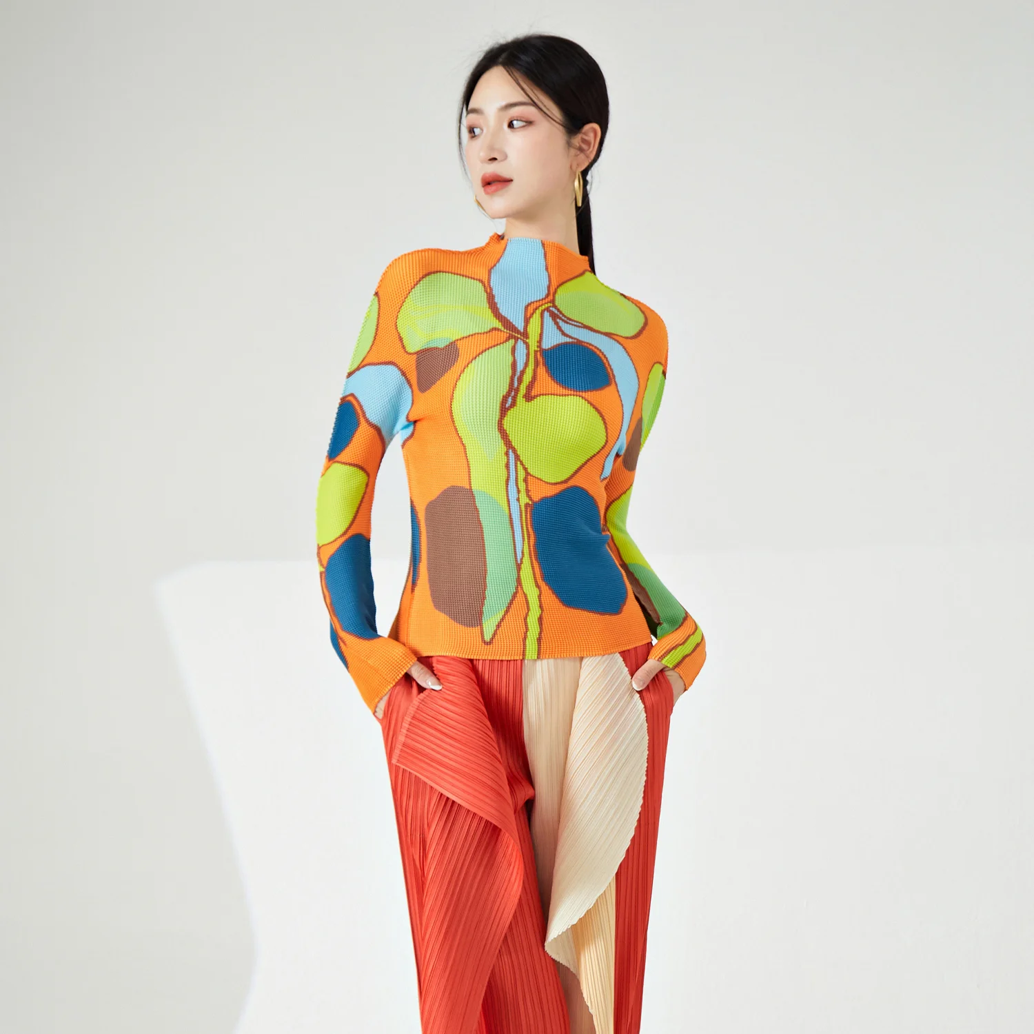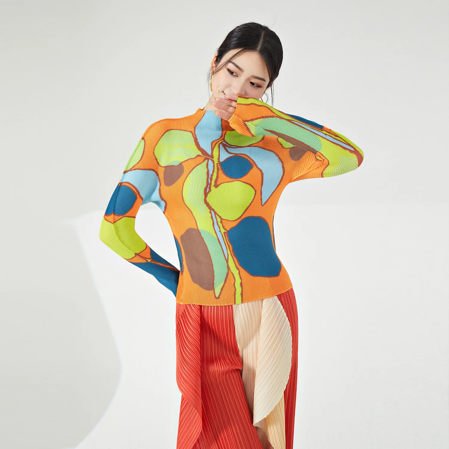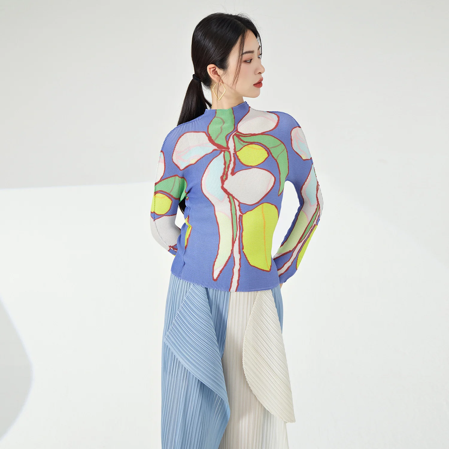Ladies' High Quality Pleated Shirt Vintage Summer T-Shirt Top Elastic Print Floral Pattern Unique Long-Sleeved Casual Style