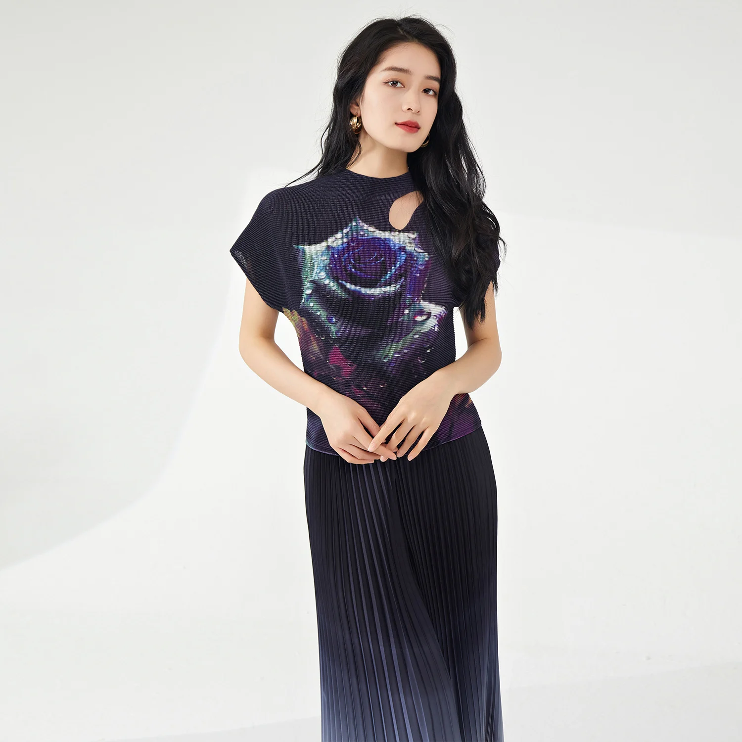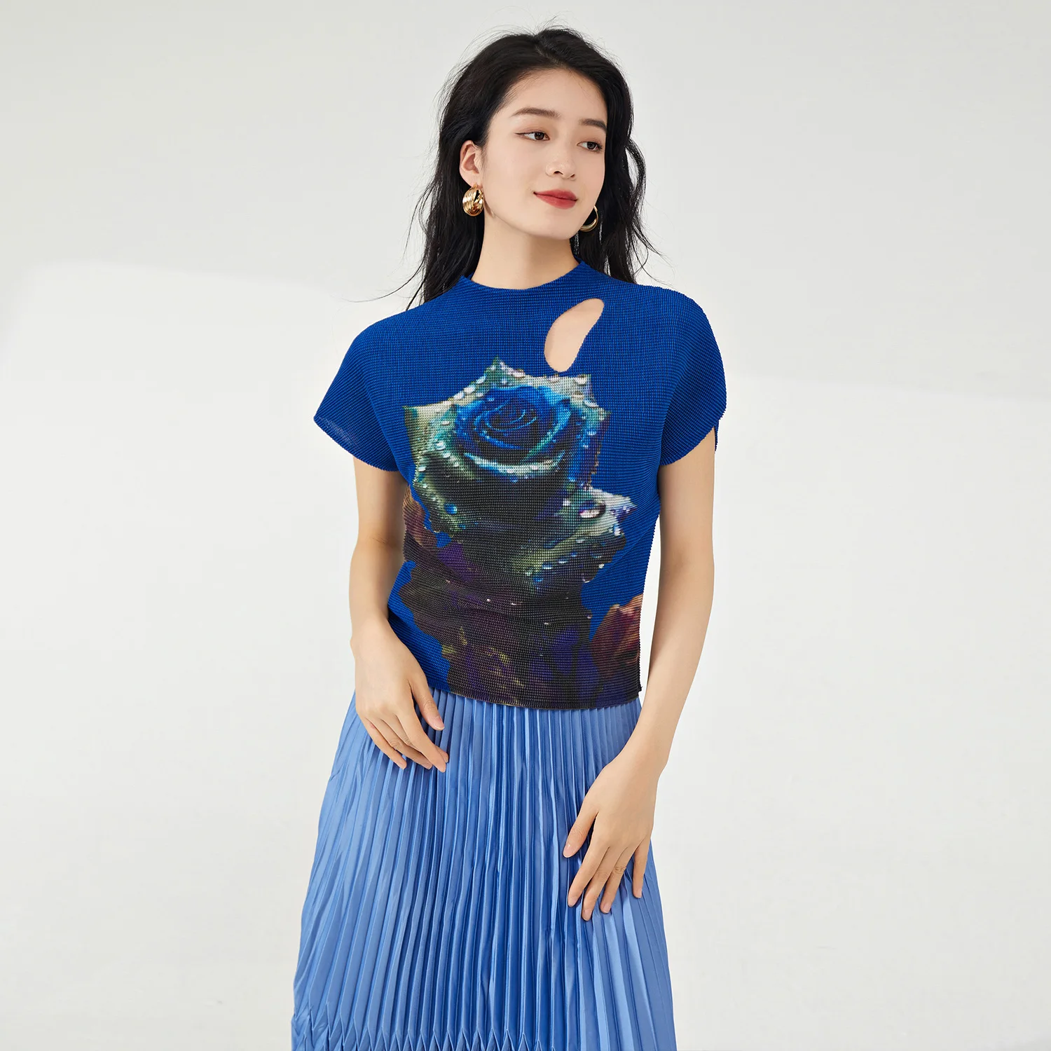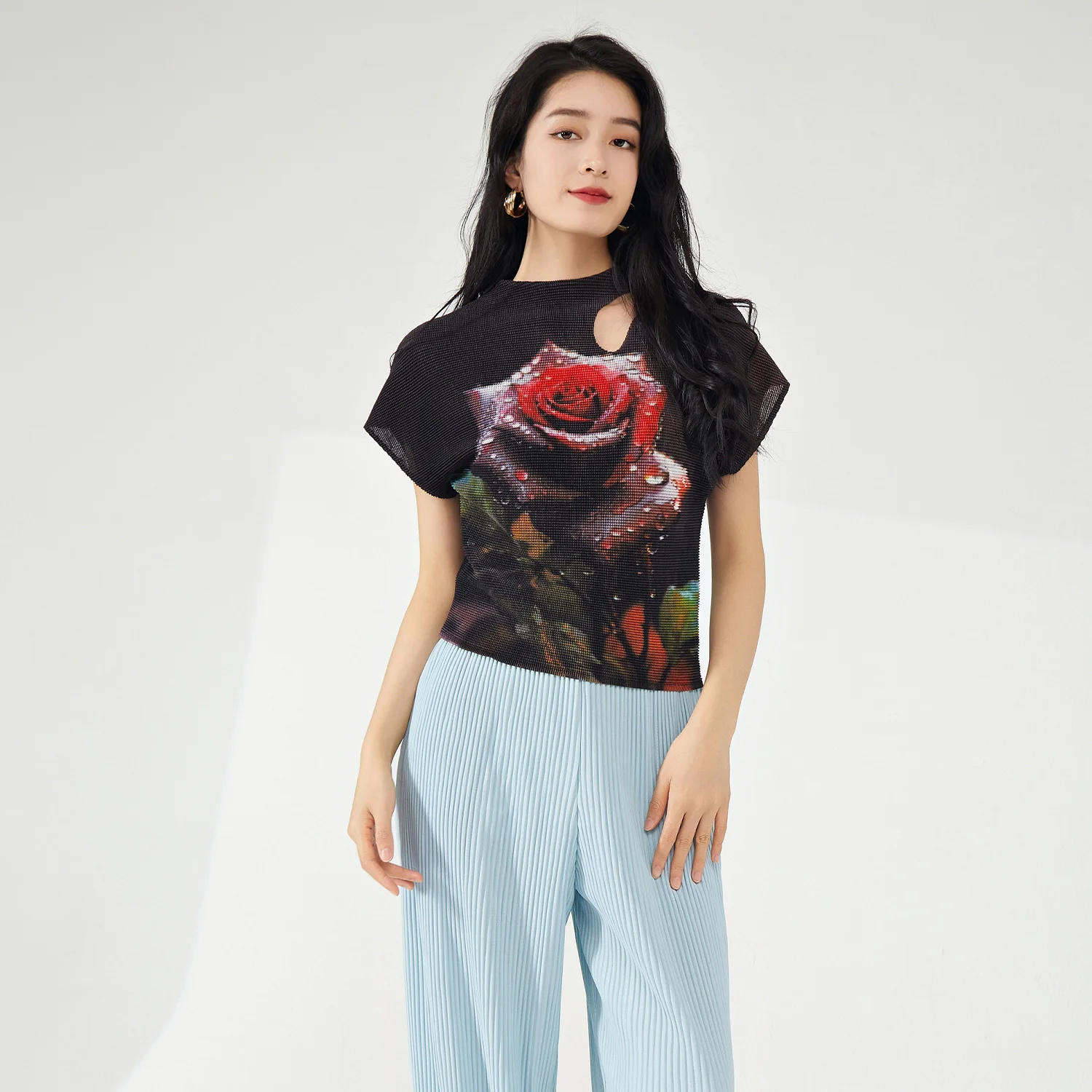 2025 Latest Women's Summer Casual Vintage Style Elegant Stretch Pleated T-Shirts Breathable Printed Tops Short Blouses
