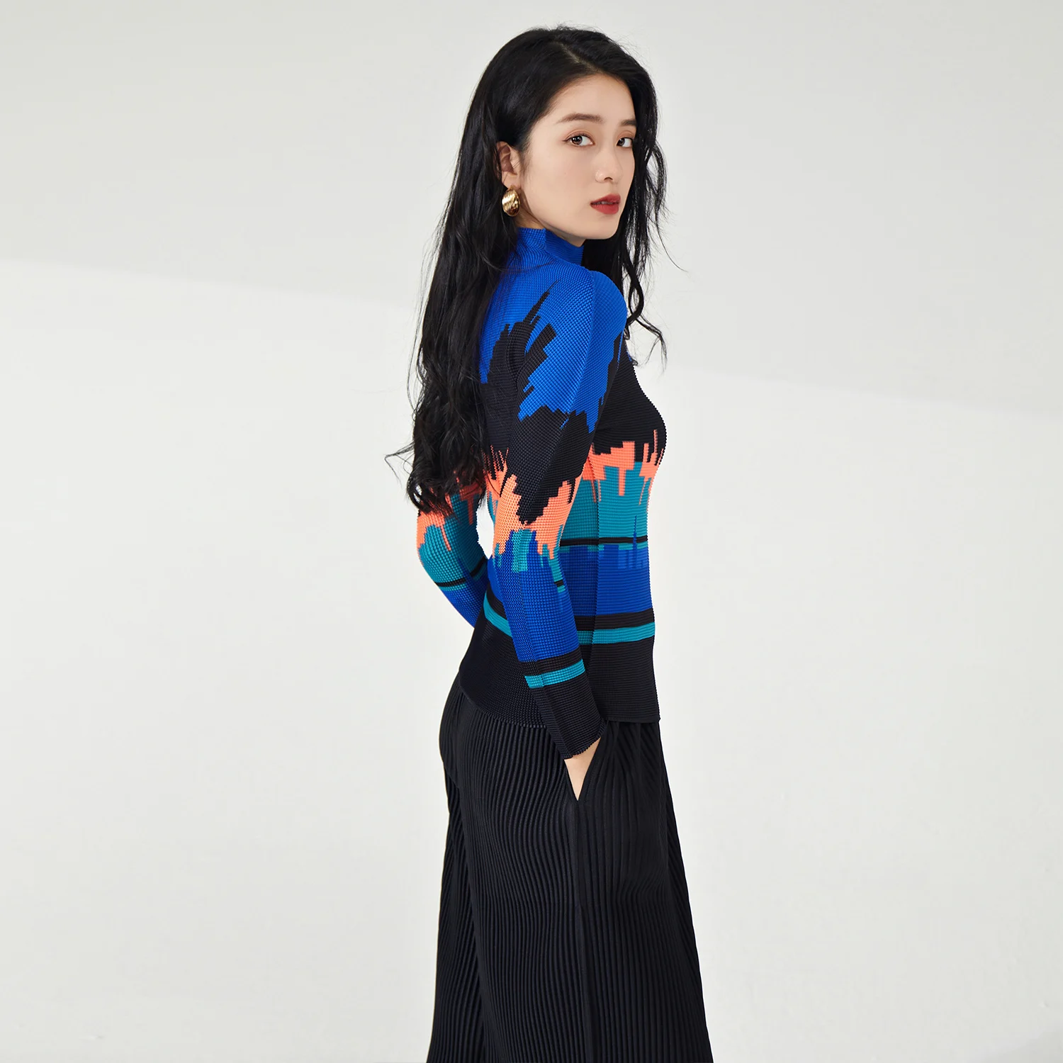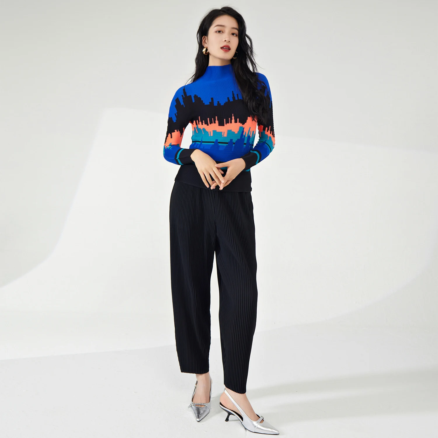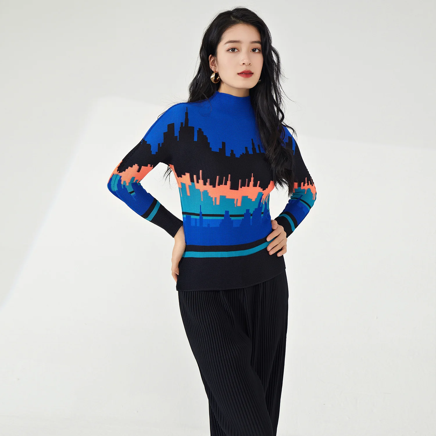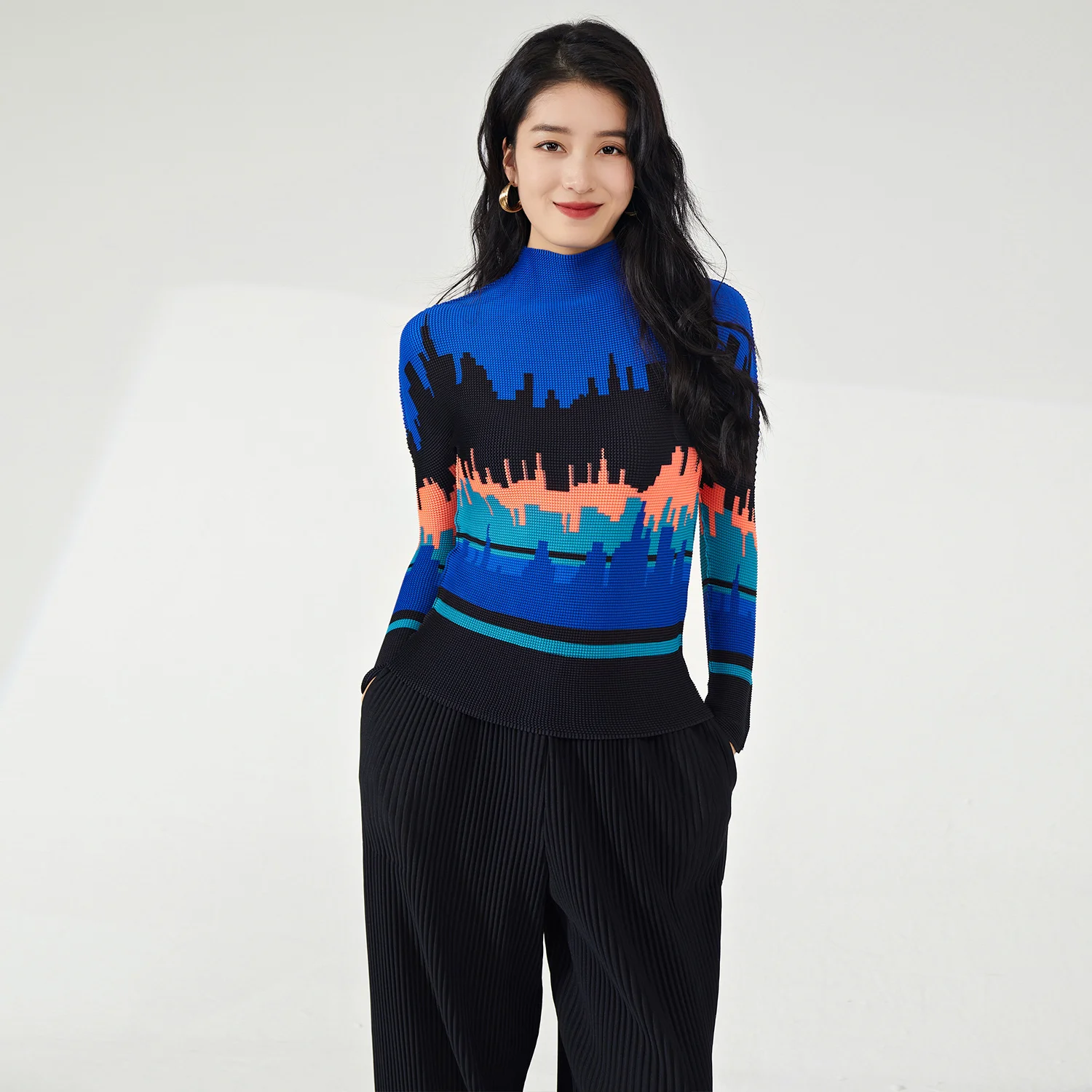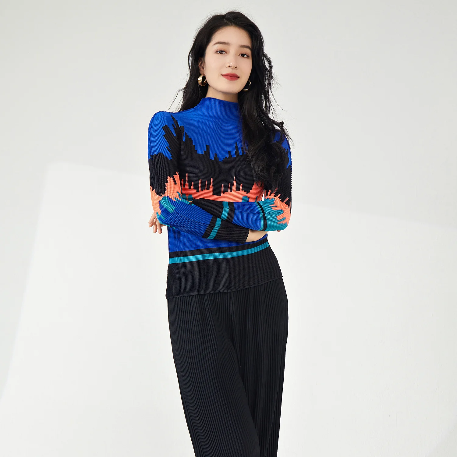 2025 Latest Women's High Quality Pleated Long Sleeve T-Shirts Casual Style Stretch Printed Blouses for Ladies by Miyake