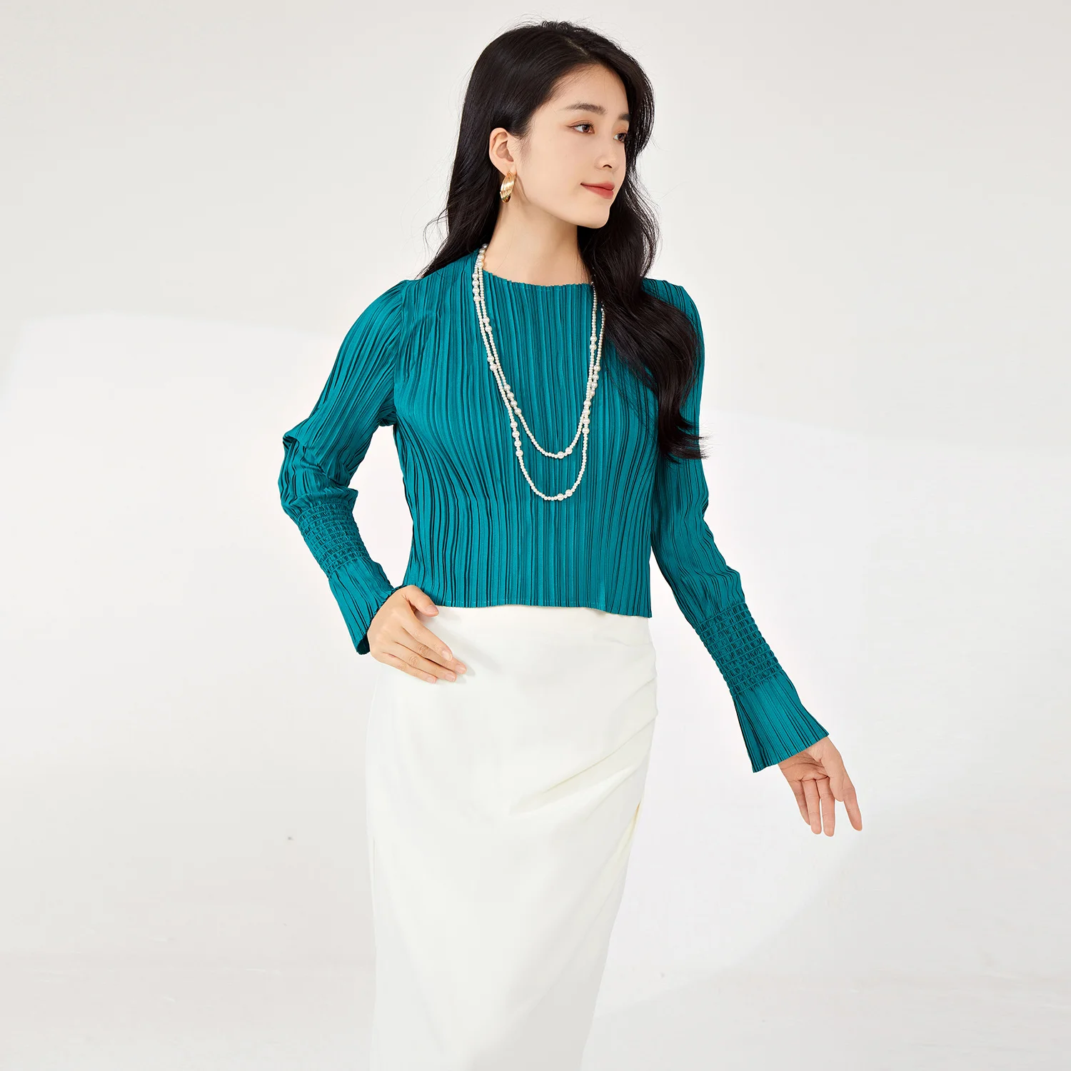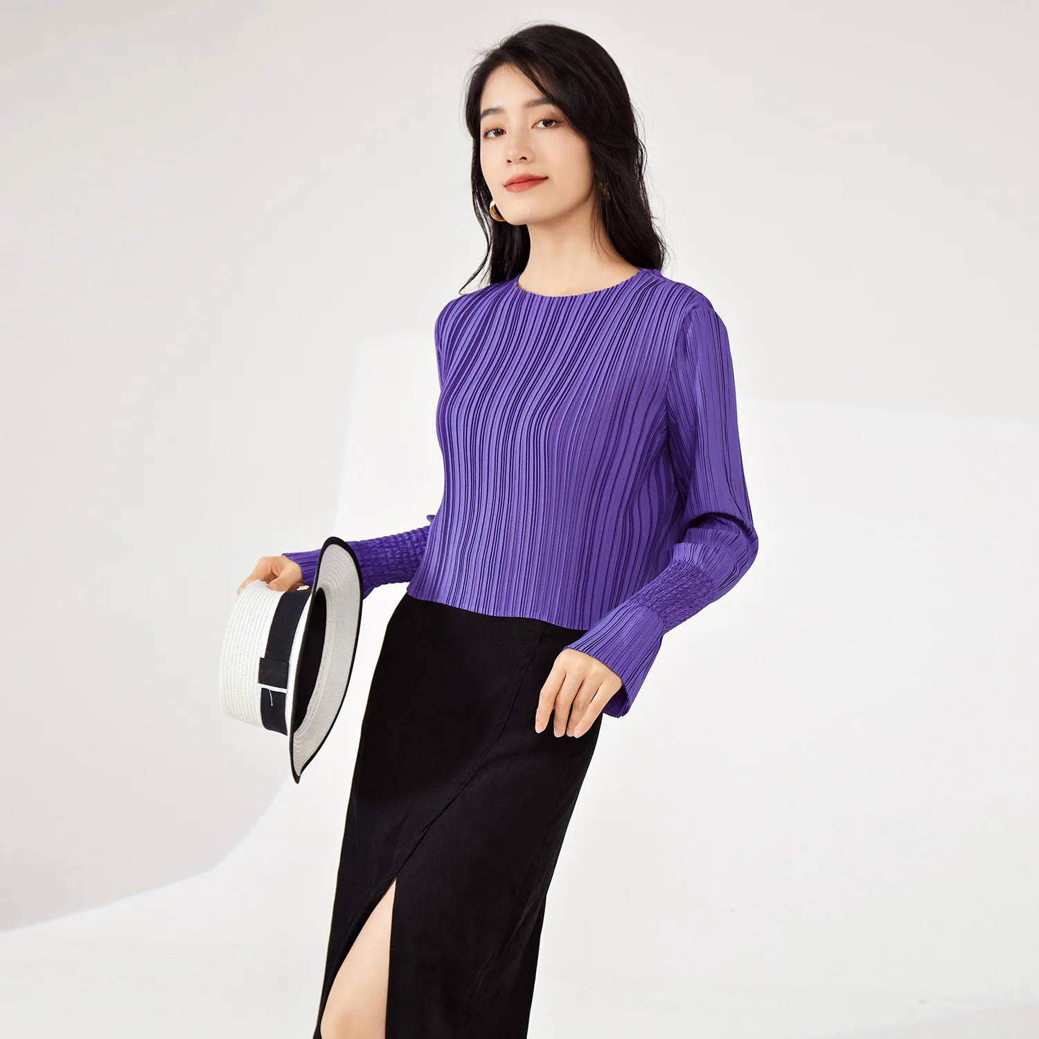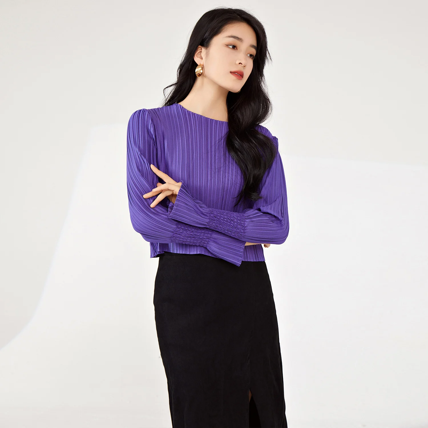 Miyake Women's Long-Sleeved T-Shirt Vintage Pleated Design Stretch Woven Fabric for Spring Summer Fashionable Tops