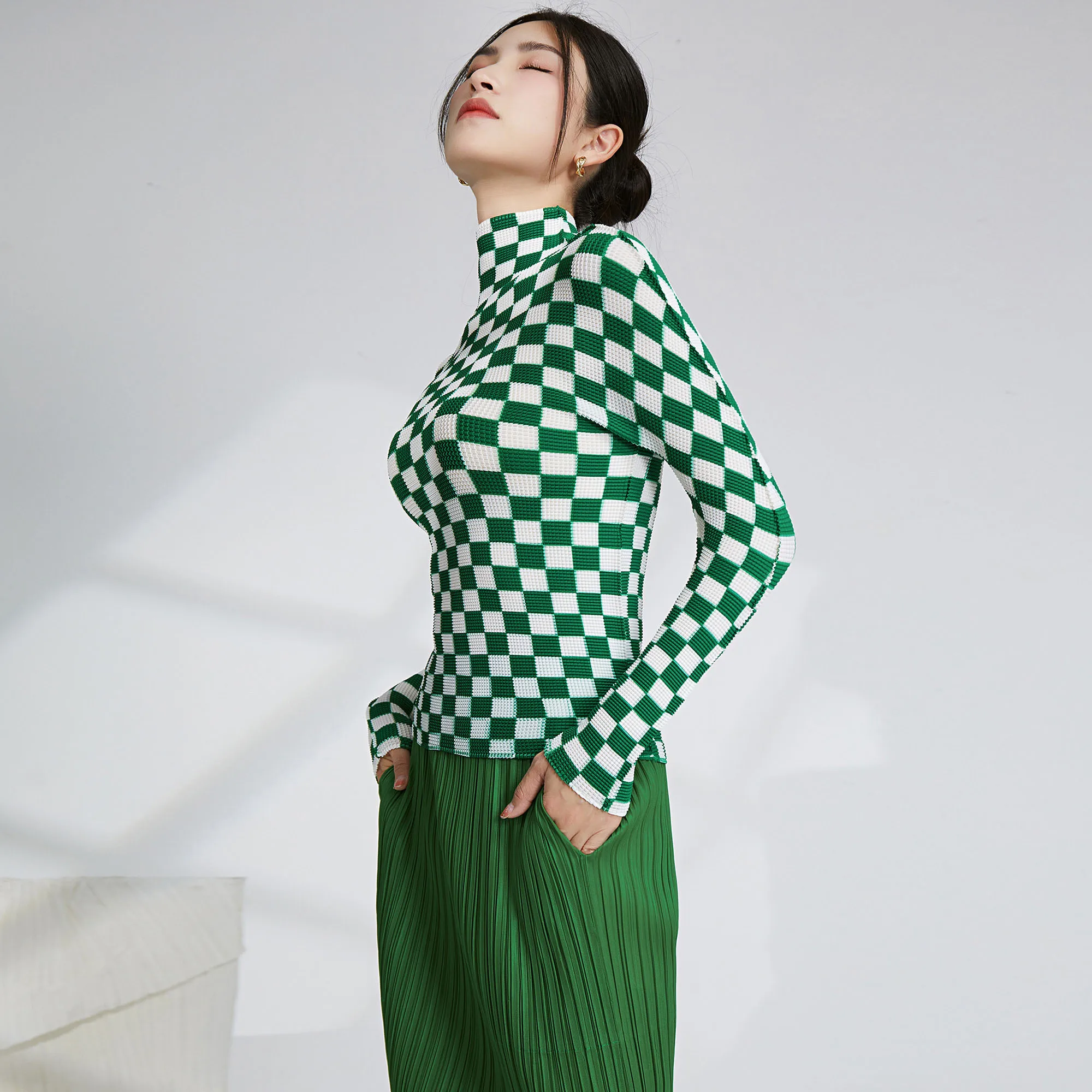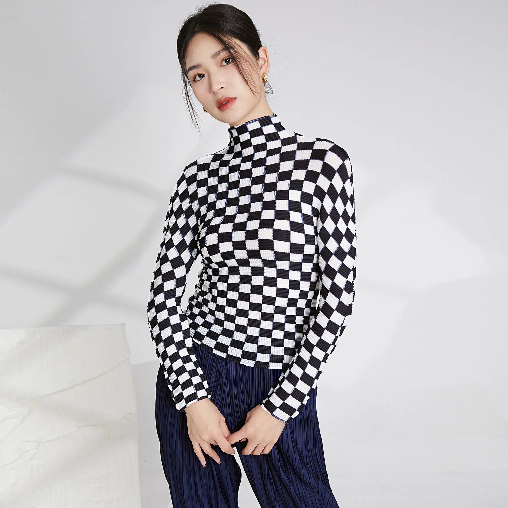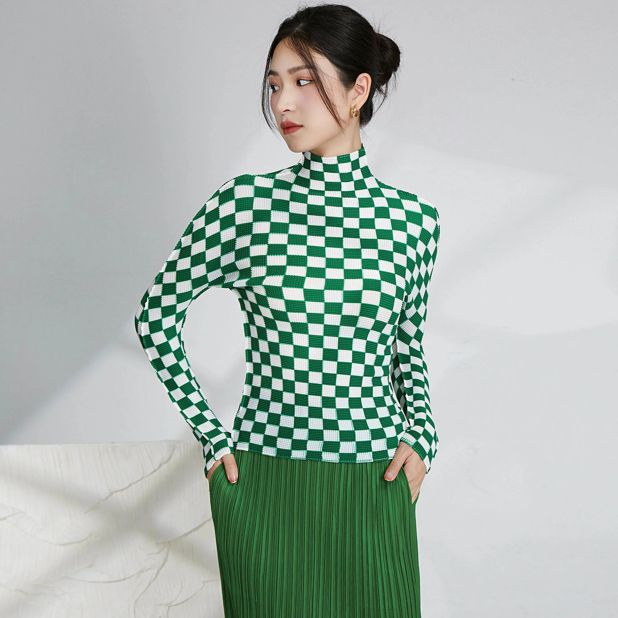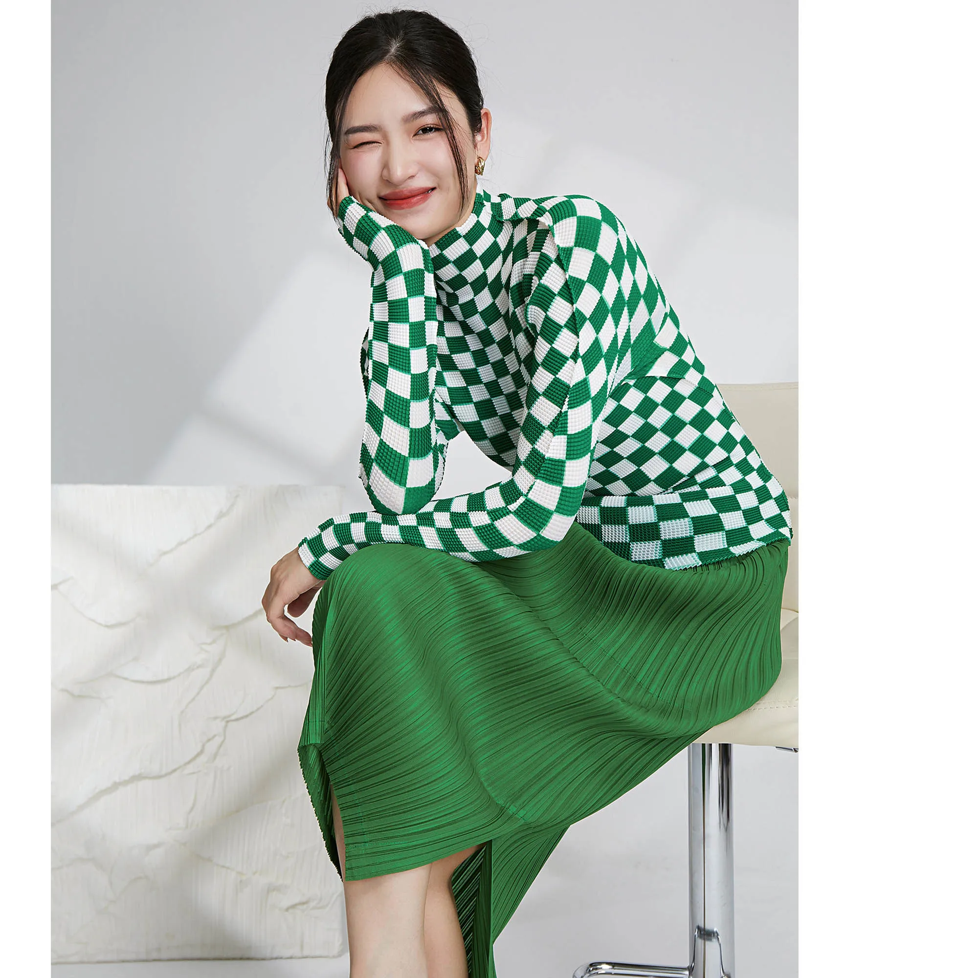 2025 Summer Miyake Latest Fashion Design Printed Plaid Pattern Long Sleeve Top Women Casual Pleated Elastic Shirt
