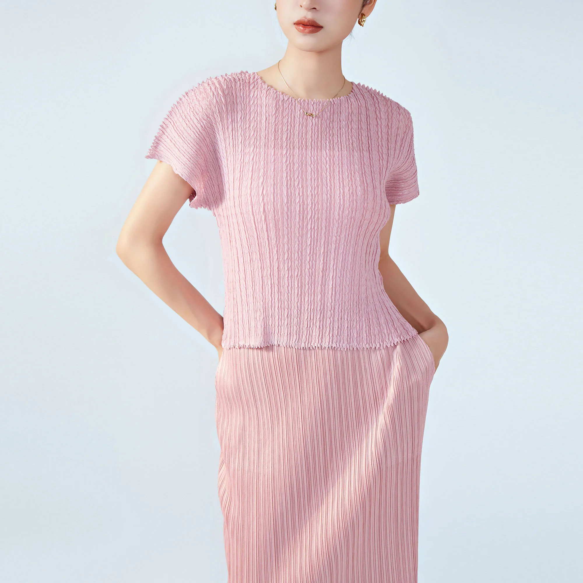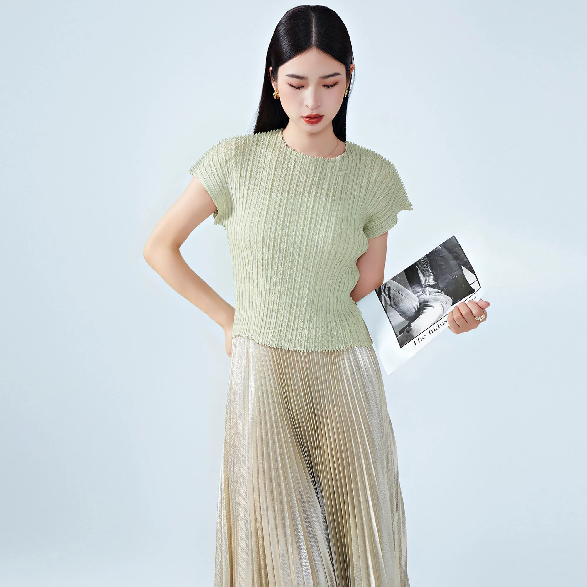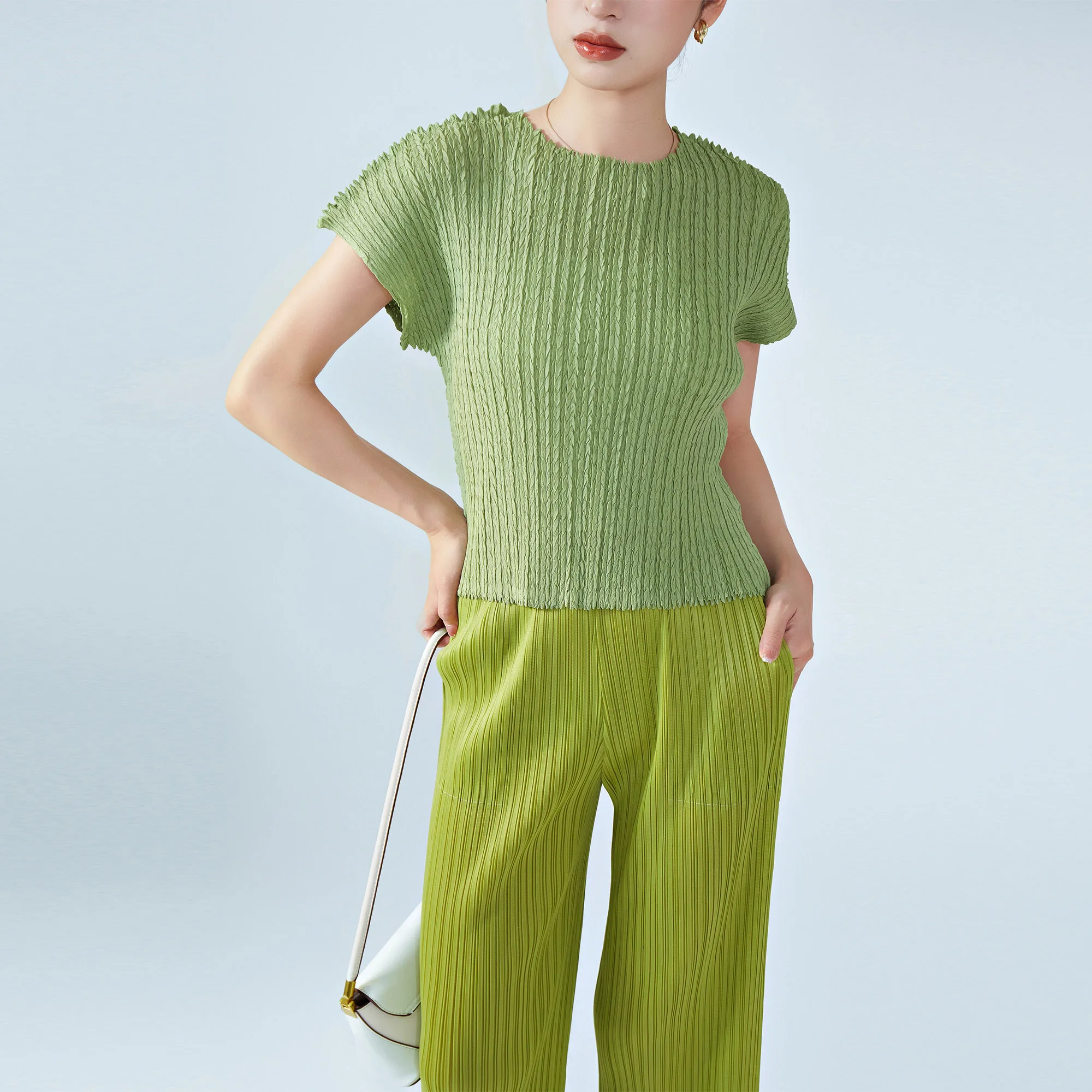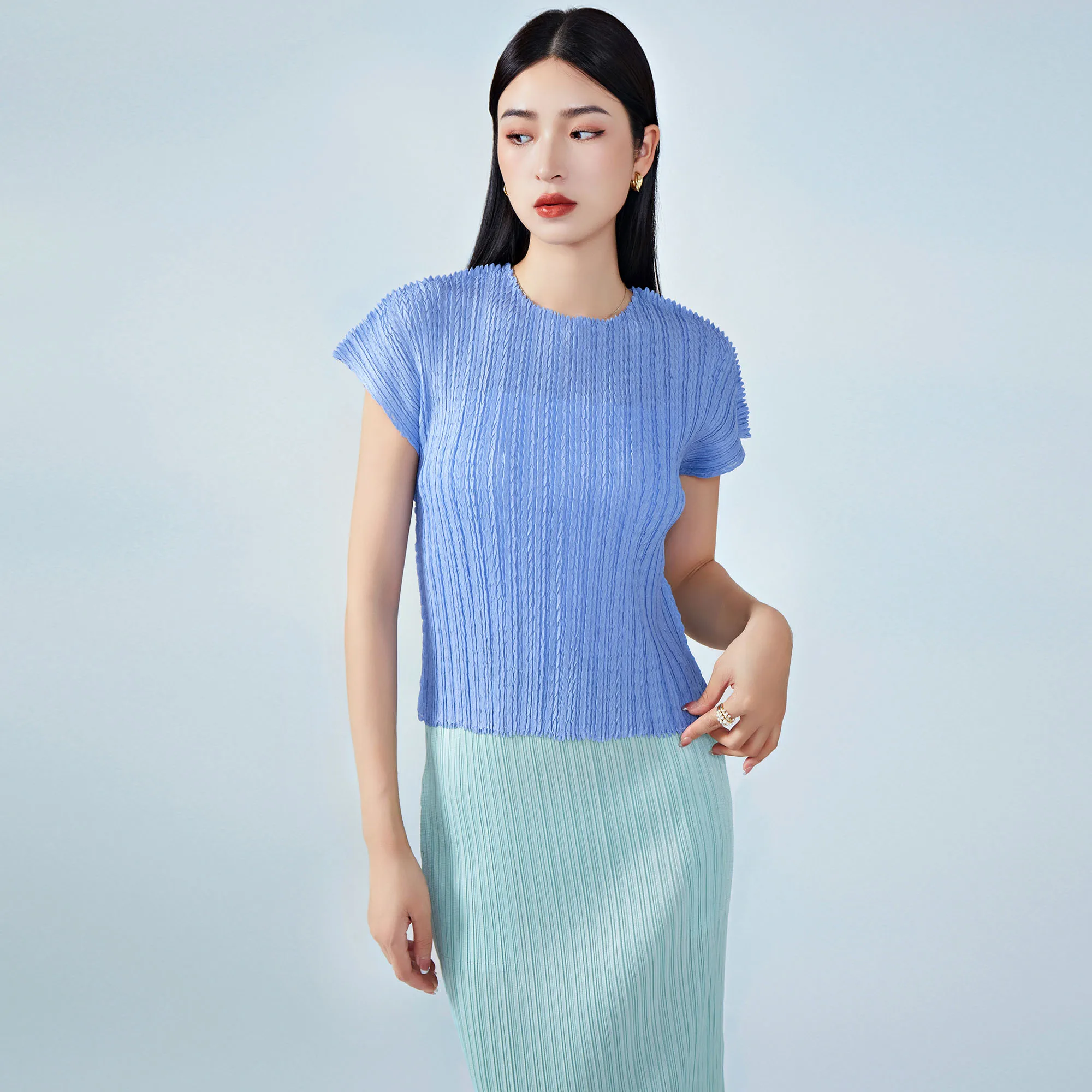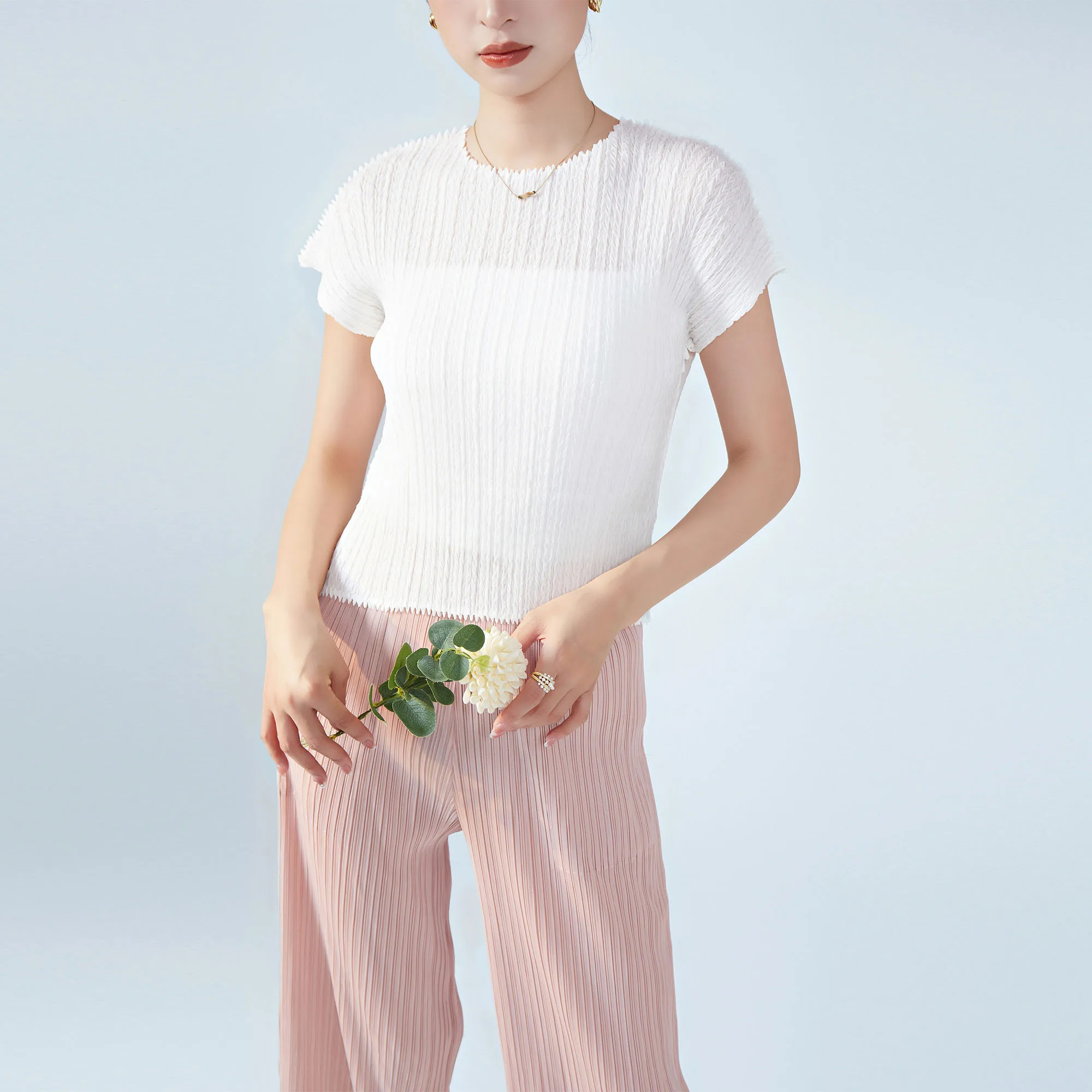 Miyake Women's Short Sleeve T-shirt Chic Solid Color Pleated Summer Top