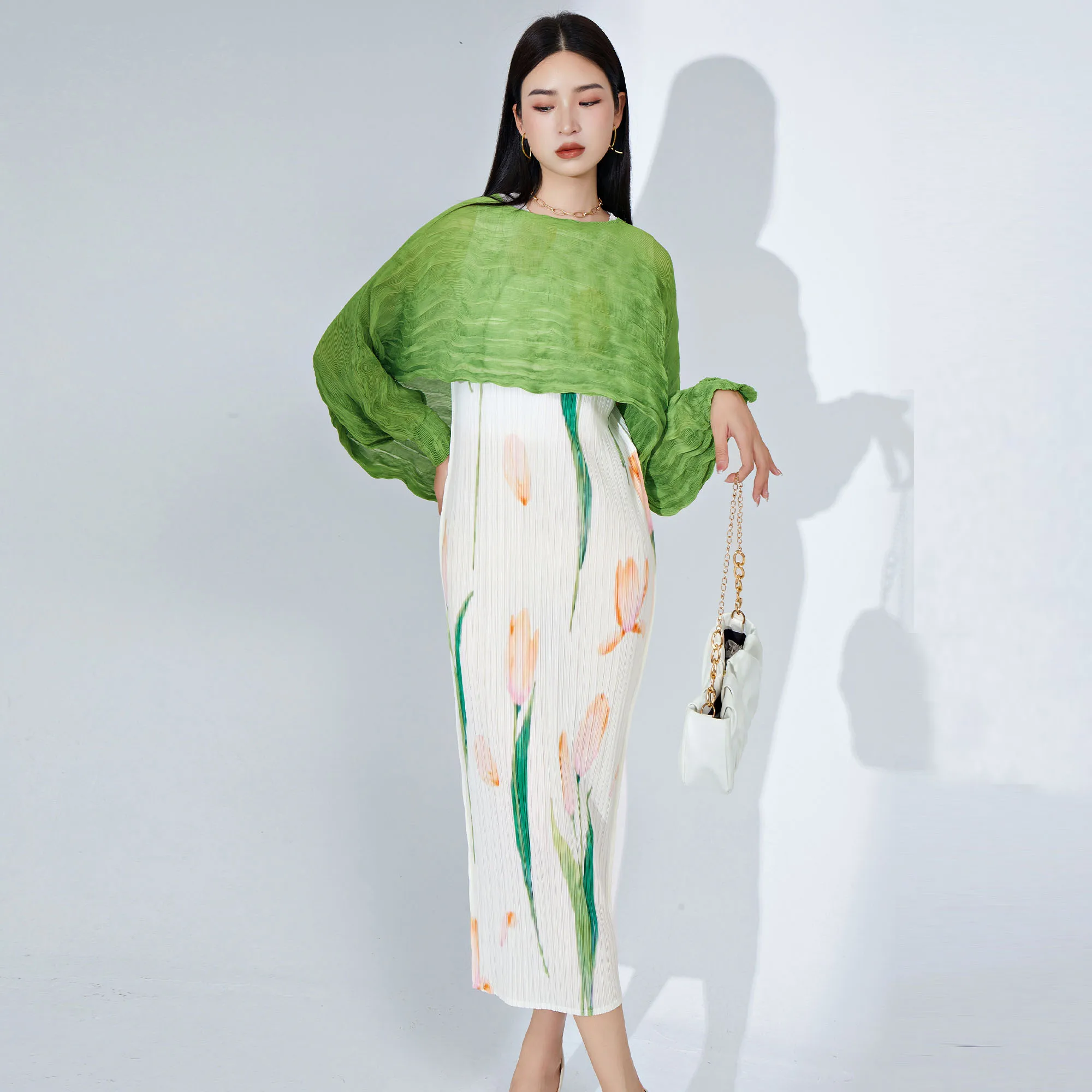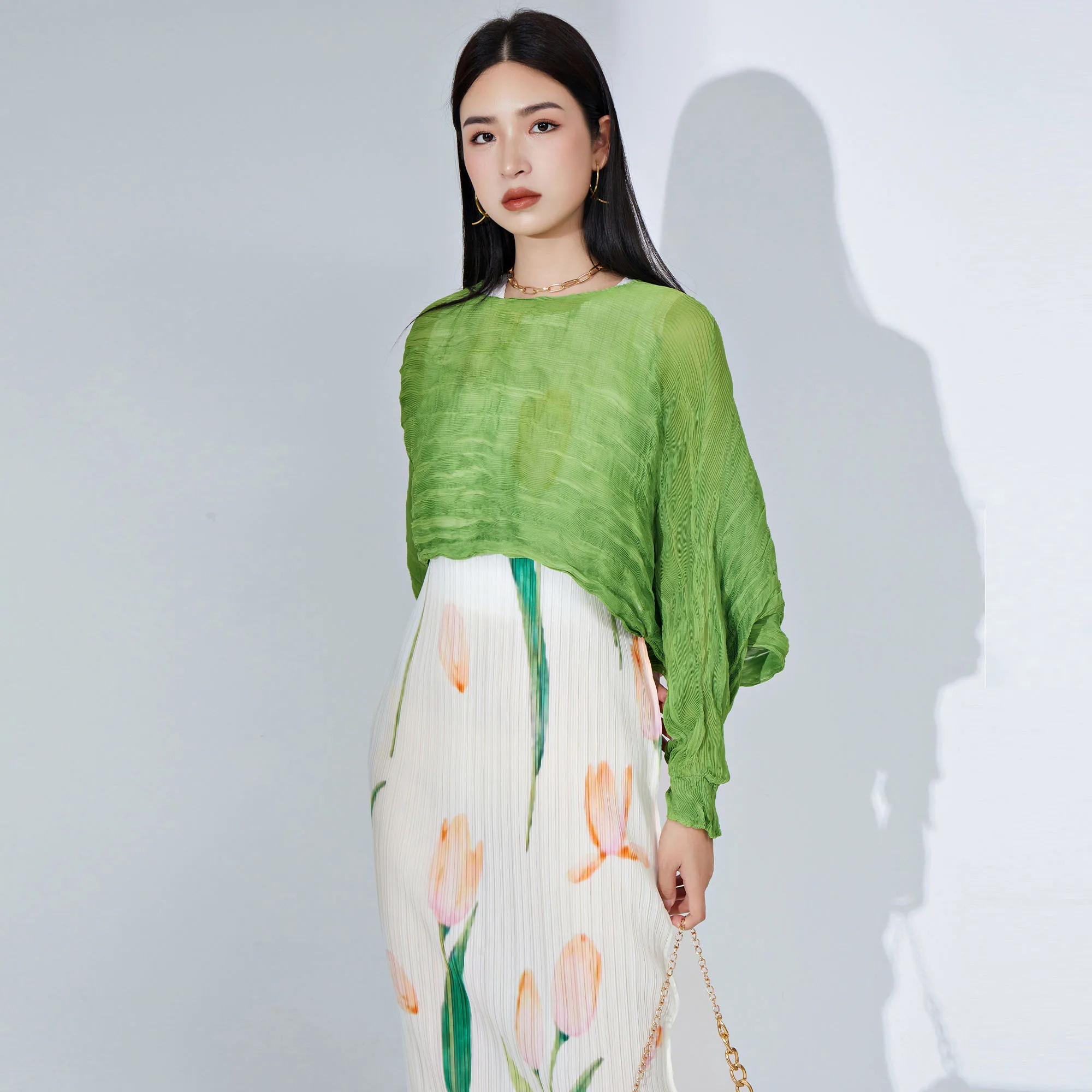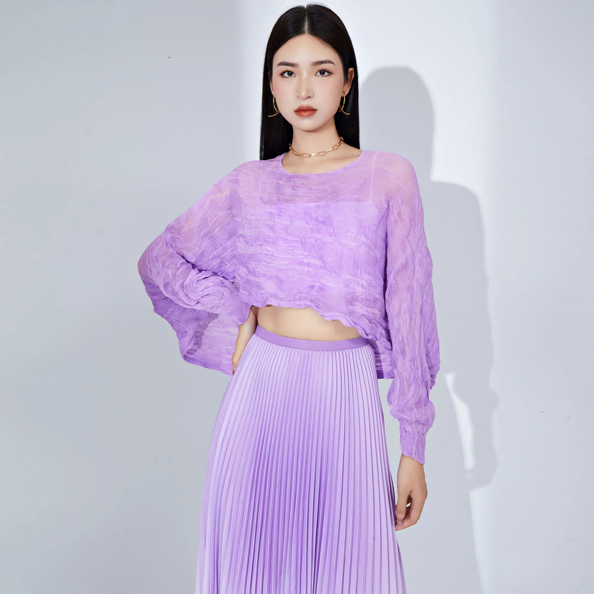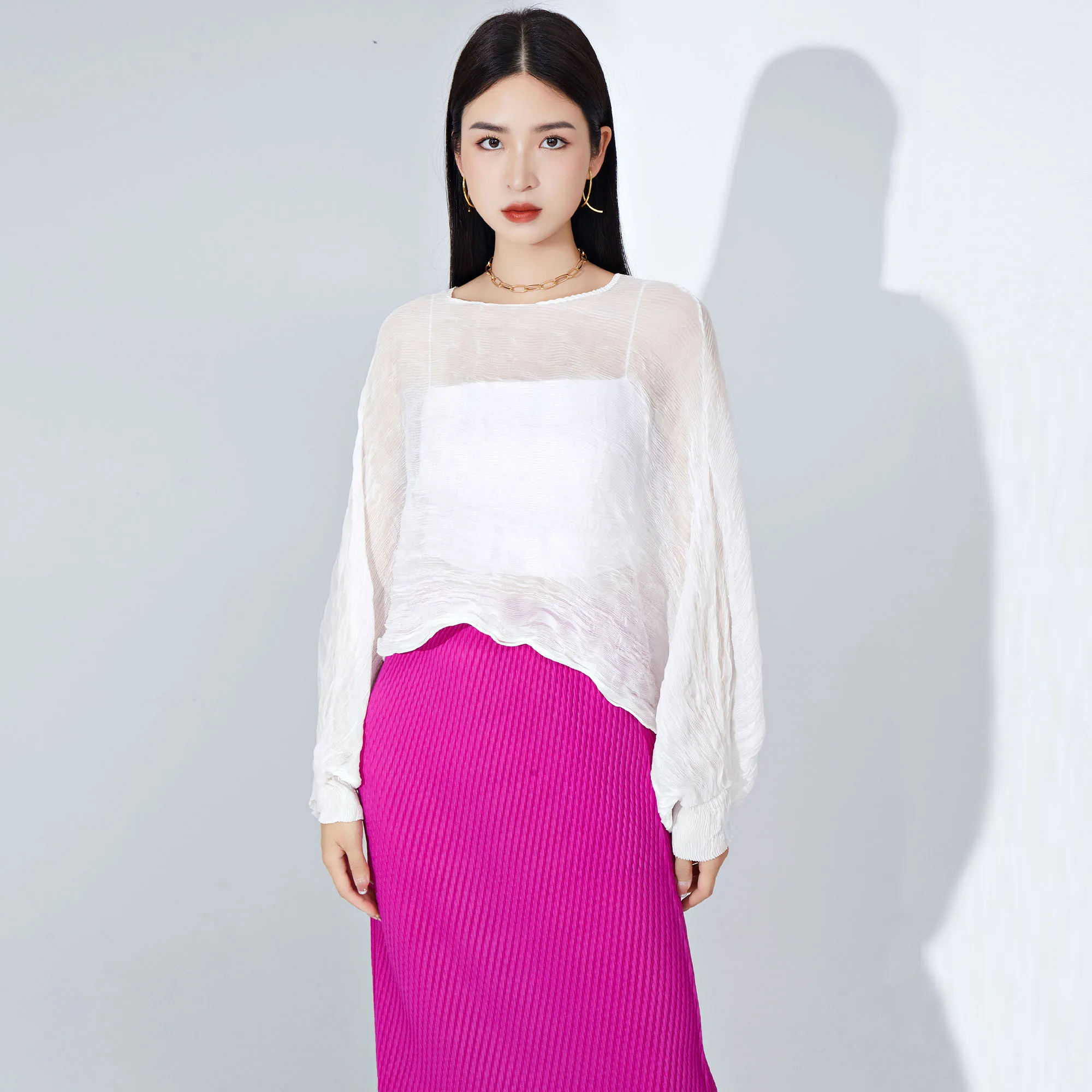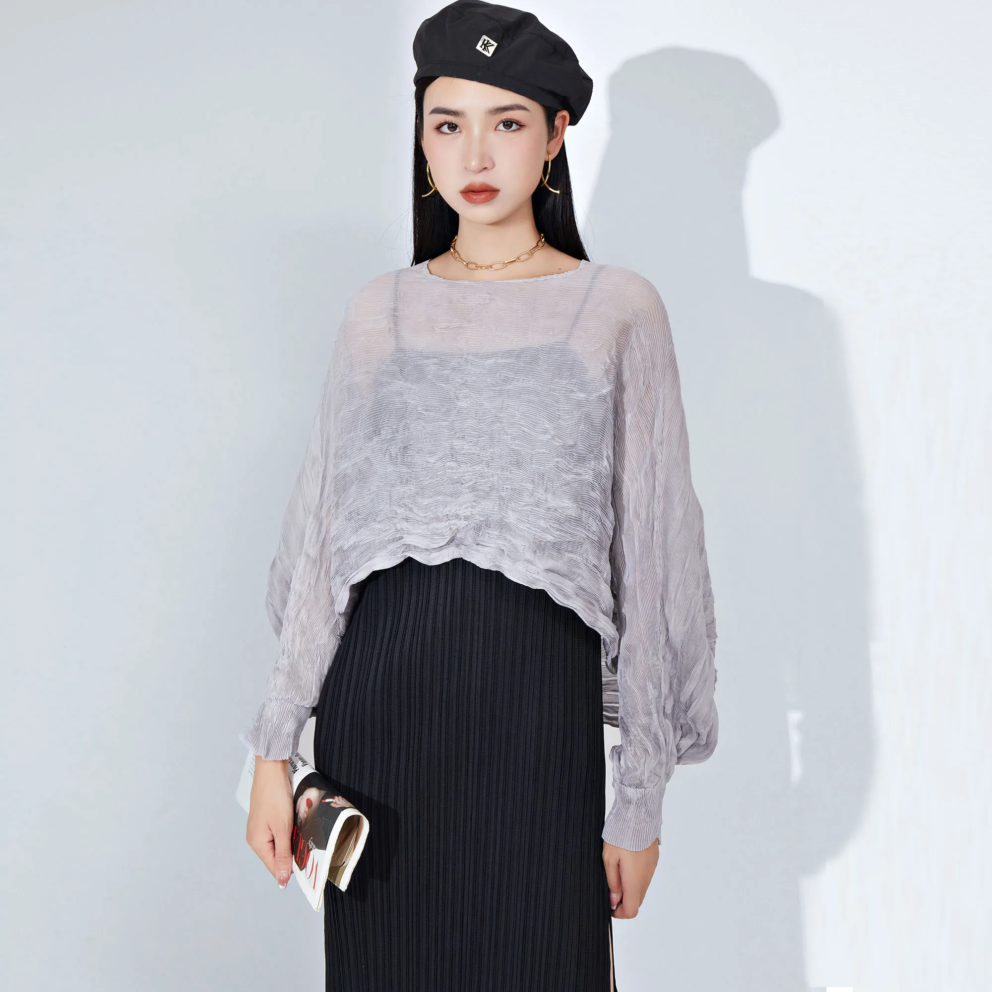 Miyake Pleated Designer Women's Top Summer Thin Long Sleeve Short Poncho Sun Protection Shirt Cover T-shirt