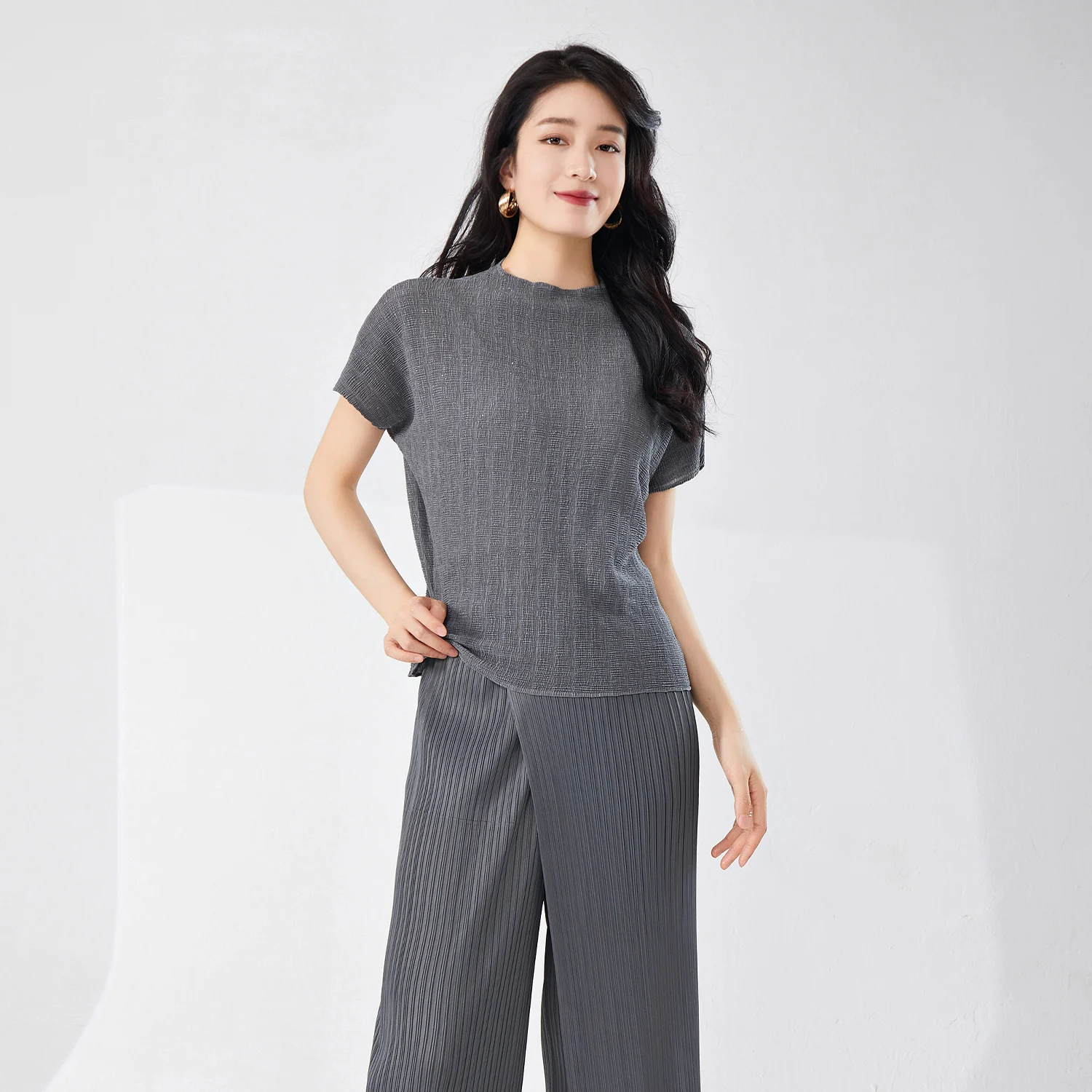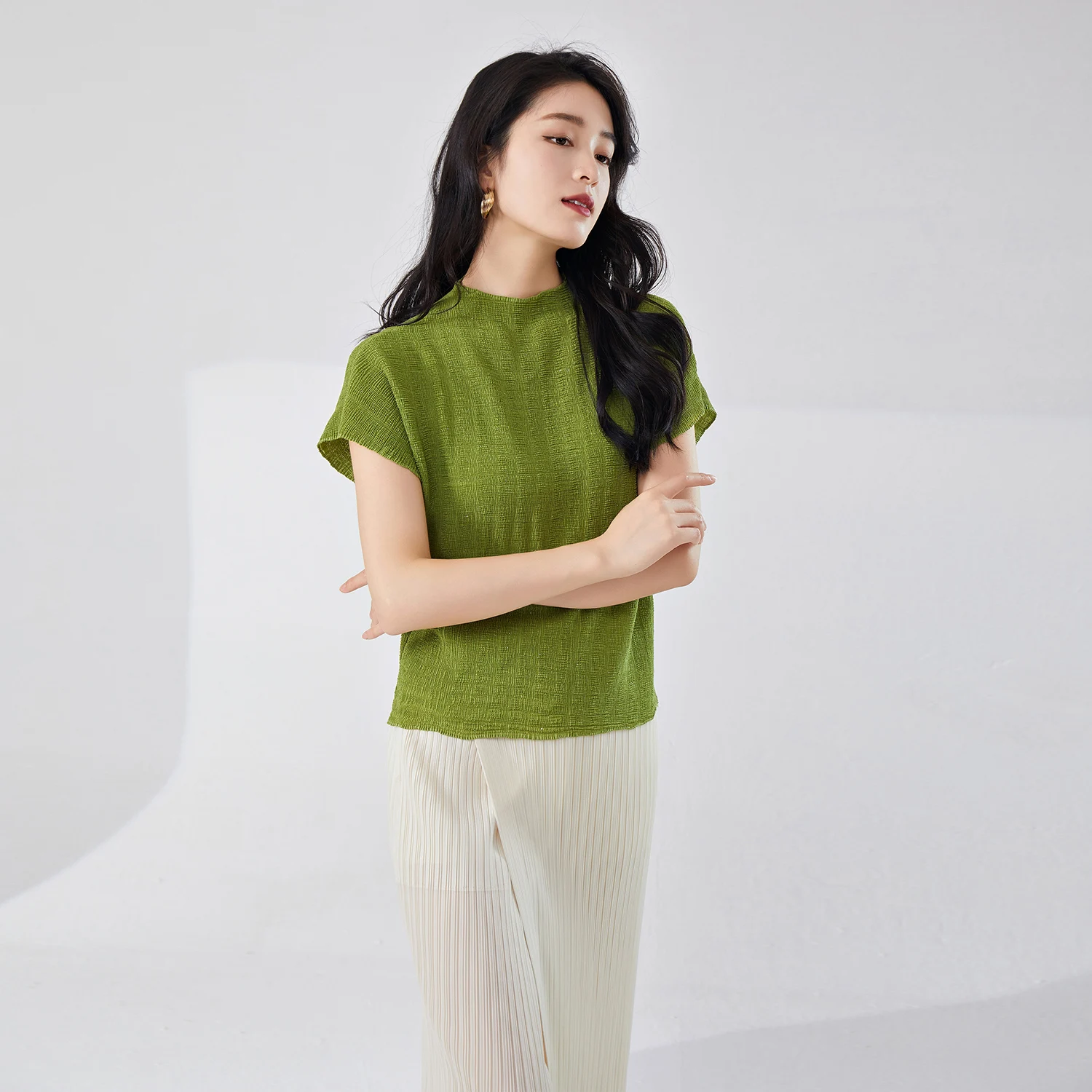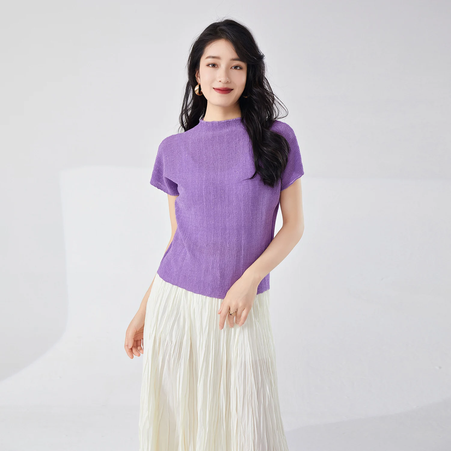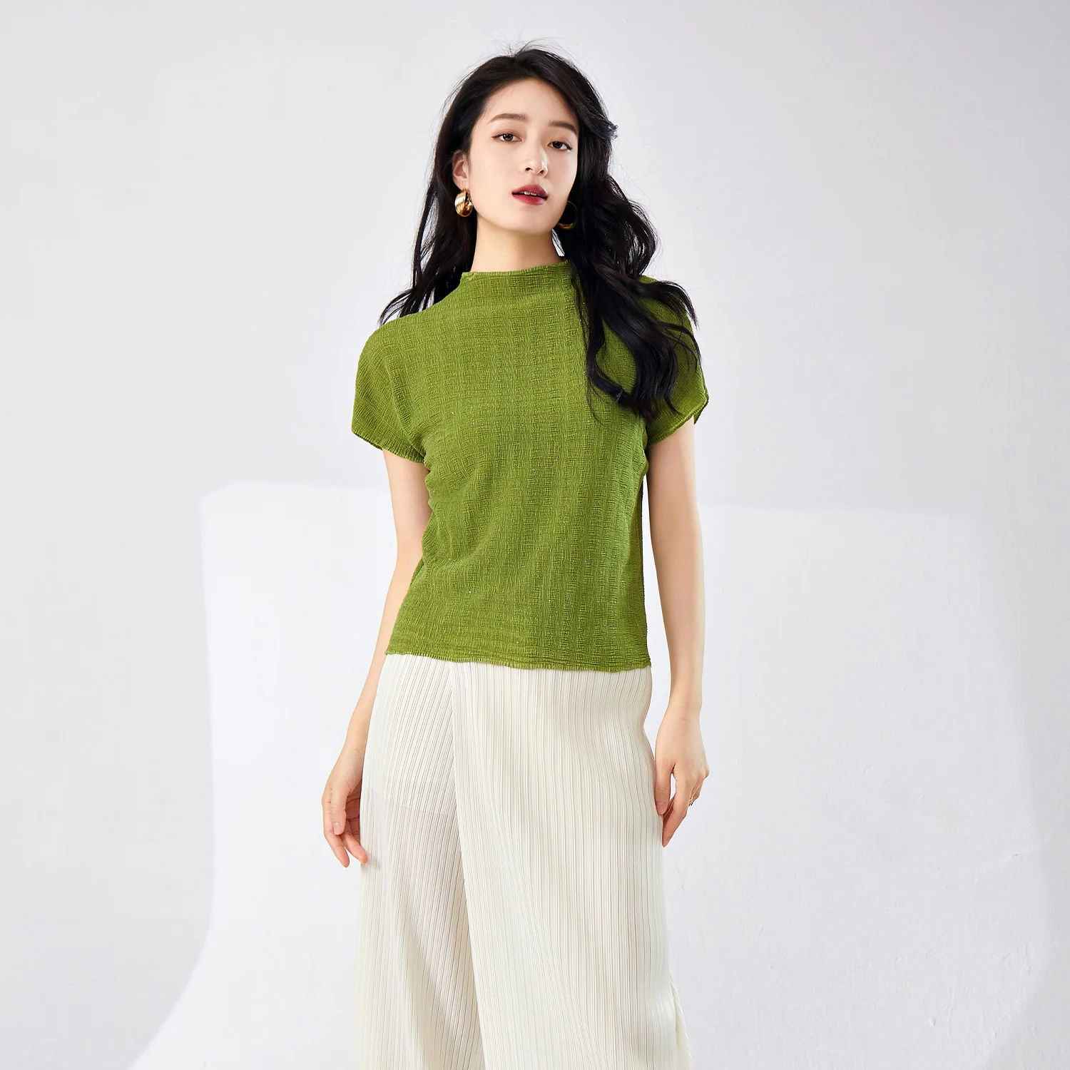 2025 Summer Korean Style Bottoming Large Size Short-Sleeved T-Shirt Loose Casual Solid Color Pleated Women's Fine Glitter Top