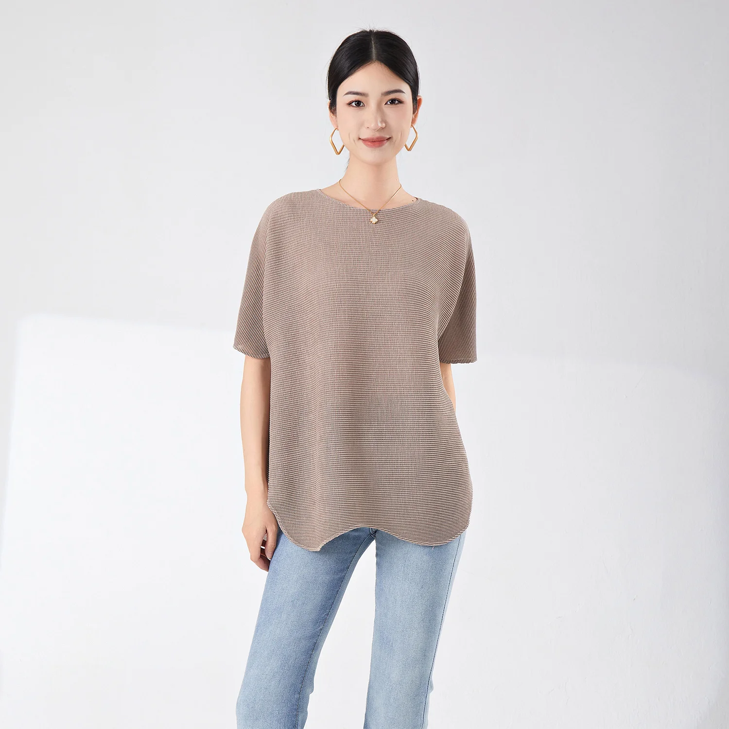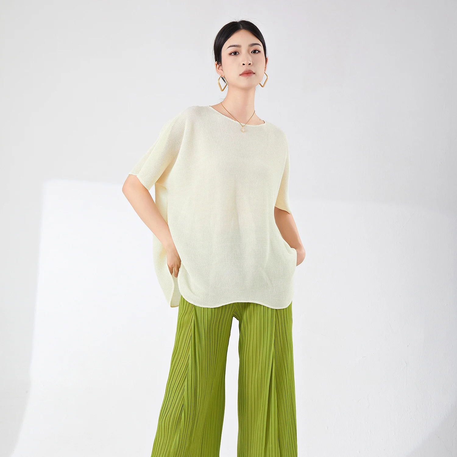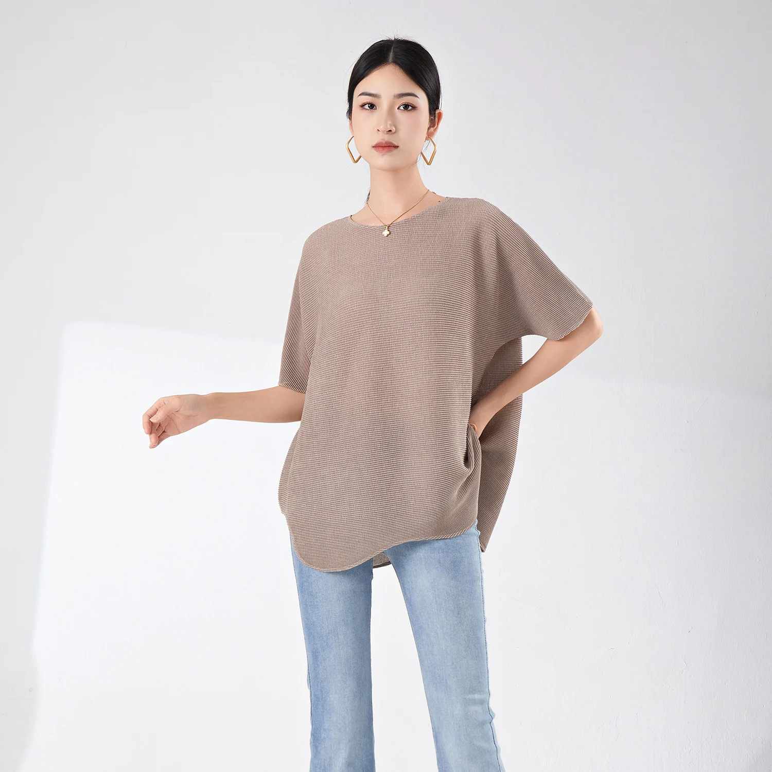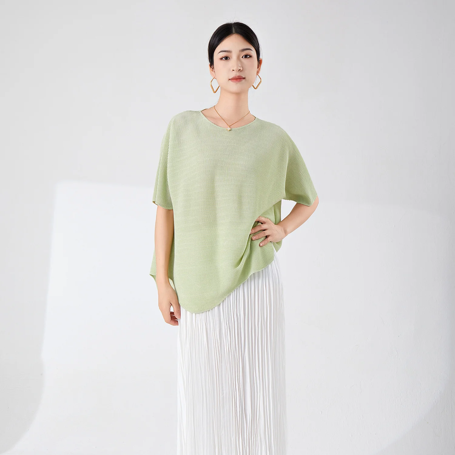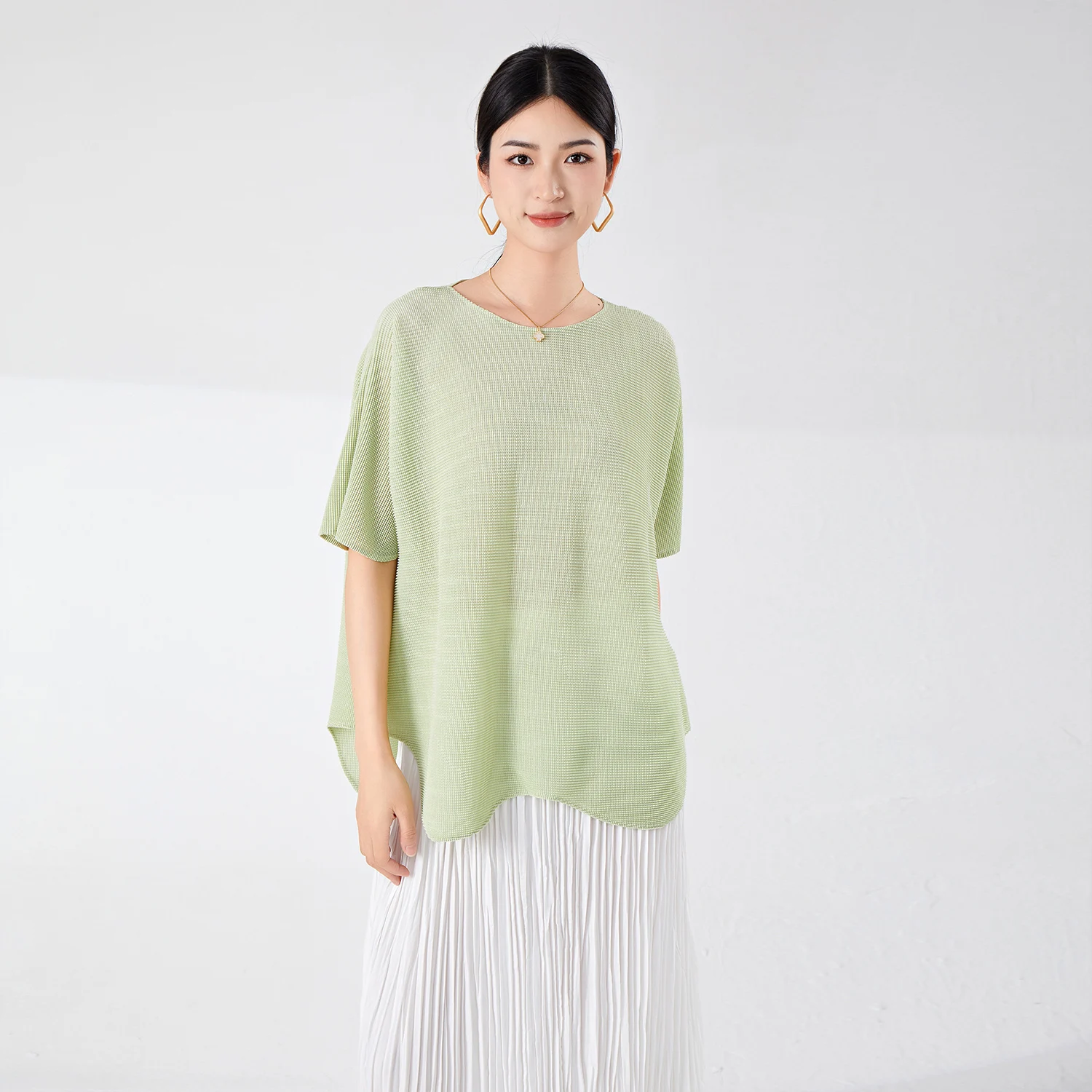 Miyake Women's Casual Short-Sleeved T-Shirt Loose Design Large Size Bat-Sleeve Irregular Stretch Top for Summer