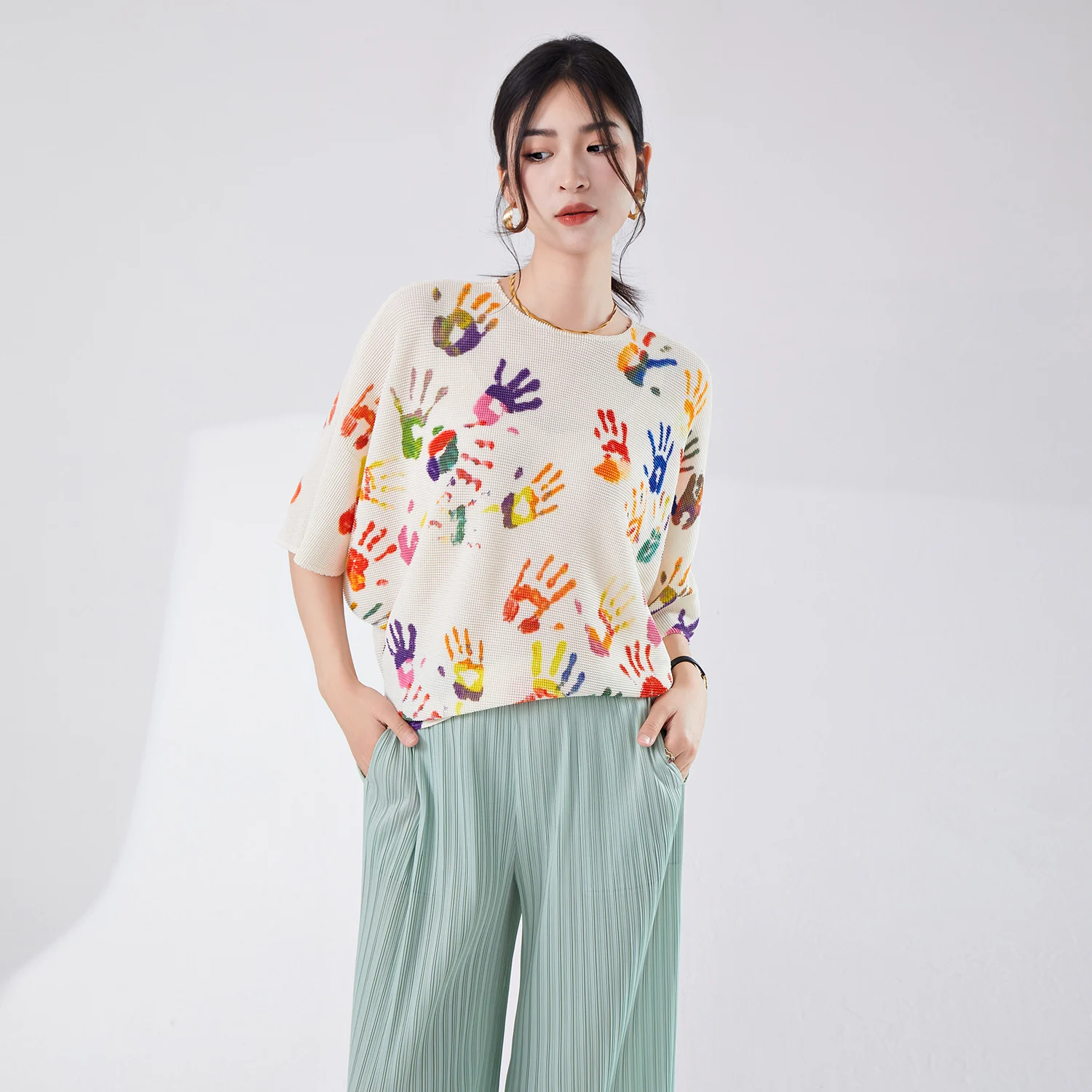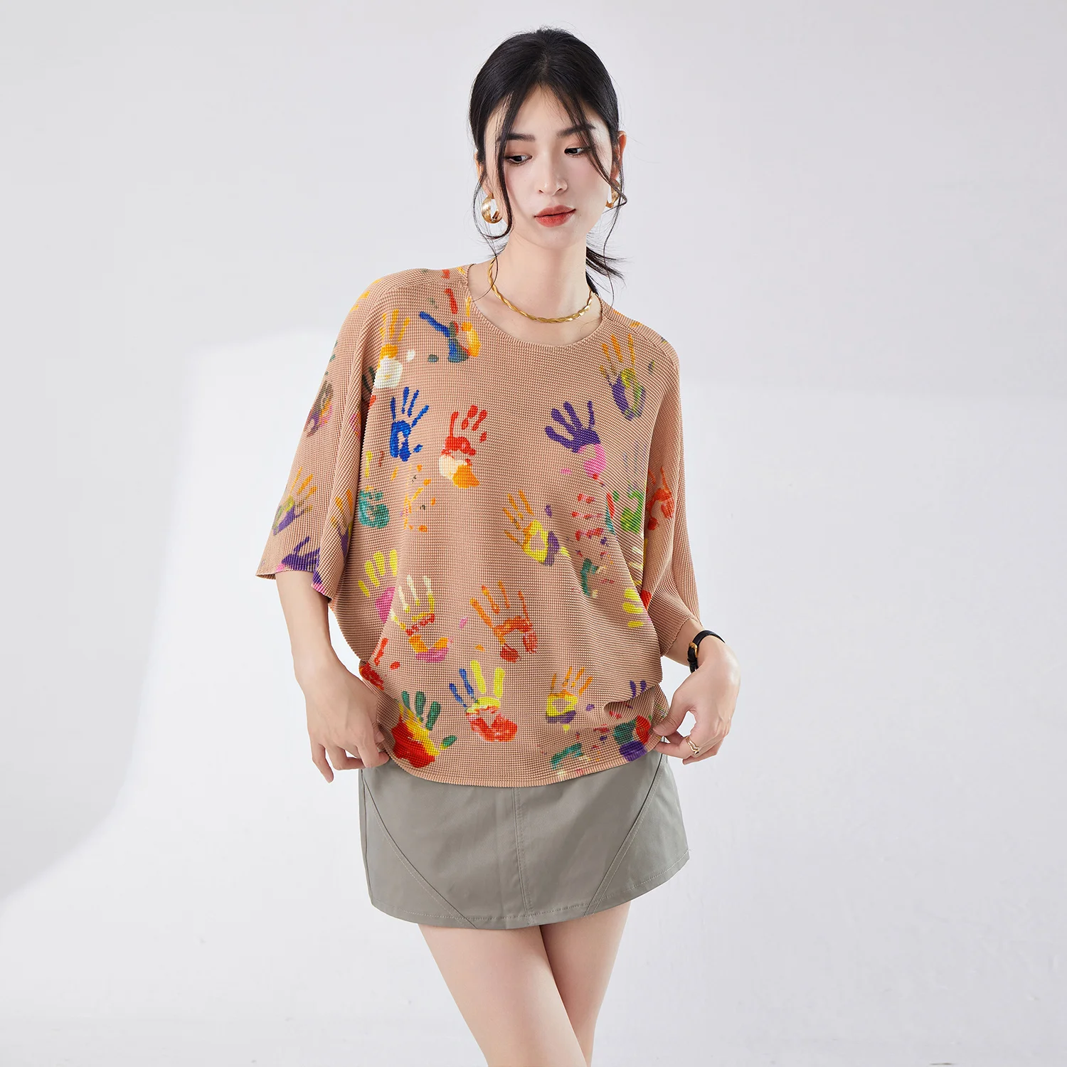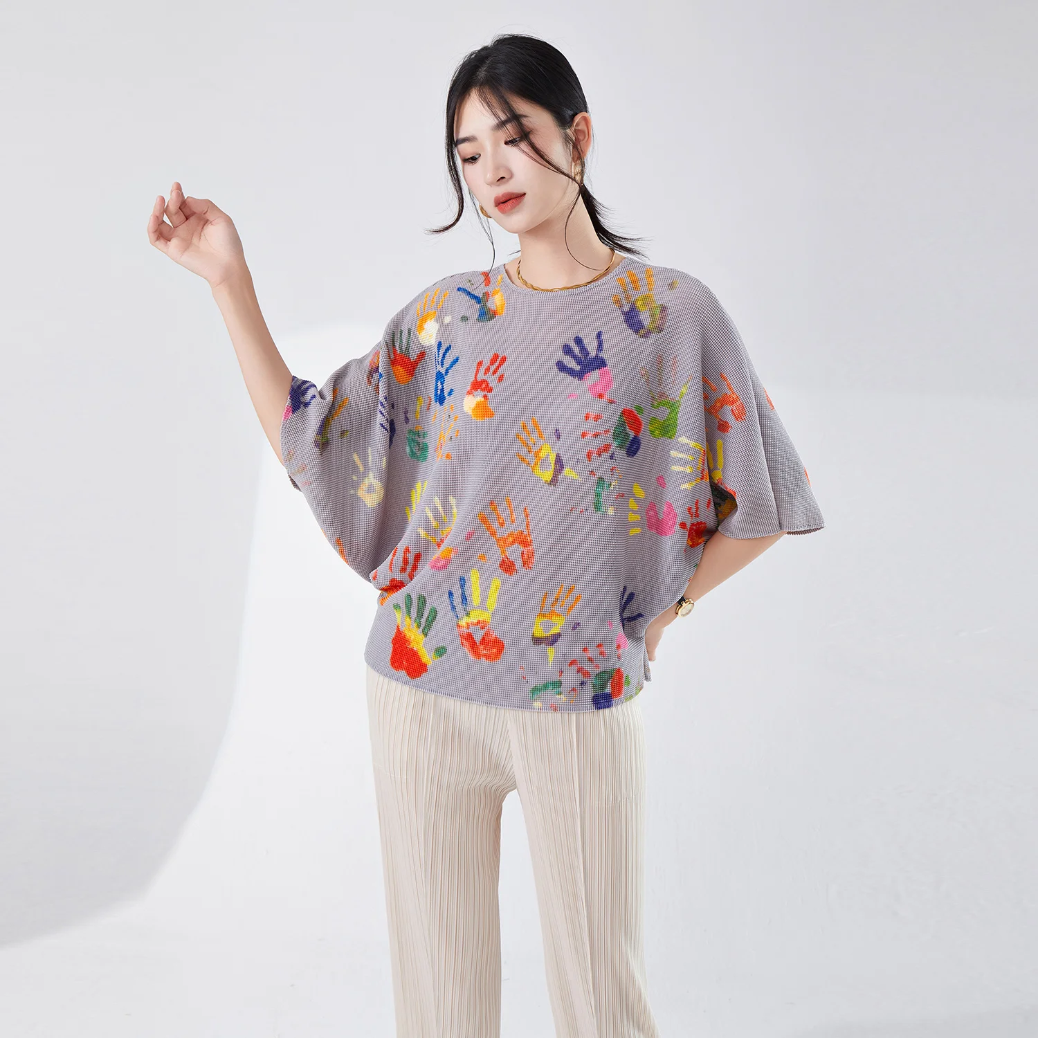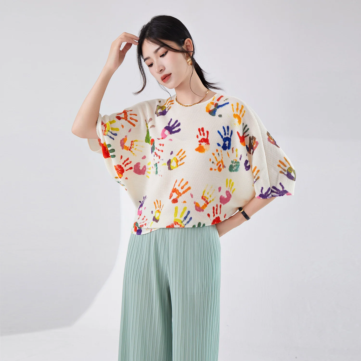 High Quality Summer Women's Pleated Top Design Bat Sleeve Loose Casual Style Stretch Printed Short-Sleeved T-Shirt