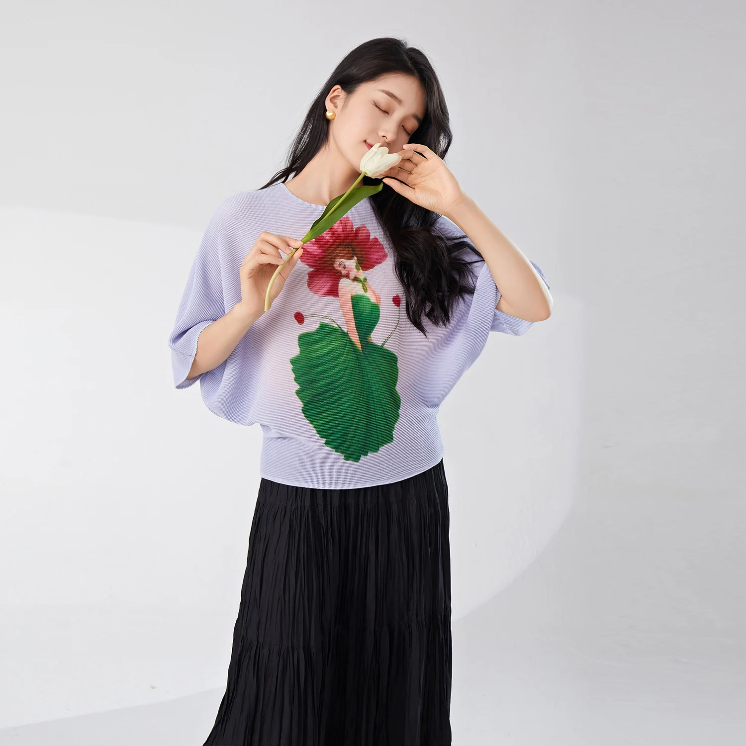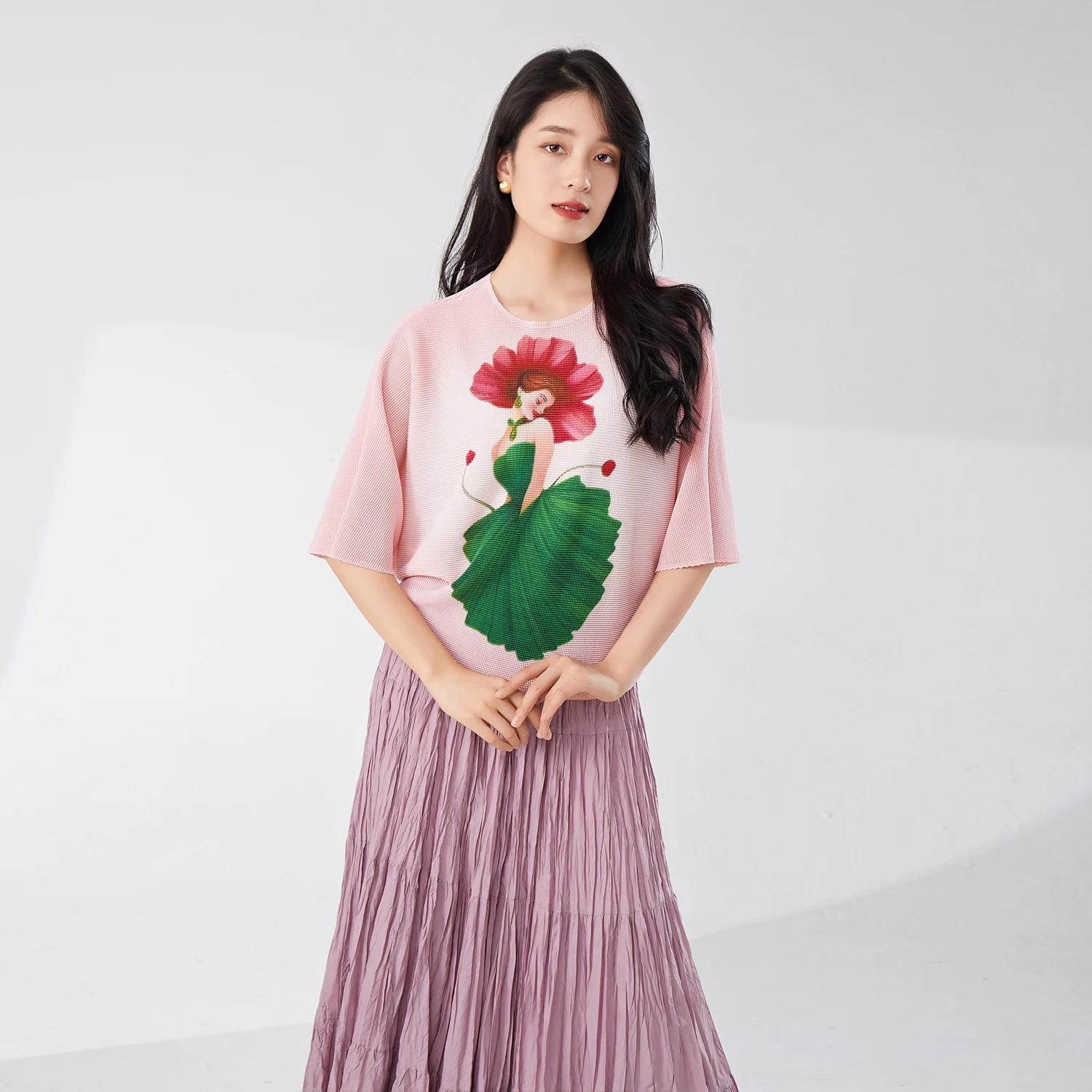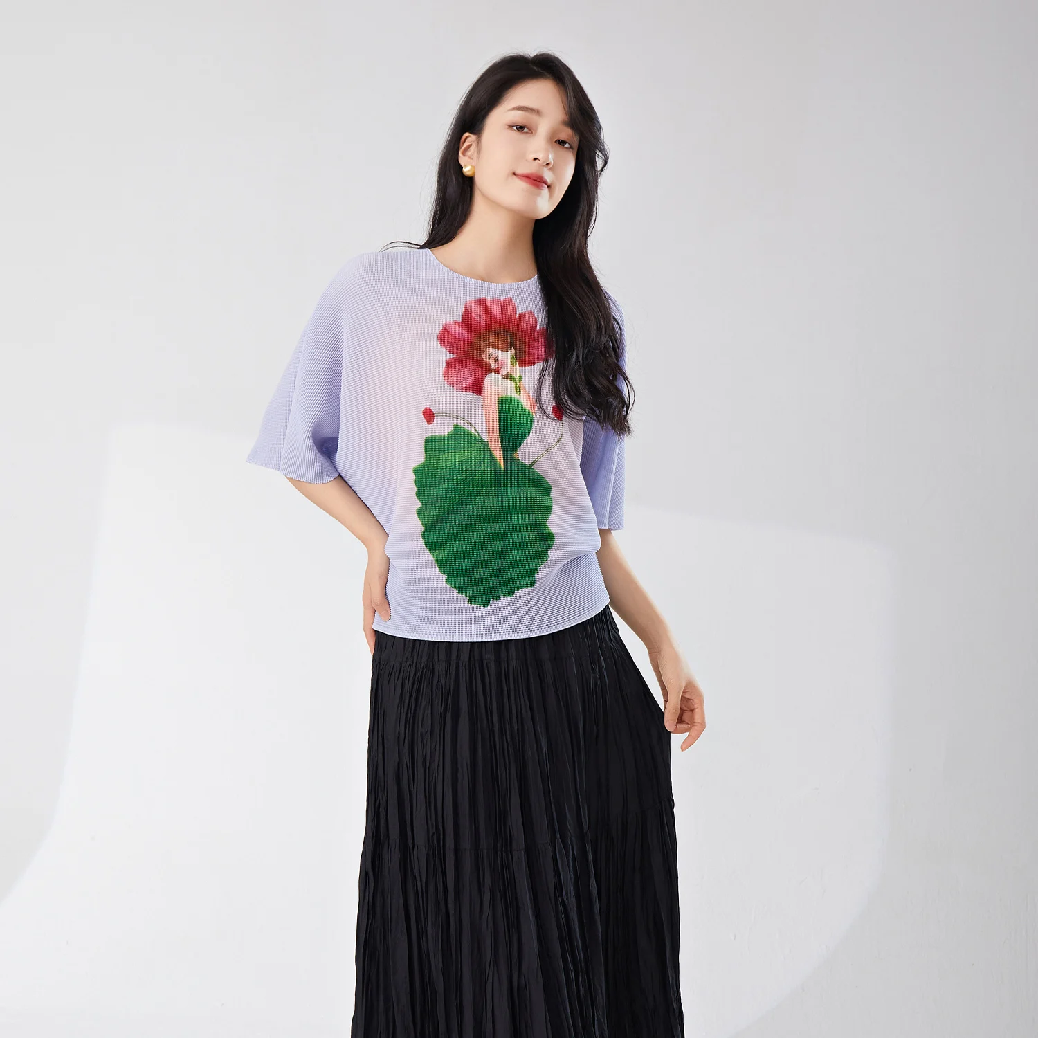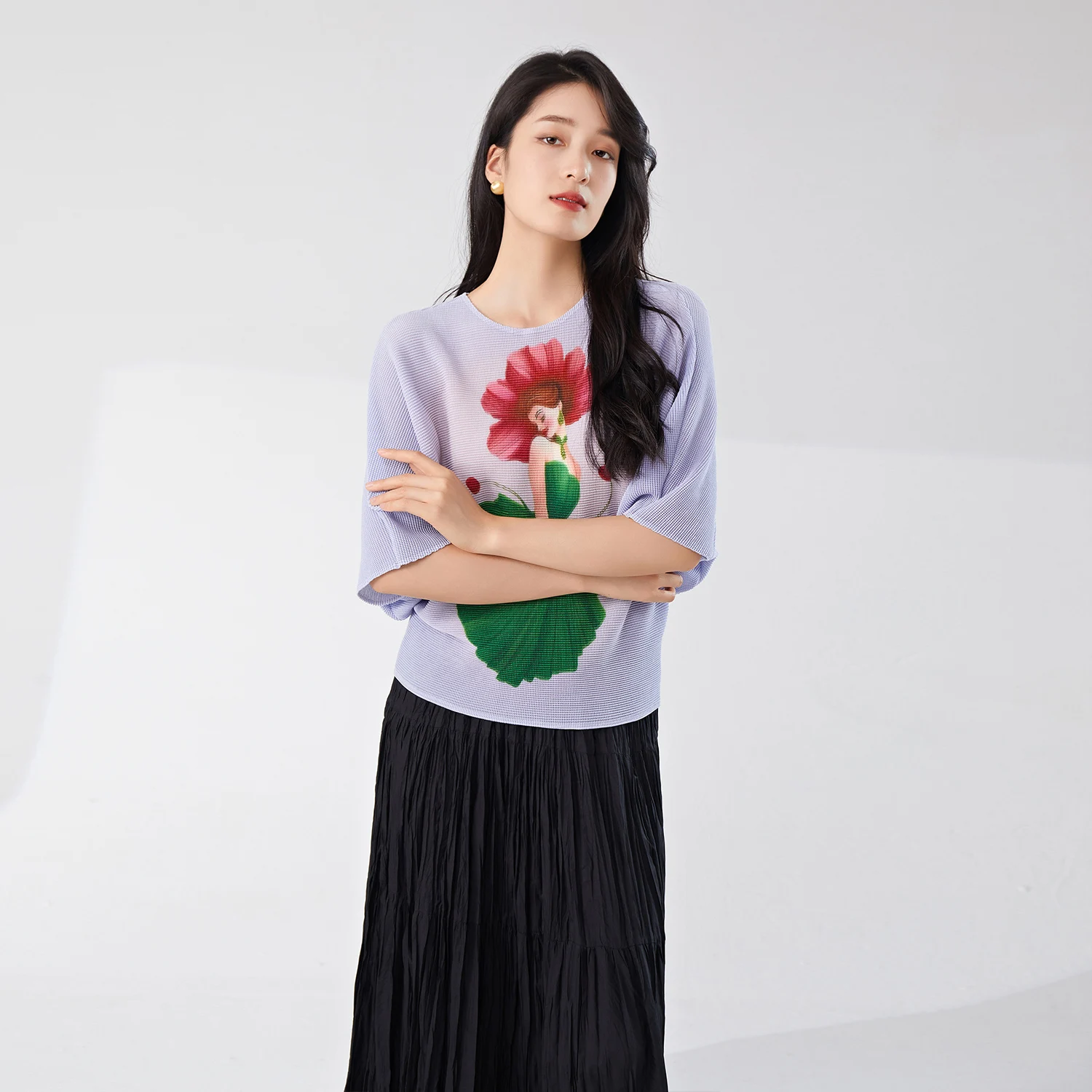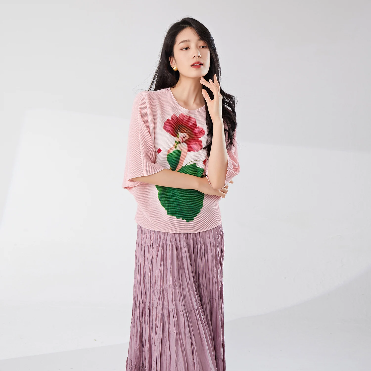 2025 New Women Casual Pleated T-Shirt Elastic Printed Bat-Sleeve Top Vintage Western Woven Lady Short-Sleeved Wholesale