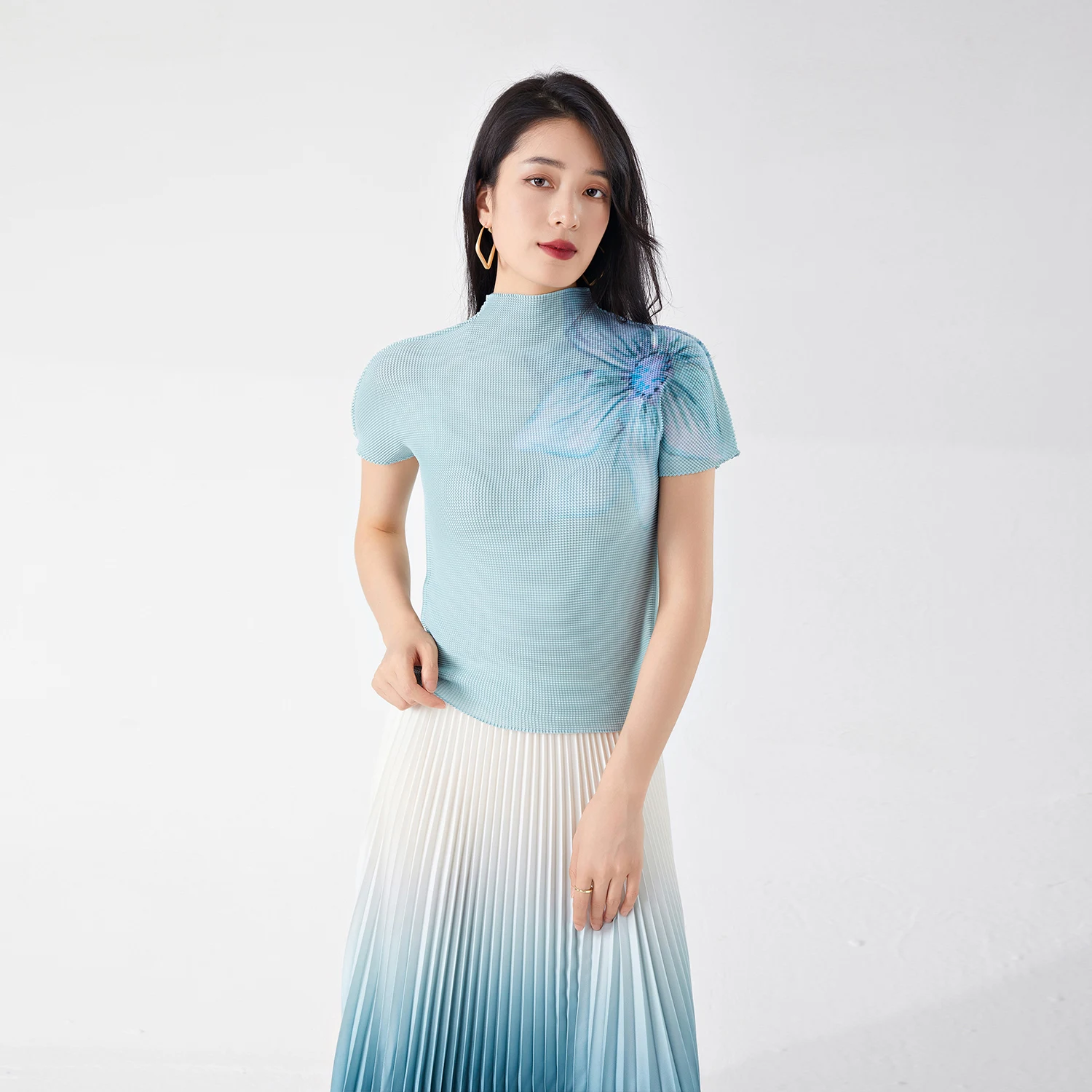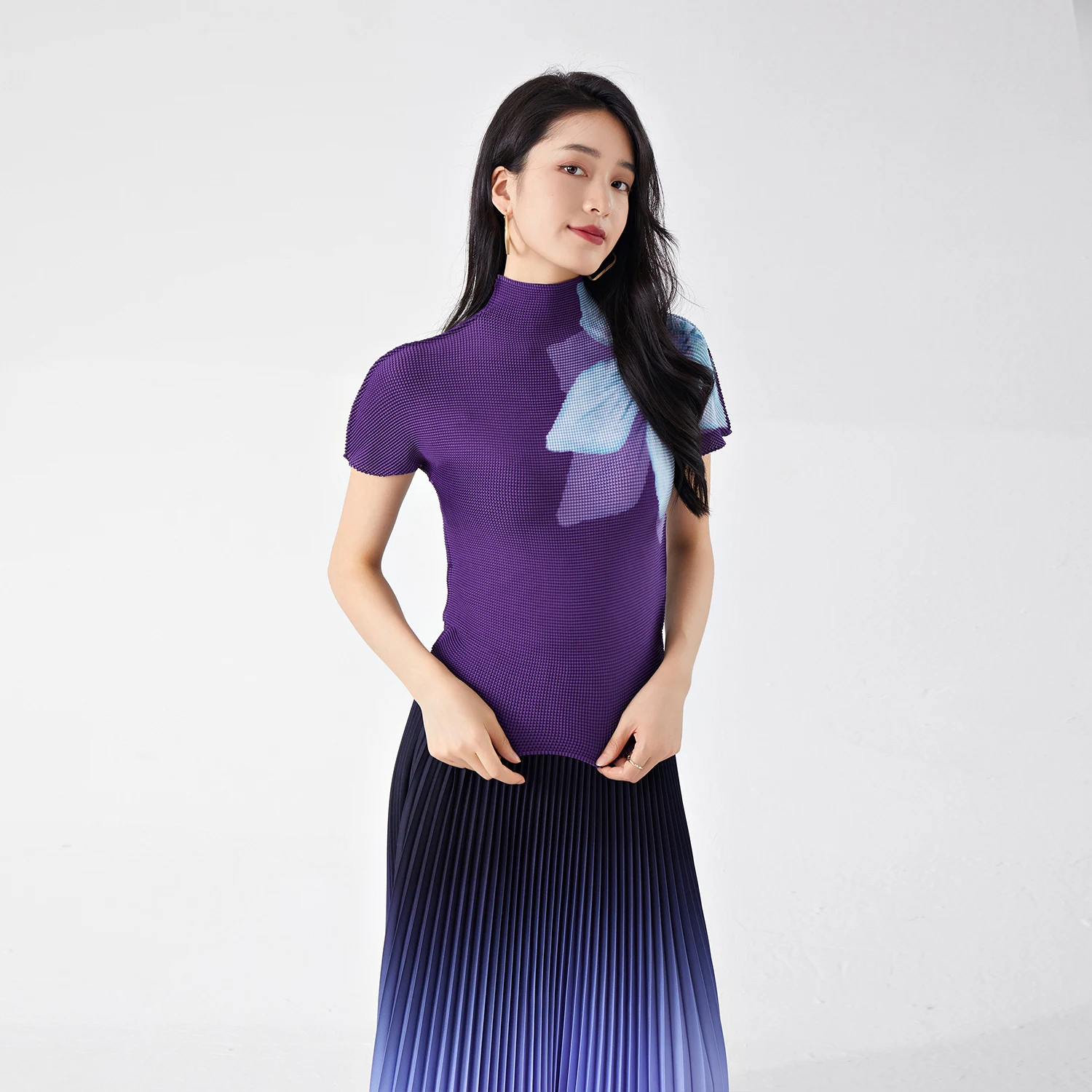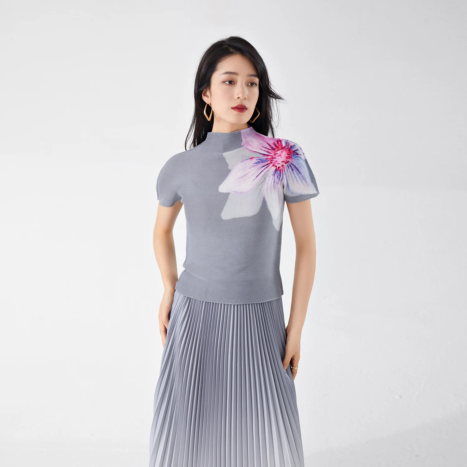 Miyake Women Vintage Fashion Short Sleeve T-Shirt Pleated Classic Top With Loose Design Summer Casual Printed Blouse