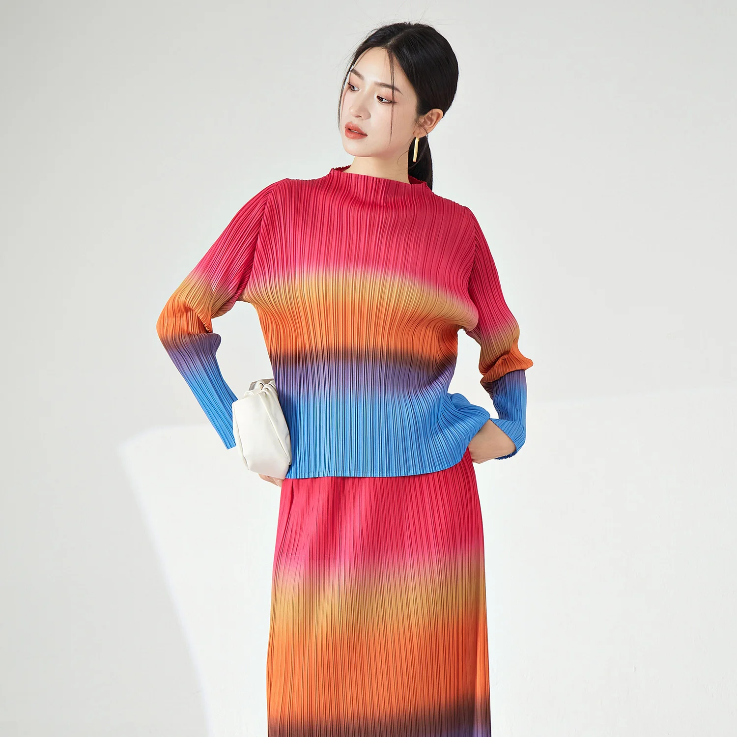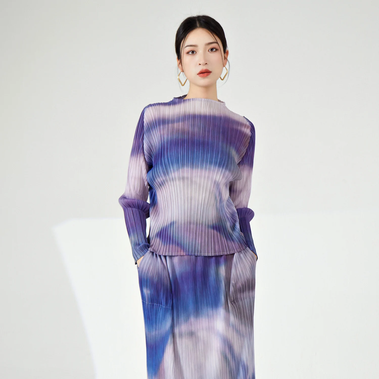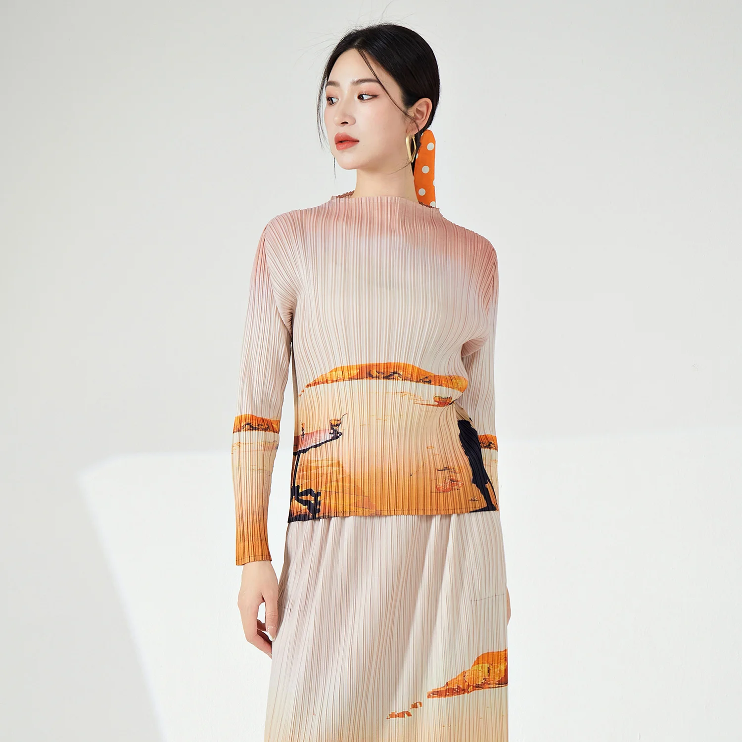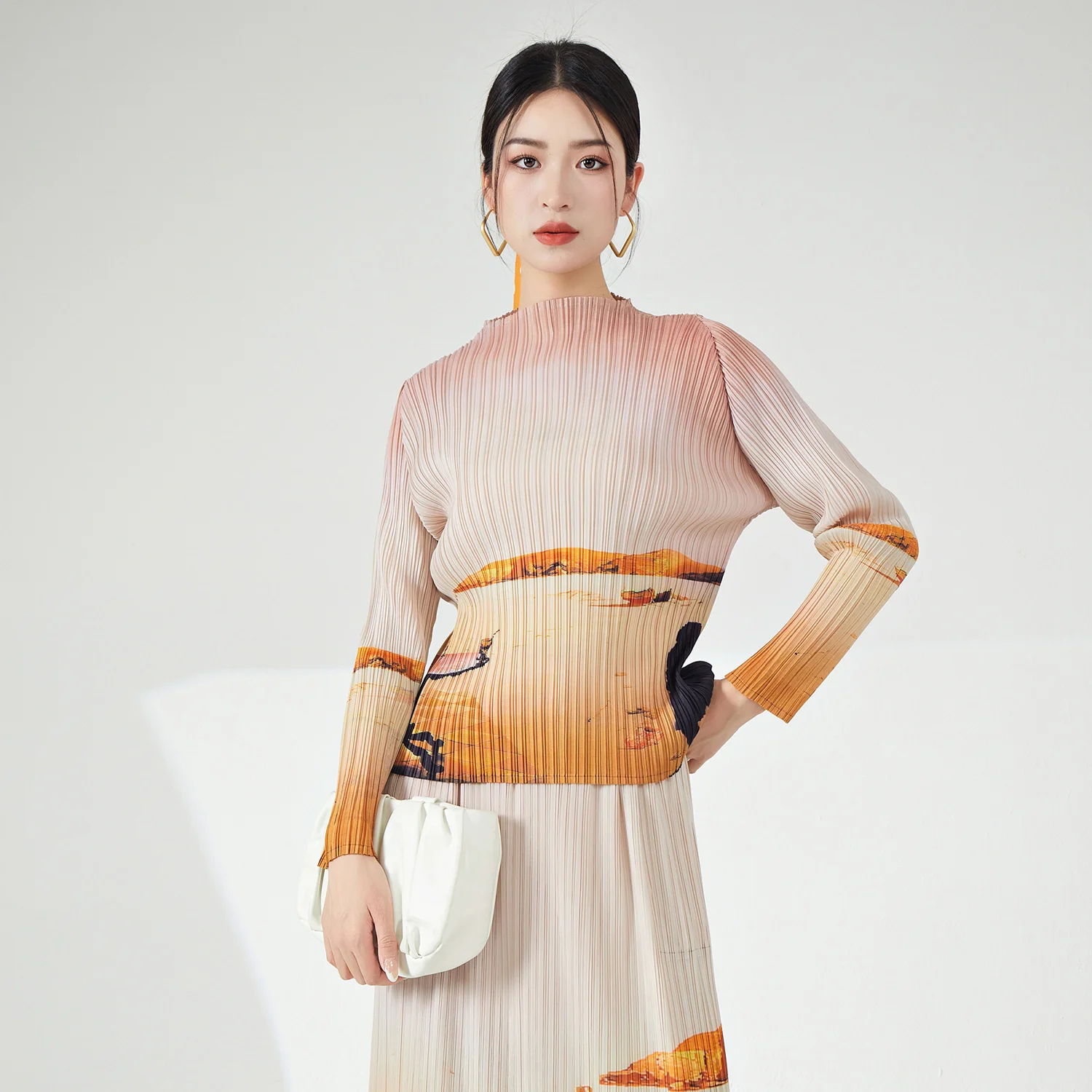 High Quality Women's Vintage Printed T-Shirt Woven Summer & Spring Casual Long Blouse With Stretch Pleated Top