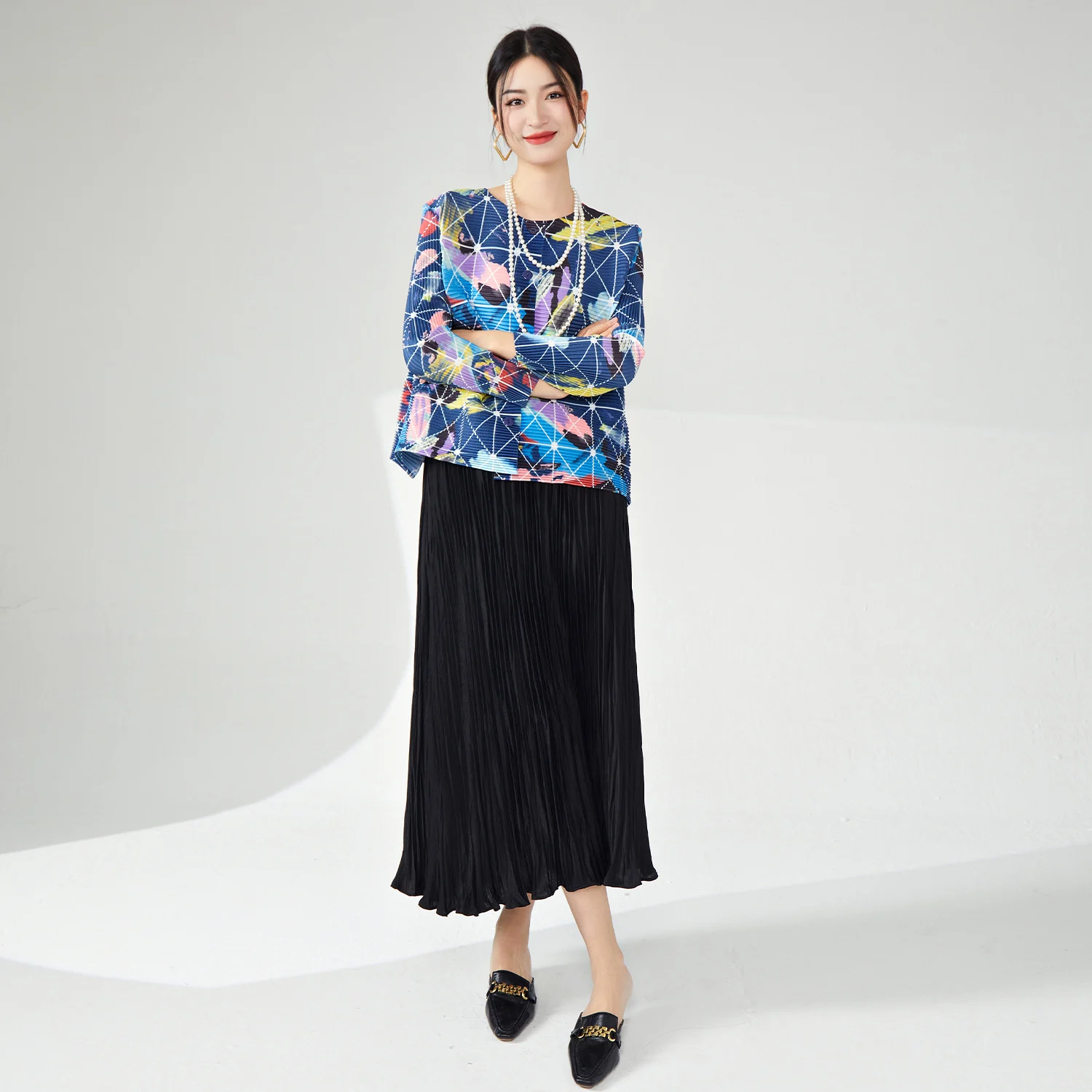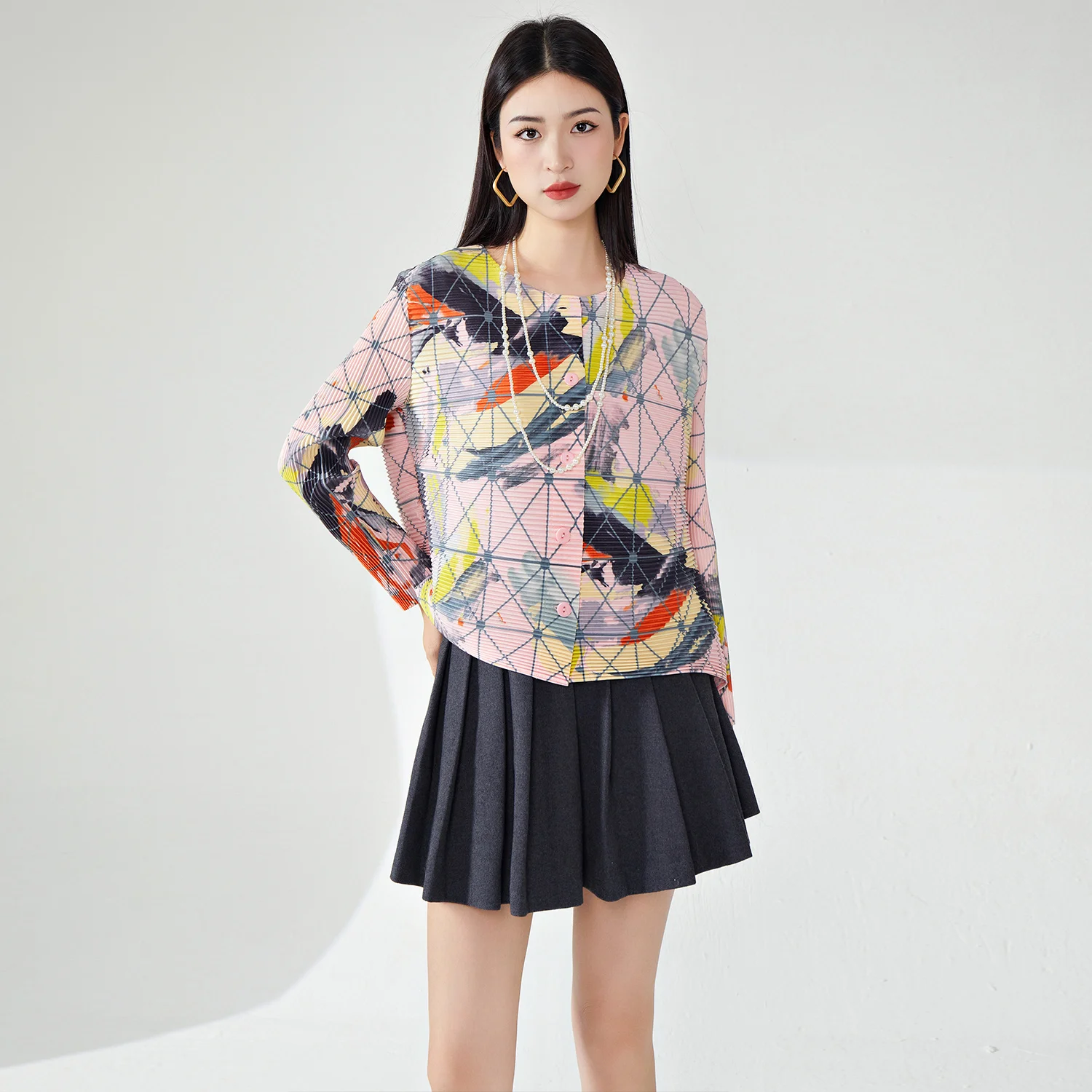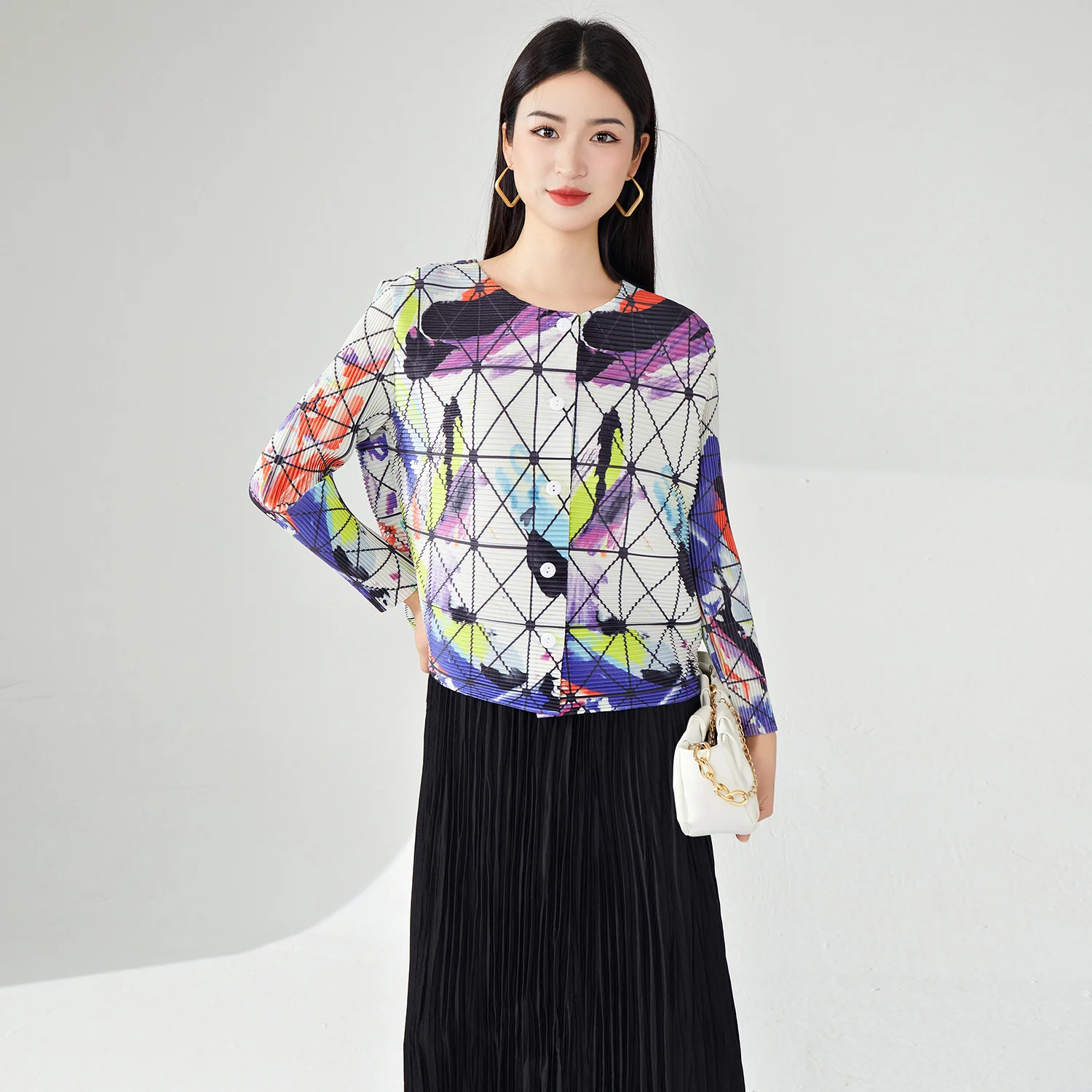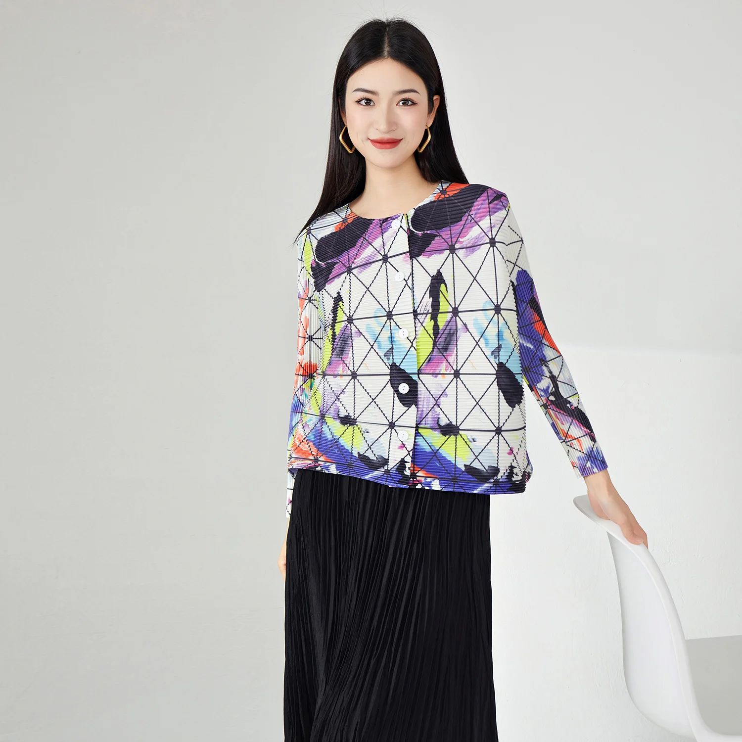 Miyake Women's Vintage Floral Printed Cardigan Casual Loose Fit Summer Jacket With Stretch Free Size Pleated Top